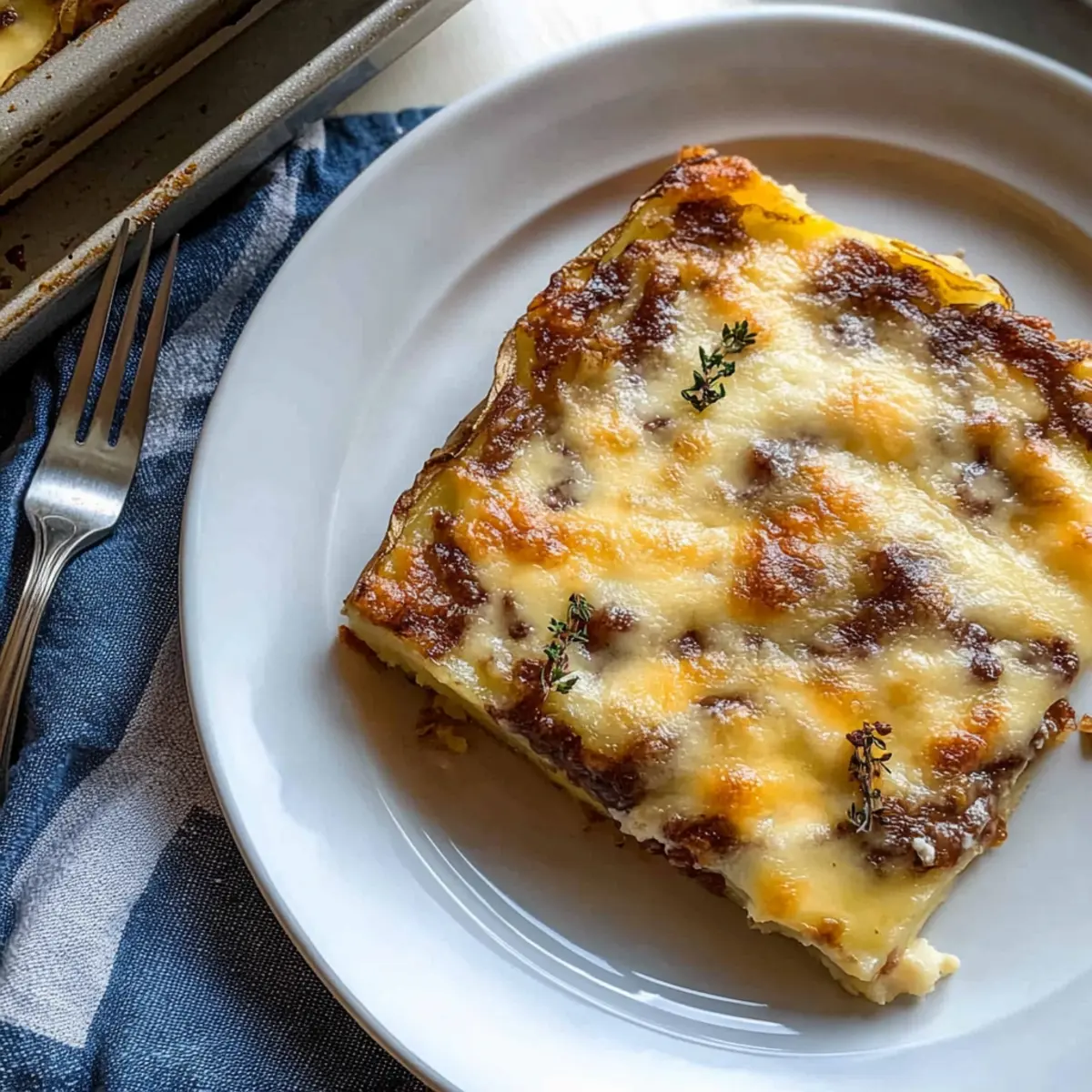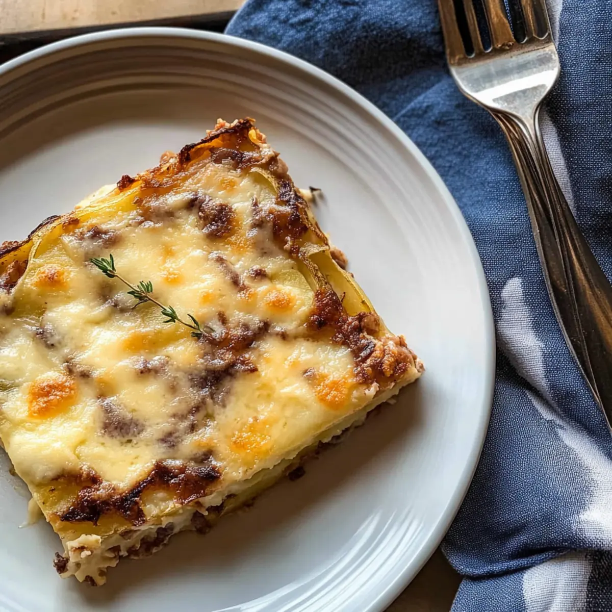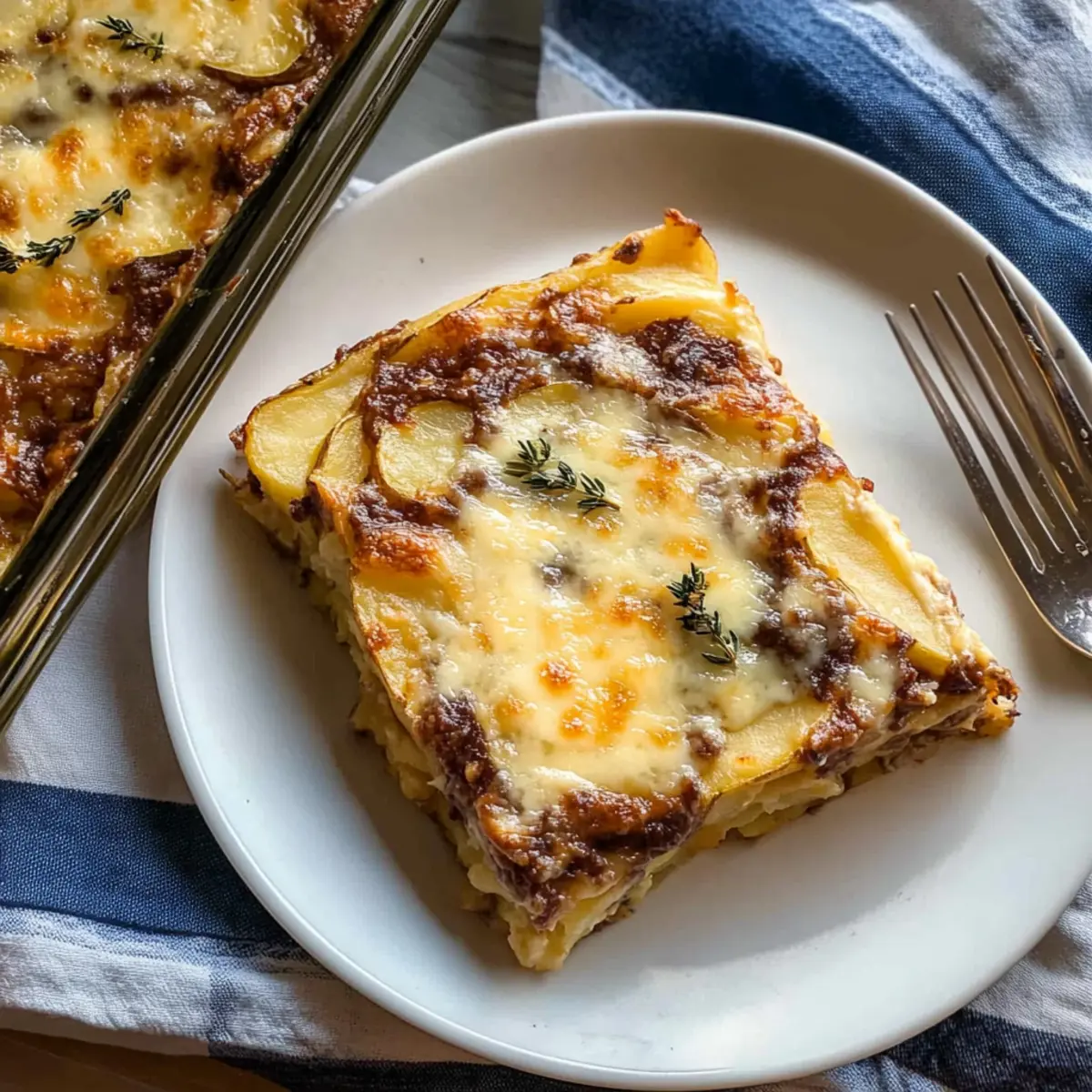As I stood in my kitchen, the aroma of baking potatoes began to weave a comforting spell around me. There’s something undeniably magical about Dauphinoise Potatoes. This classic French dish features beautifully layered, thinly sliced potatoes bathed in a rich, creamy sauce infused with garlic and thyme. With its gooey golden Gruyère cheese topping, it becomes the indulgent side dish everyone dreams about. Not only is it perfect for festive gatherings, but it also makes a delightful weeknight comfort meal that transforms even the simplest dinner into something special. Plus, you won’t believe how easy it is to prepare, and it’s an ideal make-ahead option for busy days. Curious about how to whip up this creamy haven for your table? Let’s dive into the recipe! Why are Dauphinoise Potatoes a must-try? Irresistibly Creamy: This dish boasts a velvety texture that melts in your mouth, making it the ultimate comfort food for any occasion. Simplistic Elegance: With only a handful of ingredients, you’ll impress your guests without spending hours in the kitchen. Endless Versatility: Feel free to swap cheese types or add veggies for a personalized twist; the possibilities are endless! Why not try it alongside Garlic Butter Potatoes for a potato feast? Crowd-Pleasing Appeal: Perfect for holidays or family dinners, this indulgent side dish has everyone asking for seconds. Make-Ahead Magic: Prepare ahead of time and simply bake when ready to serve, so you can enjoy the moments that matter. Dauphinoise Potatoes Ingredients Discover the magic of Dauphinoise Potatoes with these essential ingredients. For the Cream Mixture Double Cream or Heavy Cream – Provides richness and incredible creaminess; substitute with heavy coconut milk for a non-dairy option. Semi-skimmed or Full-fat Milk – Balances the richness of the cream; whole milk works well for extra creaminess. Garlic – Infuses flavor into the cream mixture; roasted garlic adds a delightful sweetness. Fresh Thyme – Offers a savory herbal note; dried thyme can be used as a substitute (just use less). Nutmeg – A warm spice that elevates the creaminess; freshly grated provides stronger flavor. Bay Leaf – Infuses a subtle depth of flavor; remember to discard it after cooking. For the Potatoes Floury Potatoes (Russet, Maris Piper, Yukon Gold) – Ideal for absorbing flavors and achieving tenderness; avoid waxy potatoes to prevent layering issues. For the Topping Gruyère or Cheddar Cheese – Adds a cheesy, golden top; vegan cheese is a great option for a dairy-free version. Salt – Enhances all the flavors; adjust according to personal taste. Black Pepper – Adds warmth and depth; freshly ground offers the best flavor. Softened Butter – Greasing the dish to prevent sticking and enhance flavor. Give this comforting recipe a try and bring the taste of classic French cooking into your home! Step‑by‑Step Instructions for Dauphinoise Potatoes Step 1: Prepare Cream Mixture In a medium saucepan over low heat, combine double cream, milk, minced garlic, fresh thyme, bay leaf, nutmeg, salt, and pepper. Stir gently to fully incorporate the ingredients, and let the mixture simmer for about 5 minutes until fragrant. Once ready, remove it from the heat and allow it to cool slightly while you prepare the potatoes. Step 2: Slice Potatoes Carefully peel and wash your floury potatoes, ensuring they are clean and free from blemishes. Using a mandolin or a sharp knife, slice the potatoes into ⅛ inch thick rounds for even cooking. As you slice, be mindful to keep the pieces uniform to achieve that perfect tender texture in your Dauphinoise Potatoes. Step 3: Combine Potatoes with Cream In a large mixing bowl, add the sliced potatoes and pour the cooled cream mixture over them. Gently toss the potatoes until they are evenly coated with the creamy, garlicky sauce, ensuring each piece is enveloped in rich flavor. This step is crucial for the creamy consistency of your final dish, so take your time! Step 4: Layer Potatoes Grease a baking dish with softened butter to prevent sticking, then begin layering the coated potatoes in the dish. Overlap the slices slightly to create an even surface, and season each layer lightly with salt and pepper. Once you’ve added a layer, pour a bit of the leftover cream mixture over the potatoes, repeating this process until all potatoes are used. Step 5: Bake Covered Preheat your oven to 180°C (360°F). Cover the baking dish tightly with aluminum foil and place it in the preheated oven. Bake for about 30 minutes, allowing the potatoes to cook through and soften. You’ll know it’s time to uncover when the edges start bubbling gently, releasing that inviting aroma. Step 6: Add Cheese and Finish Baking After 30 minutes, carefully remove the foil and sprinkle your choice of Gruyère or cheddar cheese evenly over the top of the Dauphinoise Potatoes. Return the dish to the oven uncovered and bake for an additional 20-25 minutes, or until the cheese is bubbling and golden brown. The potatoes should be tender when pierced, creating a deliciously crispy topping. How to Store and Freeze Dauphinoise Potatoes Fridge: Cool any leftovers completely before transferring them to an airtight container. Store in the refrigerator for up to 3-4 days to maintain freshness. Freezer: For longer storage, freeze Dauphinoise Potatoes in a tightly sealed container or freezer bag for up to 3 months. Be sure to let them cool completely before freezing. Reheating: When ready to enjoy, thaw in the fridge overnight. Reheat in the oven at 180°C (360°F), covering with foil to prevent excessive browning, until heated through. Airtight Storage: Always ensure your storage container is airtight to prevent freezer burn and maintain the creamy texture of your Dauphinoise Potatoes. What to Serve with Creamy Dauphinoise Potatoes? Indulge in a complete culinary experience by pairing your Dauphinoise Potatoes with scrumptious side dishes and drinks that el
