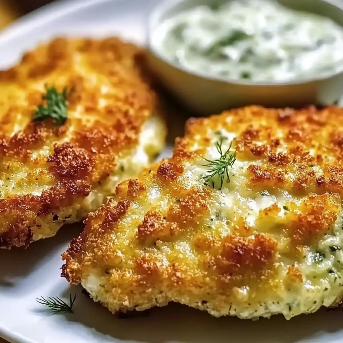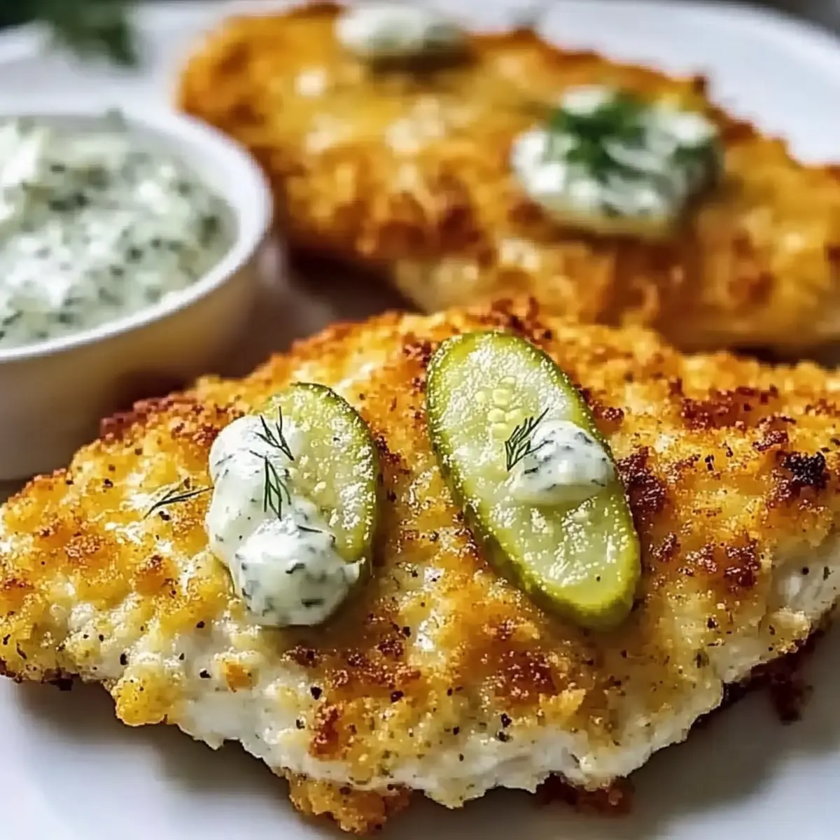 “Ever found yourself torn between craving comforting fried chicken and wanting something a little different? Let me introduce you to my irresistible Crispy Dill Pickle Parmesan Chicken. This recipe marries rich flavors and textures, featuring chicken that’s incredibly juicy thanks to a pickle brine marinade, all wrapped up in a delightfully crunchy crust. It’s not just a satisfying meal but also a quick option for a weeknight dinner or an exciting sandwich when you’re feeling adventurous. Imagine the delight of your family when they take that first bite and are met with a deliciously tangy twist! Are you ready to bring some zing to your dinner table?” Why is this chicken so special? Unique Flavor Combination: This recipe combines the tanginess of dill pickle brine with rich Parmesan, delivering a flavor explosion in every bite. Effortless Preparation: With minimal ingredients and straightforward steps, this dish is perfect for home cooks of any skill level. Crowd-Pleasing Appeal: Whether you serve it as a gourmet sandwich or alongside classic sides, everyone will be asking for seconds! Super Juicy Chicken: The pickle marinade keeps your chicken moist and tender, making it a delightful comfort food option. Versatile Options: Swap chicken for turkey or pork, or add your favorite spices for a custom twist—possibilities are endless! Elevate your meal rotation with this Crispy Dill Pickle Parmesan Chicken and serve it alongside Garlic Parmesan Roasted veggies for the perfect balance! Dill Pickle Parmesan Chicken Ingredients For the Chicken • Boneless, Skinless Chicken Breasts – The main protein source; make sure they are uniform in size for even cooking. • Dill Pickle Juice – Acts as a brine, tenderizing the chicken and adding subtle flavor; substitute with a different pickling brine for variety. For the Coating • All-Purpose Flour – Coats the chicken to help the egg wash stick; can use whole wheat flour for a nuttier flavor. • Large Eggs (whisked) – Binds the coating, ensuring it adheres during frying. • Seasoned Breadcrumbs – Provides the crunchy coating; for a gluten-free version, opt for gluten-free breadcrumbs. • Grated Parmesan Cheese – Adds rich, savory flavors to the crust; swap with Pecorino Romano for a sharper taste. For Seasoning • Garlic Powder – Enhances the overall flavor; adjust to personal preference. • Onion Powder – Adds depth of flavor; feel free to customize. • Paprika – Provides a mild sweetness; can substitute with cayenne for a kick. • Salt and Pepper – Enhances all the flavors; using sea salt refines the taste. For Cooking • Cooking Oil (for frying) – Essential for achieving a crispy texture; vegetable or canola oil works well. Step‑by‑Step Instructions for Dill Pickle Parmesan Chicken Step 1: Marinate the Chicken Start by placing your boneless, skinless chicken breasts into a bowl or large resealable bag. Pour in enough dill pickle juice to fully submerge the chicken and seal it tightly. Refrigerate the marinating chicken for at least 30 minutes, or up to 2 hours for maximum flavor and tenderness. This step ensures every bite of your Dill Pickle Parmesan Chicken is juicy and packed with tang. Step 2: Prepare the Breading Stations While the chicken marinates, set up three shallow dishes for the breading process. In the first dish, combine all-purpose flour with garlic powder, onion powder, paprika, salt, and pepper. In the second dish, whisk a few large eggs until smooth. Finally, mix seasoned breadcrumbs with grated Parmesan cheese in the third dish. Having these organized will streamline the coating process for your crispy chicken. Step 3: Dredge the Chicken Once the chicken has marinated, remove it from the dill pickle juice and gently pat it dry with paper towels. This helps the coating stick better. Dip each chicken breast first into the flour mixture, shaking off any excess, then immerse it in the egg wash, letting the surplus drip off. Finally, coat the chicken in the breadcrumb-Parmesan mixture, pressing lightly to ensure an even and thorough coverage. Step 4: Heat the Oil In a large skillet, pour in enough cooking oil to reach about ½ inch deep. Heat the oil over medium-high heat until it shimmers and a small piece of breadcrumb sizzles upon contact—this indicates it’s ready for frying. Ensure that your oil is hot enough to deliver that delightful crispy texture without absorbing excess grease as you fry your Dill Pickle Parmesan Chicken. Step 5: Fry the Chicken Carefully place your coated chicken into the hot oil, making sure not to overcrowd the pan. Fry each piece for about 5-7 minutes per side, or until the coating is golden brown and the internal temperature reaches 165°F. Use tongs to flip the chicken halfway through cooking, allowing for an even crispiness on both sides while filling your kitchen with mouthwatering aromas. Step 6: Drain and Rest Once the chicken is cooked to perfection, transfer it to a wire rack set over a baking sheet to drain any excess oil. Allow the crispy Dill Pickle Parmesan Chicken to rest for a few minutes before serving. This resting period helps maintain its juiciness while enhancing the overall texture. Trust me, this step is worth the wait for that ultimate comfort food experience! Make Ahead Options These Crispy Dill Pickle Parmesan Chicken cutlets are perfect for busy weeknights! You can marinate the chicken in dill pickle juice up to 24 hours in advance, allowing the flavors to penetrate deeply and ensuring each bite is juicy and full of tang. Additionally, prep your breading stations (flour, egg, and breadcrumb mixtures) and store them separately in the refrigerator for up to 3 days. To maintain the quality, ensure everything is tightly covered to prevent any drying out. When you’re ready to cook, simply dredge the marinated chicken pieces and fry them as instructed. This way, you’ll have a comforting, restaurant-quality meal on the table with minima