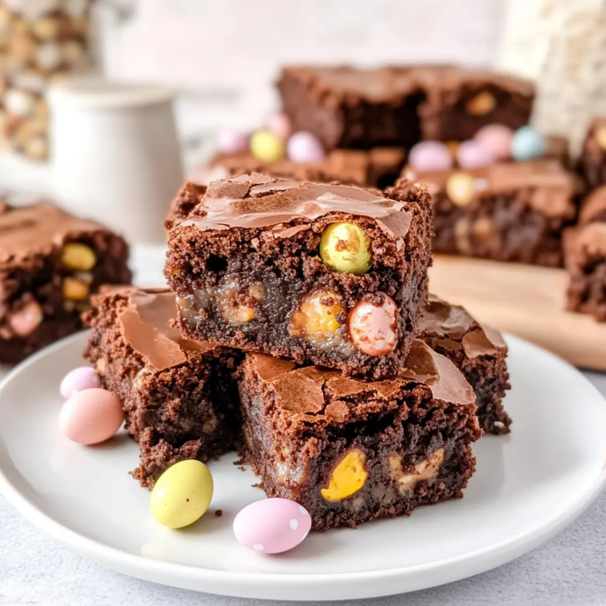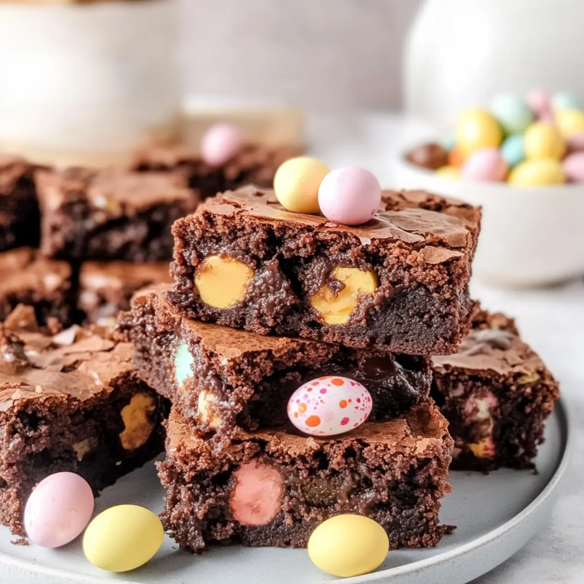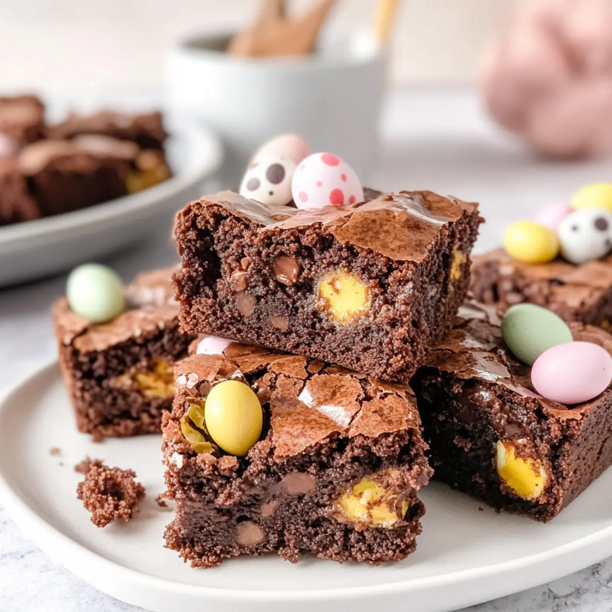 As I was decorating for Easter, I stumbled across a vibrant bag of mini chocolate eggs that instantly transported me to my childhood. This year, I knew I had to channel that nostalgic joy into my baking with these Fudgy Easter Brownies with Mini Eggs. Crafted from scratch, these brownies are more than just a sweet treat; they bring a fun twist to your dessert table while being incredibly easy to whip up. With their moist, chewy texture and the delightful crunch of colorful candy shells, they’re perfect for potlucks or family gatherings, sure to please all ages. So, are you ready to elevate your Easter celebrations with this irresistible dessert? Let’s dive in! Why Make Easter Brownies with Mini Eggs? Irresistible Decadence: These brownies are incredibly fudgy and moist, making each bite a chocolate lover’s dream come true! Simple Preparation: With straightforward steps, you can have these delightful treats ready in no time, perfect for those busy Easter celebrations. Festive Touch: The colorful mini eggs not only offer visual appeal but also bring a fun crunch that kids and adults will adore. Versatile Treat: Enjoy them as a standalone dessert or pair them with a scoop of vanilla ice cream for an extra indulgence. Make Ahead Option: These brownies store beautifully, allowing you to bake in advance, making your holiday planning stress-free! Check out my Mini Tropical Pavlovas for another easy-to-make festive dessert! Easter Brownies with Mini Eggs Ingredients For the Brownie Batter • Semi-sweet baker’s chocolate – Provides rich chocolate flavor; try dark chocolate for an even more intense taste. • Salted butter – Adds moisture and richness; unsalted butter can be used with a pinch of salt. • White sugar – Sweetens the brownies and contributes to a chewy texture; consider coconut sugar for a unique flavor twist. • Eggs (large, room temperature) – Helps bind the ingredients while adding moisture. • Vanilla extract – Enhances the overall flavor; using vanilla bean paste intensifies the richness. • All-purpose flour – Provides structure; a gluten-free blend can be substituted for a gluten-free option. • Unsweetened cocoa powder – Intensifies the chocolate flavor; no substitutions recommended for optimal taste. • Salt – Enhances flavor, balancing the sweetness of the brownies. • Mini eggs – Adds color and crunch; feel free to substitute with any chocolate candies for variation. Step‑by‑Step Instructions for Easter Brownies with Mini Eggs Step 1: Preheat Your Oven Begin by preheating your oven to 350°F (175°C). While it warms up, prepare an 8×8 inch baking dish by greasing it with butter or lining it with parchment paper. This will ensure that your fudgy Easter brownies with mini eggs easily release from the dish once baked, resulting in beautifully intact squares. Step 2: Melt the Chocolate In a microwave-safe bowl, combine the chopped semi-sweet baker’s chocolate with salted butter. Melt them together in the microwave at 20-second intervals, stirring well after each, until the mixture is smooth and glossy. This should take about 1-2 minutes. This rich chocolate base will give your brownies that irresistible fudgy texture. Step 3: Mix the Sugar Once the chocolate and butter are melted, transfer the mixture to a mixing bowl. Add the white sugar and whisk vigorously until well combined, creating a smooth paste. This step is essential for achieving the perfect chewy consistency in your Easter brownies with mini eggs, so ensure everything is well blended. Step 4: Incorporate Eggs and Vanilla Next, crack in the large room temperature eggs and pour in the vanilla extract. Whisk the mixture for about 5 minutes until it becomes light, airy, and slightly thickened. This aeration will add to the decadent chewiness of your brownies, making them utterly enjoyable. Step 5: Add Melted Chocolate Mixture Now, gently stir the melted chocolate mixture into your egg and sugar blend. Use a spatula or wooden spoon to combine everything until you see no streaks of chocolate. This step is vital as it amalgamates the flavors, grounding your fudgy Easter brownies with mini eggs in rich chocolate. Step 6: Combine Dry Ingredients Sift together the all-purpose flour, cocoa powder, and salt over your chocolate mixture. Fold gently with a spatula until just combined. Be careful not to overmix; this could lead to tough brownies. The aim is to keep your brownie batter thick and fudgy, which is essential for a delightful treat. Step 7: Add Mini Eggs Now, it’s time to fold in those colorful mini eggs! Gently incorporate them into the brownie batter, making sure they are evenly distributed. This adds both sweetness and a festive touch to your fudgy brownies, ensuring that bursts of flavor await in every bite. Step 8: Prepare to Bake Pour the rich brownie batter into your prepared baking dish. Use a spatula to spread it evenly as you smooth the top. For added flair, press some more mini eggs on top, ensuring they’ll be a lovely focal point in your finished brownies. This will make your Easter brownies with mini eggs even more appealing. Step 9: Bake to Perfection Place the baking dish in the preheated oven and bake for 25-28 minutes. To check for doneness, insert a toothpick into the center; it should come out with a few moist crumbs, not wet batter. This is the hallmark of perfectly fudgy brownies—rich and delectable! Step 10: Cool Before Serving After baking, remove the dish from the oven and allow the brownies to cool completely in the pan on a wire rack. This cooling period is crucial for achieving the best fudgy texture. Once cooled, cut them into squares and get ready to indulge in your delightful Easter brownies with mini eggs! Expert Tips for Easter Brownies with Mini Eggs • Don’t Overmix: Overmixing can make your brownies tough. Mix until just combined for that perfect fudgy texture. • Let Them Cool: Allow your brownies to cool completely before cutting. T