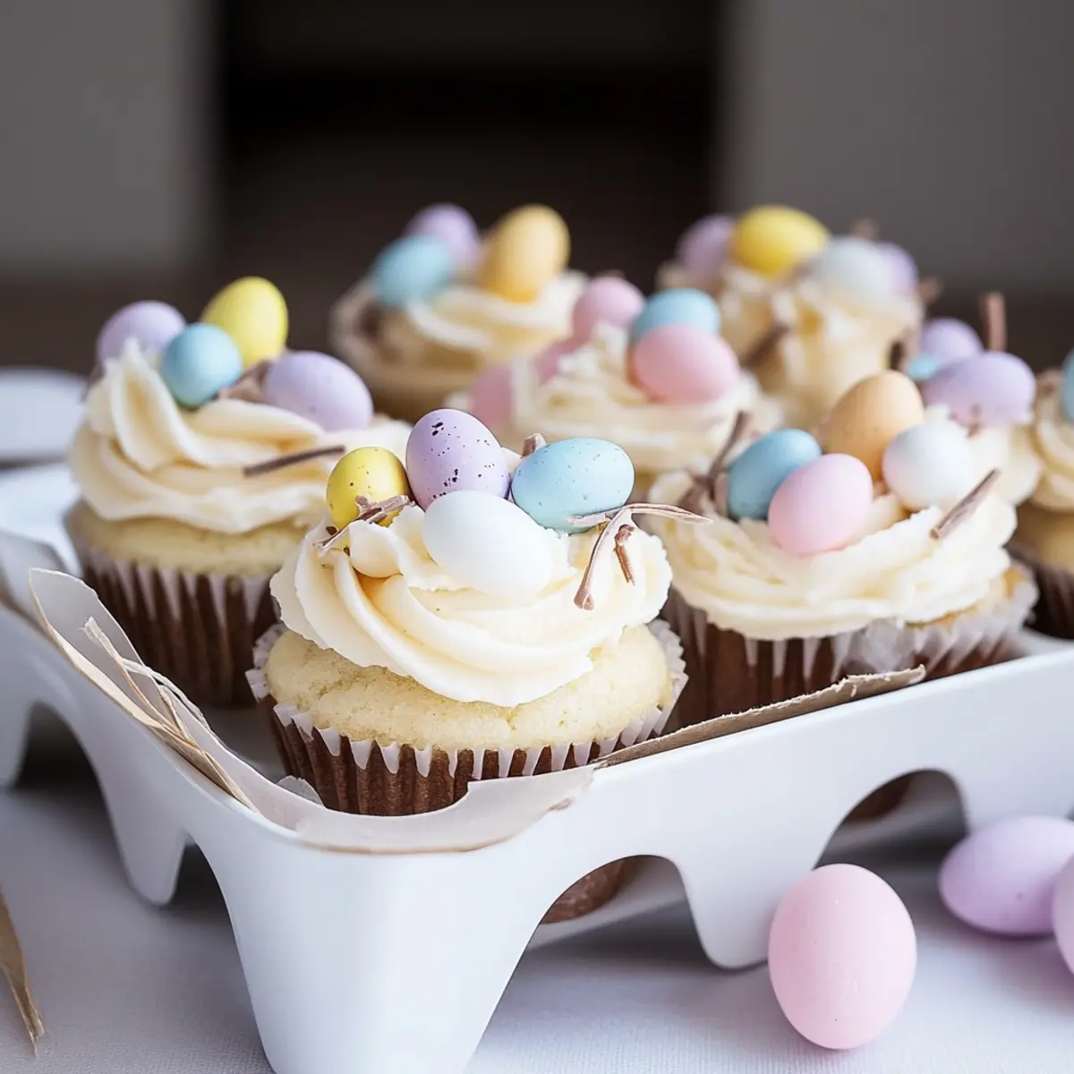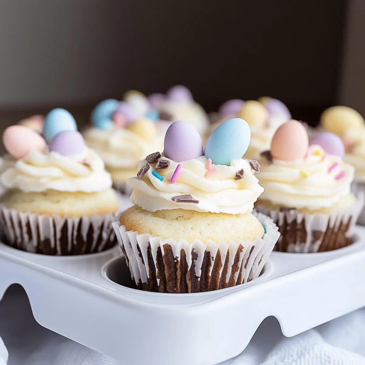 Delightful Easter cupcakes with a vanilla base and white chocolate frosting, perfect for spring celebrations.