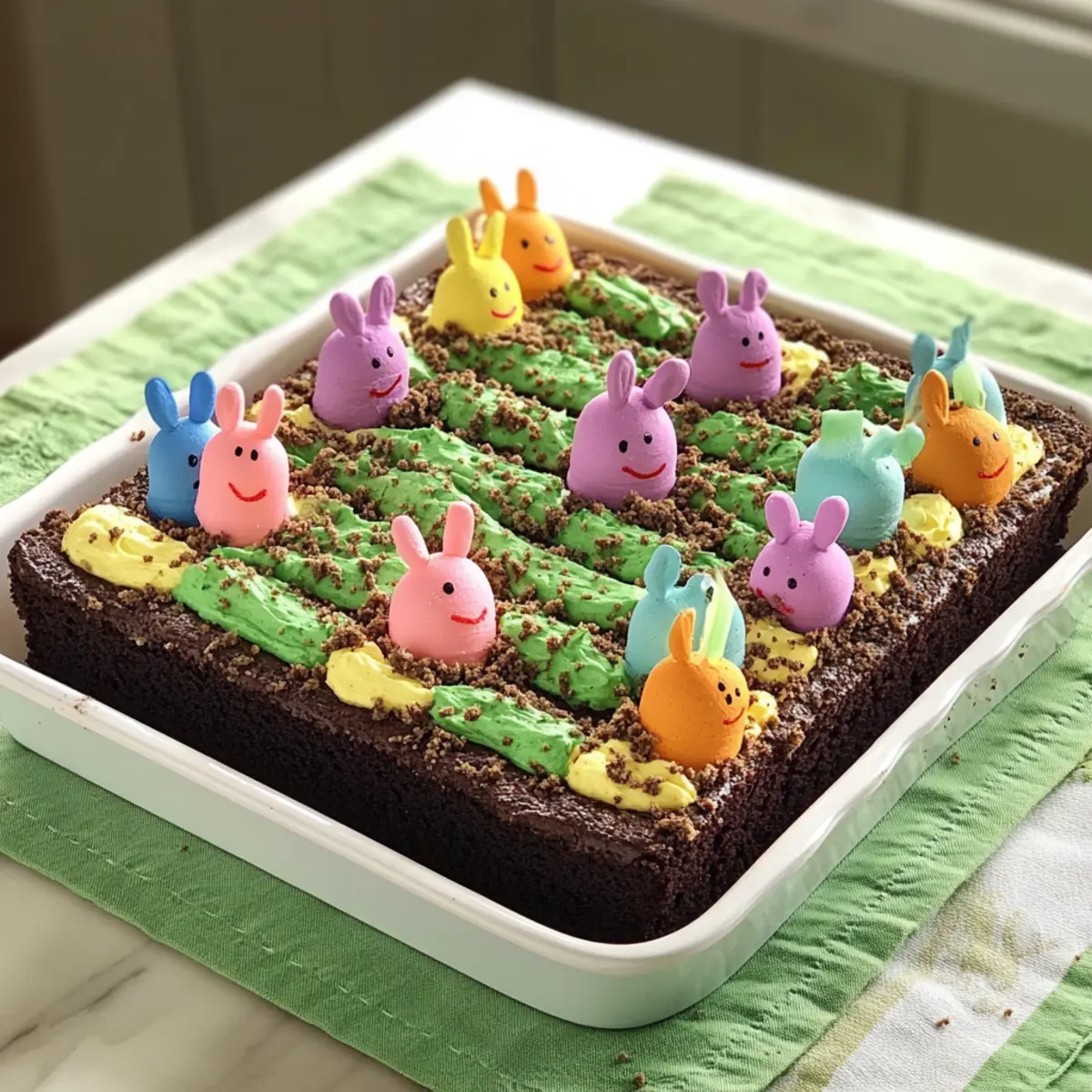 Sprinkle chocolate cookie crumbs over the frosting to mimic a garden effect, covering the top and sides. Use the Betty Crocker™ Green Decorating Icing to pipe grass around the base of the cake, creating a whimsical look. Finish by placing your PEEPS® marshmallow bunnies on top, arranging them creatively for a playful centerpiece.