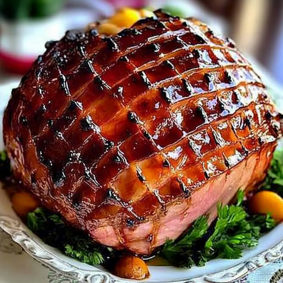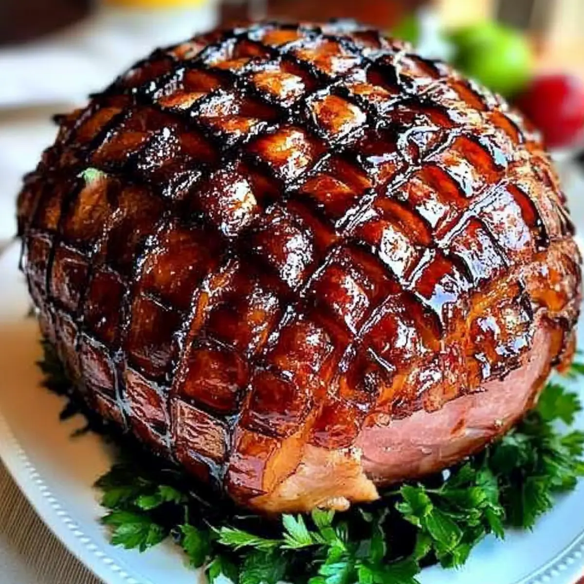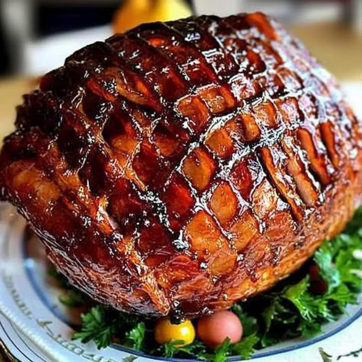 As I stood in my kitchen, the scent of something sweet and aromatic wafted through the air, a reminder of family gatherings and joyous celebrations. This Sticky-Sweet Glazed Easter Ham with Dr. Pepper has become a beloved centerpiece at our holiday feasts—an Easter ham recipe that’s as easy to prepare as it is impressive. The simplicity of the glaze, combining the rich flavors of brown sugar, spicy mustard, and the unique kick from Dr. Pepper, guarantees that everyone will revel in every succulent bite. Not only does this dish bring comfort and nostalgia to the table, but it also serves as a total crowd-pleaser, making it perfect for your holiday gatherings. Are you ready to create a show-stopping ham that will become the star of your Easter celebrations? Let’s dive into the recipe! Why is this Easter Ham Recipe special? Easy Preparation: This Easter ham recipe simplifies your holiday cooking, ensuring even novice chefs can achieve a stunning result with minimal effort. Crowd-Pleasing Delight: The combination of sweet Dr. Pepper and rich brown sugar offers a mouthwatering flavor that will leave your guests craving more, making it a guaranteed hit. Beautiful Presentation: With a glossy glaze and traditional whole cloves, this ham becomes a show-stopping centerpiece, elevating your dining experience. Versatile Variations: Feel free to experiment by swapping Dr. Pepper for Coca-Cola or adding a splash of orange juice for a unique twist. You can also pair it with comforting sides like mashed potato fries or baked ziti to create a feast that everyone will love. Perfect for Gatherings: Whether it’s a family dinner or festive celebration, this ham enhances every occasion, inviting laughter and happy memories to your table! Easter Ham Recipe Ingredients For the Ham Whole Fully Cooked Bone-In Ham (15 to 18 pounds) – This is the main protein, providing an unforgettable base flavor. Whole Cloves – These add a delightful aroma and traditional decorative touch to your Easter ham. For the Glaze Brown Sugar (3 cups) – A key ingredient for sweetness and caramelization in your glaze; absolutely essential! Spicy Brown Mustard (1/2 cup) – Brings a tangy depth to your glaze; you can swap it for regular mustard if you prefer a milder taste. Dr. Pepper or Coke (1 can) – Adds sweetness and helps achieve that perfect glaze; skip diet versions for the best results. Apple Cider Vinegar (3 tablespoons) – Balances the sweetness nicely, enhancing your Easter ham recipe flavor profile. Step‑by‑Step Instructions for Sticky-Sweet Glazed Easter Ham with Dr. Pepper Step 1: Preheat the Oven Begin by preheating your oven to 325°F (163°C). This temperature is ideal for slowly warming the Easter ham, allowing the flavors to develop beautifully. Ensure you have a large roasting pan ready, which will comfortably hold your fully cooked bone-in ham. Step 2: Score the Ham Take a sharp knife and carefully score the surface of the ham in a diamond pattern, making shallow cuts about an inch apart. This step helps the glaze to penetrate and flavor the meat. As you score, insert whole cloves into the center of each diamond, giving your Easter ham a beautiful, fragrant presentation. Step 3: Warm the Ham Cover your ham with aluminum foil to keep in moisture, and place it in the preheated oven. Warm the ham for approximately 2 to 2.5 hours, following any specific package instructions. You’ll know it’s ready when it’s heated through; the internal temperature should reach around 140°F (60°C). Step 4: Prepare the Glaze While the ham is warming, prepare the sticky-sweet glaze. In a medium saucepan, combine 3 cups of brown sugar, ½ cup of spicy brown mustard, 3 tablespoons of apple cider vinegar, and 1 can of Dr. Pepper. Bring the mixture to a boil over medium heat, then reduce to a simmer for 15-20 minutes, allowing it to thicken and develop a rich, syrupy consistency. Step 5: Brush the Ham After 1.5 to 2 hours of baking, carefully remove the foil from the ham. Use a pastry brush to generously coat the ham with the prepared glaze, ensuring it gets into those scored cuts for maximum flavor. Return the ham uncovered to the oven for 20 minutes to allow the glaze to caramelize beautifully. Step 6: Glaze Reapplication Continue the glazing process every 20 minutes after the initial brush. Each time you open the oven, brush on more glaze, allowing it to accumulate and create a shiny, sticky exterior. Aim for 2 to 4 coats of glaze, and enjoy watching the Easter ham transform into a golden delight as it heats through. Step 7: Final Baking Once the ham has been glazed multiple times and is heated through, remove it from the oven. Let your sticky-sweet glazed Easter ham rest for about 15-20 minutes before slicing. This resting period allows the juices to redistribute, making each slice tender and juicy for your holiday feast. Expert Tips for the Best Easter Ham Perfect Glazing Timing: Glaze the ham in the last hour of cooking to avoid burning the sugars; this ensures a deliciously sticky finish. Clove Placement: When inserting cloves, space them evenly for a balanced aroma and an attractive presentation; too many can overwhelm the flavor. Moisture Maintenance: Tent the ham with foil during reheating to lock in moisture, preventing the meat from drying out, which maintains the integrity of your Easter ham recipe. Cleanup Hack: To avoid a messy oven, place a rack under the roasting pan to catch drips; it makes cleaning up after your celebration a breeze! Slicing Technique: Use a sharp carving knife for clean slices; this enhances the presentation and ensures everyone enjoys the flavorful meat without tearing. Storage Tips: If you have leftovers, store them in an airtight container in the fridge for up to three days, ensuring your delicious Easter ham continues to impress! How to Store and Freeze Easter Ham Recipe Fridge: Store leftover glazed ham in an airtight container for up to 3 days. This will keep it fresh and del