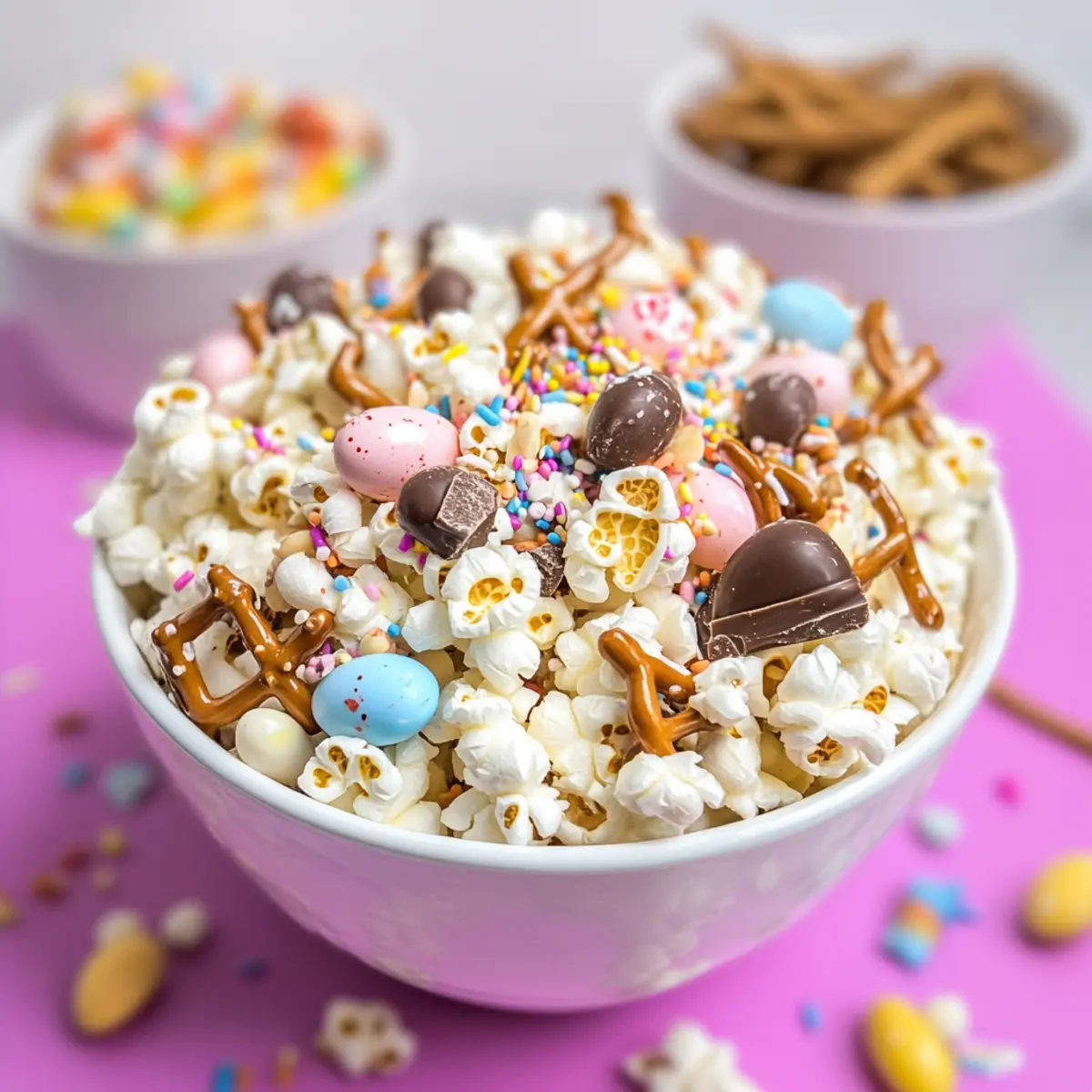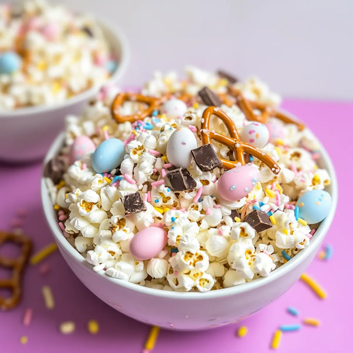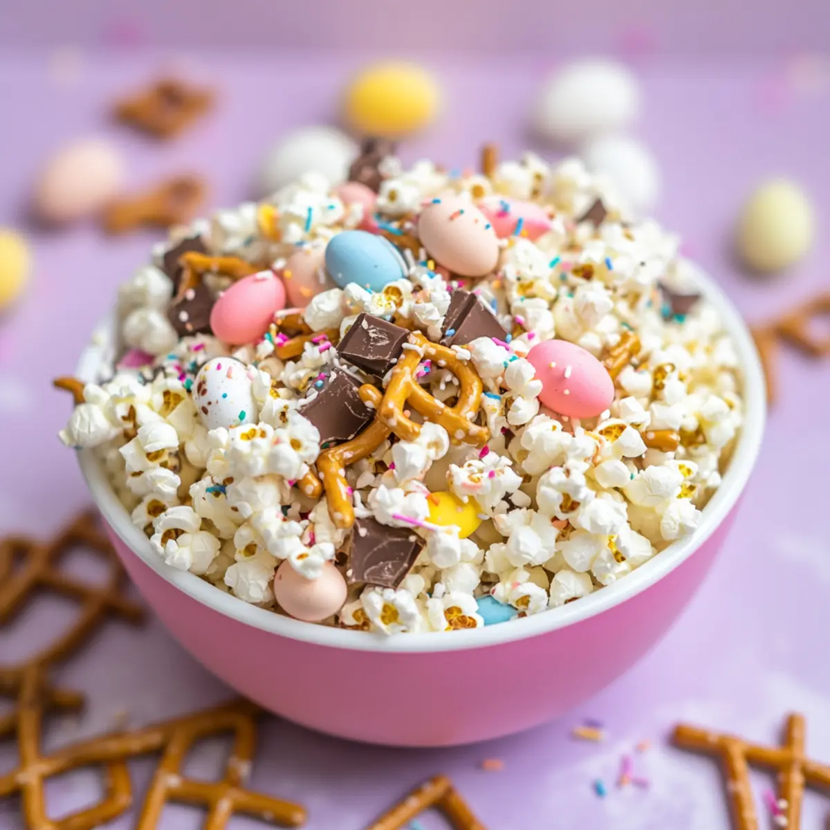 Amid the hustle of preparing for Easter, an unexpected treat can brighten anyone’s day—think sweet, crunchy delight that comes together in a flash. Enter the festive White Chocolate Bunny Bait Popcorn, a no-bake marvel that requires just 15 minutes of your time. This fun-filled recipe takes classic popcorn and elevates it with the perfect balance of creamy white chocolate, salty pretzels, and colorful chocolate mini eggs, making it a crowd-pleaser suitable for all ages. Not only is it an easy, festive treat for holiday gatherings, but it also serves as a delightful snack that will have everyone reaching for seconds. Who wouldn’t want to indulge in such playful bite-sized goodness? Ready to get started on this cheerful concoction? Let’s dive in! Why is Bunny Bait So Irresistible? Quick, No-Bake Delight: This Easter Popcorn is a breeze to make and perfect for those last-minute treats. Just 15 minutes, and you’ve got a festive snack ready! Crowd-Pleasing Flavor: The blend of sweet white chocolate, crunchy pretzels, and colorful mini eggs creates a flavor explosion that appeals to both kids and adults alike. Endless Variations: Feel free to swap in dark chocolate or mix in your favorite candies for a personalized touch. The versatility is endless! Fun for Everyone: Whether you are planning a large family gathering or a small get-together, this treat will surely make everyone smile. Serve it in vibrant jars or bowls for a festive display. Boredom Buster: If you’re tired of fast food snacks, this playful popcorn is an exciting change that keeps everyone coming back for more. Add it to your party table or simply enjoy it on a cozy movie night! Easter Popcorn Ingredients For the Base • Popcorn Kernels – Provides a light and crunchy texture; air-popped is best for this Easter Popcorn. • White Melting Chocolate – Adds sweetness and acts as the binder; you can use chocolate chips as a substitute. For the Creaminess • Coconut Oil or Butter – Enhances the flavor and creaminess of melted chocolate; unsalted butter is a great alternative. For the Festive Touch • Mini Eggs (Crushed) – Adds colorful pops of flavor; any small chocolate candies can work for variety. • Pretzel Sticks – Brings a salty crunch that balances the sweetness; use gluten-free pretzels if needed. • Sprinkles – Adds vibrant color and fun; choose a themed mix to match your Easter festivities. Step‑by‑Step Instructions for Easter Popcorn – Bunny Bait Step 1: Pop the Popcorn Begin by popping the popcorn kernels using an air popper, which will yield about 8 cups of fluffy popcorn. Once popped, transfer the popcorn to a large mixing bowl, ensuring it’s light and airy without any unpopped kernels. If necessary, separate the popcorn into two batches to make mixing easier as you prepare your Easter Popcorn – Bunny Bait. Step 2: Melt the Chocolate In a microwave-safe bowl, combine the white melting chocolate and coconut oil. Heat the mixture in 30-second intervals, stirring after each interval until fully melted and smooth, which should take about 1-2 minutes. Be careful not to overheat, as this may lead to clumpy chocolate. The creamy, melted chocolate will perfectly coat the popcorn and give it that sweet bite. Step 3: (Optional) Add Color For a festive touch, add 3-4 drops of red food coloring into the melted chocolate and stir until well combined. This step is optional, but it can brighten up your Easter Popcorn – Bunny Bait with a charming hue that echoes the holiday spirit. The vibrant color will make your treat even more enticing when mixed with other ingredients. Step 4: Layer the Ingredients Now, take half of the popped popcorn and place it in a serving bowl. Sprinkle half of the broken pretzels, crushed mini eggs, and a generous handful of colorful sprinkles over the popcorn. Drizzle half of the melted white chocolate mixture across the top. This layering creates a delightful combination of flavors and textures, ensuring every bite is packed with goodness. Step 5: Repeat the Process Next, repeat the layering process with the remaining popcorn and toppings. Add the rest of the popcorn, followed by the pretzels, crushed mini eggs, and another sprinkle of vibrant treats. Finish it off by drizzling the last portion of white chocolate over the top, ensuring that every morsel of your Easter Popcorn – Bunny Bait is decadent and delicious. Step 6: Set and Serve Spoon the mixture onto parchment or wax paper, spreading it out gently to allow for even setting. Let the Easter Popcorn – Bunny Bait cool completely at room temperature, which will take about 15-20 minutes. Once set, this treat is ready to be served at your festive gathering or enjoyed at home with family. Storage Tips for Easter Popcorn – Bunny Bait Room Temperature: Keep your Easter Popcorn in an airtight container at room temperature for optimal freshness; it’s best enjoyed within two days. Refrigerator: If you prefer a chilled snack, store in the fridge for up to four days, but be aware that the texture may become less crunchy. Freezer: For longer storage, freeze the Easter Popcorn in a sealed bag for up to one month. Thaw at room temperature before serving to regain its delightful crunchiness. Reheating: If you like it warm, zap in the microwave for a few seconds, but take care to avoid melting the chocolate further. Enjoy your festive treat! What to Serve with Easter Popcorn – Bunny Bait? Bring your holiday celebrations to life with delightful accompaniments that perfectly complement this festive treat. Chocolate-Covered Strawberries: These sweet, juicy bites enhance the dessert experience, adding a fresh and fruity touch that delights the palate. Carrot Cake Bites: A nod to the Easter theme, these mini cakes add a moist, spiced texture that pairs beautifully with the crunchy popcorn. Fruit Salad: A bright mix of seasonal fruits brings a burst of freshness, balancing the sweetness of the Bunny Bait while providing a vib