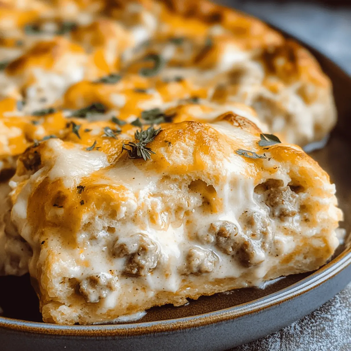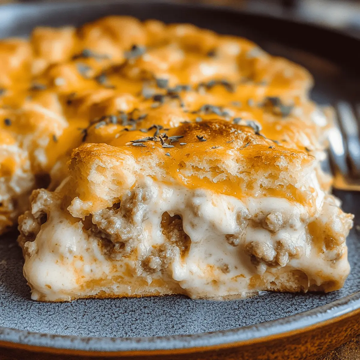 There’s nothing quite like the smell of a warm breakfast filling the house on a lazy weekend morning. That’s why I’m thrilled to share my take on a classic Southern staple: the Easy Biscuits and Gravy Breakfast Casserole. With just seven simple ingredients, this hearty dish is rich in flavor and comfort, making it a perfect crowd-pleaser for brunches, potlucks, or holidays. You’ll love how this hassle-free recipe combines fluffy biscuits, savory sausage, and a creamy white pepper gravy all baked together in one cozy dish. Plus, it’s make-ahead friendly, allowing you to prep it the night before for stress-free mornings. So, are you ready to whip up a breakfast that will have everyone coming back for seconds? Let’s get cooking! Why is this casserole a must-try? Comforting, Hearty Dish: This Easy Biscuits and Gravy Breakfast Casserole brings all the classic flavors of Southern cooking into one satisfying dish. Make-Ahead Magic: Prepare it the night before and pop it in the oven in the morning for a fuss-free breakfast. Crowd-Pleaser: It’s perfect for gatherings, as it serves a crowd and tastes even better the next day. Simple Ingredients: With just seven basic ingredients, you’ll spend less time shopping and more time savoring each delicious bite. For a delightful addition, check out my Cheese Croissant Breakfast or Sweet Potato Breakfast for more breakfast inspiration! Easy Biscuits and Gravy Breakfast Ingredients • Whip up this classic dish effortlessly! For the Casserole Fluffy Biscuits – The base of the casserole; refrigerated biscuits work great for quick prep. Savory Sausage – Adds a rich depth of flavor; feel free to use turkey or plant-based sausage for a lighter option. Creamy White Pepper Gravy – Moisturizes the casserole; homemade gravy can be made using 3 tbsp butter, 3 tbsp flour, and 1½ cups milk. Eggs – Binds everything together; if you need an egg-free option, a biscuit-only bake is a tasty alternative. Cheese – Adds creaminess; try cheddar for a classic taste or experiment with mozzarella or pepper jack for a twist. Salt and Pepper – Essential in enhancing all the flavors; adjust to taste. Optional Toppings Chives or Green Onions – Sprinkle on top for a pop of freshness and color. This Easy Biscuits and Gravy Breakfast combines the comfort food you love with simple, accessible ingredients, making it an ideal favorite for any brunch gathering! Step‑by‑Step Instructions for Easy Biscuits and Gravy Breakfast Step 1: Preheat the Oven Begin by preheating your oven to 350°F (175°C). This ensures the ideal temperature for cooking your Easy Biscuits and Gravy Breakfast Casserole evenly. While the oven warms up, gather your ingredients and baking dish, ready to create a meal that will fill your home with delicious aromas. Step 2: Cook the Sausage In a large skillet, cook the savory sausage over medium heat for about 8–10 minutes, stirring occasionally, until it’s fully browned and crumbly. Make sure to drain any excess fat before moving on to the next step; this helps keep the casserole from becoming greasy and lets the flavors shine through. Step 3: Prepare the Gravy While the sausage is cooking, get started on your creamy white pepper gravy. You can either follow the directions on a store-bought mix or whip up homemade gravy by combining 3 tablespoons of butter, 3 tablespoons of flour, and 1½ cups of milk in the skillet. Stir continuously over medium heat until thickened and smooth, usually about 5 minutes. Step 4: Whisk the Eggs In a mixing bowl, crack the eggs and whisk them together for about a minute. Add a pinch of salt and pepper to season them nicely. This step binds your Easy Biscuits and Gravy Breakfast Casserole and adds a rich, fluffy texture once baked—set the bowl aside while you layer the other ingredients. Step 5: Layer the Casserole Grease a large baking dish with cooking spray or butter, then start layering your casserole. Tear the fluffy biscuits into bite-sized pieces and distribute half evenly along the bottom. Next, evenly sprinkle the browned sausage and pour the warm gravy over this layer, creating a delicious foundation for the dish to build on. Step 6: Add the Eggs and Cheese Pour the whisked eggs over the layered ingredients, making sure to cover everything evenly. Follow this by sprinkling the cheese generously on top, which will melt into a bubbly, golden topping as it bakes. This combination of textures in your Easy Biscuits and Gravy Breakfast Casserole will surely please everyone at your table. Step 7: Bake Until Perfect Place the baking dish in the preheated oven and bake for 30–35 minutes. Keep an eye on it; the casserole is ready when it is set in the center and has a beautiful golden crust on top. The enticing scent wafting through your kitchen will signal that your hearty breakfast is almost ready to serve. Step 8: Cool and Serve Once out of the oven, allow the casserole to cool for about 5 minutes before slicing and serving. This brief cooling time helps ensure the layers hold together when you dish it out. Consider garnishing with fresh chives or green onions for added flavor and color, completing your Easy Biscuits and Gravy Breakfast! What to Serve with Easy Biscuits and Gravy Breakfast Elevate your breakfast experience by pairing this comforting dish with delightful sides that complement its rich flavors. Fresh Fruit Medley: A vibrant mix of seasonal fruits adds sweetness and balances the savory elements of the casserole. The juicy flavors create a refreshing contrast, making each bite even more enjoyable. Crispy Hash Browns: Their golden, crunchy texture provides a satisfying takedown of the creamy casserole. The slight saltiness enhances the dish, bringing out its comforting essence. Green Salad with Vinaigrette: A light, crisp salad can cleanse your palate, offering a bright counterpoint to the richness of the casserole. Featuring vibrant greens and tangy dressing enhances the entire meal e