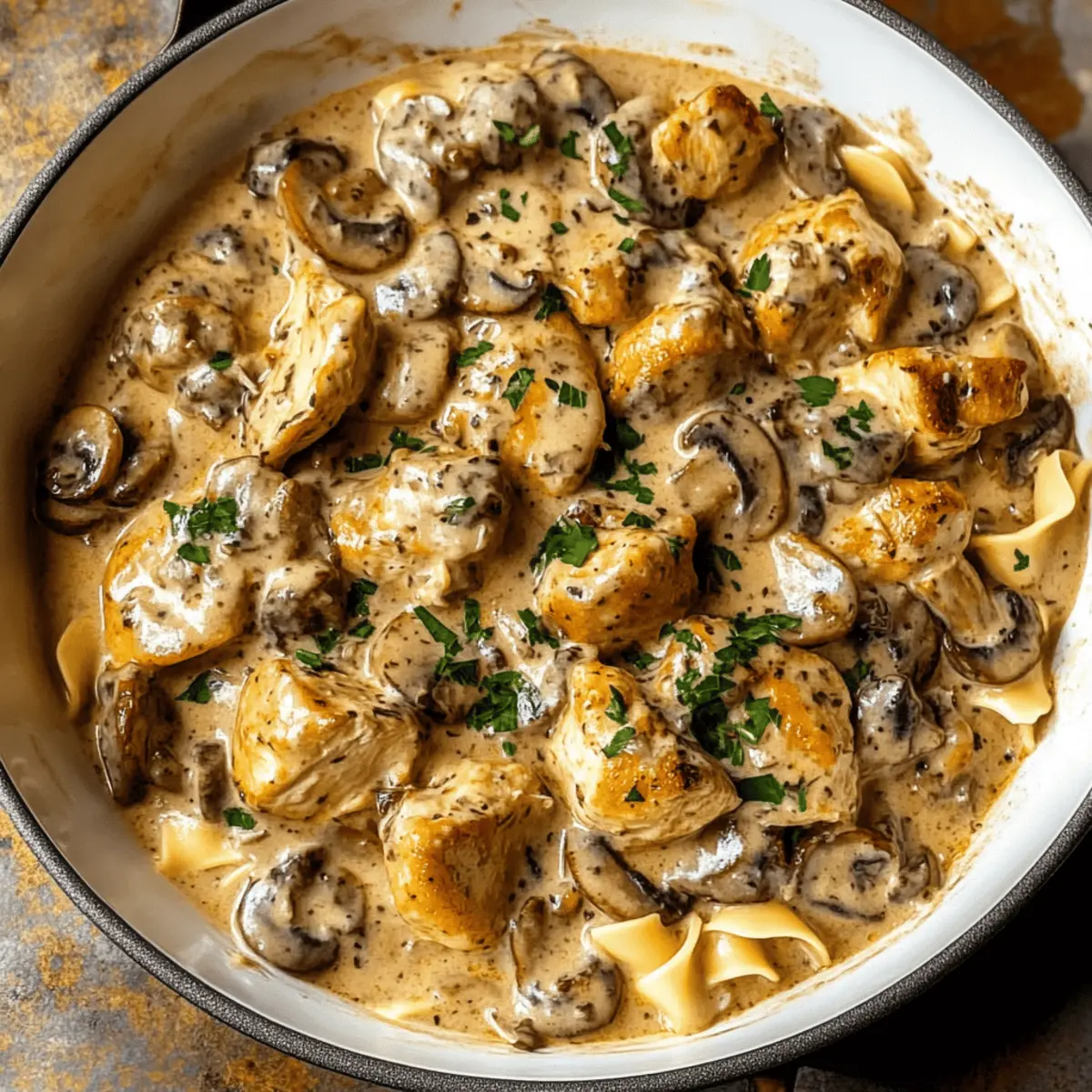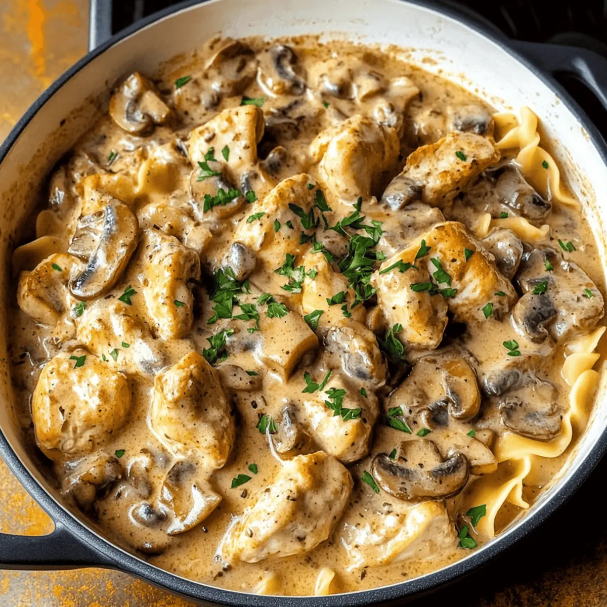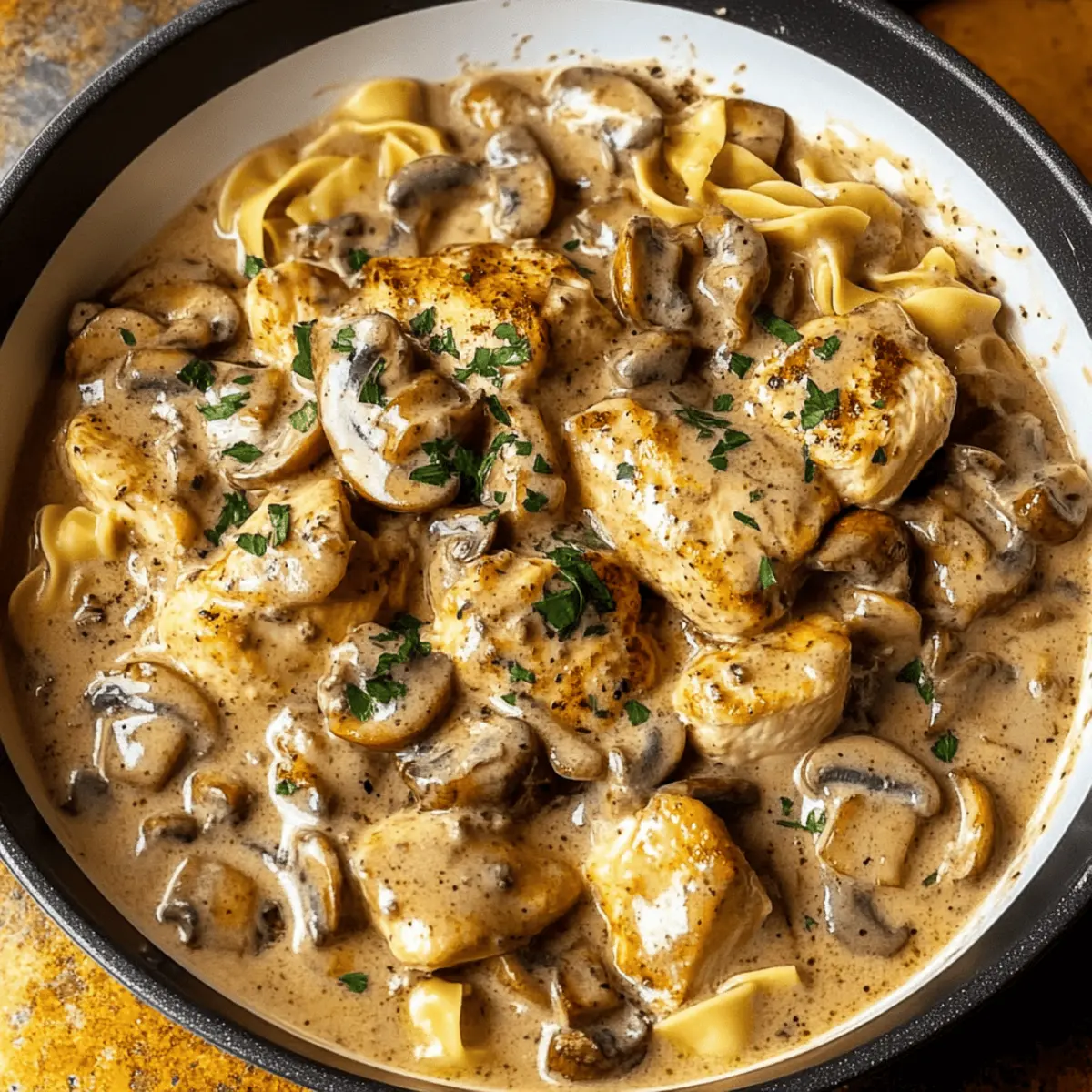 As I stood in my kitchen, the aroma of sautéed mushrooms dancing in the air took me back to family dinners filled with laughter and warmth. This Quick & Creamy Chicken Stroganoff is my nod to those cherished memories, showcasing juicy pan-seared chicken alongside caramelized golden mushrooms enveloped in a velvety sour cream sauce. What I love most about this easy Chicken Stroganoff is that it brings comfort without the fuss—ready in just 30 minutes, making it the perfect solution for hectic weeknights. Whether you’re a busy parent or a culinary enthusiast seeking a delightful quick dinner, this dish consistently pleases everyone at the table. Are you ready to elevate your dinner game with this scrumptious recipe? Why is Chicken Stroganoff a Weeknight Favorite? Quick, delicious meal: Who doesn’t love a satisfying dish that comes together in just 30 minutes? This easy Chicken Stroganoff perfectly fits your busy schedule without compromising on flavor. Creamy indulgence: The lush sour cream sauce creates a comforting vibe that resonates with anyone’s palate. Versatile serving options: Serve it over egg noodles or mashed potatoes, or even try it with rice for a delightful twist. Family-approved: Bring everyone to the table with the hearty and welcoming aroma that fills your kitchen. For more crowd-pleasing ideas, check out Garlic Parmesan Chicken and Cheesy Garlic Chicken. Easy substitutions: Adjust ingredients easily to cater to dietary preferences, ensuring that your homemade classic remains relevant to everyone’s taste! Easy Chicken Stroganoff Ingredients • Get ready to discover the components of this creamy delight! For the Chicken Boneless, Skinless Chicken Breasts – This cut keeps the stroganoff tender and juicy; it’s perfect for quick cooking. For the Vegetables Mushrooms – These add umami and depth; feel free to substitute with bell peppers if you prefer a sweeter taste. Onion – A foundational flavor; shallots can provide a milder aroma if desired. Garlic – Use fresh for that aromatic warmth; garlic powder works in a pinch but won’t pack the same punch. For the Sauce Sour Cream – Essential for that creamy texture; Greek yogurt can lighten things up without sacrificing flavor. Butter – For sautéing vegetables; olive oil is a great healthy swap if you prefer. Chicken or Vegetable Broth – Adds moisture and enhances flavor; homemade or low-sodium options work wonderfully. For Serving Egg Noodles or Mashed Potatoes – The perfect vehicles for that rich sauce; rice or zucchini noodles are excellent low-carb alternatives. Embrace this easy Chicken Stroganoff recipe, where each ingredient plays a vital role in creating the perfect quick comfort meal! Step‑by‑Step Instructions for Easy Chicken Stroganoff Step 1: Sauté Chicken In a large skillet over medium-high heat, melt 2 tablespoons of butter. Add the boneless, skinless chicken breasts and cook for about 5-7 minutes, turning occasionally until they are golden brown and cooked through. Check that the internal temperature reaches 165°F. Once done, remove the chicken from the skillet and set it aside on a plate. Step 2: Cook Vegetables In the same skillet, add the chopped onions and sliced mushrooms. Sauté for about 5 minutes, stirring frequently until the vegetables are softened and the onions become translucent. The mushrooms should be golden brown, releasing their moisture and flavor. This step enhances the base for your creamy sauce in the easy Chicken Stroganoff. Step 3: Make Sauce Reduce the heat to medium and stir in minced garlic, cooking for about 1 minute until fragrant. Then, pour in 1 cup of chicken broth and bring the mixture to a gentle simmer. Next, add 1 cup of sour cream, stirring until combined and creating a smooth sauce. Allow the sauce to thicken slightly for 2-3 minutes, providing that luxurious texture we crave in Chicken Stroganoff. Step 4: Combine Return the sautéed chicken pieces back to the skillet with the sauce. Stir well to ensure the chicken is evenly coated in the creamy mixture. Cook on low heat for another 2-3 minutes, just until the chicken is heated through and the flavors meld together. Taste the sauce and adjust the seasoning if needed. Step 5: Serve Spoon the delicious easy Chicken Stroganoff over cooked egg noodles or mashed potatoes for a comforting meal. Garnish with fresh parsley if desired, adding a pop of color and freshness. The creamy sauce will beautifully coat each strand of noodle, making every bite a warm and inviting experience. Expert Tips for Easy Chicken Stroganoff Chicken Cooking: Ensure the chicken is cooked through but not overcooked to maintain its juiciness. Always check the internal temperature to reach 165°F. Fresh Ingredients: Use fresh garlic for the best flavor impact. Dried garlic can be handy, but fresh will elevate your easy Chicken Stroganoff significantly. Sour Cream Balance: Adjust the sour cream quantity based on your taste preference. A bit less or more can change the creaminess without losing the essence of the dish. Vegetable Choices: Feel free to swap mushrooms with bell peppers or spinach. These substitutions can add different flavors and nutritional benefits to your easy Chicken Stroganoff. Serving Versatility: Serve over different bases like egg noodles, mashed potatoes, or even rice. Each option offers a unique experience while pairing perfectly with the creamy sauce. Storage Tips for Easy Chicken Stroganoff Fridge: Store leftovers in an airtight container in the refrigerator for up to 3 days. This will help keep your easy Chicken Stroganoff fresh and ready for a quick meal. Freezer: If you want to keep it longer, freeze the stroganoff in a freezer-safe container for up to 2 months. Consider portioning into single servings to simplify thawing. Reheating: Gently reheat on the stovetop over low heat, adding a splash of broth or water to loosen the sauce. Stir well to ensure it warms evenly. Serving Suggestions: When ready t