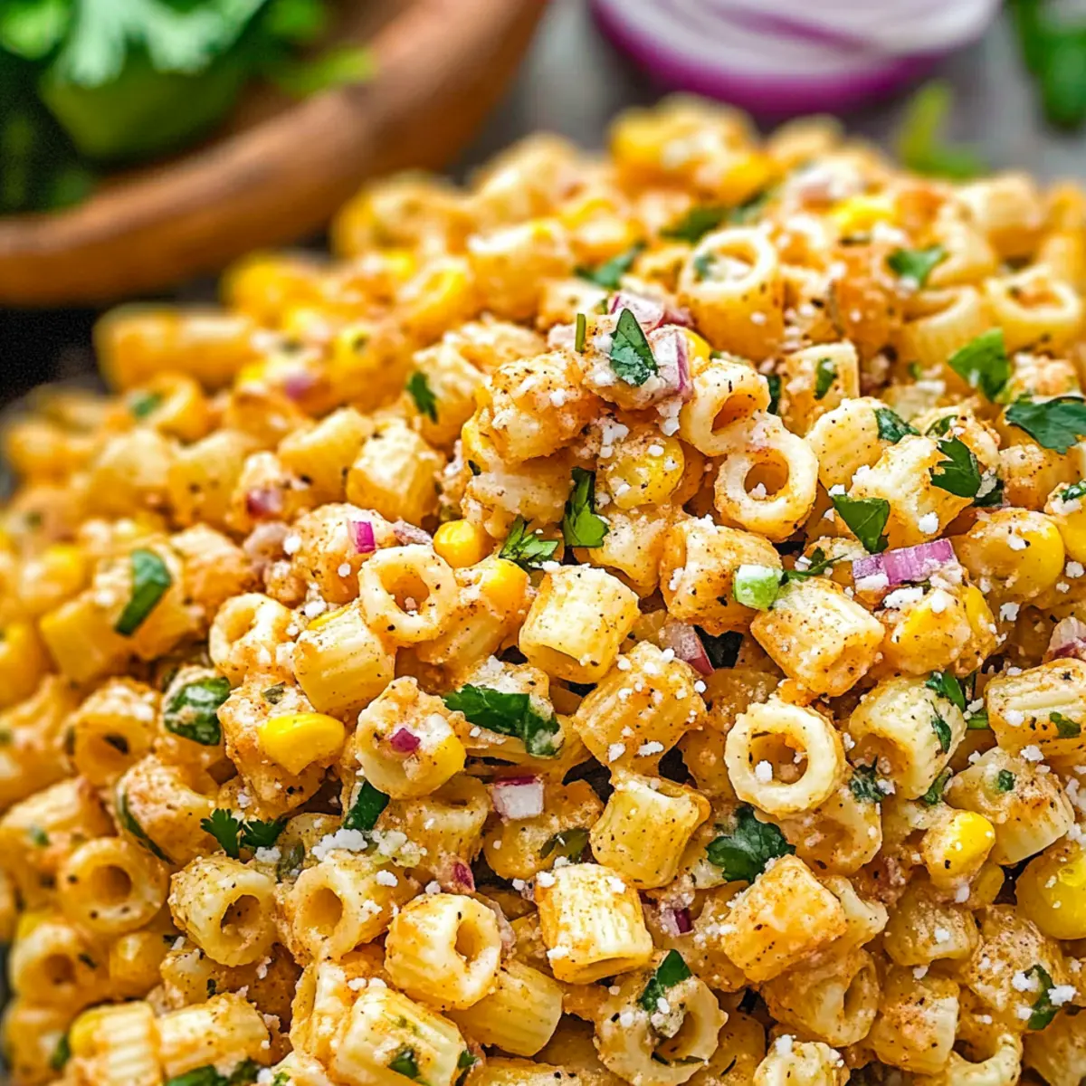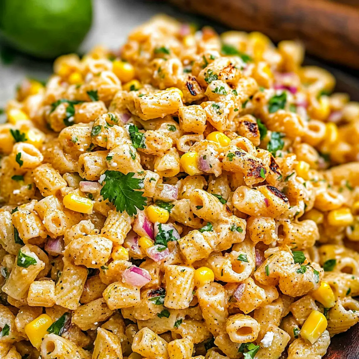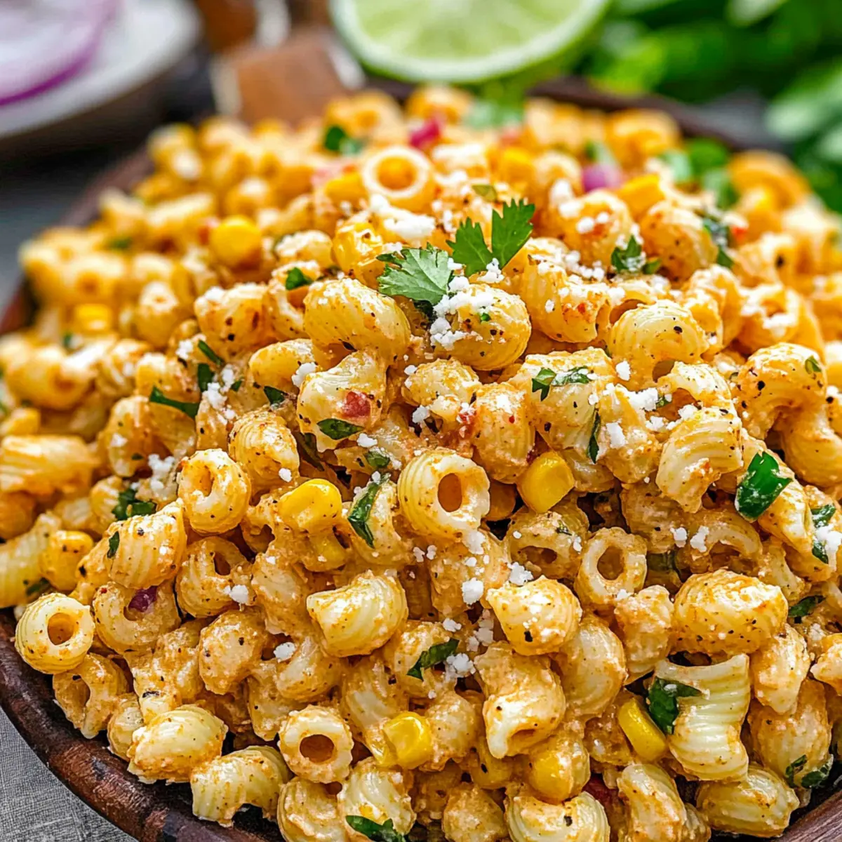 As the sun dips lower and the scent of backyard barbecues fills the air, I find myself craving something refreshing yet hearty for summer gatherings. Enter my Easy Elote Pasta Salad with Creamy Chili-Lime Dressing! This delightful dish marries the smoky richness of Mexican street corn with al dente pasta, delivering a quick and creamy side that everyone will adore. What makes it even better? It’s not only a breeze to whip up but also a perfect crowd-pleaser for picnics and potlucks alike. With bright flavors that dance on your palate and a texture that keeps you coming back for more, you might just find yourself making it every week. Curious about how to bring this burst of yum to your table? Let’s dive in! Why will you love this salad? Quick and Easy: This Easy Elote Pasta Salad comes together in under 30 minutes, making it the perfect solution for those last-minute gatherings. Creamy and Zesty: The creamy chili-lime dressing packs a flavor punch that will elevate any meal. Versatile Dish: Serve it as a side at your next BBQ or as a standalone dish at potlucks—everyone will be asking for the recipe! Crowd-Pleasing Flavors: Smoky roasted corn and fresh cilantro provide a unique twist that will impress your guests. If you’re looking for other delicious salads to complement your gatherings, try the refreshing Cucumber Caprese Salad or the savory Chicken Caesar Salad Wrap. Make-ahead Friendly: This salad can be made ahead of time, and it only gets better as the flavors meld together. Don’t miss out on this gem! Easy Elote Pasta Salad Ingredients • Get ready for a burst of flavor! For the Dressing Mayonnaise – Adds creaminess to the dressing; substitute with Greek yogurt for a lighter version. Sour Cream – Provides tanginess and richness; can also use more mayonnaise or plain yogurt. Garlic (minced) – Adds depth of flavor; fresh garlic is preferred for the best results. Lime Juice – Brightens up the dressing with acidity; for the best taste, use fresh lime. Chili Powder – Adds a mild spiciness; adjust to taste based on preference. Cumin – Contributes earthy notes; omit if unavailable. Paprika – Offers smokiness to mimic grilled flavors; consider smoked paprika for more depth. Cayenne Pepper – Provides heat; omit or reduce for a milder salad. Kosher Salt & Black Pepper – Enhances all flavors; use to taste. For the Salad Ditalini Pasta (12 oz) – Serves as the base, small shape holds dressing well; substitute with farfalle, cavatappi, or fusilli if needed. Grilled or Roasted Corn (16 oz) – Key flavor component that adds sweetness and texture; can use canned or frozen corn as a substitute. Fresh Cilantro (¼ cup, chopped) – Adds freshness; omit if you’re not a fan or use parsley instead. Red Onion (¼ cup, finely diced) – Provides crunch and bite; substitute with green onions for a milder taste. Cotija Cheese (⅓ cup, crumbled) – Offers creaminess and saltiness; feta cheese is a good substitute if needed. Step‑by‑Step Instructions for Easy Elote Pasta Salad Step 1: Prepare the Dressing In a small mixing bowl, whisk together ½ cup mayonnaise, ¼ cup sour cream, 2 minced garlic cloves, 2 tablespoons fresh lime juice, 1 teaspoon chili powder, ½ teaspoon cumin, ½ teaspoon paprika, and a dash of cayenne, salt, and black pepper. Aim for a smooth consistency, ensuring all ingredients are well incorporated. Set this creamy chili-lime dressing aside while the pasta cooks. Step 2: Cook the Pasta Bring a large pot of salted water to a rolling boil over high heat. Add 12 ounces of ditalini pasta and cook according to the package instructions until al dente, usually about 7-9 minutes. Once done, drain the pasta in a colander, and rinse it under cold water to stop the cooking process. Let it cool slightly, ensuring it’s not too hot when mixing with the other ingredients. Step 3: Combine Ingredients In a large mixing bowl, combine the cooked and cooled pasta, 16 ounces of grilled or roasted corn, ¼ cup finely diced red onion, ¼ cup chopped fresh cilantro, and ⅓ cup crumbled cotija cheese. Use a spatula to gently mix the ingredients without breaking the pasta or cheese, ensuring even distribution of colors and flavors in your Easy Elote Pasta Salad. Step 4: Dress the Salad Pour the creamy chili-lime dressing over the combined salad ingredients. Using a spatula, gently toss everything together until all components are coated with the dressing. This step adds the zesty flavor that ties the dish together, so take care to avoid smashing any ingredients while ensuring an even coating. Step 5: Serve or Chill You can serve your Easy Elote Pasta Salad immediately for a fresh taste or let it chill in the refrigerator for 1-2 hours to enhance flavors. If chilling, cover the bowl with plastic wrap to keep it fresh. Just before serving, feel free to garnish with extra cotija cheese, lime zest, and a drizzle of olive oil for an extra touch of flavor and presentation. How to Store and Freeze Easy Elote Pasta Salad Fridge: Store leftovers in an airtight container for up to 3 days. Make sure to seal tightly to maintain freshness and prevent any unwanted odors from affecting the flavors. Freezer: It’s best not to freeze this salad, as the creamy dressing can change texture when thawed. Enjoy it fresh for the best taste! Refreshing Before Serving: If the salad sits for a while, the flavors may dull. Revive it with a splash of fresh lime juice or a bit more dressing before serving. Make-Ahead Tip: You can prepare the salad a day in advance; it just gets better as it chills in the fridge! Make Ahead Options These Easy Elote Pasta Salad are perfect for busy home cooks looking to save time without compromising flavor! You can prepare the creamy chili-lime dressing and cook the ditalini pasta up to 24 hours in advance. Store the dressing in an airtight container in the refrigerator, and keep the cooled pasta in another container, ensuring it’s sealed tightly to maintain qual