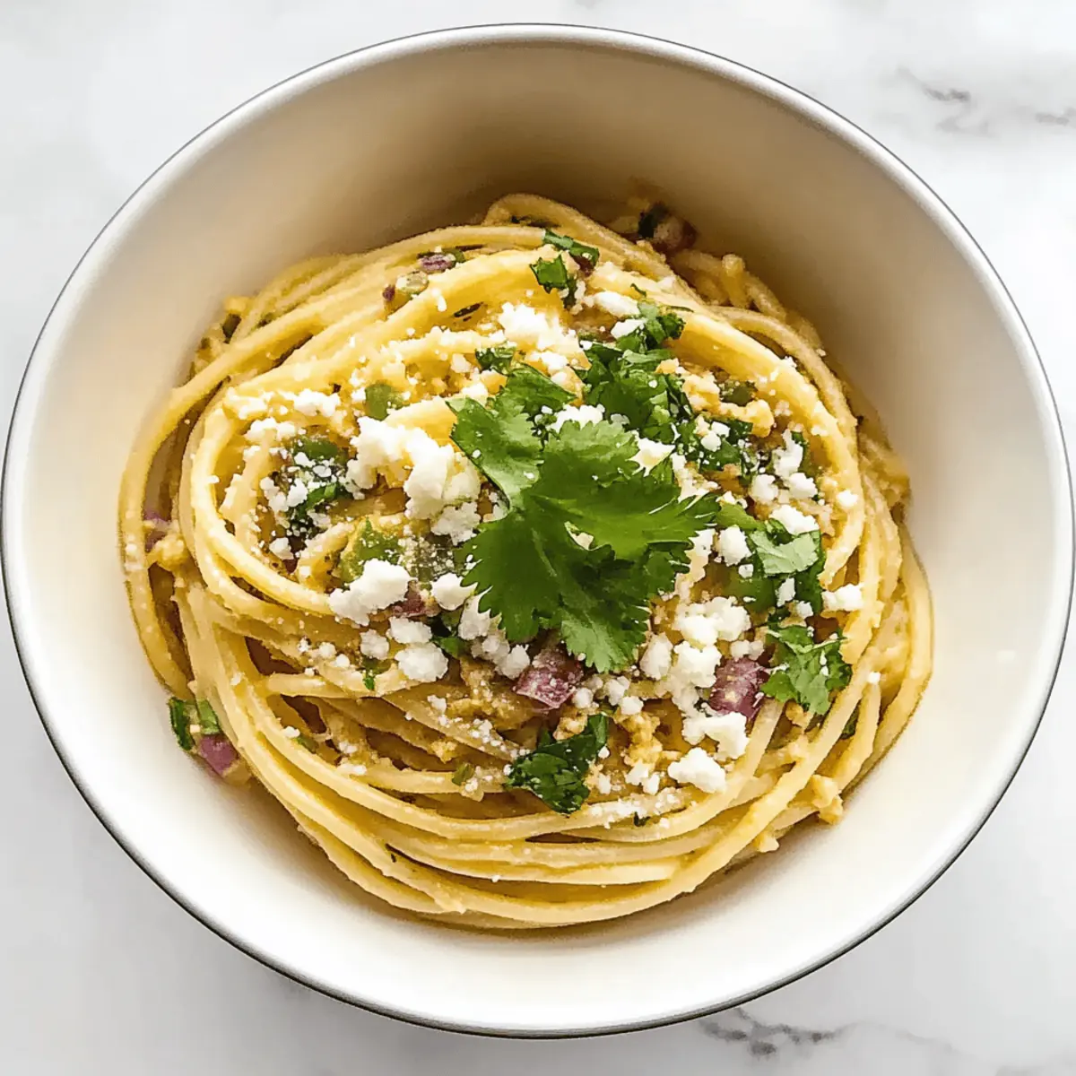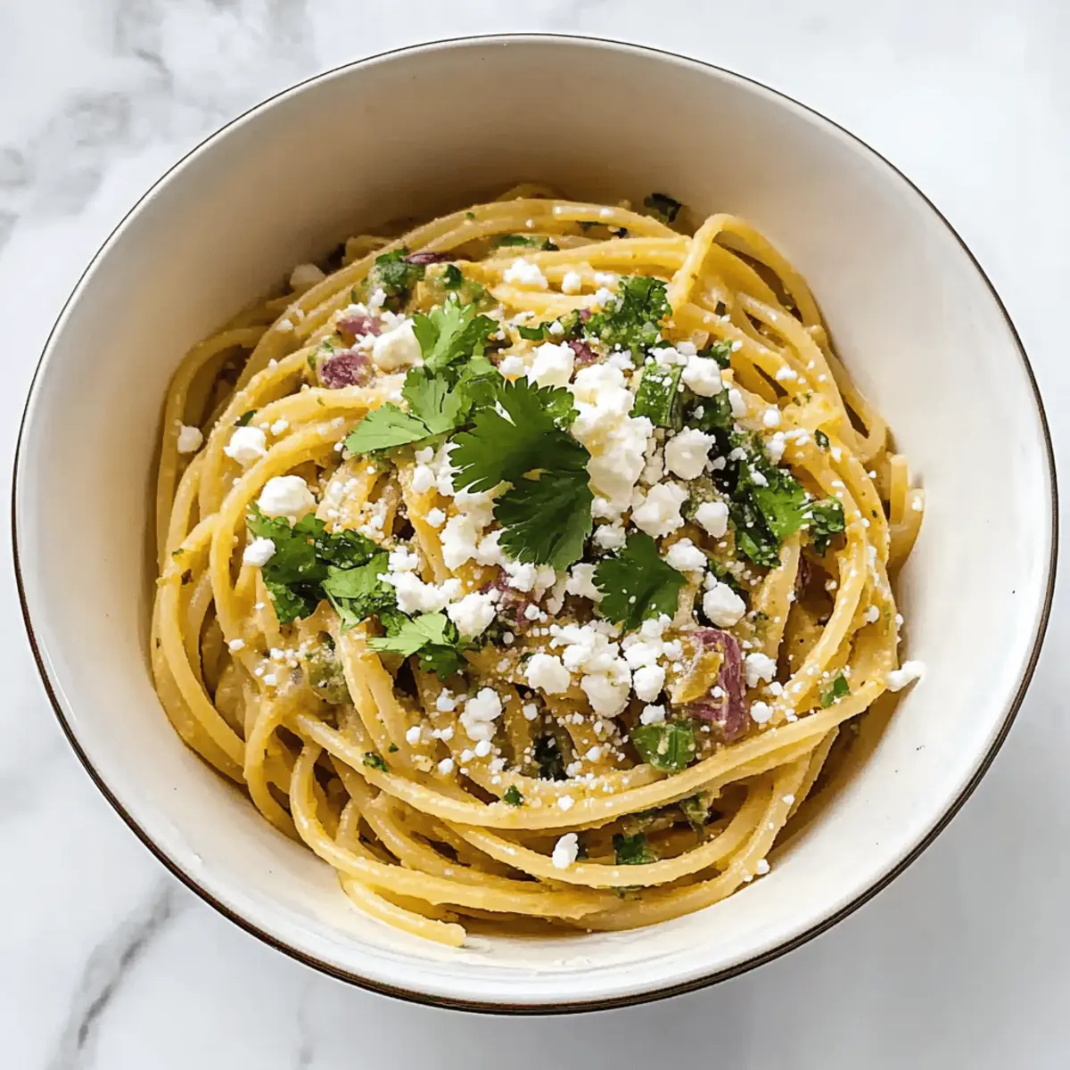 Finally, add your cooked spaghetti to the sauce in the pan, tossing thoroughly to coat the pasta evenly. Let it sit off the heat for a few minutes to thicken further, allowing the flavors to absorb. When ready to serve, garnish each bowl with fresh cilantro and crumbled cotija cheese, if desired. Enjoy your comforting Easy Hatch Chile Pasta while it’s hot!