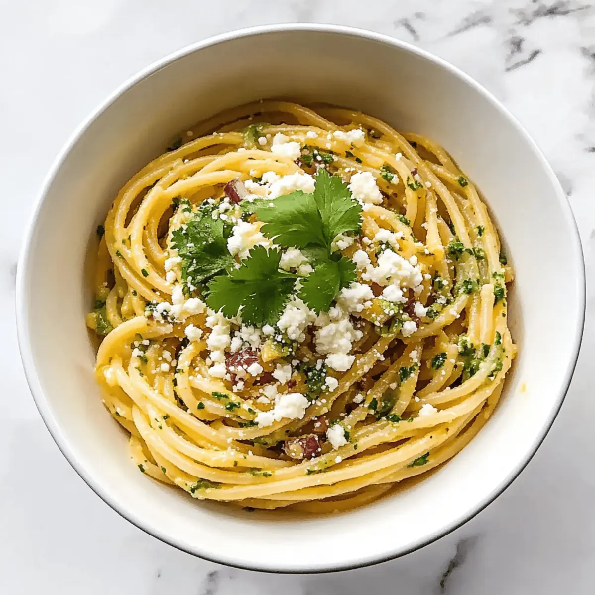 6. Combine cooked spaghetti with sauce and garnish with cilantro and cotija cheese.