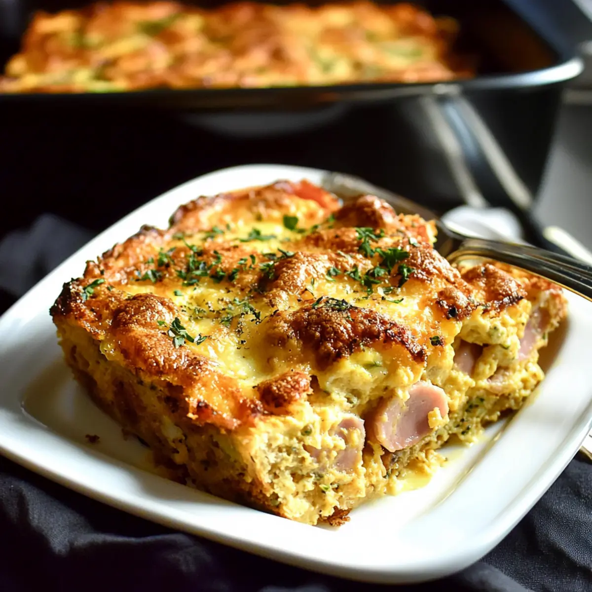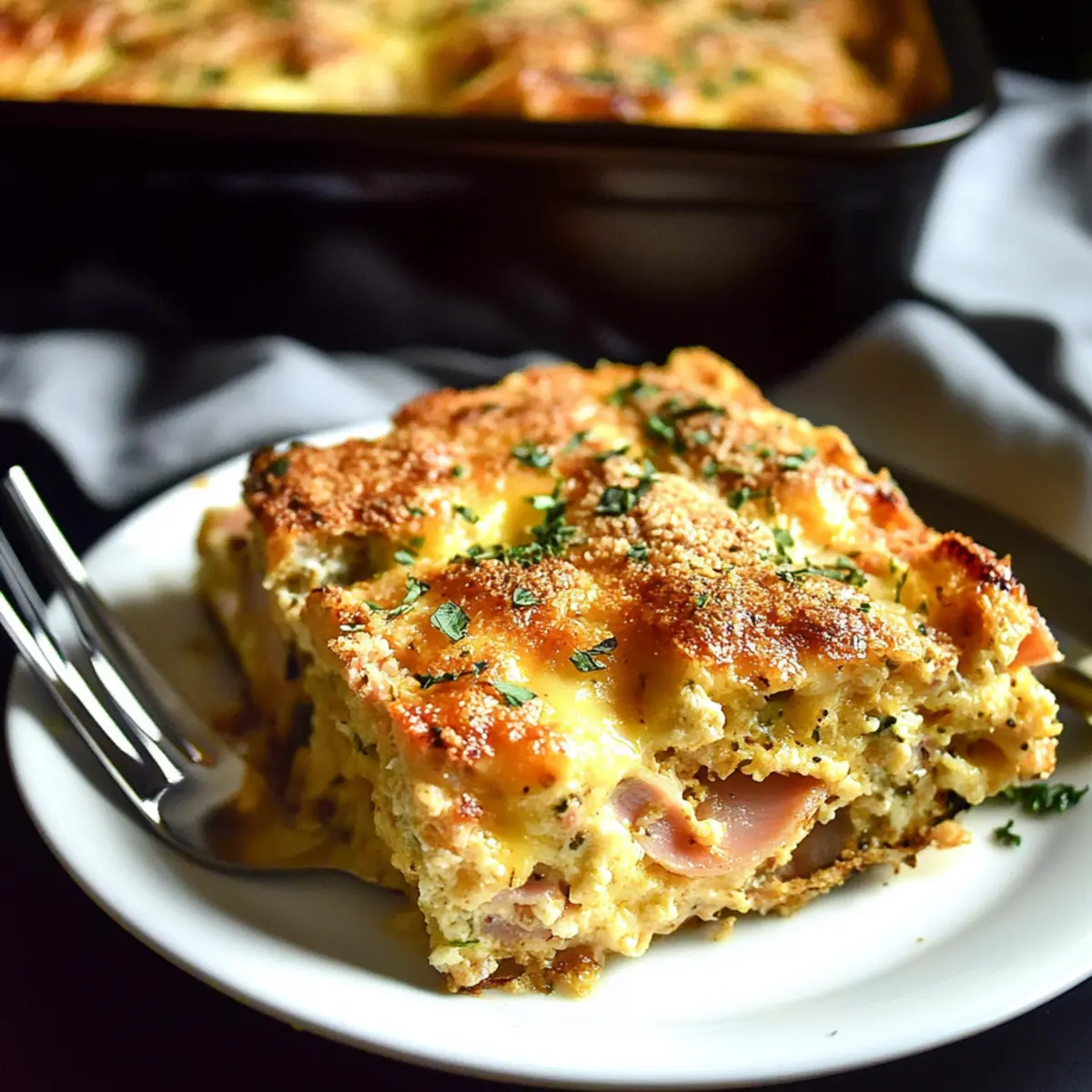 The smell of breakfast wafts through the kitchen, and I can’t help but think about those cozy weekends spent in my pajamas, savoring every bite. This Overnight Egg, Cheese, and Ham Casserole is my secret weapon for turning those lazy mornings into something special. With its layers of buttery English muffins, melty Swiss and Cheddar cheese, and savory ham, this dish is not only satisfying but also quick to prepare. Imagine having a delicious breakfast ready to go with just a bit of time invested the night before! Perfect for family gatherings or simply a treat for yourself, this comforting casserole gives you the freedom to enjoy hearty fare without the fuss. Ready to elevate your morning routine? Let’s dive into this delectable recipe together! Why is this casserole irresistible? Easy Prep: The overnight preparation means you can wake up to a delicious breakfast without any hassle. Just assemble the ingredients, refrigerate, and let the oven do the work! Savory Layers: With layers of buttery English muffins and rich Swiss and Cheddar cheeses, each bite is a comforting delight that warms the soul. Crowd-Pleasing: Perfect for brunch gatherings or family breakfasts—this casserole is sure to impress your guests! Versatile Ingredients: Feel free to mix and match your favorite meats or veggies, just like in my tips for the Cottage Cheese Egg recipe. Make-Ahead Delight: Enjoy the luxury of preparing a hearty, satisfying meal in advance—ideal for busy weekends! Egg Cheese and Ham Casserole Ingredients • Discover the essentials for a warm, comforting breakfast dish! For the Casserole Base English Muffins – Provide the base structure; can substitute with English muffin bread—poke holes for better egg absorption. Butter – Adds richness and helps with browning; for a lighter option, use cooking spray. For the Cheesy Layers Swiss Cheese – Contributes a nutty flavor; can be replaced with Gruyere or mozzarella, though mozzarella may be milder. Cheddar Cheese – Adds a sharp taste; any favorite cheese can be used, but avoid plain mozzarella. For the Protein Sliced Ham – Provides protein and a salty flavor, essential for the casserole; substitute with turkey, Canadian bacon, or crumbled sausage if desired. For Freshness and Flavor Fresh Parsley & Dill – Enhance the dish with fresh herbs; dried herbs can be used in smaller amounts if fresh isn’t available. Dried Mustard – Adds zing to the dish; feel free to skip it or increase the quantity for more flavor. For the Custard Mixture Milk – Creates the custard base; nut milk can be used for a dairy-free version. Eggs – Binds the casserole together, providing structure; no alternative recommended. Now that you have your ingredients lined up, it’s time to bring this delightful Egg Cheese and Ham Casserole to life! Step‑by‑Step Instructions for Egg Cheese and Ham Casserole Step 1: Prepare the Baking Dish Begin by greasing an 8×8 inch baking dish with butter or cooking spray to prevent sticking. This step is essential for ensuring a nice golden crust. Preheat the oven to 275°F if you plan to bake immediately, or set the dish aside for overnight refrigeration. Step 2: Slice and Butter Muffins Take your English muffins and slice them in half. Generously butter each half, enhancing their flavor and improving their ability to soak up the egg mixture. Evenly arrange the muffin bottoms, cut side up, in the prepared baking dish, creating a solid base for the Egg Cheese and Ham Casserole. Step 3: Layer Ham and Cheese Next, layer thinly sliced ham over the muffins, ensuring even coverage for a delightful, savory taste. Follow this with a generous sprinkling of both Swiss and Cheddar cheese, allowing their flavors to meld beautifully during baking. This will create a creamy, cheesy sensation in every bite. Step 4: Add Muffin Tops Top the casserole with the buttered muffin halves (buttered side facing up). This acts as a crust that will later crisp up beautifully during baking, adding both texture and flavor to the Egg Cheese and Ham Casserole. Ensure the muffins are nestled close together to form a cohesive layer. Step 5: Whisk the Custard Mixture In a large bowl, whisk together the eggs, milk, dried mustard, salt, and pepper until the mixture is light and fluffy. This custard will bind all the layers together, giving the casserole its signature texture. Incorporate fresh parsley and dill for added zest if desired. Step 6: Pour the Egg Mixture Gently pour the egg mixture evenly over the layered muffins, ham, and cheese. Ensure that the muffins are well-soaked by pressing down slightly if necessary. This crucial step ensures that every bit of the English muffin absorbs the savory custard, creating a deliciously custardy texture. Step 7: Refrigerate or Bake Cover your casserole tightly with plastic wrap and refrigerate overnight for optimal flavor development. If you prefer to bake immediately, proceed to the next step without refrigeration. Make sure the casserole has enough time to soak up the custard for the best results! Step 8: Preheat and Bake When ready to bake, preheat your oven to 275°F. Bake the casserole covered with foil for 30 minutes, which helps it cook through. After this initial baking period, increase the temperature to 350°F, remove the foil, and bake uncovered for an additional 45 minutes, until it’s puffed and golden brown. Step 9: Rest and Serve Once your Egg Cheese and Ham Casserole is baked, remove it from the oven and allow it to rest for about 15 minutes. This resting period helps it set, making for neater servings. Slice and serve warm, indulging in the comforting flavors and textures of this delicious casserole. Make Ahead Options These Egg Cheese and Ham Casserole is a fantastic solution for busy mornings! You can assemble the entire casserole up to 24 hours in advance, making it perfect for meal prep. Simply layer the English muffins, ham, and cheese in your greased baking dish, whisk together the egg 