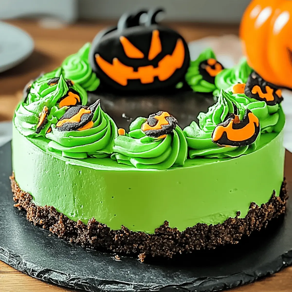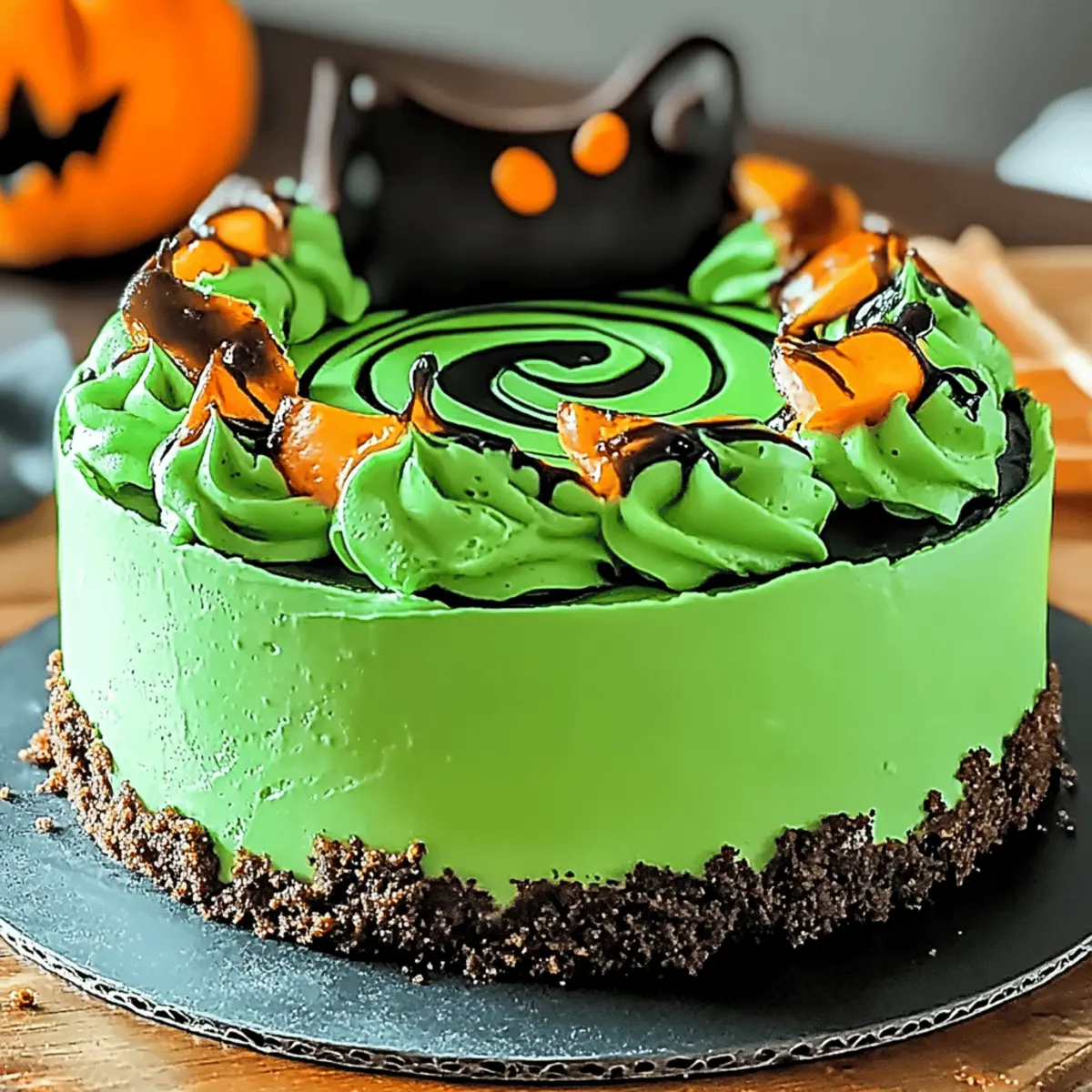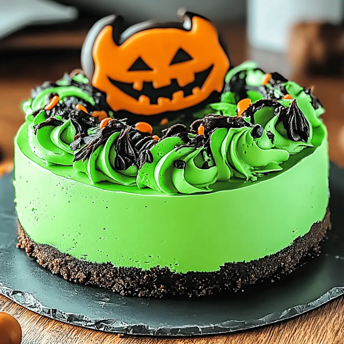 As the leaves turn and a crisp chill fills the air, I find myself dreaming of Halloween desserts that not only wow but also spark joy. Enter the Enchanting Witch’s Cauldron Cheesecake, a delightful blend of creamy layers and vibrant green swirls that’s sure to steal the show at any gathering. This whimsical treat is a customizable dream, allowing you to choose between graham cracker or Oreo crusts, and an array of flavor enhancements that cater to your taste. With a short prep time and the ability to be made ahead, this cheesecake is as practical as it is enchanting. So, are you ready to cast a spell on your dessert table this season? Why Is This Cheesecake So Irresistible? Customization at its finest: Tailor the flavor to match your festive theme with options for crusts and fillings. Stunning visual appeal: The vibrant green swirls make it a showstopper at any Halloween gathering. Easy to make: Simple steps mean you can whip this up without breaking a sweat. Light yet creamy: Enjoy a balanced dessert that delights your taste buds with sweet vanilla and mint. Looking for more delightful treats? Try our Blackberry Lemon Cheesecake or the unique Burnt Basque Cheesecake for extra inspiration! Enchanting Witch’s Cauldron Cheesecake Ingredients For the Crust Graham Cracker Crumbs – A classic base that provides a delightful crunch; substitute with Oreo cookies for a chocolatey twist. Melted Butter – This binds the crust ingredients together; ensure it’s fully melted for a smooth mixture. Granulated Sugar – Adds sweetness to the crust; can be reduced for a less sweet version. For the Filling Cream Cheese – The star of our recipe, providing a rich and creamy texture; use full-fat for best results. Sour Cream – Contributes tanginess and creaminess for a well-rounded flavor; replace with Greek yogurt for a lower-fat option. Eggs – These give structure to the cheesecake; letting them reach room temperature makes for easier mixing. Vanilla Extract – Enhances the depth of flavor; try using fresh vanilla beans for a gourmet touch. For the Swirl Green Food Coloring – This creates the signature whimsical swirl effect; substitute with natural colorings for a healthier option. Mint Leaves – Adds a fresh pop of color; chocolate shavings can be a delightful alternative for a different presentation. Step‑by‑Step Instructions for Enchanting Witch’s Cauldron Cheesecake Step 1: Prepare the Crust Preheat your oven to 350°F (175°C). In a medium bowl, combine the graham cracker crumbs, melted butter, and sugar until they form a cohesive mixture. Transfer this blend into a 9-inch springform pan, evenly pressing it down and slightly up the sides to create a sturdy base. Bake for about 10 minutes or until the crust is lightly golden brown, and then allow it to cool. Step 2: Make the Filling In a large mixing bowl, use an electric mixer to beat the cream cheese and sour cream together until the mixture is smooth and creamy. Gradually add in the granulated sugar, mixing until well combined. Next, incorporate the eggs one at a time, making sure to mix thoroughly after each addition. Finally, stir in the vanilla extract to elevate the flavor profile of your Enchanting Witch’s Cauldron Cheesecake. Step 3: Create the Swirl Divide the cheesecake filling into two equal parts in separate bowls. Add the green food coloring to one half, stirring until it reaches your desired shade of green. Now, alternating spoonfuls of both the plain and colored mixtures, dollop them into the prepared crust. With a knife or skewer, gently swirl the two mixtures together to create a mesmerizing marbled effect that embodies the enchanting spirit of Halloween. Step 4: Bake Carefully place the springform pan in the preheated oven. Bake the cheesecake for 55 to 60 minutes, or until the center is set but still slightly jiggly. Once done, turn off the oven, crack the door open, and let the cheesecake cool inside for about 30 minutes, which will help prevent any cracks from forming on the surface. Step 5: Chill After the cheesecake has cooled, transfer it to the refrigerator. Cover it tightly with plastic wrap and chill for at least 4 hours, or preferably overnight, allowing the flavors to meld beautifully and ensuring the texture is perfect. This step is crucial for the best possible final result, enhancing the creamy delight of your Enchanting Witch’s Cauldron Cheesecake. Step 6: Serve When you’re ready to serve, gently remove the cheesecake from the springform pan, taking care not to damage the lovely swirls. Garnish the top with fresh mint leaves or dark chocolate shavings for a visually appealing touch. Cut the cheesecake into slices and present it on a lovely platter, perhaps drizzling a little chocolate sauce or fruit compote over the slices for an extra special treat. What to Serve with Enchanting Witch’s Cauldron Cheesecake As you prepare for a delightful Halloween gathering, consider these delicious pairings that promise to enchant every palate. Graham Cracker Crust Cookies: Perfectly complement the cheesecake, these crunchy bites add a nostalgic touch, making them a delightful sidekick for your dessert. Caramel Apple Slices: Juicy apple wedges drizzled with warm caramel bring a sweet, seasonal flair that contrasts wonderfully with the cheesecake’s creaminess. Whipped Cream: A light and airy topping adds a fluffy texture, softening the richness of the cheesecake and enhancing the overall experience. Spiced Pumpkin Pie: Embrace the flavors of fall with a slice of this classic; its warm spices harmonize beautifully with the minty notes of your cheesecake. Fresh Berries: A medley of raspberries, blueberries, or strawberries provides a refreshing and tangy counterpoint, enhancing the visual appeal and flavor profile. Chocolaty Hot Cocoa: Warm up your gathering with a rich cup of cocoa; it’s not only comforting but also balances the vibrant sweetness of the cheesecake. Peppermint Bark: This festive tr