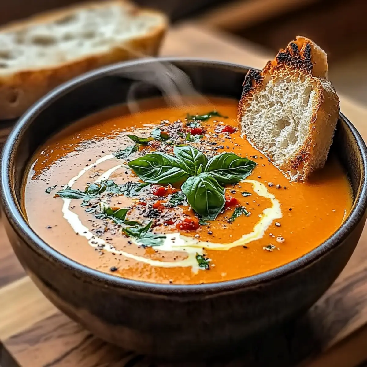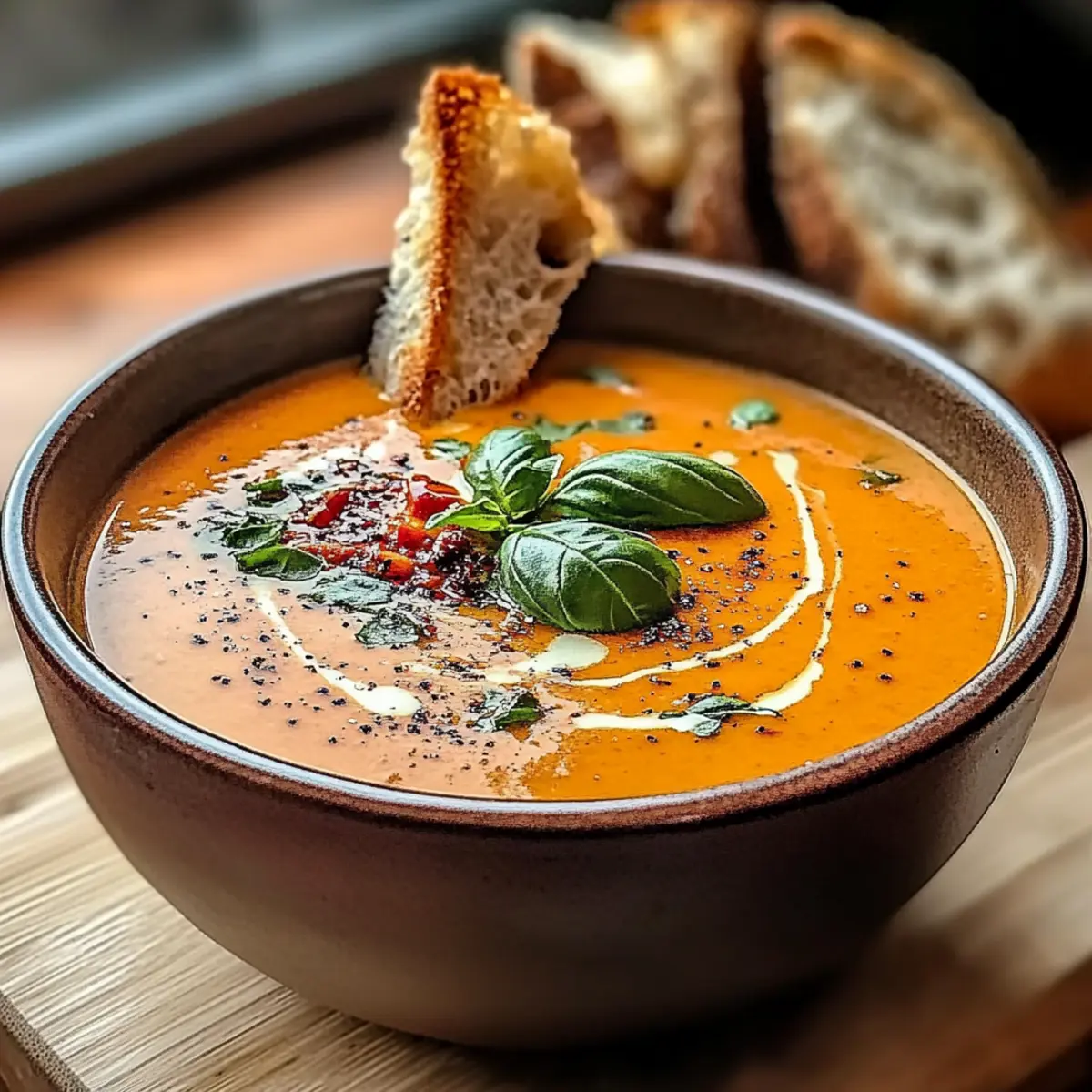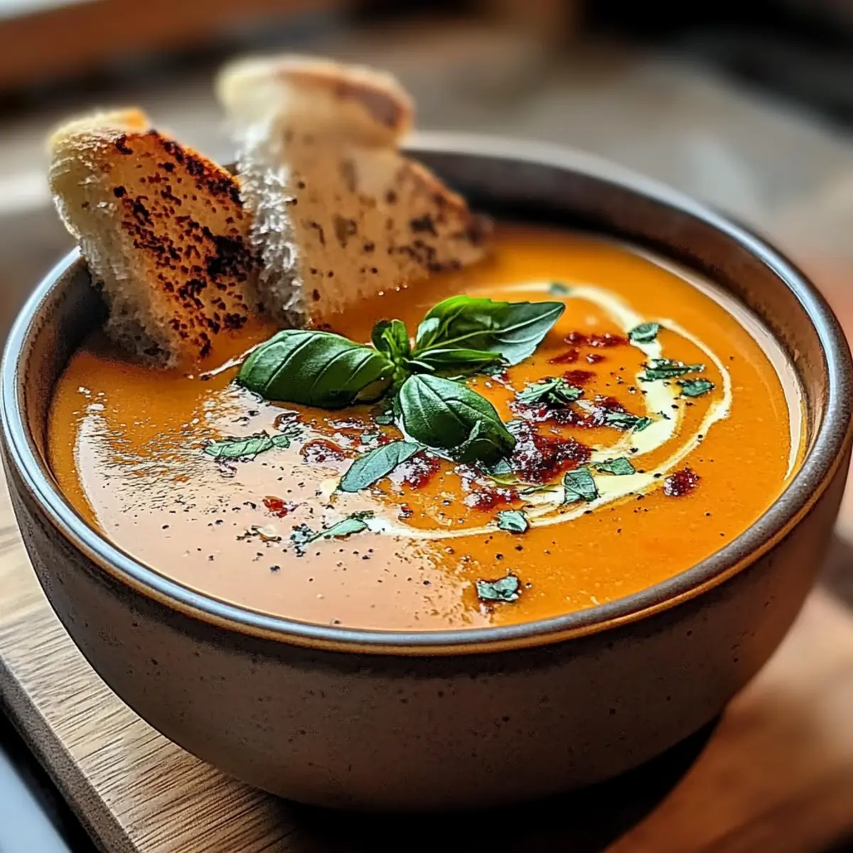 A cozy bowl of Fire Roasted Tomato Soup that nourishes your soul in under 30 minutes, perfect for any dietary needs.