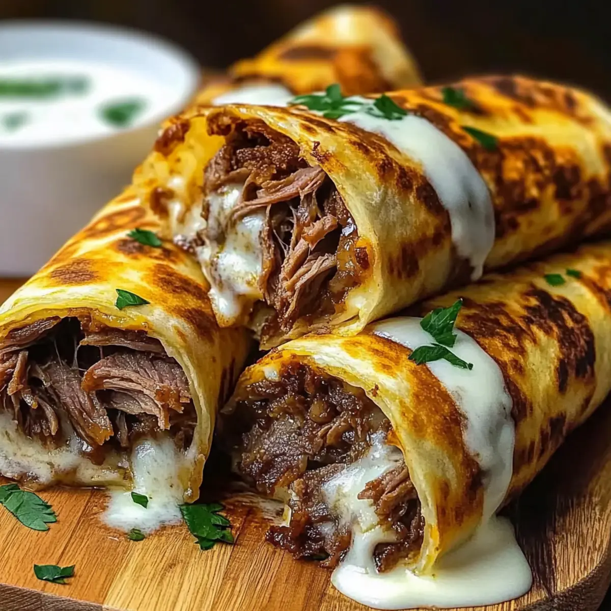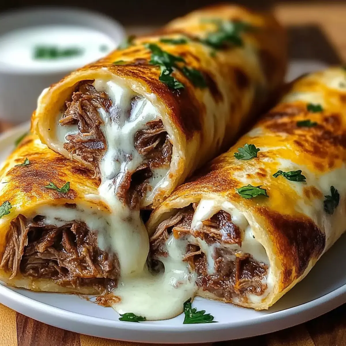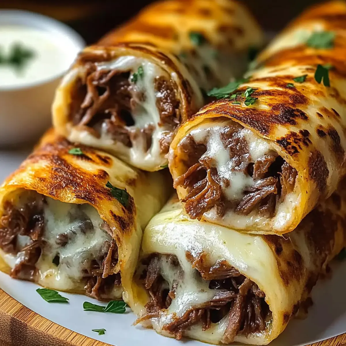 As I stood by the kitchen counter, the enticing aroma of warm, crispy tortillas enveloped me like a comforting hug. That’s when I knew it was time to whip up my favorite comfort dish: Cheesy French Dip Tortilla Roll Ups. This delightful recipe marries savory roast beef and gooey melted cheese, all wrapped in a perfectly crispy tortilla—comfort food at its finest! What I adore most about these roll ups is that they come together in just 25 minutes, making them a quick and cheerful solution for hectic weeknights or laid-back gatherings with friends. Plus, they’re easily customizable—so feel free to mix in your favorite ingredients for a twist that your family will love. Ready to roll up some deliciousness? Why Are These Roll Ups So Irresistible? Quick Preparation: Throw together these savory French Dip Tortilla Roll Ups in just 25 minutes—perfect for busy weeknights! Mouthwatering Flavor: The combination of tender roast beef and gooey cheese creates a deliciously rich profile that will satisfy everyone’s cravings. Customizable Ingredients: Personalize each roll up with your favorite fillings, whether you prefer sautéed veggies or a spicy kick. Crowd-Pleasing Appeal: These tasty bites are perfect for gatherings; serve them with a side of our quick and easy Cinnamon Roll French for a delightful treat! Comfort Food Delight: With their crispy exterior and warm, cheesy center, these roll ups are the ultimate comfort food that brings everyone together. French Dip Tortilla Roll Ups Ingredients For the Roll Ups • Roast Beef – This savory, juicy heart of the dish can be deli-style or from leftover roasts. • Shredded Mozzarella or Provolone – Mozzarella offers a gooey stretch, while provolone delivers a rich, creamy taste. • Flour Tortillas – Soft yet sturdy, these are perfect for holding your delightful fillings. • Melted Butter – This gives the roll ups a golden, crispy exterior that’s hard to resist. • Garlic Powder – A sprinkle of this adds a warm, aromatic depth to each bite. • Onion Powder – Provides subtle but essential savory notes for added flavor. • Dried Parsley – Adds a lovely pop of color and gentle herbiness to brighten the dish. For the Au Jus • Beef Broth – This rich base enhances the dipping sauce’s flavor and complements the roll ups well. • Worcestershire Sauce – It heightens the umami essence in the au jus, making each dip even more delicious. • Soy Sauce – A dash of this brings depth and saltiness, rounding out the dipping experience. • Salt & Pepper – Essential for seasoning to taste; don’t skip this step for maximum enjoyment! With these ingredients ready, you’re all set to create savory French Dip Tortilla Roll Ups that will surely impress friends and family alike! Step‑by‑Step Instructions for French Dip Tortilla Roll Ups Step 1: Preheat the Oven Preheat your oven to 375°F (190°C) to ensure a perfectly crispy finish on your French Dip Tortilla Roll Ups. While the oven heats, line a baking sheet with parchment paper to make cleanup a breeze later. This step is crucial for achieving that golden, crunchy texture that will hold all the delicious fillings. Step 2: Assemble the Tortillas Lay each flour tortilla flat on a clean surface, creating a blank canvas for your savory creation. Place thinly sliced roast beef in a line along the center of each tortilla, followed by a generous sprinkle of shredded mozzarella or provolone cheese. Make sure to leave about an inch of space from the edges to prevent spilling during rolling. Step 3: Roll Up the Tortillas Begin rolling the tortilla tightly from the bottom, folding the sides slightly inward as you go to tuck in the fillings. Keep your rolls snug, then place them seam-side down on the prepared baking sheet. This will help maintain their shape while they bake. Arrange the roll ups close together for optimal use of space. Step 4: Brush and Season Melt some butter and generously brush it over each roll up to give them a lovely golden hue as they bake. Sprinkle a mix of garlic powder, onion powder, and dried parsley over the top for added flavor and a touch of aromatic warmth. This step ensures that every bite of your French Dip Tortilla Roll Ups is bursting with savory goodness. Step 5: Bake the Roll Ups Place the baking sheet in the preheated oven and bake for 12–15 minutes, or until the tortillas are golden brown and the cheese inside is bubbling. Keep an eye on them during the last few minutes to prevent burning; you want them to have a beautiful crispiness. The tantalizing aroma will fill your kitchen! Step 6: Make the Au Jus While the roll ups are baking, prepare the dipping sauce by simmering beef broth, Worcestershire sauce, soy sauce, garlic powder, onion powder, and a touch of salt and pepper in a medium saucepan over medium heat. Cook for about 5–7 minutes to allow the flavors to marry, creating a rich and flavorful au jus that pairs perfectly with your roll ups. Step 7: Serve the Roll Ups Once the roll ups are golden and toasty, remove them from the oven and let them cool for a minute. Slice each roll up into bite-sized pieces for easy dipping. Serve warm alongside the savory au jus, inviting your family and friends to dig in and enjoy every delightful bite of these French Dip Tortilla Roll Ups! What to Serve with Cheesy French Dip Tortilla Roll Ups As you savor the crispy, cheesy delights of these roll ups, imagine a full meal that brings warmth and joy to your table. Sweet Potato Fries: These crispy, golden fries offer a delightful sweetness that balances the savory flavors of the roll ups. Perfectly seasoned, they could easily become your new favorite side. Garden Salad: A fresh garden salad with crisp greens, juicy tomatoes, and a light vinaigrette adds a vibrant, crunchy contrast, making each bite of the roll ups even more satisfying. Roasted Vegetables: Roasted seasonal veggies drizzled with olive oil create a beautifully caramelized flavor to co