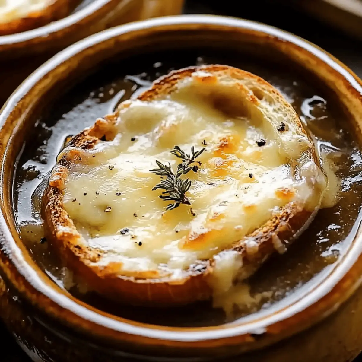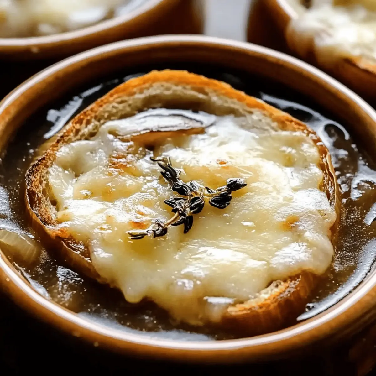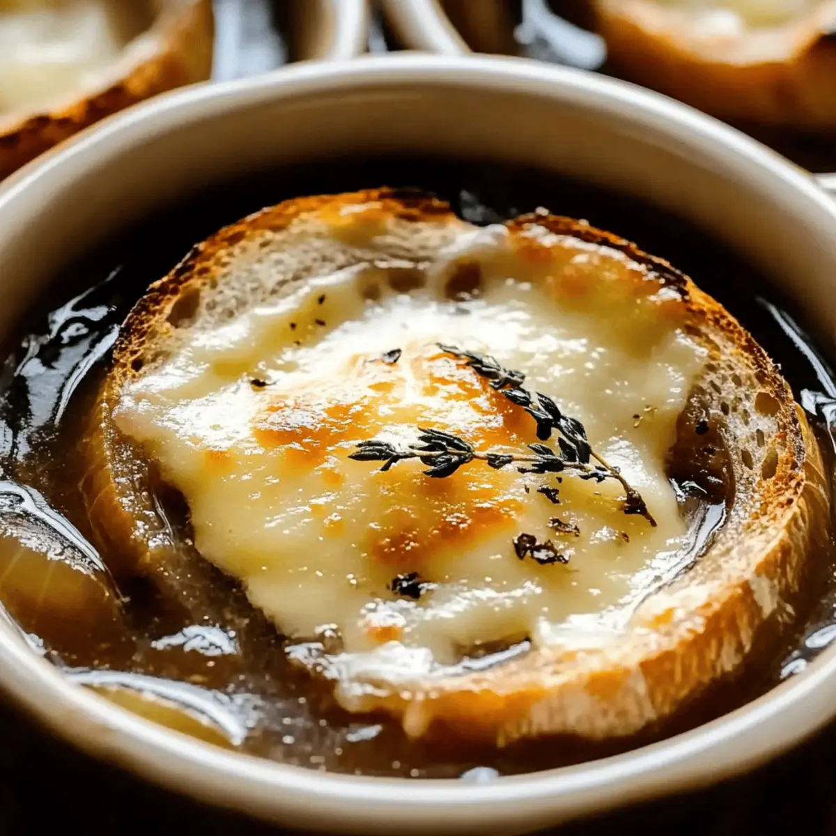 As the cool autumn air settles in, there’s nothing quite like the allure of a steaming bowl of French Onion Soup to warm the heart. This beloved classic is all about simplicity yet delivers rich, comforting flavors that elevate any cozy evening at home. With sweet caramelized onions swimming in a flavorful broth and topped with melty cheese, it’s an irresistible comfort food that’s perfect for gatherings or just a night in. What I love most about making this French Onion Soup is how customizable it is—whether you’re going for vegetarian or want to experiment with spices, the possibilities are endless! Ready to dive into this culinary journey with me and discover how easy it is to create your own delightful version? Let’s get cooking! Why is French Onion Soup so beloved? Comforting and warm, this French Onion Soup is the ultimate hug in a bowl, perfect for chilly evenings. Customizable to fit any dietary preference—try using vegetable broth for a delicious vegetarian twist! Rich flavors from caramelized onions meld beautifully with melty cheese, creating a delightful contrast of textures. Plus, it’s a dish that will impress at gatherings or cozy dinners. And if you love to explore, pair it with a light green salad or even enjoy it alongside a bowl of Red Pepper Soup for a delightful meal! French Onion Soup Ingredients • Classic comfort food made easy! For the Soup Yellow Onions – Provide the sweet base; opt for sweet varieties for the best flavor. Unsalted Butter – Adds richness and enhances caramelization. Olive Oil – Helps in evenly cooking the onions to golden perfection. Salt – Essential during caramelization to enhance the onions’ sweetness. Sugar – Aids in achieving that rich caramelized flavor profile. Beef Broth (or Vegetable Broth) – The soul of this soup, bringing depth; use vegetable broth for a vegetarian option. Dry White Wine – Balances flavors with its acidity; Sauvignon Blanc works wonderfully. Fresh Thyme (or Dried Thyme) – Infuses aromatic notes, enhancing the overall taste. Bay Leaf – Adds subtle depth during cooking. Freshly Ground Black Pepper – Enhances flavor, rounding out the broth perfectly. For the Topping Baguette – Provides a delightful crunchy base; use stale bread for optimal absorption. Gruyère Cheese (or Swiss Cheese) – Melts beautifully for a rich, gooey topping, elevating your French Onion Soup. Dive into these ingredients, and let’s create a delicious bowl of French Onion Soup that will certainly warm your heart! Step‑by‑Step Instructions for Classic French Onion Soup Step 1: Prepare the Onions Begin by thinly slicing approximately 5 to 6 sweet yellow onions and set them aside. A sharp knife will make this task easier, ensuring even slices for caramelization. This crucial first step will lay the foundation for the rich flavors in your Classic French Onion Soup. Step 2: Melt the Butter and Oil In a large, heavy-bottomed pot, melt 3 tablespoons of unsalted butter along with 1 tablespoon of olive oil over medium heat. Let the butter foam and subside, signaling it’s ready for action. This blend of fats will help in cooking the onions evenly and giving your soup a rich base. Step 3: Add Onions Once the butter and oil are melted, add the sliced onions into the hot pot. Stir them gently to ensure they are well coated with the buttery mixture. Allow them to start cooking down; this will begin the transformation into the sweet, caramelized goodness that is essential for your Classic French Onion Soup. Step 4: Caramelize Onions Sprinkle a pinch of salt and 1 teaspoon of sugar over the onions to aid in their caramelization. Cook on medium-low heat for about 40 minutes, stirring occasionally. The onions will gradually turn a deep golden brown, releasing their naturally sweet flavor and adding a beautiful color to your soup. Step 5: Add Broth and Wine Once the onions are caramelized to perfection, pour in 6 cups of beef broth or vegetable broth along with 1/2 cup of dry white wine. Toss in a few sprigs of fresh thyme and a bay leaf for added depth. Increase the heat to bring the mixture to a gentle boil, letting those flavors meld beautifully. Step 6: Simmer Reduce the heat to low and let the soup simmer uncovered for 30 minutes. This simmering time will allow the ingredients to harmonize, creating an unforgettable flavor profile for your Classic French Onion Soup. Be sure to taste and season with freshly ground black pepper as needed. Step 7: Prepare Baguette While the soup is simmering, slice a stale baguette into thick pieces. Toast the slices in a preheated oven at 400°F for about 10 minutes until they are crispy and golden. This crunchy texture will provide a delightful contrast when added to the soup later. Step 8: Cheese Topping Ladle the hot soup into oven-safe bowls, placing a toasted baguette slice on top of each portion. Generously sprinkle with shredded Gruyère cheese, allowing it to form a rich, melty topping as you prepare to finish off your Classic French Onion Soup. Step 9: Broil Place the bowls on a baking sheet and broil them in the oven for about 2-3 minutes, keeping a close eye to ensure the cheese melts and bubbles to a golden perfection. This final touch will give your soup that iconic, restaurant-quality presentation. Step 10: Serve Warm Once bubbling and golden, carefully remove the soup bowls from the oven. Let them cool slightly before serving; this allows the flavors to settle beautifully. Enjoy your heartwarming Classic French Onion Soup, a dish that is sure to impress! Make Ahead Options Preparing Classic French Onion Soup ahead of time is a fantastic way to save time on busy evenings! You can caramelize the onions and prepare the broth up to 3 days in advance. Simply store the onions in an airtight container in the refrigerator and the broth separately. When you’re ready to serve, reheat the broth, add the caramelized onions, and let them simmer together. For the cheesy topping, yo