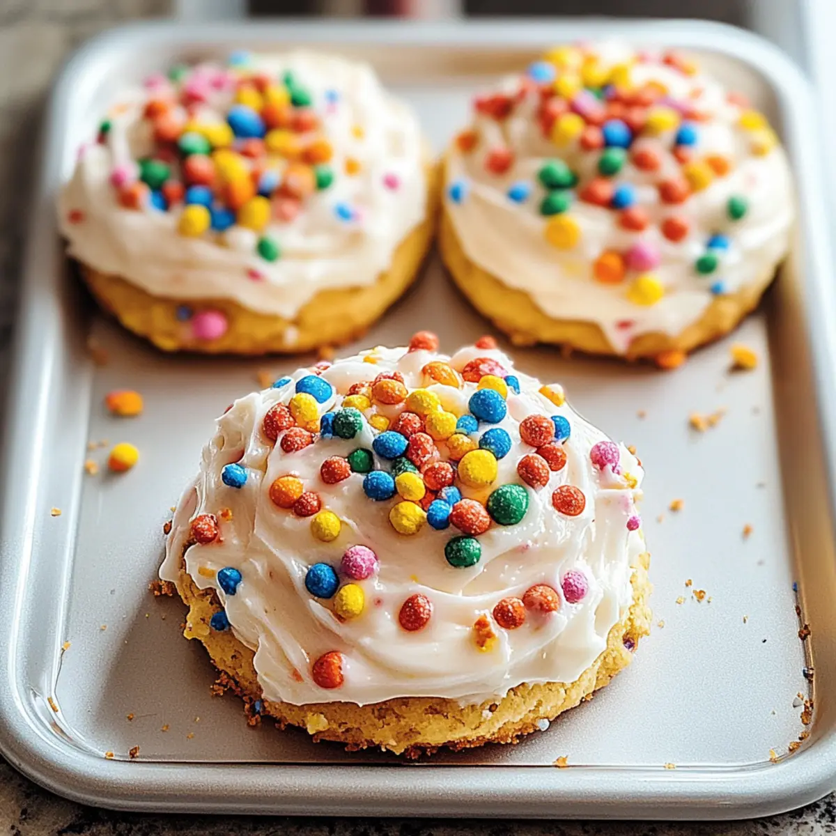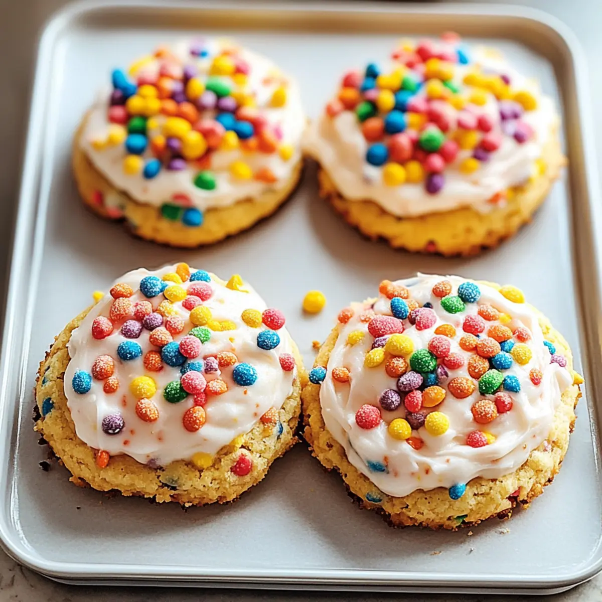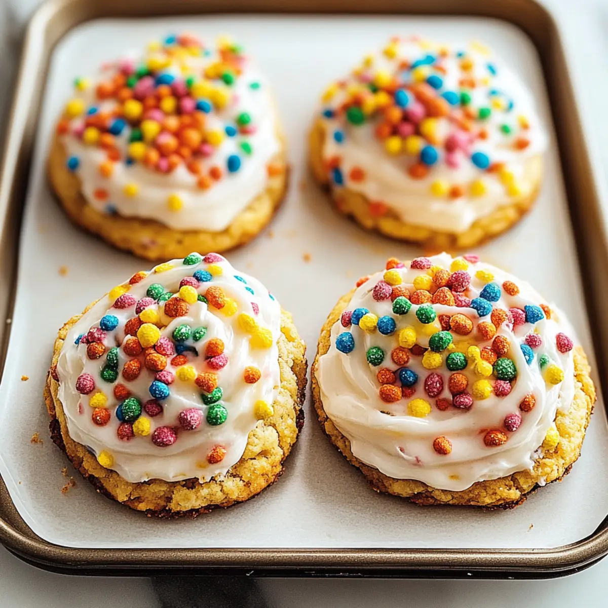 As I sifted through my pantry, the vibrant colors of Fruity Pebbles caught my eye, instantly whisking me back to sun-soaked Saturday mornings filled with cartoons and laughter. This nostalgic spark inspired me to create the ultimate treat: Frosted Fruity Pebbles Cookies! They’re not just a delightful way to relive those carefree days; these cookies are incredibly easy to whip up and guaranteed to be a hit at any gathering—perfect for friends and family who crave a fun twist on traditional desserts. Each bite bursts with soft, chewy goodness, complemented by a sweet frosting that takes them to the next level. Curious about how to bring this colorful blast from your childhood to life? Let’s get started! Why Are Frosted Fruity Pebbles Cookies a Must-Try? Nostalgic Flavor: These cookies capture the essence of childhood with their fun, fruity taste and cheerful colors. Quick to Make: With just a few simple steps, you can create a batch of these delightful treats in no time! Crowd-Pleaser: Perfect for any gathering, these cookies are sure to earn smiles from both kids and adults alike. Customizable Bliss: Mix in chocolate chips or add sprinkles to personalize your cookies and make them uniquely yours. Gluten-Free Option: Want to keep everyone in the loop? Use a gluten-free flour blend for a delicious treat everyone can enjoy! Store and Share: They’re perfect for easy storage, making them a fantastic snack for road trips or lunch boxes; you can even pair them with Cinnamon Roll Cookies for extra fun! Frosted Fruity Pebbles Cookies Ingredients For the Cookies Butter – Adds richness and moisture to the cookies; use softened unsalted butter for the best results. Granulated Sugar – Provides sweetness and aids in browning; substitute with coconut sugar for a low-glycemic option if desired. Brown Sugar – Contributes moisture and a deeper flavor; light brown sugar is recommended for an ideal outcome. Eggs – Binds the ingredients together and adds moisture; flax eggs can be used as a vegan substitute. Vanilla Extract – Enhances flavor; almond extract can be a delightful alternative for a nutty essence. All-Purpose Flour – Provides structure; for a gluten-free option, use a gluten-free flour blend. Fruity Pebbles Cereal – Adds that iconic crunch and vibrant color; be sure to opt for a gluten-free version if needed. For the Frosting Powdered Sugar – Sweetens the frosting and gives it a fluffy texture; adjust the amount based on your desired sweetness. Butter – Offers creaminess and a rich flavor; use softened butter for the best spreadability. Milk – Helps achieve the right consistency; start with a small amount and add as needed for a smooth frosting. Vanilla Extract – Boosts the flavor of the frosting; a drop of almond extract works well too, especially if paired with the cookies’ flavors. Step‑by‑Step Instructions for Frosted Fruity Pebbles Cookies Step 1: Preheat the Oven Begin by preheating your oven to 350°F (175°C). While the oven warms up, line your baking sheets with parchment paper to prevent the cookies from sticking. The parchment paper will also make cleanup a breeze! Step 2: Cream Together the Butters and Sugars In a large mixing bowl, cream together 1 cup of softened unsalted butter, ½ cup of granulated sugar, and ½ cup of light brown sugar until the mixture is light and fluffy, about 2-3 minutes. A hand mixer or stand mixer works best here, creating an inviting aroma and a smooth texture that serves as the foundation for your Frosted Fruity Pebbles Cookies. Step 3: Incorporate the Eggs and Vanilla Add in two eggs, one at a time, mixing gently after each addition. Follow with 1 teaspoon of vanilla extract to enhance the flavors. Be sure to scrape down the sides of the bowl to include any stubborn bits of butter and sugar, ensuring a well-blended mixture full of sweetness. Step 4: Mix the Dry Ingredients Gradually add 2 cups of all-purpose flour to the wet mixture. Stir until the flour is just combined, being careful not to overmix. The dough should be thick and slightly tacky, hinting at the delicious Frosted Fruity Pebbles Cookies to come. If you’re opting for a gluten-free version, substitute with a gluten-free flour blend for equally delightful results. Step 5: Fold in the Fruity Pebbles Gently fold in 2 cups of Fruity Pebbles cereal until just mixed. The colorful cereal will add both texture and a cheerful pop of color to your dough, bringing back memories of childhood breakfasts filled with laughter and joy. Aim for an even distribution throughout to ensure every cookie is a crunchy delight. Step 6: Scoop the Dough onto Baking Sheets Using a cookie scoop or a spoon, drop mounds of dough onto the prepared baking sheets, spacing them about 2 inches apart to allow for spreading. Bake in your preheated oven for 10-12 minutes, or until the edges are golden but the centers remain soft—this is key for that perfect chewy consistency in your Frosted Fruity Pebbles Cookies. Step 7: Cool and Frost the Cookies Once baked, remove the cookies from the oven and let them cool on the baking sheets for about 5 minutes before transferring them to a wire rack. After they’ve cooled completely, spread a delightful frosting on top, and sprinkle additional Fruity Pebbles for an adorable finishing touch. Enjoy the vibrant, nostalgic flavors that make these cookies a favorite for everyone! Make Ahead Options These Frosted Fruity Pebbles Cookies are perfect for meal prep, allowing you to enjoy cheerful treats without the last-minute rush! You can prepare the cookie dough up to 24 hours in advance—simply mix all the ingredients and refrigerate the dough in an airtight container. This helps maintain their freshness and flavor. When you’re ready to bake, scoop the chilled dough directly onto the baking sheets and bake as directed. The frosted cookies can also be made up to 3 days ahead; store them in an airtight container at room temperature to keep them soft and d