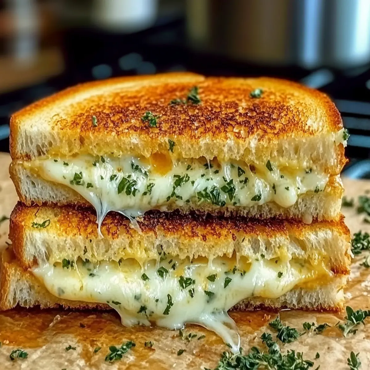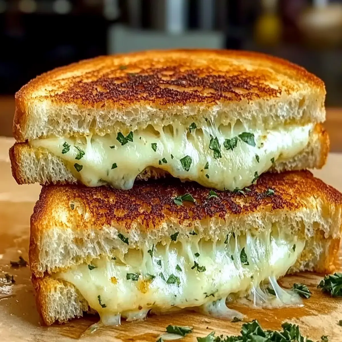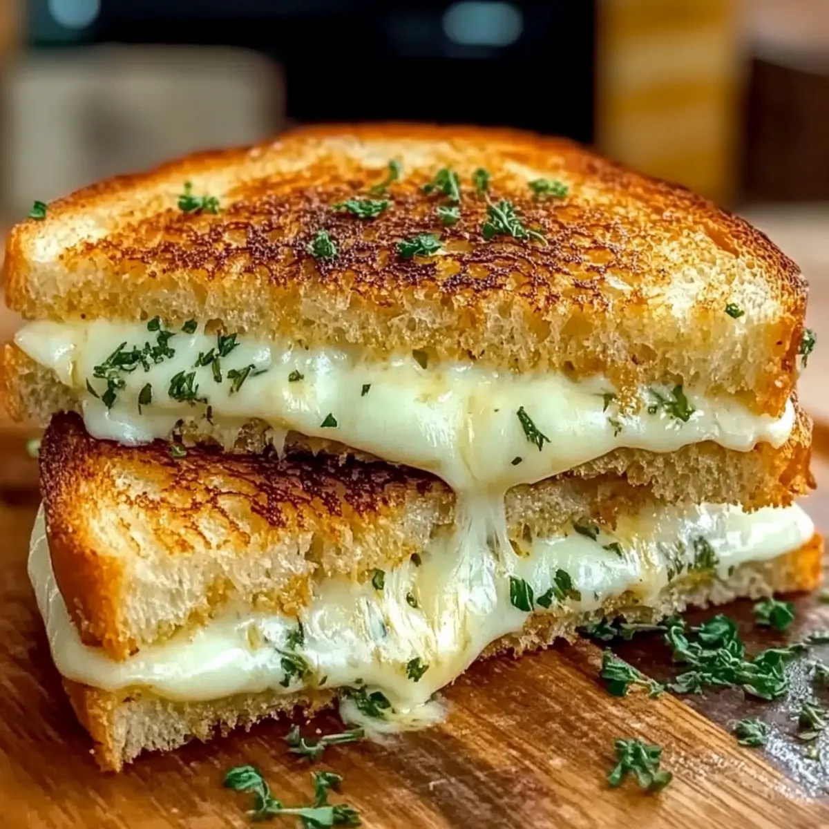 As I stood by the stove, the irresistible aroma of garlic wafted through the air, making my stomach rumble with anticipation. This Ultimate Garlic Bread Grilled Cheese is more than just a sandwich; it’s a cozy hug on a plate. Rich, melted cheese tucked between crispy, buttery garlic bread makes this dish perfect for any time—lunch, dinner, or even a late-night snack. Plus, it’s quick to whip up using simple pantry staples, ensuring you can enjoy homemade comfort food without the fuss. Whether you prefer classic mozzarella or want to get creative with different cheeses and toppings, this recipe is fully customizable. Ready to elevate your grilled cheese game? Let’s dive in and create something delicious together! Why is Garlic Bread Grilled Cheese a Must-Try? Comforting Indulgence: This recipe combines the warmth of homemade garlic bread with the gooey goodness of melted cheese, making each bite a delightful experience. Quick & Easy: With just a few simple ingredients, you can create a gourmet sandwich in minutes, perfect for busy weeknights! Fully Customizable: Feel free to explore different cheese blends or add toppings like tomatoes and bacon for a unique twist that suits your taste. Crowd-Pleasing Delight: Perfect for family dinners or gatherings, this dish will impress everyone, bringing smiles around the table. Perfect Texture: Enjoy the crunchy garlic-buttered exterior paired with the soft, melty interior—a match made in comfort food heaven. For more delicious variations, check out my Grilled Cheese Burrito or try pairing it with a fresh tomato salad to complement those rich flavors! Garlic Bread Grilled Cheese Ingredients • Get ready to make a delightful sandwich! For the Bread Classic White Bread – A soft base that crisps up beautifully when grilled. Sourdough Bread – Offers a tangy flavor and an irresistible crust. Italian Bread – Adds a rich, rustic taste that complements the garlic butter. For the Garlic Butter Unsalted Butter – Use softened for easy spreading and a creamy texture. Garlic Cloves – Freshly minced for that bold garlic flavor; it wakes up your taste buds! Parsley (optional) – Chopped for added freshness and vibrant color. For the Cheese Mozzarella Cheese – Melts perfectly, creating that classic gooeyness that we all love. Sharp Cheddar Cheese – Brings a rich, tangy flavor that enhances the sandwich. Provolone Cheese – Offers a delicate taste and melts beautifully, taking your grilled cheese to the next level. Feel free to customize your Garlic Bread Grilled Cheese by adding your favorite toppings or using different cheese varieties to make it uniquely yours! Step‑by‑Step Instructions for Garlic Bread Grilled Cheese Step 1: Make the Garlic Butter In a small bowl, combine softened unsalted butter with freshly minced garlic and optional chopped parsley. Mix until well blended, ensuring the vibrant flavors are evenly distributed. This garlic butter will serve as the flavorful base for your Garlic Bread Grilled Cheese. Set aside while you prepare the bread and cheese. Step 2: Prepare the Bread Take your choice of bread—classic white, sourdough, or Italian. Generously spread the garlic butter on one side of each slice, ensuring the butter reaches the edges for maximum flavor. This will create that delectable crispy exterior when grilled. Lay the bread slices aside with the buttered sides facing up. Step 3: Layer the Cheese On the unbuttered side of your bread slices, begin layering the cheese. Start with a generous handful of shredded mozzarella, followed by sharp cheddar and slices of provolone. Make sure to evenly distribute the cheese to enhance the gooey goodness of the Garlic Bread Grilled Cheese. Place the other slice of bread on top, buttered side facing out. Step 4: Heat the Skillet Preheat a non-stick skillet or griddle over medium-low heat. This gentle temperature will allow the bread to toast perfectly without burning while the cheese melts beautifully. After a couple of minutes, once the skillet is warm, carefully place your assembled sandwiches in the pan, buttered side down. Step 5: Grill the Sandwiches Cook the sandwiches for about 3-4 minutes, or until the bottom is golden and crispy. You’ll know it’s ready to flip when the garlic butter creates a beautiful golden crust. Keep an eye on them, as perfect grilling is key to achieving that delightful crunch and that melty, gooey center. Step 6: Flip and Finish Cooking Using a spatula, gently flip each sandwich to grill the other side, pressing down slightly to ensure even heating. Cook for another 3-4 minutes until that side turns golden brown and the cheese is thoroughly melted. The aroma of the garlic and butter will fill your kitchen, making your mouth water in anticipation. Step 7: Slice and Serve Once both sides are perfectly toasted and the cheese is gooey and melted, remove the Garlic Bread Grilled Cheese from the skillet. Carefully slice each sandwich diagonally with a sharp knife for easy serving. Serve immediately, allowing everyone to enjoy that delicious cheesy pull and crispy texture while it’s still hot. Expert Tips for Garlic Bread Grilled Cheese Fresh Garlic: Use freshly minced garlic for the best flavor; pre-minced options lack the essential aroma and taste that elevate this sandwich. Temperature Control: Always grill on medium-low heat to avoid burnt bread with unmelted cheese; patience is key to perfection! Press for Even Melt: Gently pressing down on the sandwiches while grilling helps ensure that the cheese melts evenly and thoroughly. Avoid Soft Bread: Steer clear of overly soft sandwich bread as it won’t crisp up well; choose heartier options like sourdough or Italian. Reheat Right: For leftover Garlic Bread Grilled Cheese, reheat in a skillet to restore that desirable crunchy texture; microwaving will result in sogginess. What to Serve with Garlic Bread Grilled Cheese? A warm bowl of soup or something fresh can elevate your Garlic Bread Gri