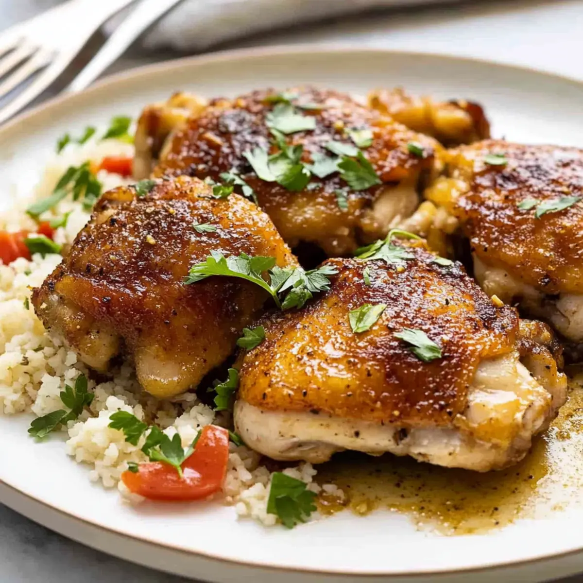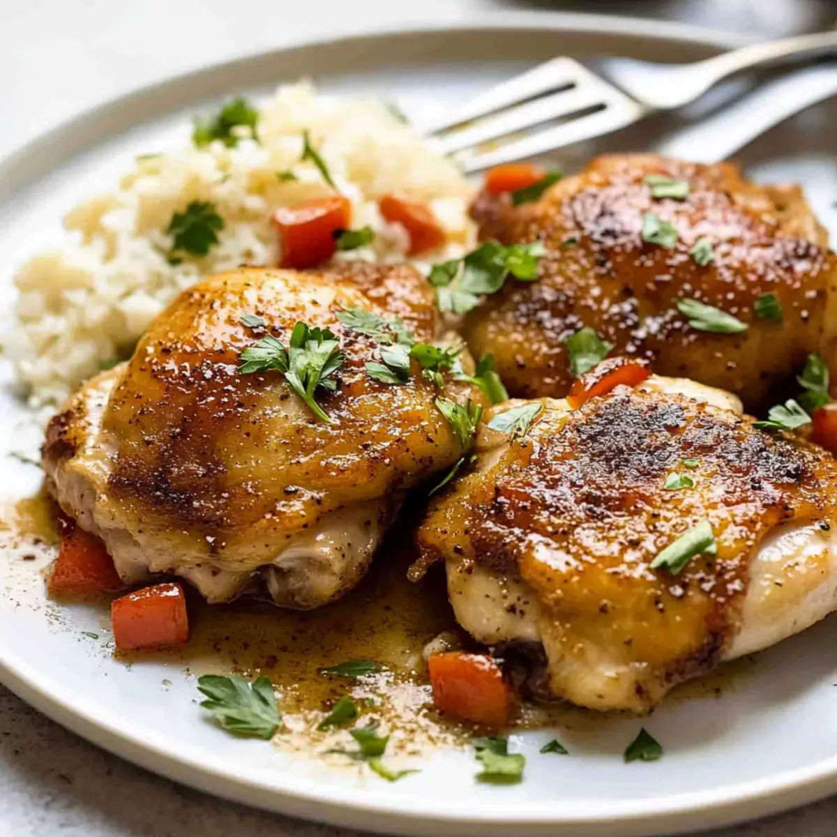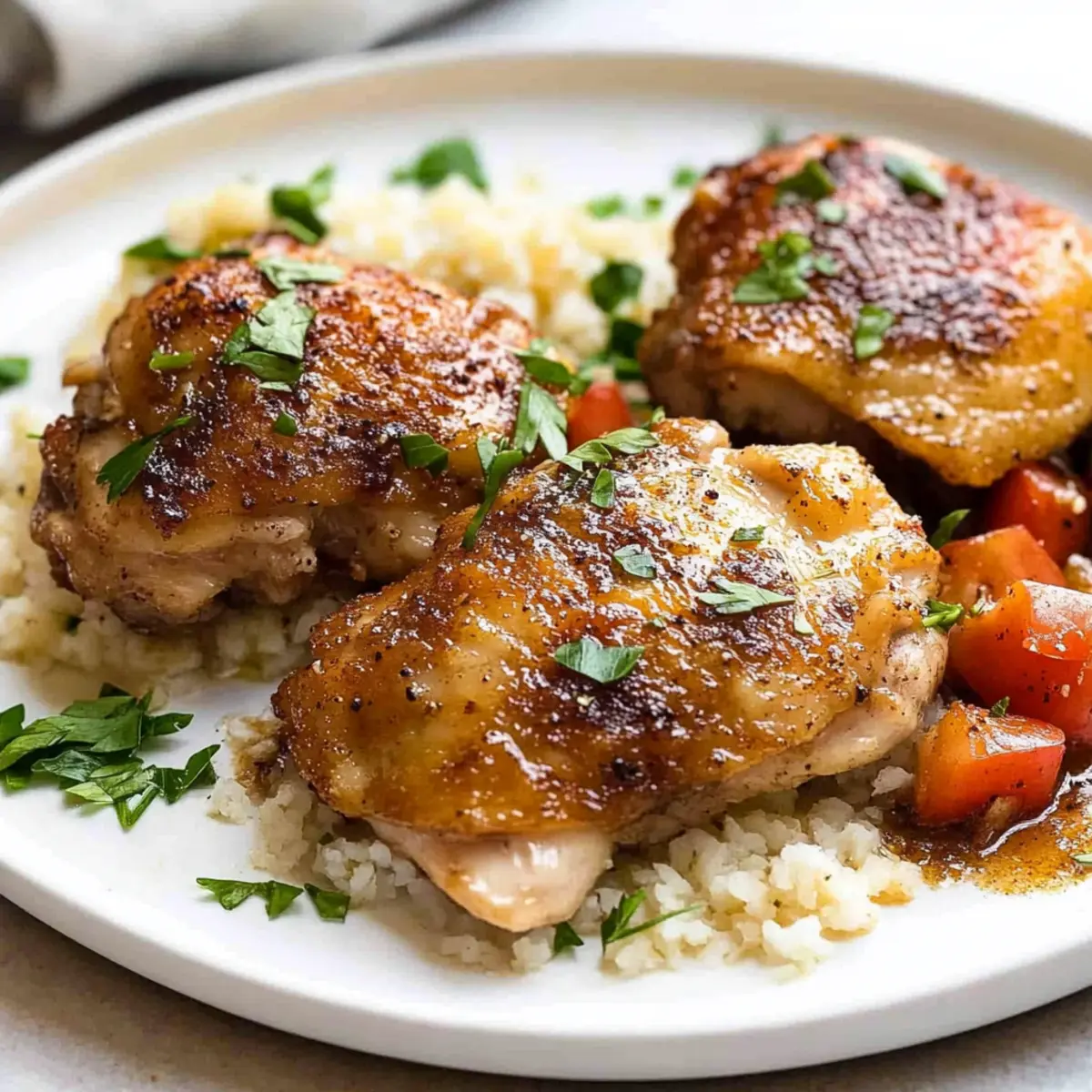 The enticing aroma of garlic sizzling in a hot skillet always brings a smile to my face. When life gets hectic, and dinner needs to happen fast, I reach for my go-to recipe: Garlic Chicken Thighs. With just five simple ingredients, this dish is not only a breeze to prepare but also guarantees juicy, crispy perfection that your family will love. The combination of garlic and a buttery sauce creates a delightful flavor that elevates any weeknight meal into something special. Plus, the quick prep time means you’ll spend less time in the kitchen and more time enjoying delicious food with your loved ones. Are you ready to make your weeknight dinners a little more extraordinary? Why will you love this recipe? Simplicity at Its Finest: With only five ingredients, Garlic Chicken Thighs offer a hassle-free cooking experience that saves time. Crispy, Juicy Perfection: Each bite features a crunchy exterior and tender, flavorful meat that is hard to resist. Versatile Pairing Options: This dish works beautifully with sides like roasted vegetables or flavorful grains such as curried basmati rice, adding nutrition without extra effort. Elevated Flavor: The rich garlic butter sauce brings a delightful taste that transforms a simple weeknight dinner into a culinary experience, similar to the heavenly profiles found in Garlic Butter Chicken. Crowd-Pleasing Appeal: Perfect for families or guests, this dish guarantees smiles at the dinner table, making it an easy choice for entertaining. Enjoy a comforting meal that delights your guests just like the Crispy Orange Chicken Takeout! Garlic Chicken Thighs Ingredients • Get ready to create a flavorful masterpiece! For the Chicken Skinless Boneless Chicken Thighs – This juicy protein is perfect for even cooking and rich flavor. Salt and Pepper – Essential seasonings to enhance the chicken’s natural taste; adjust according to your preference. For the Garlic Sauce Garlic Powder – Provides a robust garlic flavor that helps achieve that crispy crust; fresh garlic can be a substitute but may require adjustments. Large Garlic Cloves (minced) – Adds fresh garlic flavor to the sauce, deepening the overall taste; substitute with increased garlic powder if desired. Unsalted Butter – Infuses richness to the sauce, making it delectable; can be replaced with plant-based butter for a lighter option. For Cooking Olive Oil – Used to sear the chicken for that delicious golden crust; you can also use butter or a neutral oil as a substitute. Dry White Wine – Deglazes the pan and enhances the sauce’s depth; replace with chicken broth or water for a non-alcoholic version. Get ready to delight in these Garlic Chicken Thighs that are as easy to make as they are delicious! Step‑by‑Step Instructions for Garlic Chicken Thighs Step 1: Season the Chicken Begin by seasoning both sides of the skinless boneless chicken thighs with garlic powder, salt, and pepper. This helps to create a flavorful crust that’s essential for the perfect Garlic Chicken Thighs. Allow the chicken to sit for about 10 minutes to let the spices penetrate the meat while you prepare your skillet. Step 2: Heat the Skillet In a large, heavy skillet, heat 2 tablespoons of olive oil over medium heat. Once the oil is shimmering but not smoking, this indicates it’s hot enough for cooking. Carefully place the chicken thighs smooth side down into the skillet, making sure not to overcrowd the pan, to ensure they crisp up beautifully. Step 3: Cook the First Side Cook the chicken thighs for approximately 5 minutes until they develop a deep golden brown color and crispy texture. Avoid moving them around in the pan during this time to allow proper searing. You’ll know they’re ready to flip when they release easily from the skillet without sticking. Step 4: Flip the Thighs After the first side is beautifully browned, carefully flip the chicken thighs over using tongs. Press them down gently again with the spatula, and cook for an additional 2 minutes for optimal browning. This quick yet effective method helps ensure that both sides reach that wonderful crispy texture you want in your Garlic Chicken Thighs. Step 5: Add Garlic and Butter Once flipped, add the minced garlic and 2 tablespoons of unsalted butter directly into the skillet. Cook for about 1 minute, stirring gently as the garlic begins to brown slightly. The aroma will be incredible, and the butter will melt, forming the base for the rich garlic sauce that will enhance the chicken’s flavor further. Step 6: Deglaze the Pan Pour in 1/4 cup of dry white wine to deglaze the skillet, gently scraping up any brown bits stuck to the bottom. Increase the heat slightly and simmer for about 1.5 minutes, allowing the wine to cook down until the alcohol smell evaporates. This step is key to developing depth in the sauce that will accompany your Garlic Chicken Thighs. Step 7: Serve and Enjoy Remove the skillet from the heat, allowing the flavors to meld beautifully. Serve your Garlic Chicken Thighs drizzled with the pan sauce directly over the chicken or on the side. Garnish with finely chopped parsley for a pop of color and freshness, making your meal visually appealing and even more irresistible. Expert Tips for Garlic Chicken Thighs Pre-Seasoning Magic: Let the seasoned chicken thighs sit for 15-30 minutes before cooking to enhance flavor absorption and deepen the garlic essence. Searing Success: Ensure your skillet is HOT before adding the chicken; this creates a crunchy exterior and prevents sticking, essential for perfect Garlic Chicken Thighs. Control the Heat: Start with medium heat for searing, then lower it slightly to form fond in the pan. This prevents burning while developing a rich sauce. Even Cooking: If using chicken breasts instead of thighs, make sure they are cut to an equal thickness for consistent cooking, ensuring all pieces are perfectly juicy. Taste Tester Tip: Always taste the pan sauce before serving; adjust salt levels to your