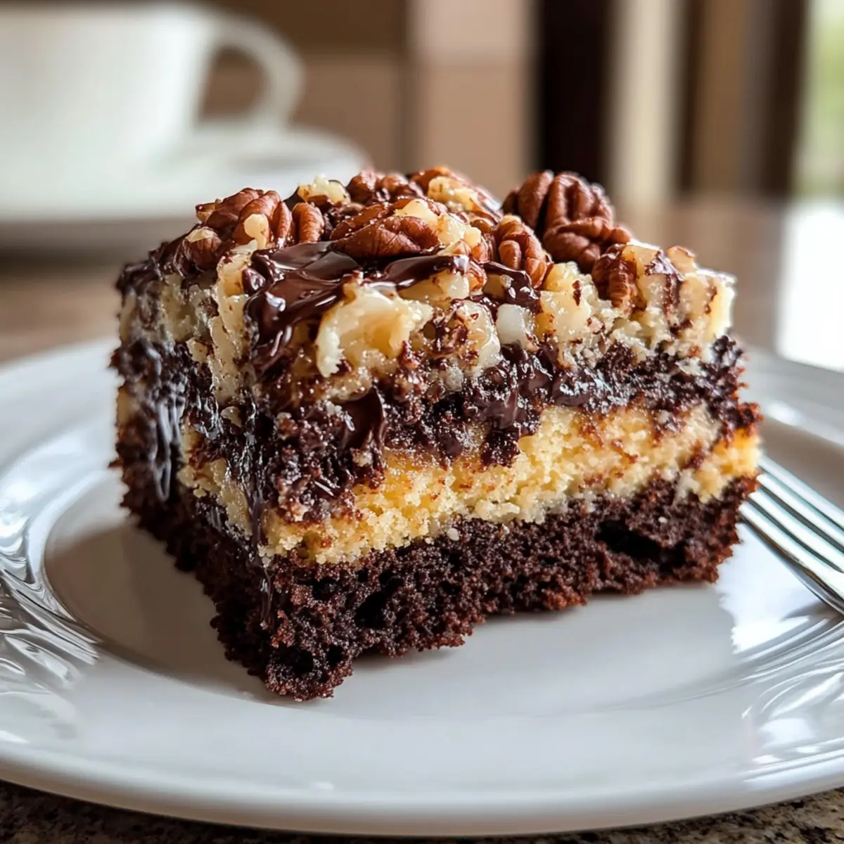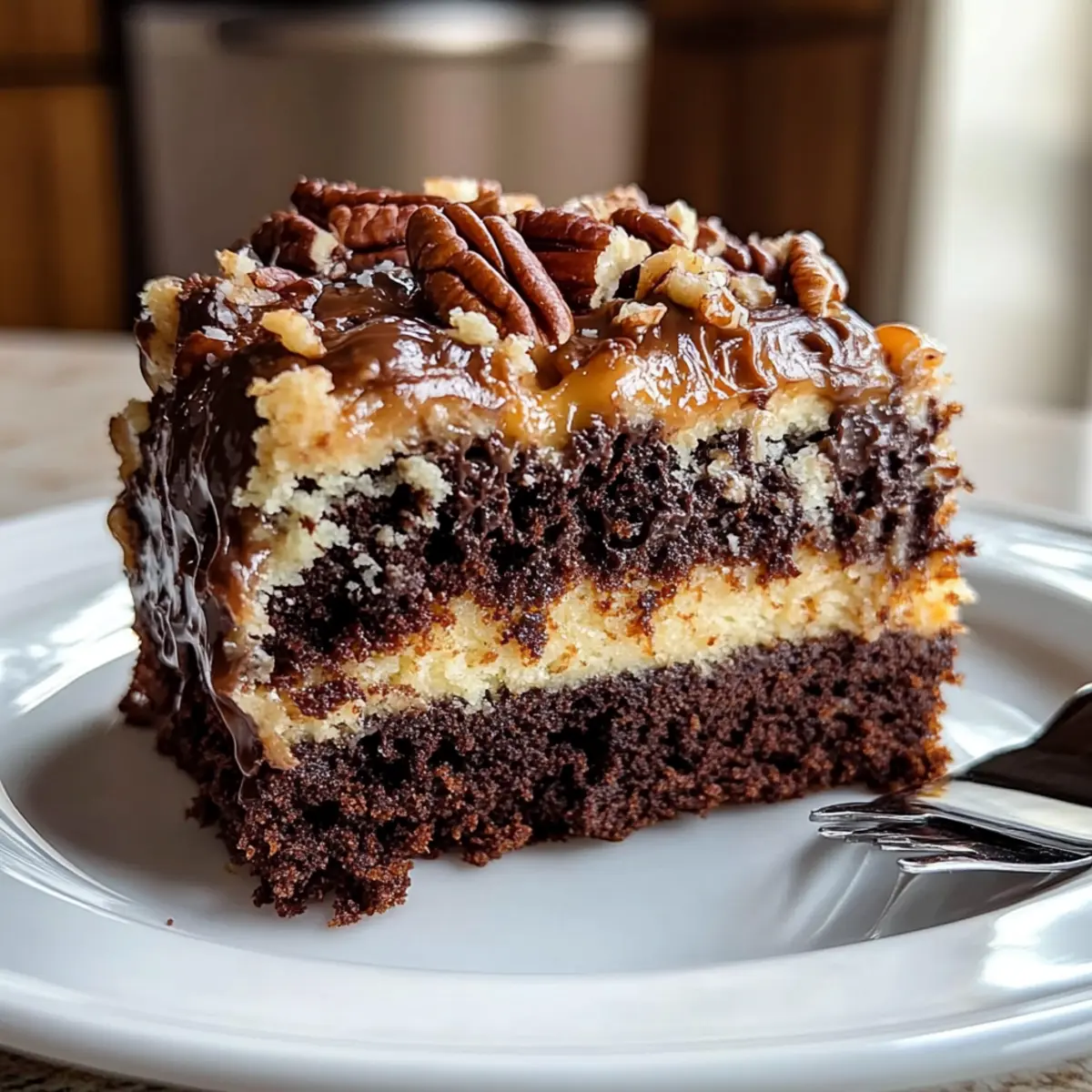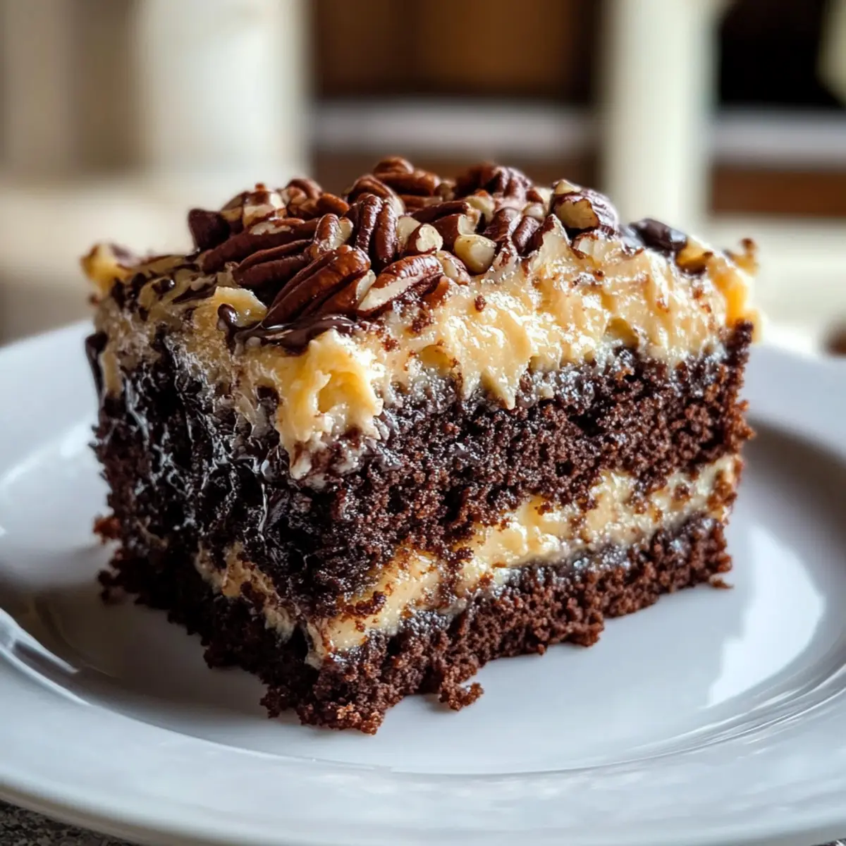 As I sunk my fork into this dreamy slice of German Chocolate Poke Cake, I felt a wave of nostalgia wash over me. This dessert, with its indulgent layer of coconut-pecan frosting sprawled atop a moist chocolate cake soaked in sweetened condensed milk, brings back cherished memories of joyful celebrations. Not only is this easy dessert a family-friendly crowd-pleaser, but it also serves as an impressive centerpiece for birthdays and gatherings alike. With simple ingredients and quick prep, I guarantee you’ll find it hard to resist going back for seconds (or thirds!). Curious how to whip up this delightful treat that marries tradition with a touch of decadence? Let’s dive right in! Why is German Chocolate Poke Cake a Must-Try? Decadent, rich flavor: Each slice bursts with the combination of moist chocolate cake and luscious coconut-pecan frosting, creating a flavor experience that is simply unforgettable. Family-Friendly Delight: Perfect for any occasion, this cake will bring smiles to both kids and adults alike, making it a go-to dessert for family gatherings. Easy to Make: With simple instructions and easily accessible ingredients, you won’t spend all day in the kitchen. It’s like a party on a plate! Impressive Presentation: This cake not only tastes heavenly but also looks stunning, making it an eye-catching centerpiece to wow your guests during birthdays or celebrations. Versatile Options: Feel free to customize it with different toppings or mix-ins. Consider pairing it with a scoop of vanilla ice cream or even serving it with a drizzle of chocolate syrup for an added treat. If you love dessert innovation, check out my Mini Loaf Cakes for another crowd-pleasing recipe that will surely impress! German Chocolate Poke Cake Ingredients Indulge in the layers of flavor with this delightful recipe! For the Cake • Cake Mix – This serves as the cake’s base, adding sweetness and structure. You can substitute any chocolate cake mix for a twist on flavor. For the Soaking • Sweetened Condensed Milk – This magical ingredient adds moisture and sweetness, soaking into the cake for a rich flavor that makes the German Chocolate Poke Cake truly special. For the Frosting • Evaporated Milk – Essential for a creamy base in the frosting; coconut milk can be a great dairy-free alternative, but be aware it may change the flavor slightly. • Unsalted Butter – This adds richness to the frosting; feel free to swap with margarine or a dairy-free alternative if preferred. • Brown Sugar – It offers a delightful depth of flavor in the frosting; using white sugar will alter the taste but can work in a pinch. • Egg Yolks – These help thicken the frosting and give it richness; it’s best not to use egg substitutes here for optimal results. • Shredded Coconut – This brings texture and a tropical flair to the topping; choose sweetened or unsweetened based on your taste. • Chopped Pecans – They add a lovely nutty crunch to the frosting; walnuts can be used as a substitute, or simply omit for a nut-free version. • Vanilla Extract – Enhances the overall flavor; no need for substitution, though it can be omitted if necessary. Step‑by‑Step Instructions for German Chocolate Poke Cake Step 1: Preheat Oven Begin by preheating your oven to 350°F (175°C). This temperature is ideal for achieving a perfectly baked German Chocolate Poke Cake. While the oven heats up, gather all your ingredients and equipment, including a large mixing bowl and a greased 9×13-inch baking pan, to streamline your preparation. Step 2: Prepare Cake In your mixing bowl, prepare the cake mix according to the package instructions, combining the dry ingredients with water, oil, and eggs as directed. Once mixed to a smooth batter, pour it into your greased 9×13-inch pan. Bake in the preheated oven for 25-30 minutes, or until a toothpick inserted in the center comes out clean, indicating it’s ready. Step 3: Poke Holes After removing the cake from the oven, allow it to cool for about 10 minutes. Then, take a wooden spoon handle and gently poke holes all over the warm cake, about 1 inch apart. This step is crucial for allowing the sweetened condensed milk to soak in and infuse the German Chocolate Poke Cake with delicious flavor. Step 4: Add Milk Next, take your sweetened condensed milk and pour it evenly over the warm cake, ensuring it seeps into the holes you’ve created. You’ll want to see the milk thoroughly soaking into each hole, which will result in a moist and flavorful cake. Set the cake aside to absorb the milk while you prepare the frosting. Step 5: Make Frosting In a medium saucepan, combine the evaporated milk, unsalted butter, brown sugar, and egg yolks. Cook on medium heat while stirring constantly for about 10-12 minutes until the mixture thickens and turns a lovely golden color. You’ll know it’s done when it coats the back of a spoon. Remove from heat and stir in the shredded coconut, chopped pecans, and vanilla extract for a rich coconut-pecan frosting. Step 6: Frost Cake Allow the frosting to cool slightly for about 5 minutes, making it easier to spread. Once slightly cooled, pour it evenly over the soaked German Chocolate Poke Cake, covering the entire surface generously. The creamy and textured frosting should create a beautiful layer on top of the cake, promising delightful bites ahead. Step 7: Chill Finally, refrigerate the cake for at least one hour before serving. This chilling time helps the frosting set and allows the flavors to meld beautifully. After chilling, your German Chocolate Poke Cake will be ready to slice and serve, presenting a delightful contrast of textures and flavors! German Chocolate Poke Cake Variations Feel free to get creative and tailor this recipe to your family’s tastes! Each twist and substitute can elevate the experience even further. Dark Chocolate: Opt for a dark chocolate cake mix to amplify the cake’s richness and depth of flavor. Coconut Milk: 