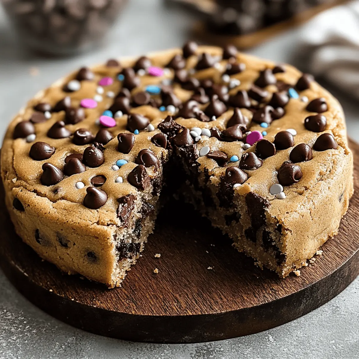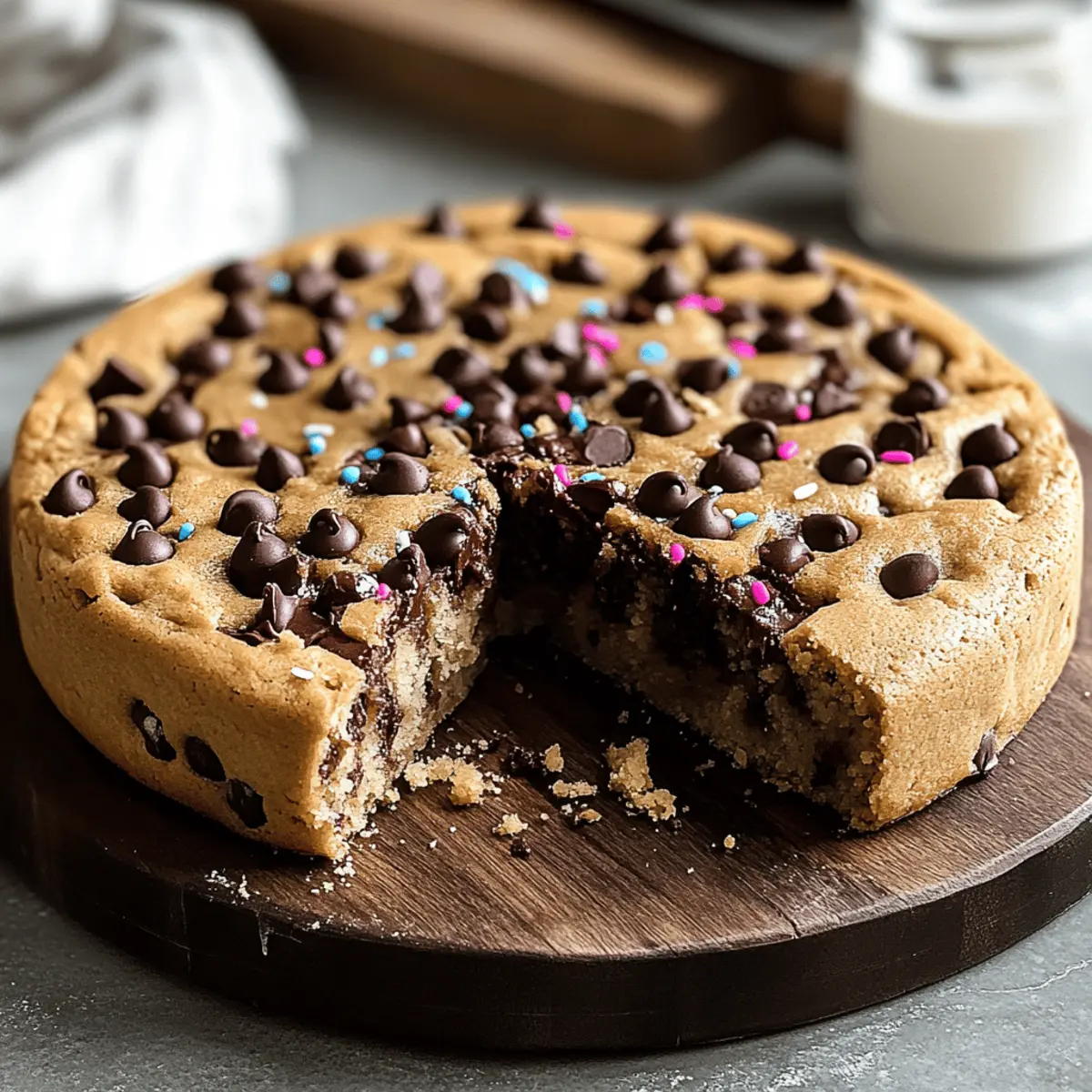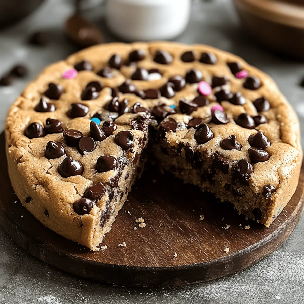 The moment my spoon met the warm, soft center of this giant, buttery delight, I knew I had stumbled upon something truly special. Say hello to the Giant Chocolate Chip Cookie Cake, a simple yet unforgettable twist on a classic favorite! With no chilling time required, this recipe lets you whip up a chewy, melt-in-your-mouth cake that’s perfect for sharing at any occasion—from birthdays to cozy family gatherings. The crisp edges paired with an indulgent, gooey interior create an experience that’s both nostalgic and utterly satisfying. And don’t worry about limitations; this cake encourages delicious customization, inviting your creativity to shine! Will you keep it classic, or mix in your favorite flavors? Why Is This Cookie Cake So Special? Simplicity is Key: This Giant Chocolate Chip Cookie Cake is incredibly easy to make—no chilling time means you can enjoy it fresh and warm in no time! Endless Customization: Feel free to swap out chocolate chips for your favorite nuts or add sprinkles for a festive touch. Nostalgic Flavor: You’ll be transported back to your childhood with every gooey bite, reminiscent of classic cookies but in cake form. Crowd-Pleasing Delight: Perfect for any occasion, this cake is sure to impress family and friends, just like the beloved Brown Butter Chocolate Cookies. Irresistible Texture: The combination of chewy interior and crisp edges creates a dessert that keeps everyone coming back for seconds! Giant Chocolate Chip Cookie Cake Ingredients For the Cake Butter – Provides richness and moisture; substitute with salted butter, cutting back salt to ¼ teaspoon. Granulated Sugar – Sweetens the cake and contributes to its delightful texture. Brown Sugar – Adds depth of flavor and moisture, making the cake wonderfully chewy. Eggs – Binds everything together, ensuring a perfect structure for your cookie cake. Vanilla Extract – Elevates the flavors, making them sing in every bite. All-Purpose Flour – Gives the cake its essential structure; don’t skip this for the perfect result. Baking Soda – Acts as a leavening agent, helping the cake rise beautifully. Salt – Balances sweetness and enhances the overall flavor profile. Chocolate Chips – Adds that melty, gooey goodness; feel free to use milk, dark, or even chopped chocolate bars for variation. Step‑by‑Step Instructions for Giant Chocolate Chip Cookie Cake Step 1: Preheat the Oven Begin by preheating your oven to 350°F (175°C). While the oven heats up, take a 9-inch round or springform pan and grease it generously with butter or baking spray. This step ensures your Giant Chocolate Chip Cookie Cake will easily release from the pan after baking, giving you a beautiful presentation. Step 2: Cream the Butter and Sugars In a large mixing bowl, combine softened butter with granulated and brown sugars. Using an electric mixer, cream the mixture on medium speed until it becomes light and fluffy, about 2-3 minutes. The sugars should be fully incorporated, creating a smooth and creamy base that adds richness to your beautiful cookie cake. Step 3: Incorporate Eggs and Vanilla Next, crack in two large eggs and pour in the vanilla extract. Mix on low speed until everything is well combined, scraping down the sides of the bowl as needed. This mixture should look smooth and slightly thicker, adding moisture and flavor to the Giant Chocolate Chip Cookie Cake. Step 4: Add the Dry Ingredients Gradually sift in the all-purpose flour, followed by the baking soda and salt. Mix gently on low speed until just combined, taking care not to overmix. The dough will begin to hold together, forming a thick batter that will give your cake its perfect soft and chewy texture. Step 5: Fold in the Chocolate Chips Now it’s time to add the star ingredient! Gently fold in your choice of chocolate chips, ensuring they are evenly distributed throughout the batter. This will create pockets of gooey chocolate goodness in every slice of your Giant Chocolate Chip Cookie Cake, making it irresistible. Step 6: Pour and Spread the Batter Transfer the batter into the prepared pan, using a spatula to spread it out evenly. Smooth the top for a prettier finish. Make sure it’s uniform; this ensures that your cake bakes evenly, with the edges crisping up beautifully while the center remains delightfully soft. Step 7: Bake the Cake Place the pan in the preheated oven and bake for 25 to 30 minutes. Keep an eye out for the edges to turn golden brown, while the center should still look slightly soft and underbaked. This perfect baking balance is key to achieving that chewy texture the Giant Chocolate Chip Cookie Cake is known for. Step 8: Cool Before Decorating Once baked, remove the pan from the oven and set it on a wire rack to cool. Allow the cake to cool in the pan for about 10 minutes before carefully transferring it to a serving platter. This cooling step is crucial so that the cake sets nicely and is easier to decorate with your choice of toppings, if desired. Make Ahead Options These Giant Chocolate Chip Cookie Cakes are perfect for meal prep, allowing you to enjoy delicious homemade treats without the last-minute rush! You can bake the cake up to 24 hours in advance. Simply allow it to cool completely, then store it in an airtight container at room temperature to maintain its soft, chewy goodness. If you plan to decorate, wait until just before serving to add your toppings, which keeps them fresh and visually appealing. Alternatively, if you want to prep the batter, you can mix it together up to 3 days ahead and refrigerate it. Just bring the batter to room temperature before pouring it into the pan and baking for that fresh-baked taste! Giant Chocolate Chip Cookie Cake Variations Feel free to explore these delightful twists on the classic Giant Chocolate Chip Cookie Cake and make it your own! Nutty Delight: Swap chocolate chips for your favorite chopped nuts like walnuts or pecans to add a satisfying crunch. Frosted Fantasy: T
