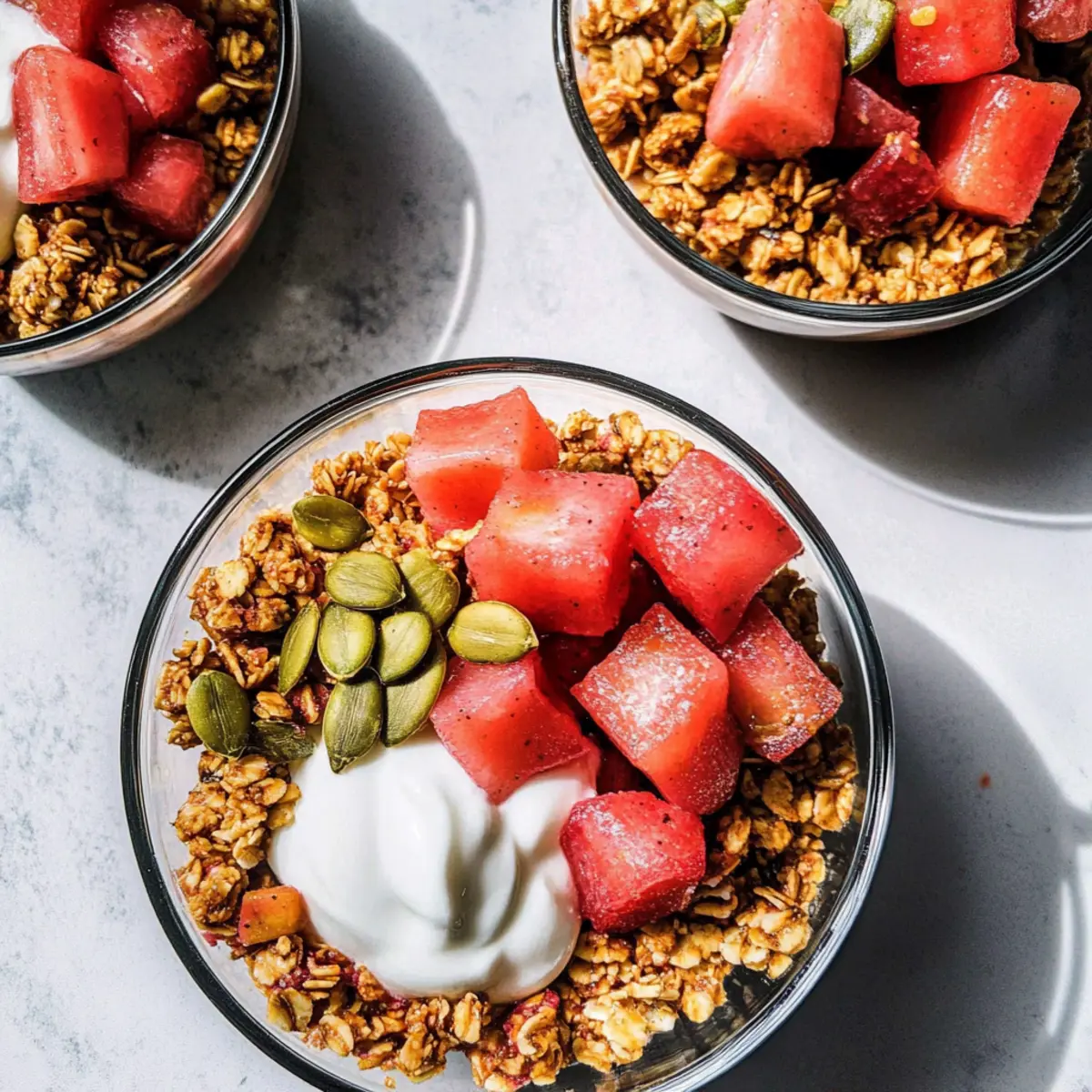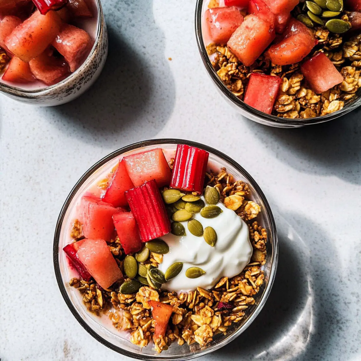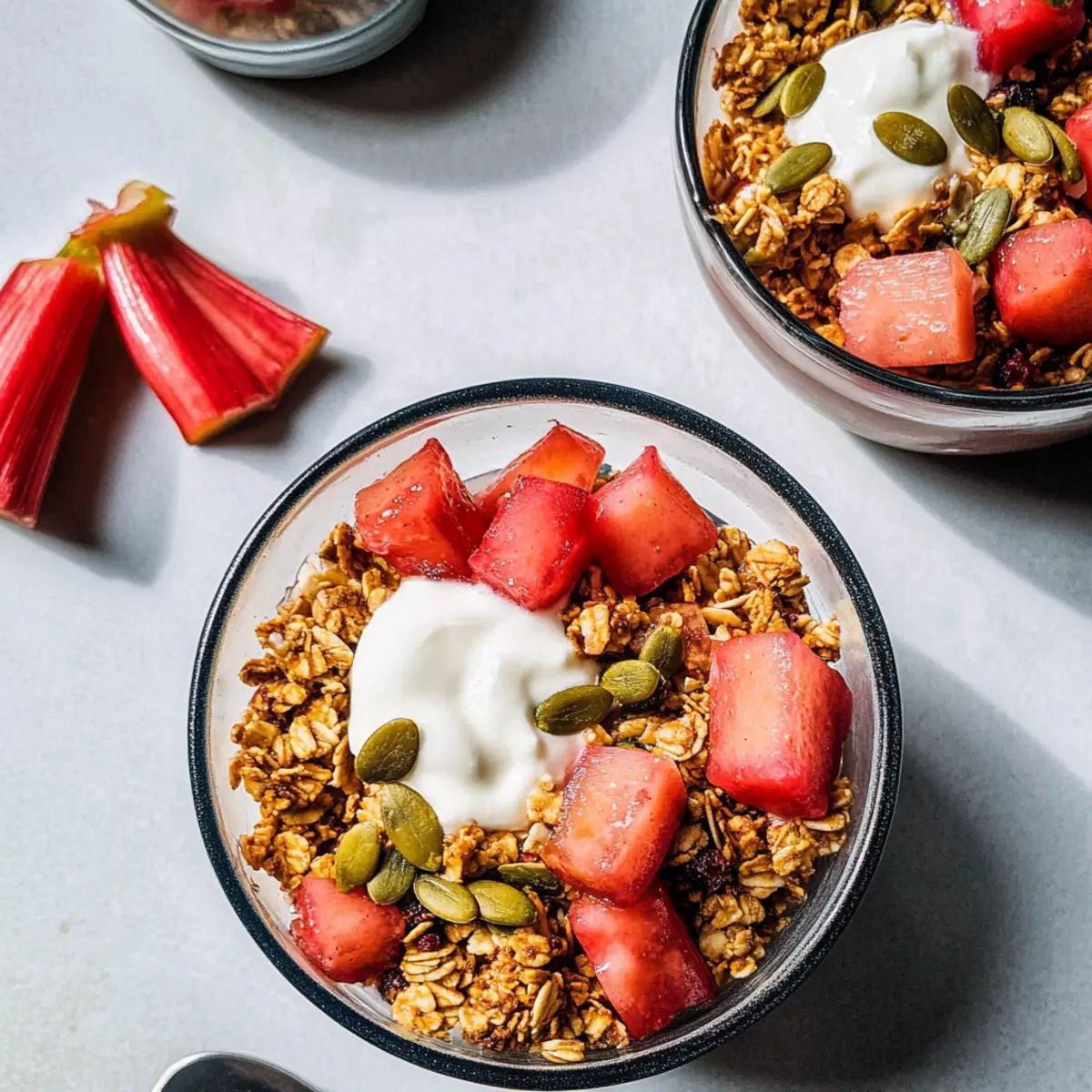 As I sifted through my pantry, a whirlwind of inspiration struck me—a glorious fusion of crunchy granola and sweet-tart stewed rhubarb was just waiting to happen. Introducing my Protein-Packed Clumpy Granola Bowl with Stewed Rhubarb and Yogurt, a delightful creation that transforms humble ingredients into a nourishing breakfast or snack. Not only does this recipe promise a quick prep, but it also adds a protein boost thanks to chickpea flour, making it both satisfying and energizing. Topped with smooth yogurt and a burst of vibrant rhubarb, it’s a comforting reminder that healthy can be irresistibly delicious. So, are you ready to elevate your morning routine with this easy yet delectable bowl of goodness? Why not make your breakfasts exciting? Uniqueness: This recipe is a delightful twist on traditional granola, combining the crispiness of clumpy granola with tangy stewed rhubarb—a topping that brightens every bite. Health-Packed: With the addition of chickpea flour, this bowl is a powerhouse of protein, making it perfect for fueling your day or post-workout recovery. Versatility: Customize it to suit your tastes! Whether you prefer Salted Caramel Bowl flavors, or enjoy adding fresh fruits, there’s a delightful variation for everyone. Quick and Easy: In just a few simple steps, you can prepare a wholesome breakfast or snack that’s ready in under an hour—ideal for those busy mornings! Crowd Pleaser: Serve it to family and friends for a healthy brunch option they won’t forget; the combination of textures and flavors is sure to impress. Granola Bowl with Stewed Rhubarb Ingredients For the Granola • Gluten-Free Old-Fashioned Rolled Oats – The base, providing structure and fiber; substitute with quinoa flakes for a grain-free option. • Almonds, Chopped – Adds satisfying crunch and healthy fats; can be swapped for walnuts or pecans to alter the flavor. • Puffed Brown Rice – Lightens texture; omit for a denser granola or add more oats instead. • Chickpea Flour – Boosts protein content while keeping it sweet; can be replaced with almond flour for a nutty essence. • Pumpkin Seeds – Offers extra crunch and nutrients; sunflower seeds can be used as an alternative. • Sunflower Seeds – Packed with healthy fats and added texture; substitute with sesame seeds if you have allergies. • Ground Cinnamon – Provides delightful warmth and flavor; consider using nutmeg for a different aromatic touch. • Ground Ginger – Imparts a spicy note; fresh grated ginger can also add more zing. • Sea Salt – Balances the sweetness beautifully; optional if you’re following a low-sodium diet. • Maple Syrup – Sweetens the mixture naturally; honey is a tasty alternative to switch things up. • Coconut Oil, Melted – Helps bind the granola and assists in browning; use butter or a neutral oil if preferred. For the Stewed Rhubarb • Rhubarb Stalk – The star of the topping, providing a delightful tart contrast; strawberries or apples can be substituted if rhubarb isn’t available. • Maple Syrup (for Stewed Rhubarb) – Sweetens the tart rhubarb; adjust quantity according to your taste. • Lemon Juice – Brightens the rhubarb flavor; lime juice can also work as a substitute. • Vanilla Bean Pod – Adds an enticing depth and richness; pure vanilla extract is a suitable alternative if you’re in a pinch. Enjoy crafting your very own Granola Bowl with Stewed Rhubarb! Step‑by‑Step Instructions for Granola Bowl with Stewed Rhubarb Step 1: Preheat the Oven Begin by preheating your oven to 350°F (180°C). This temperature is essential for ensuring that your granola cooks evenly and achieves that perfect crispy texture. As the oven warms up, you’ll prepare the granola mixture, which will soon fill your kitchen with wonderful aromas. Step 2: Combine Dry Ingredients In a large mixing bowl, combine the gluten-free rolled oats, chopped almonds, puffed brown rice, chickpea flour, pumpkin seeds, sunflower seeds, ground cinnamon, ground ginger, and a pinch of sea salt. Stir these dry ingredients together thoroughly to ensure even distribution of flavors. This mixture forms the base of your Granola Bowl with Stewed Rhubarb. Step 3: Add Wet Ingredients Next, pour in the maple syrup and melted coconut oil. Using a spatula, mix until all the dry ingredients are fully coated and clumped together slightly. This step is vital for creating that delightful texture; you want each bite to be both crunchy and chewy, so make sure everything is well combined. Step 4: Spread on Baking Sheet Line a baking sheet with parchment paper and transfer your granola mixture onto it. Spread the mixture evenly across the sheet, taking care to leave some space between clumps. This will allow the granola to crisp up beautifully. Visualize a canvas, as you don’t want it overcrowded—each piece deserves its moment in the oven. Step 5: Bake the Granola Place the baking sheet in your preheated oven and bake for 25-30 minutes. Halfway through, give it a gentle stir to ensure it browns evenly without burning. Keep a close eye on it towards the end; you want your granola to be golden brown and clumpy, creating a delightful texture for your bowl. Step 6: Prepare the Rhubarb While the granola bakes, take a medium saucepan and add the chopped rhubarb, a splash of maple syrup, and lemon juice. Simmer over medium heat for about 10 minutes until the rhubarb softens but retains some structure. You’ll know it’s ready when it becomes tender yet chunky, offering a beautiful balance against the granola. Step 7: Serve Your Granola Bowl To assemble your Granola Bowl with Stewed Rhubarb, layer creamy yogurt at the bottom of your bowl. Top it generously with the homemade granola, followed by a heaping spoonful of the vibrant, sweet-tart stewed rhubarb. This colorful layering not only creates a stunning presentation but also enhances each bite’s flavor and texture, making it a nourishing breakfast or snack. Exper