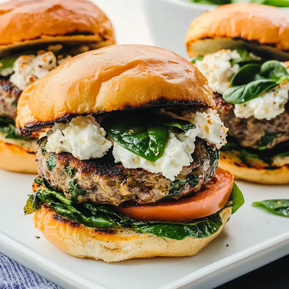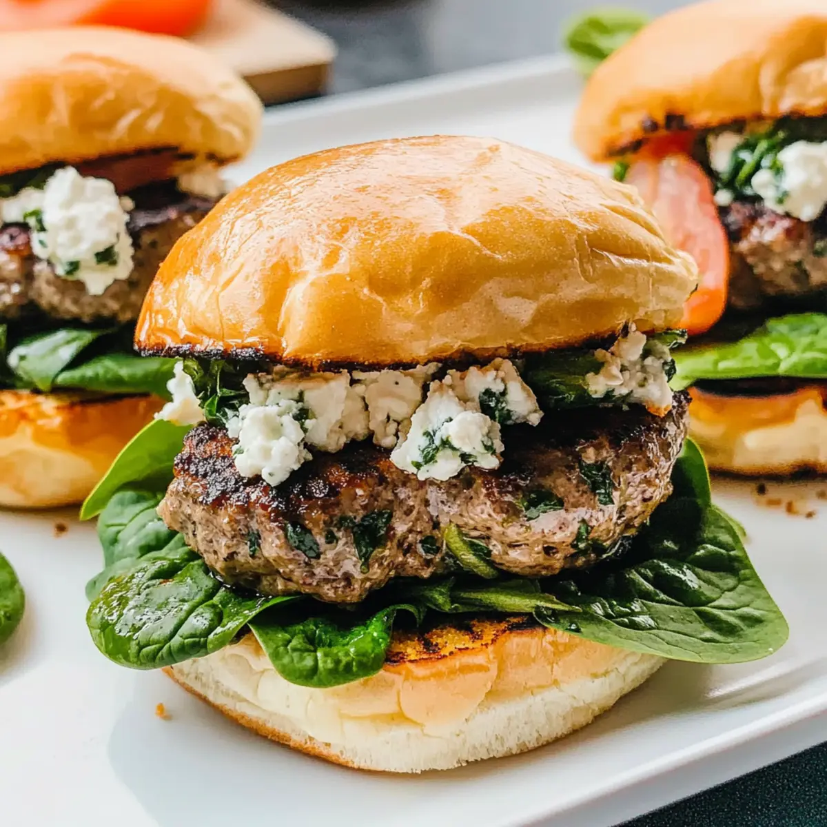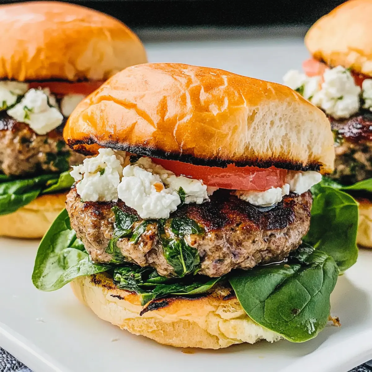 As I was flipping through my favorite cookbook, a vibrant photo of Greek burgers caught my eye, instantly whisking me away to sun-drenched Mediterranean shores. These Greek Spinach Feta Burgers are a delightful way to bring those tantalizing flavors home, infusing your dinner table with freshness and flair. Perfectly healthy and low in carbs, you’ll find these juicy patties a breeze to whip up, with just 10 minutes of prep time needed. They’re a quick and easy family meal, whether grilled or pan-seared, making them a fantastic alternative to fast food. Wondering how you can transform your weeknight dinners into a Mediterranean feast? Let’s dive into this delicious recipe together! Why are Greek Burgers so special? Bursting with flavor: Each bite of these Greek Spinach Feta Burgers showcases the vibrant combination of fresh spinach, tangy feta, and savory sun-dried tomatoes, elevating your burger game to new heights. Quick & easy: With just 10 minutes of prep, you can enjoy a delicious meal without spending hours in the kitchen. Healthy indulgence: Low in carbs and packed with nutrients, these burgers offer a guilt-free way to satisfy your cravings. Versatile options: Whether you stick with ground beef or explore variations like ground turkey or chicken, everyone can enjoy a tasty twist! Crowd-pleaser: Perfect for dinners, weekend barbeques, or meal prepping—these burgers will impress family and friends alike! Explore more ways to enjoy Mediterranean flavors by checking out my post on wholesome Greek salads. Greek Burgers Ingredients • Discover the delicious components! For the Patties Ground Beef – Provides essential flavor and texture; consider swapping it with ground turkey for a leaner take. Fresh Baby Spinach – Packed with nutrients and moisture; frozen spinach works well too if drained properly. Feta Cheese – Adds creaminess and a tangy kick; crumbled feta is best, but goat cheese can substitute beautifully. Sun-Dried Tomatoes – Enhance the Mediterranean essence with their sweet tang; opt for dry-packaged ones for optimal flavor. Large Egg – Acts as a binder, keeping the patties intact; use a flax egg for a vegan alternative. Table Salt – Essential for flavor; no substitutes necessary here. For Serving Sandwich Buns – Perfect for presentation and a satisfying bite; try lettuce wraps or low-carb buns for a healthier option. Toppings (optional) – Fresh spinach, sliced tomato, sliced shallot, and tzatziki sauce add moisture and flavor; replace tzatziki with hummus or mashed avocado if desired. Craft these Greek burgers with love, and you’ll experience a delightful medley of flavors! Dive into the Mediterranean with every juicy bite. Step‑by‑Step Instructions for Greek Spinach Feta Burgers Step 1: Make Burger Patties In a large mixing bowl, combine the ground beef, fresh baby spinach, crumbled feta cheese, sun-dried tomatoes, egg, and a pinch of salt. Using your hands, mix until well incorporated, ensuring not to overwork the meat. Shape the mixture into four patties, approximately one inch thick. Cover the patties with plastic wrap and refrigerate for at least one hour to let them firm up and enhance the flavors. Step 2: Toast Buns Preheat a skillet or grill over medium heat. While heating, lightly brush or drizzle olive oil on the cut sides of sandwich buns. Once the pan is hot, place the buns cut-side down and toast them for about 2-3 minutes or until they turn golden brown and slightly crispy. Keep an eye on them to prevent burning, creating a flavorful base for your Greek burgers. Step 3: Cook Burger Patties Increase the heat to medium-high and add a splash of oil to the pan if needed. Carefully place the chilled burger patties in the skillet or on the grill and cook for approximately 4-5 minutes on one side. Flip the patties when they develop a nice char and cook for an additional 4-5 minutes, or until their internal temperature reaches 160°F, ensuring a juicy Greek burger experience. Step 4: Assemble and Serve Once the patties are cooked through, remove them from the heat and let them rest for a moment. Place each juicy Greek spinach feta burger on a toasted bun, and add your preferred toppings such as fresh spinach, sliced tomatoes, sliced shallots, and a generous dollop of tzatziki sauce. Serve them immediately while hot, making sure to savor every bite of these delightful Mediterranean-inspired burgers. How to Store and Freeze Greek Burgers Fridge: Store cooked Greek burgers in an airtight container in the refrigerator for up to 3 days. Reheat in a skillet or microwave for quick meals. Freezer: For longer storage, freeze the uncooked patties individually wrapped in plastic and then placed in a freezer bag for up to 3 months. Reheating: When ready to enjoy, cook the frozen patties directly from the freezer. Grill or pan-sear them for about 5-7 minutes on each side until thoroughly heated. Make-Ahead: You can prep Greek burgers ahead of time and refrigerate or freeze them before cooking. They’ll save you time while still delivering a fresh, flavorful experience! Expert Tips for Greek Burgers Chill Before Cooking: Keep the formed patties in the refrigerator for at least one hour. This helps them hold their shape and enhances the flavors. Avoid Overcooking: Cook the patties until they reach 160°F internally to avoid dryness. Use a meat thermometer for perfect results. Experiment with Herbs: Try adding fresh herbs like oregano or dill for an extra burst of flavor in your Greek burgers. Toast Buns Perfectly: Keep a close eye while toasting buns. A golden brown finish adds texture and enhances the overall burger experience. Don’t Overcrowd the Pan: Give each burger enough space when cooking to ensure even browning and a good sear on each patty. Make Ahead Options These Greek Spinach Feta Burgers are perfect for busy weeknights and meal prep enthusiasts! You can prepare the burger patties up to 24 hours in advance by mixing the ground beef, spinac