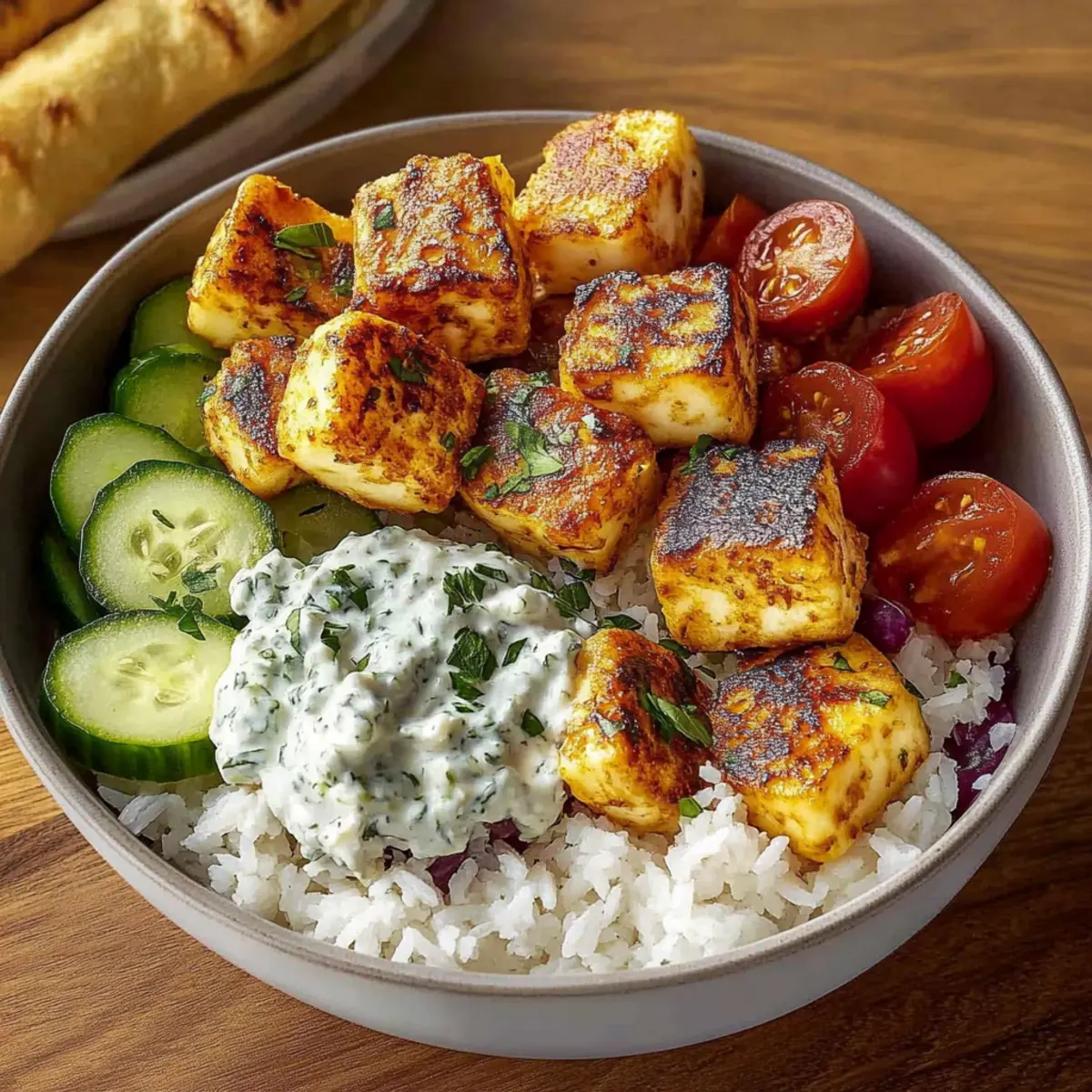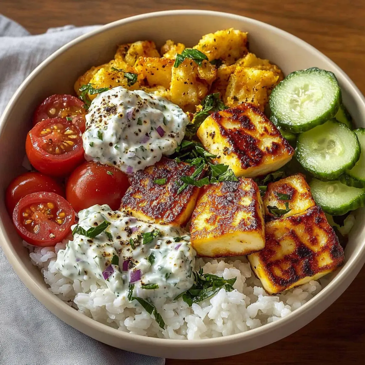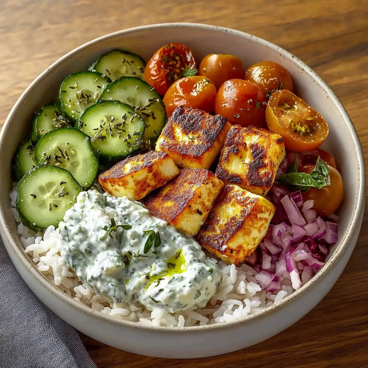 As I savored the last bite of my Greek Halloumi Power Bowl, I couldn’t help but appreciate the delightful combination of flavors and textures. This dish showcases beautifully seared halloumi cheese, which offers a satisfying crunch on the outside while remaining soft and delectable within. Packed with crisp vegetables and a tangy tzatziki sauce, this Mediterranean-inspired bowl is not just a feast for the eyes; it’s also a nutritious meal that comes together in a flash. Perfectly suited for both lunch and dinner, it’s a great option when you’re craving something wholesome, yet involved. Why settle for fast food when you can elevate your dining experience with this vibrant, vegetarian-friendly bowl? Let’s dive into how to create this culinary masterpiece that will brighten your table and taste buds! Why Choose This Greek Halloumi Bowl? Flavor Explosion: Each bite combines crispy halloumi, juicy tomatoes, and crunchy cucumbers, creating a vibrant blend of textures that excite your palate. Quick & Easy: This dish comes together in just 30 minutes, making it an ideal choice for busy weeknights. Versatile Base: Swap rice for quinoa or couscous to customize the dish to your liking. Nutrient-Packed: Loaded with fresh veggies, this power bowl is a nutritious delight for satisfying your cravings. When you’re looking for something healthier than fast food, this bowl shines in flavor and versatility—it’s a fantastic go-to for lunch or dinner! Why not try pairing it with a refreshing Potato Breakfast Bowl for meal prep or enjoy it alongside a hearty Grilled Shrimp Bowl for dinner parties? Greek Halloumi Power Bowl Ingredients For the Bowl Halloumi cheese – The star of this dish, providing a unique squeaky texture and savory flavor; no direct substitutions without altering the dish. Cooked white rice – A comforting base that absorbs all the delightful flavors; quinoa or couscous can be used for a variation. English cucumber – Adds refreshing crunch and moisture; you can alternate with bell peppers for a different taste. Cherry tomatoes – Bring juiciness and vibrant color to the bowl; grape tomatoes or roasted red peppers are good substitutes. Red onion – Contributes a mild yet pungent bite; shallots are a sweeter alternative if you prefer. Kalamata olives – Add an authentic Mediterranean briny taste; green olives may be used as a substitute, although it will change the flavor considerably. For the Toppings Prepared tzatziki sauce – Creamy and tangy, this ties all the elements together; make homemade tzatziki for an extra fresh touch. Fresh dill – Enhances the aroma and flavor; parsley or mint can be substituted if preferred. For Serving Pita bread – Served warm, it’s perfect for scooping up all the delicious components; gluten-free options exist for those with dietary restrictions. Olive oil – Essential for achieving a golden crust on the halloumi; can be swapped for avocado oil if desired. With these flavorful ingredients, your Greek Halloumi Power Bowl will come together beautifully, creating a dish that is as delightful to eat as it is nourishing! Step‑by‑Step Instructions for Greek Halloumi Power Bowl Step 1: Prep Vegetables Start by washing and slicing the English cucumber into thin rounds, halving the cherry tomatoes for a burst of juiciness, and thinly slicing the red onion to add a mild, pungent flavor. Place all the prepared veggies in a bowl and set aside. This colorful medley will form the vibrant base for your Greek Halloumi Power Bowl. Step 2: Warm Pita In a skillet over medium heat or using a microwave, warm the pita bread until it’s soft and pliable—about 1-2 minutes should do. Once warmed, easily cut the pita into wedges. These will serve as delightful scoops for your Greek Halloumi Power Bowl, enhancing your Mediterranean experience. Step 3: Prepare Halloumi Carefully slice the halloumi cheese into 1/2-inch thick pieces and use paper towels to pat them dry. Removing moisture is crucial to prevent sticking when searing. As you prepare, envision the golden crust that will soon form on your halloumi, creating a beautiful contrast in texture for the Greek Halloumi Power Bowl. Step 4: Heat Skillet Set a large non-stick or cast iron skillet over medium-high heat, allowing it to warm up for a couple of minutes. Once hot, pour in olive oil until it’s shimmering—this is the ideal temperature for achieving that perfect golden crust on your halloumi. Your kitchen will soon be filled with delightful aromas! Step 5: Sear Halloumi Gently place the halloumi slices in a single layer in the hot skillet, ensuring they are not crowded. Let them cook undisturbed for about 2-3 minutes until they are beautifully golden brown. With a spatula, flip them and let the other side sear for another 2-3 minutes, achieving a lovely crispiness that’s essential for your Greek Halloumi Power Bowl. Step 6: Assemble Bowls Now it’s time to assemble your Greek Halloumi Power Bowl! In each bowl, start with a generous scoop of cooked rice as the base. Layer on the crispy halloumi, followed by cucumber, cherry tomatoes, red onion, and Kalamata olives. Finally, add a generous dollop of tzatziki sauce on top, garnishing with fresh dill, salt, and pepper for an extra pop of flavor. Step 7: Serve Serve your Greek Halloumi Power Bowl immediately, paired with warm pita wedges for scooping. Relish the vibrant medley of flavors and textures as you enjoy each delicious bite. This quick and nutritious meal is now ready to brighten up your table and satisfy your cravings for something wholesome. How to Store and Freeze Greek Halloumi Power Bowl Fridge: Store any leftovers in an airtight container for up to 2-3 days. Keep the components separate to maintain texture and freshness. Freezer: While not recommended for freezing the entire bowl, you can freeze cooked rice and halloumi separately for up to 1 month. Thaw overnight in the fridge before reheating. Reheating: Reheat halloumi in