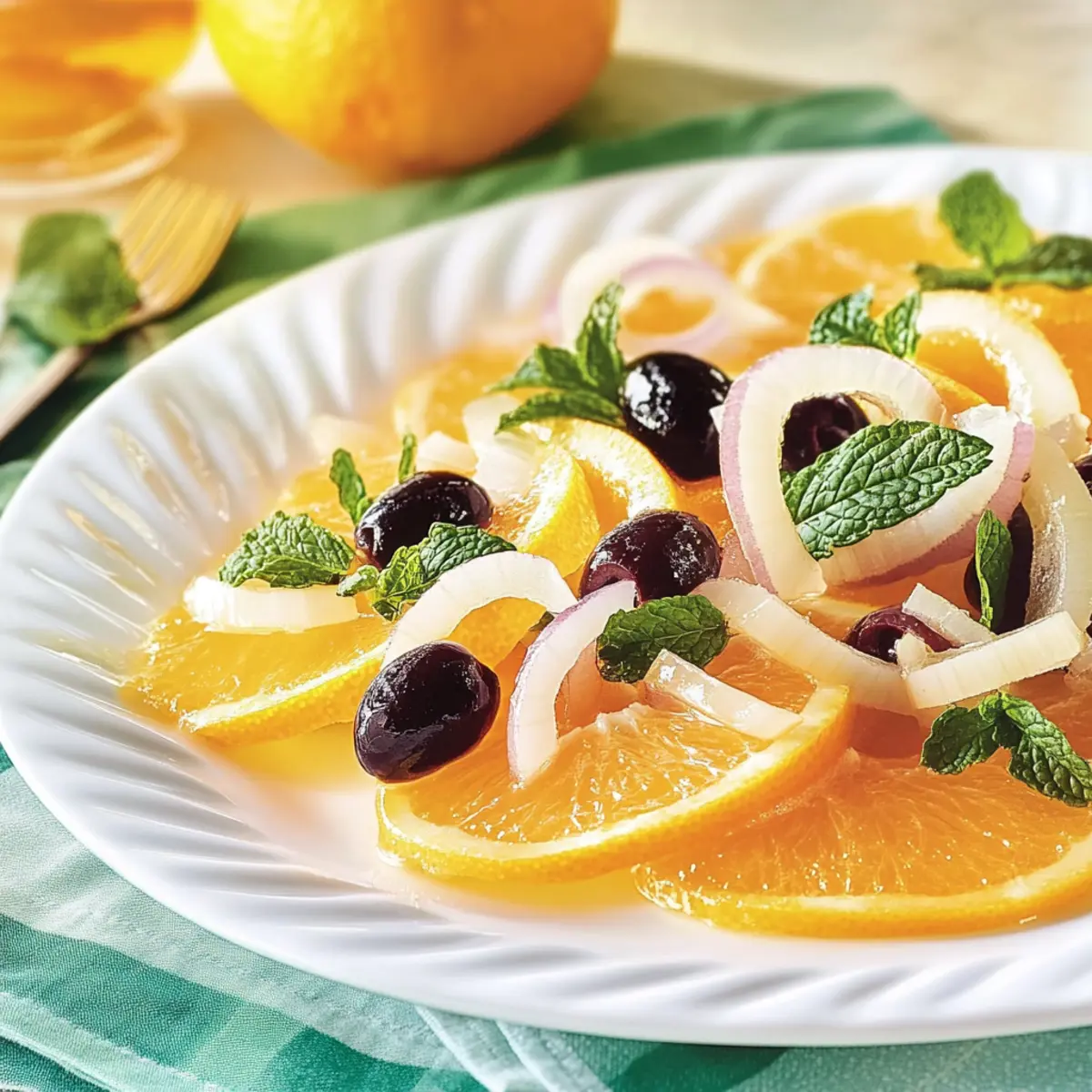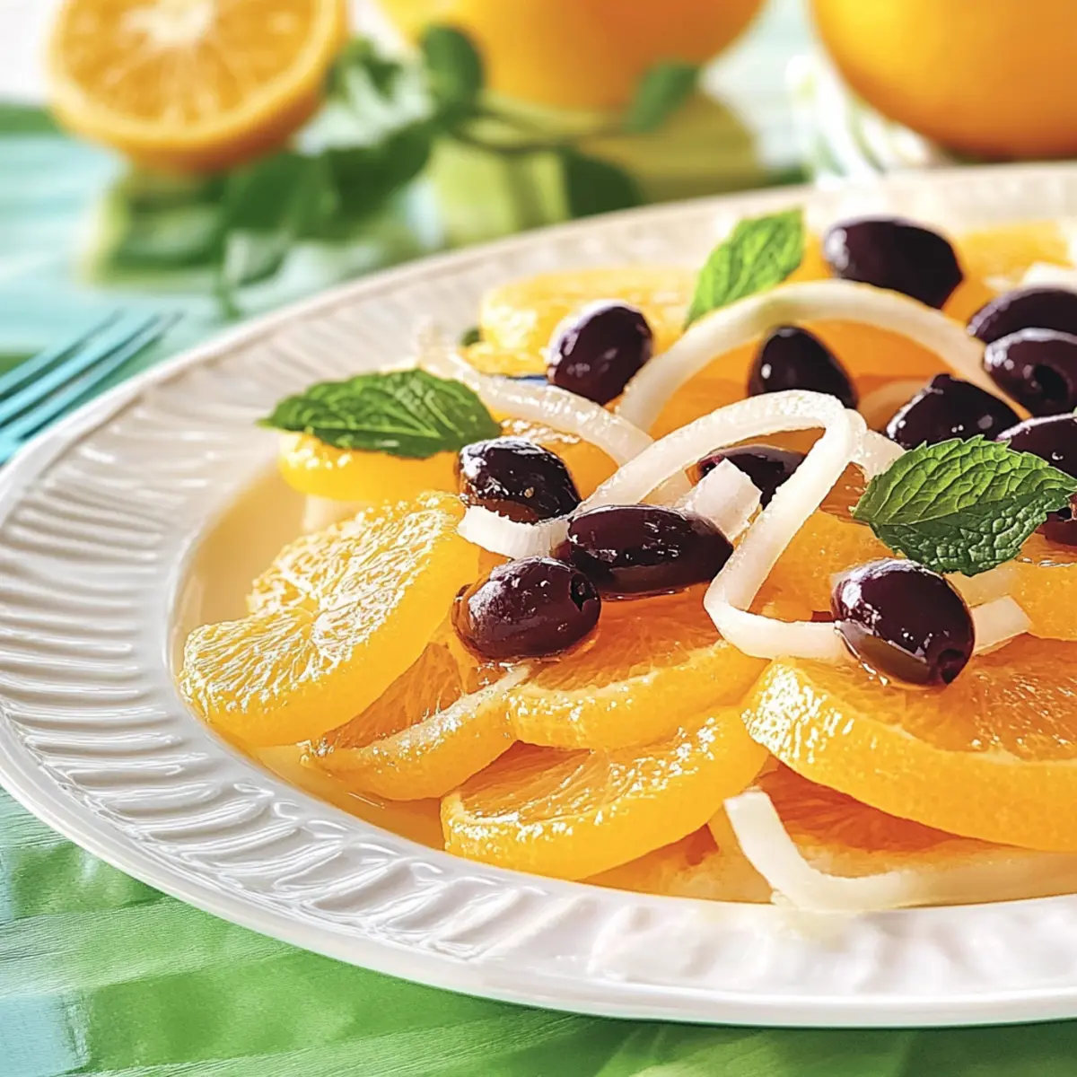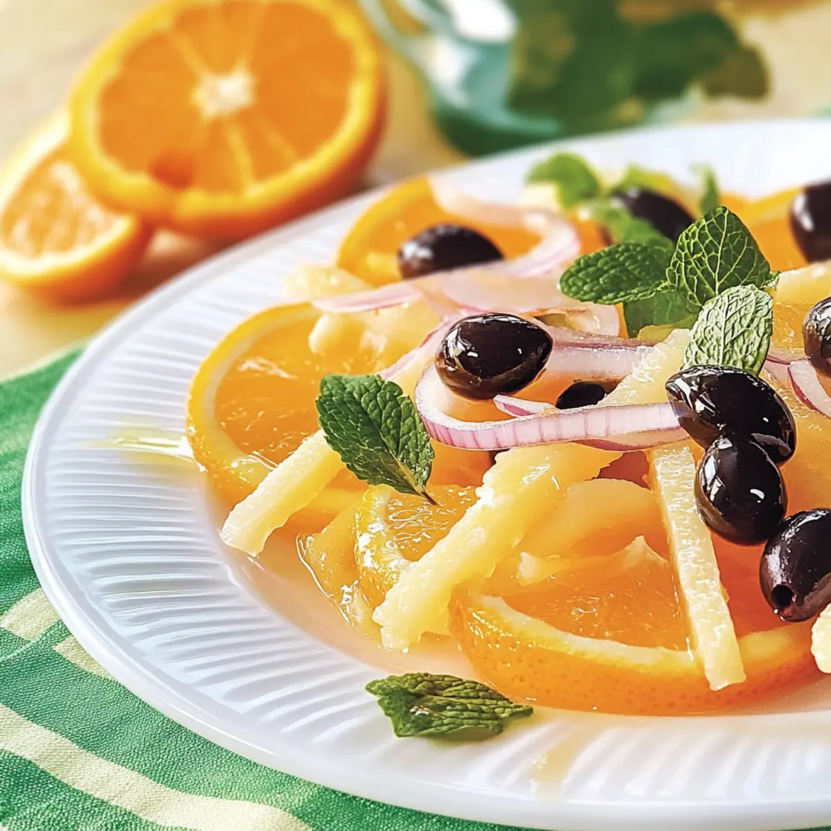 As I sliced into a perfectly ripe orange, the sweet scent of citrus instantly lifted my spirits. This Greek Orange Salad with Fresh Mint is a delightful homage to spring, ready to brighten your table in just 15 minutes. It marries the juicy sweetness of oranges with the refreshing notes of mint and the crunch of sweet onions. Whether you’re hosting a gathering or simply pampering yourself after a long day, this quick, easy, and flavorful recipe is your ticket to a satisfying, dairy-free treat that everyone will enjoy. Not only is it a crowd-pleaser, but it’s also perfect for those seeking healthy and gluten-free options. What are you waiting for? Let’s dive into this vibrant dish that’s sure to impress! Why is Greek Orange Salad a Must-Try? Vibrant Colors: The medley of oranges, crunchy onions, and fresh mint create a stunning presentation that will brighten any table. Quick & Easy: With just 15 minutes to prepare, this salad is perfect for busy days or last-minute gatherings. Flavor Explosion: The sweet and zesty contrast, paired with the earthiness of olives, delights every palate. Diet-Friendly: This recipe is vegan, gluten-free, and dairy-free, making it a versatile choice for various dietary needs. Versatile Pairing: Serve it as a refreshing side dish with grilled meats or alongside a savory entrée like Crispy Orange Chicken for an unforgettable meal. Greek Orange Salad Ingredients • Dive into vibrant flavors with the Greek Orange Salad with Fresh Mint. For the Salad Navel Oranges – The star ingredient that adds sweetness and juiciness; try blood oranges for an unexpected twist. Sweet Yellow Onion – Offers a mild crunch; peel and slice thinly for a perfect flavor balance. Substitute with scallions for a gentler touch. Fresh Mint Leaves – Essential for a fragrant aroma; tear them to release the oils, or use basil if mint isn’t at hand. Black Olives – Adds a briny depth to your salad; Kalamata olives can provide a bolder flavor alternative. For the Vinaigrette Apple Cider Vinegar – Brings tanginess that enhances the salad; swap it for white wine vinegar for something different. Honey or Agave Nectar – Sweetens the dressing, with agave making it vegan; maple syrup serves as a delightful substitute. Dijon Mustard – Introduces a sharp flavor note in the vinaigrette; whole grain mustard can add texture and earthiness. Ground Cinnamon – A warm touch that enriches the dressing; it’s optional if you prefer a pure citrus taste. Salt – To elevate all the marvelous flavors; adjust based on your preference. Non-GMO Canola Oil or Olive Oil – The base for the vinaigrette, adding richness; extra virgin olive oil pairs beautifully for a flavor boost. Step‑by‑Step Instructions for Greek Orange Salad with Fresh Mint Step 1: Prepare Oranges Begin by trimming the ends of each navel orange and carefully peeling them to remove all the pith. With a sharp knife, slice the oranges into even rounds, about half an inch thick, and set the picturesque slices aside on a cutting board. Let their vibrant color and sweet aroma transport you to sunny Mediterranean mornings. Step 2: Assemble Salad Take a large, beautiful platter and start arranging the orange slices in a circular fashion, slightly overlapping them for an attractive presentation. Once the base of juicy oranges is ready, scatter the thinly sliced yellow onion pieces, torn fresh mint leaves, and pitted black olives evenly over the oranges, creating a feast for the eyes as well as the taste buds. Step 3: Make Vinaigrette In a medium bowl, combine a splash of apple cider vinegar, a drizzle of honey or agave nectar, a teaspoon of Dijon mustard, and a pinch of salt for flavor. If you wish, add a dash of ground cinnamon to bring warmth to your vinaigrette. Using a whisk, combine these ingredients thoroughly, and gradually pour in non-GMO canola oil while whisking briskly to form an emulsified dressing. Step 4: Dress Salad Once your vinaigrette is well-mixed and fragrant, take it and drizzle generously over the assembled Greek Orange Salad. Aim to coat the orange slices entirely so that they soak up all the flavors. Serve immediately to ensure the salad retains its freshness, allowing your guests to experience that delightful burst of citrus with each bite. What to Serve with Greek Orange Salad with Fresh Mint? This salad’s bright flavors and textures make it a cheerful addition to any meal, and pairing it just right can elevate your dining experience. Grilled Chicken Skewers: The smoky flavor of grilled chicken complements the refreshing citrus and mint, creating a balanced meal. Roasted Vegetables: A mix of roasted seasonal veggies adds a warm, earthy contrast that enhances the salad’s bright notes. Quinoa Salad: Nutty quinoa mixed with herbs offers protein and a hearty texture, perfect for a filling yet light combination. Pita Bread: Soft, warm pita can scoop up the salad and vinaigrette, adding a delightful chewy texture and a Mediterranean touch. Fresh Hummus: The creamy, savory flavor of hummus pairs beautifully with the salad’s sweetness for a delightful taste experience. White Wine Spritzer: A light, refreshing white wine spritzer enhances the fruity flavors, making it a delightful drink for warm days. Dark Chocolate Tart: For dessert, a rich dark chocolate tart provides a luscious conclusion to the meal, balancing the salad’s brightness with its deep flavors. Make Ahead Options These Greek Orange Salad with Fresh Mint are perfect for busy cooks looking to save time without sacrificing flavor! You can prepare the oranges and onion slices up to 24 hours in advance. Simply peel and slice the oranges, then store them in an airtight container in the refrigerator, ensuring they stay juicy. The vinaigrette can be whisked together and stored for up to 5 days in the fridge; letting it sit allows the flavors to meld beautifully. When you’re ready to serve, just assemble your salad with the prepped ingredients, dr