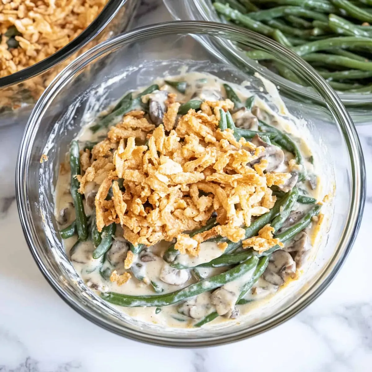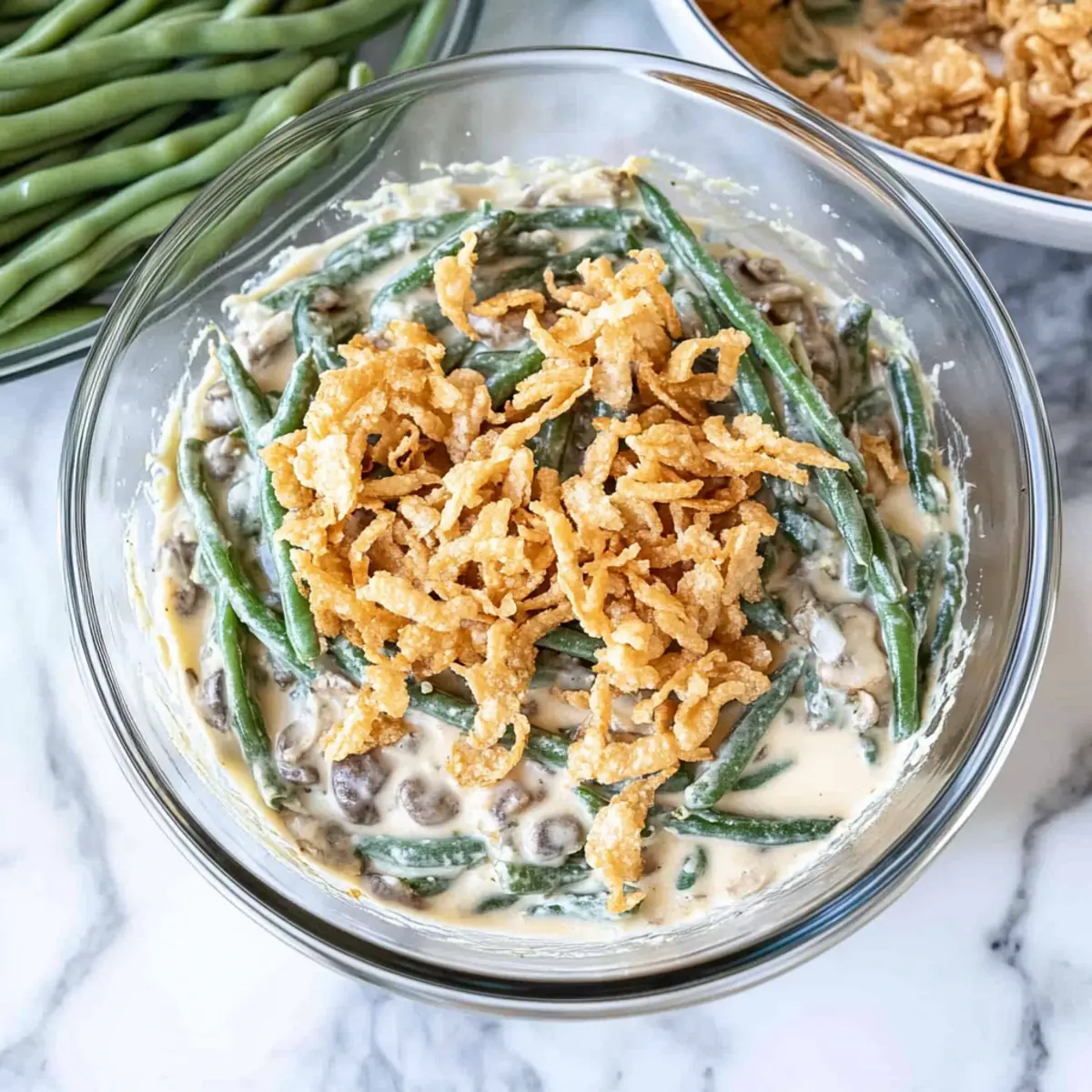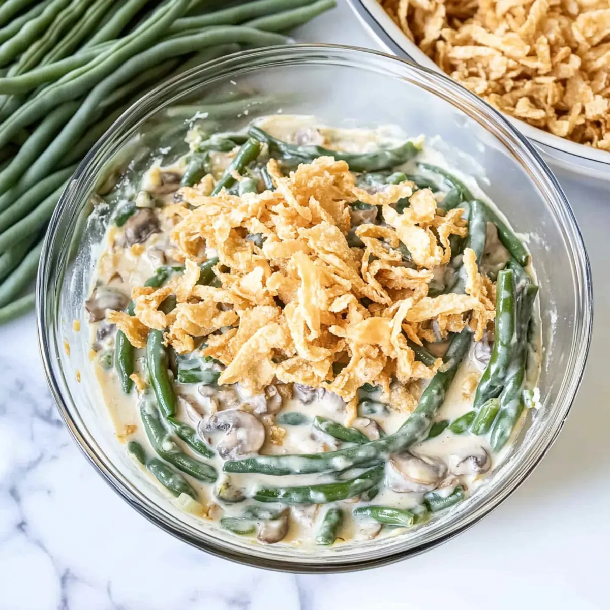 As I rummaged through my recipe box, I stumbled upon a nostalgic treasure: Classic Green Bean Casserole. The very idea of this iconic dish evokes cozy gatherings and holiday happiness, where crunchy fried onions give a satisfying pop over creamy, tender green beans swimming in rich mushroom sauce. This recipe is not only a snap to prepare—making it perfect for both busy weeknights and festive feasts—but it also delivers that beloved comfort food vibe we all crave during family dinners. Even better, it’s a crowd-pleaser; trust me, your guests will be going back for seconds! Are you curious about how to recreate this classic dish and bring a taste of home to your table? Let’s dive into the details! Why is this casserole a must-try? Comforting Nostalgia: This green bean casserole evokes memories of family gatherings and cozy holiday dinners, making it an essential dish for any festive table. Effortless Preparation: With just a few ingredients and simple steps, you’ll have a delicious side dish ready in no time, ideal for busy weeknights or holiday feasts. Versatile Fun: Whether you serve it at Thanksgiving or alongside a Sunday roast, this dish pairs seamlessly with any main course, like a Hashbrown Breakfast Casserole. Delicious Textures: The creamy mushroom sauce combined with crunchy fried onions offers a delightful contrast that will keep everyone coming back for more. Make-Ahead Magic: Prepare it a day in advance and store the topping separately for a hassle-free cooking experience when entertaining guests! Green Bean Casserole Ingredients For the Casserole • Frozen Cut Green Beans – The primary vegetable; use canned or fresh beans for a twist. • Condensed Cream of Mushroom Soup – The creamy base that brings rich flavor; feel free to use a low-fat version if preferred. • Milk – Adds creaminess; substitute with almond or oat milk for a dairy-free option. • Soy Sauce – Boosts umami flavors; omit for a healthier alternative or use liquid aminos. • Black Pepper – Adds a touch of heat; adjust according to your taste for the perfect kick. • Seasoned Salt – Brings in an extra layer of flavor; you can use regular salt as a substitute. For the Topping • Crispy Fried Onions – Offers a crunchy texture on top; consider homemade fried onions for a fresher option or omit for fewer calories. Step‑by‑Step Instructions for Classic Creamy Green Bean Casserole Step 1: Preheat the Oven Begin by preheating your oven to 350°F (175°C). This is essential to ensure your Classic Green Bean Casserole bakes evenly and becomes bubbly and golden. While the oven heats, gather your ingredients and prepare your baking dish by greasing it lightly to prevent sticking. Step 2: Prepare the Green Beans In a large pot, bring salted water to a boil and add your frozen cut green beans. Blanch them for 2-3 minutes until they are tender-crisp—bright green and just slightly tender to the bite. Once done, drain the beans well in a colander to remove excess water, allowing them to cool while you mix the sauce. Step 3: Make the Creamy Mixture In a large mixing bowl, combine the drained green beans with the condensed cream of mushroom soup, milk, soy sauce, black pepper, and seasoned salt. Stir well until all the ingredients are thoroughly mixed, creating a creamy and flavorful sauce that envelops the green beans perfectly. Step 4: Assemble the Casserole Transfer the green bean mixture into a greased 2-quart baking dish, spreading it evenly for consistent cooking. This step is crucial for helping your casserole to heat through evenly, ensuring that every bite is filled with deliciousness. Step 5: Bake the Casserole Place the baking dish in the preheated oven and allow the casserole to bake uncovered for 30-35 minutes. You’ll know it’s ready when you see bubbly edges and a slight golden hue on top, signaling a comforting, warm dish perfect for any gathering. Step 6: Add the Crunchy Topping After the initial baking time, carefully stir the casserole and add 1 cup of crispy fried onions on top. This addition will create a delightful crunch against the creamy base. Return the dish to the oven and bake for an additional 10 minutes until the onions are crispy and golden brown, enhancing the overall texture of the Classic Green Bean Casserole. Step 7: Serve and Enjoy Once baked, remove the casserole from the oven and let it cool for a few minutes before serving. This Classic Green Bean Casserole is best enjoyed warm alongside your favorite holiday dishes or a comforting Sunday supper, bringing joy and nostalgia to your table! Green Bean Casserole Variations & Substitutions Feel free to mix things up and make this classic dish your own with these tasty variations! Dairy-Free: Swap regular milk for almond or oat milk for a comforting casserole without dairy. Cheesy Twist: Mix in shredded cheddar cheese for a creamy texture and rich flavor you won’t resist. Extra Flavor: Add freshly sautéed mushrooms or minced garlic to the mixture for a flavor boost that complements the creamy sauce beautifully. Low-Carb: Use a cauliflower-based alternative instead of soup for a healthier, low-carb version without sacrificing taste. Spicy Kick: Stir in a dash of hot sauce or red pepper flakes for a delightful heat that will awaken your taste buds. Nutty Crunch: Garnish with toasted slivered almonds for a crunchy twist that adds depth and texture. Herb Infusion: Sprinkle in fresh herbs like thyme or rosemary for an aromatic touch that elevates the dish. Personal Touch: Make it your tradition! For a fun twist, integrate leftover turkey or ham bits for a heartier casserole experience. As you explore these variations, why not check out a delightful Chicken Waffle Casserole for a different take on comfort food? Or, if you’re in the mood for something sweet, you can try a delightful Buttermilk Pancake Casserole! The possibilities are endless! What to Serve with Classic Creamy Green Bean Casserole Creating the 