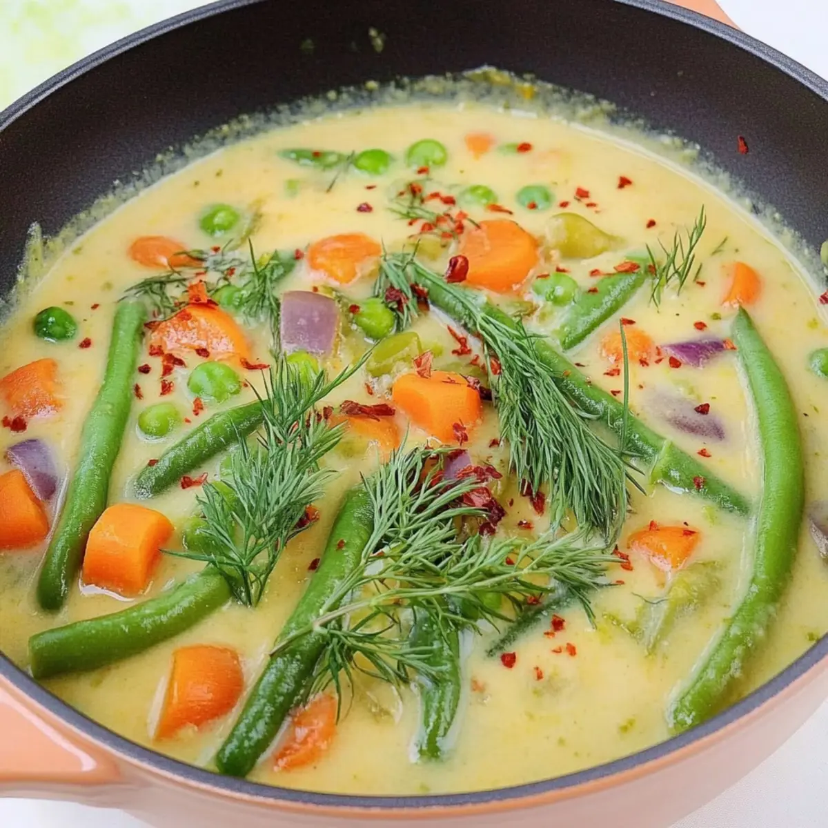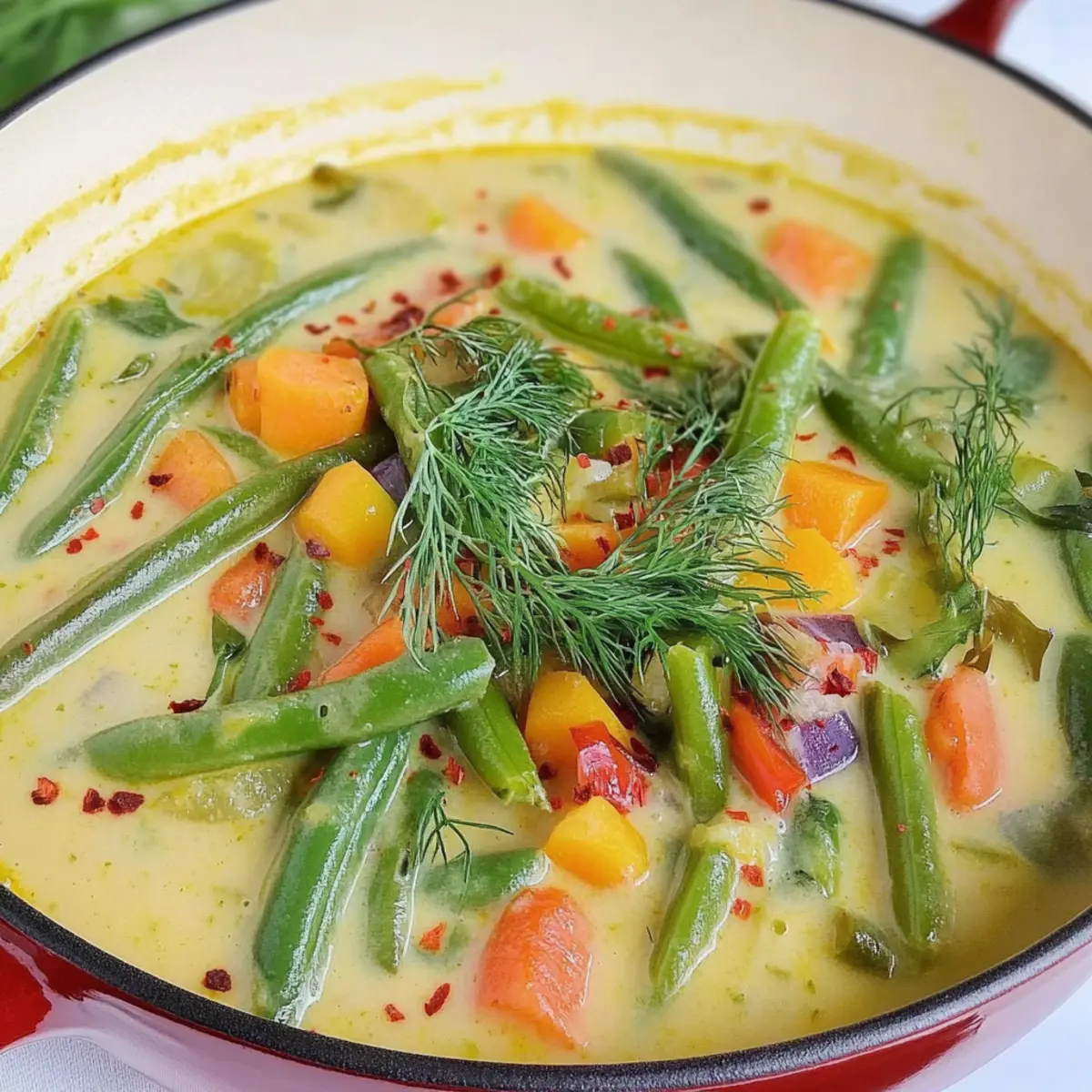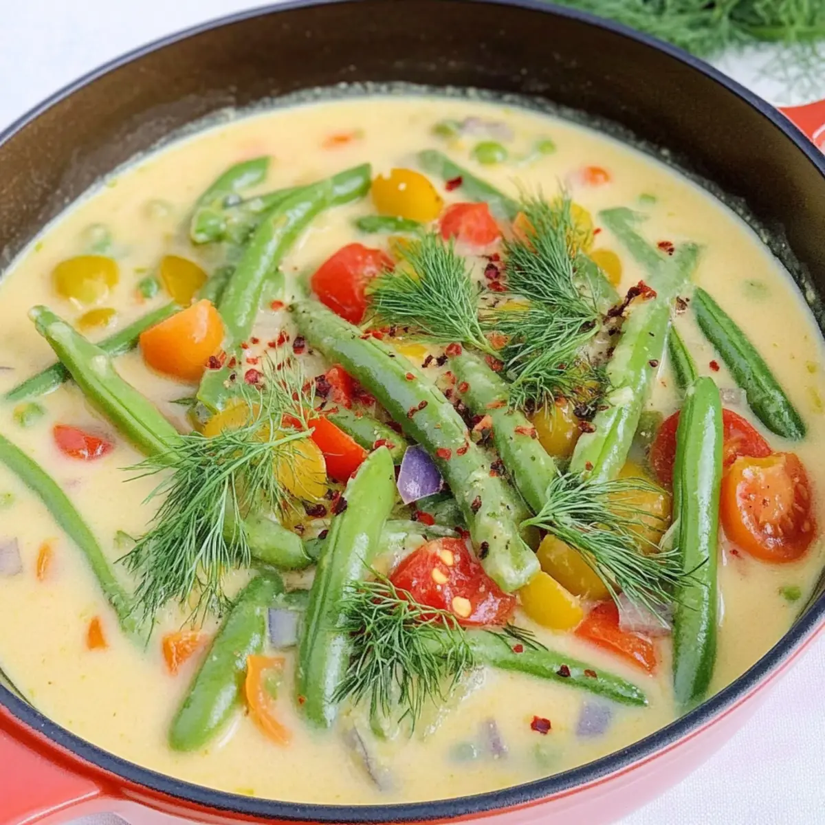 As the sun shines down and the garden begins to burst with fresh produce, I find myself reaching for a bowl of comfort that captures all that summer joy—Creamy Vegan Green String Bean Soup. This dish isn’t just a recipe; it’s a delightful blend of dill and garlic that brings back memories of warm evenings spent enjoying hearty meals with family. Packed with plant-based goodness, this green bean soup recipe is not only simple to whip up, but also a wholesome option that nourishes both body and soul. With its creamy texture and vibrant flavors, it’s the perfect solution for those days when you crave something light yet satisfying. Plus, it’s a fantastic way to keep your kitchen cool while savoring the taste of summer! What garden-fresh ingredients will you throw into your bowl today? Why Is This Soup So Irresistible? Comforting Flavor: The combination of dill and garlic creates a warm embrace of flavor that will transport you to a summer garden. Health Benefits: Packed with nutrients, this Creamy Vegan Green String Bean Soup is a delicious way to enjoy fresh vegetables while keeping your diet wholesome. Easy to Prepare: With minimal ingredients and straightforward steps, even beginner cooks can master this soup with ease. Versatile Uses: Enjoy it as a starter or a light main dish; it pairs beautifully with crusty bread or a fresh salad—perfect for those looking to upgrade their meals! Meal Prep Friendly: This soup stores beautifully, making it a convenient option for busy weeks or delightful make-ahead lunches. Every spoonful captures the essence of summer, making it the ideal dish for fulfilling your comfort food cravings while staying healthy! Green String Bean Soup Ingredients • Discover what makes this Green String Bean Soup so special! For the Soup Base Green (or Yellow) String Beans – Provides the main flavor and texture; fresh or frozen is perfect! Garlic (13 cloves) – Infuses the soup with robust flavor; adjust quantity for milder taste preferences. Whole Wheat Pastry Flour (4 tbsp) – Thickens this creamy soup; substitute with all-purpose or tapioca flour if needed. Vegetable Stock (3.5 cups, low sodium) – The foundational flavor; homemade or store-bought works great! For the Creamy Texture Cashew Milk (2.5 cups) – Delivers a divine creaminess; almond or oat milk can be swapped in as alternatives. For the Balanced Flavor Onion Powder (2 tsp) – Adds depth; use sautéed onions for a fresher flavor if you prefer! Bay Leaves (2) – Imparts aromatic notes; don’t forget to remove them before serving. Red Pepper Flakes – Provides a kick; adjust according to your spice tolerance. Sea Salt & Black Pepper – Essential for perfect seasoning; tailor to your taste! For the Freshness Fresh Dill (5 sprigs + 1/3 cup chopped) – Key to authentic flavor; substitute with tarragon or omit for a milder taste. Fresh Tomatoes (1 cup, chopped) – Introduces acidity and freshness; canned can be used if fresh isn’t available. For the Sweetness Carrot (1, sliced) – Adds natural sweetness and color; swap with parsnip or skip if desired. Optional Extras Nutritional Yeast (2 tbsp, optional) – Imparts a cheesy flavor and boosts nutrition; feel free to omit. Dive into these wholesome ingredients and prepare to create a mouthwatering Green String Bean Soup that warms both the heart and the stomach! Step‑by‑Step Instructions for Creamy Vegan Green String Bean Soup Step 1: Prepare Beans Begin by rinsing the green string beans under cool water, then trim the ends and snap them into smaller, bite-sized pieces. If desired, steam these pieces for about 3 minutes until bright green and slightly tender, enhancing their flavor and texture in the creamy vegan green string bean soup. Step 2: Sauté Garlic In a large pot over medium heat, add 2 tablespoons of olive oil or water, then toss in the crushed garlic cloves. Sauté for 4-5 minutes until the garlic is golden and fragrant, being careful not to burn it. Once done, remove the garlic and set it aside; this will infuse your soup with rich flavor. Step 3: Cook Carrots Next, in the same pot, add the sliced carrot along with a pinch of red pepper flakes. Sauté these for about 5 minutes, stirring occasionally, until the carrots soften slightly and begin to caramelize. The vibrant colors and aromas will set the stage for your comforting creamy vegan green string bean soup. Step 4: Combine Flour Mixture In a separate bowl, whisk together the cashew milk, low-sodium vegetable stock, onion powder, and whole wheat pastry flour until the mixture is smooth and free of lumps. Add this creamy mixture to the pot with the cooked carrots and stir well to combine for a luscious base in your green string bean soup. Step 5: Simmer Toss in the bay leaves, fresh dill, and the sautéed garlic, then bring the soup to a gentle simmer over medium heat. Allow it to simmer for about 10 minutes, stirring occasionally, until the soup thickens slightly and the flavors meld beautifully, creating a soothing warmth that fills your kitchen. Step 6: Add Beans Now, gently stir in the prepared green string beans, letting them simmer in the pot for an additional 10 minutes, or just until tender if you previously steamed them. You want to maintain their vibrant green color and snap while allowing their flavor to permeate the creamy vegan soup. Step 7: Finalize and Serve Finally, stir in the chopped fresh tomatoes to brighten the soup just before taking it off the heat. Adjust seasonings with sea salt and black pepper to taste, then serve your creamy vegan green string bean soup hot, garnished with extra dill and a sprinkle of red pepper flakes for that perfect finishing touch. Green String Bean Soup Variations Feel free to experiment and customize this delightful recipe to match your tastes and dietary needs! Leafy Greens: Substitute green beans with spinach or kale for added nutrition and a vibrant twist. Those greens will blend beautifully into the creamy base! He