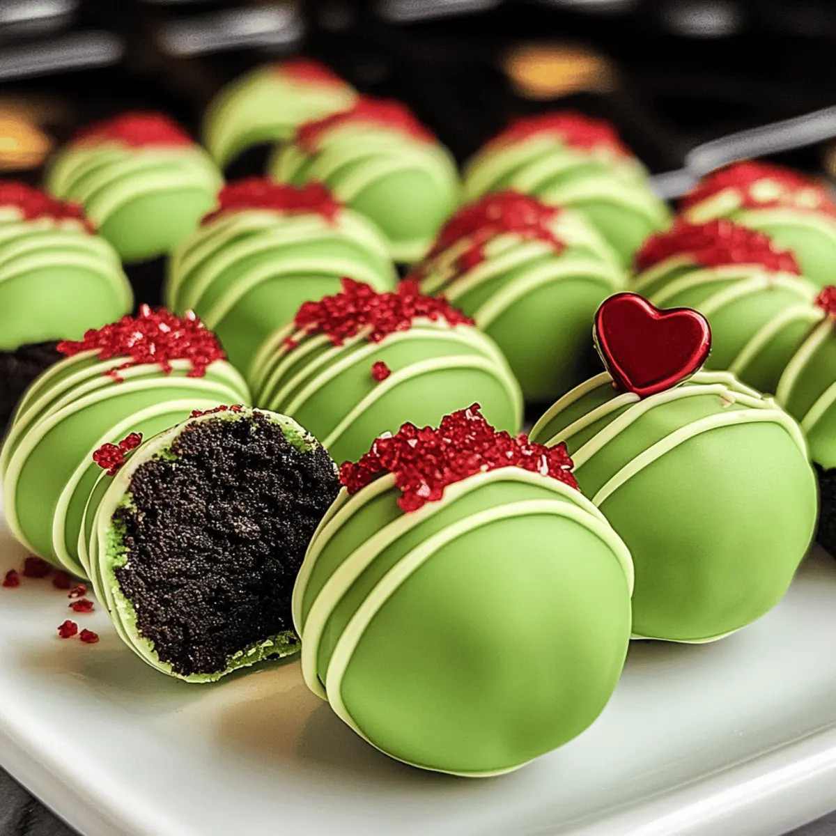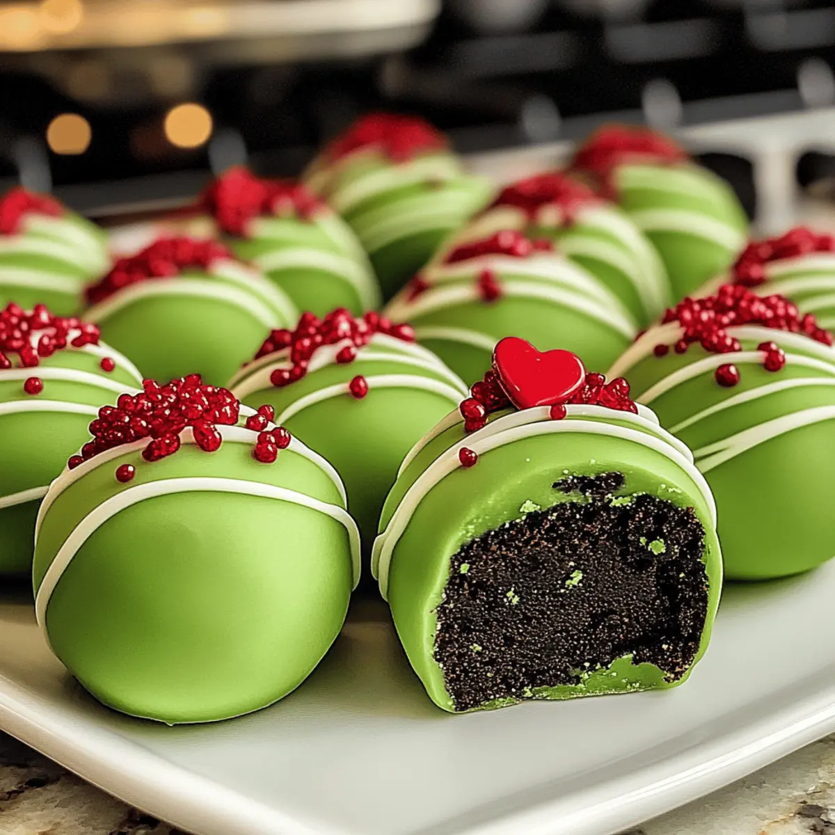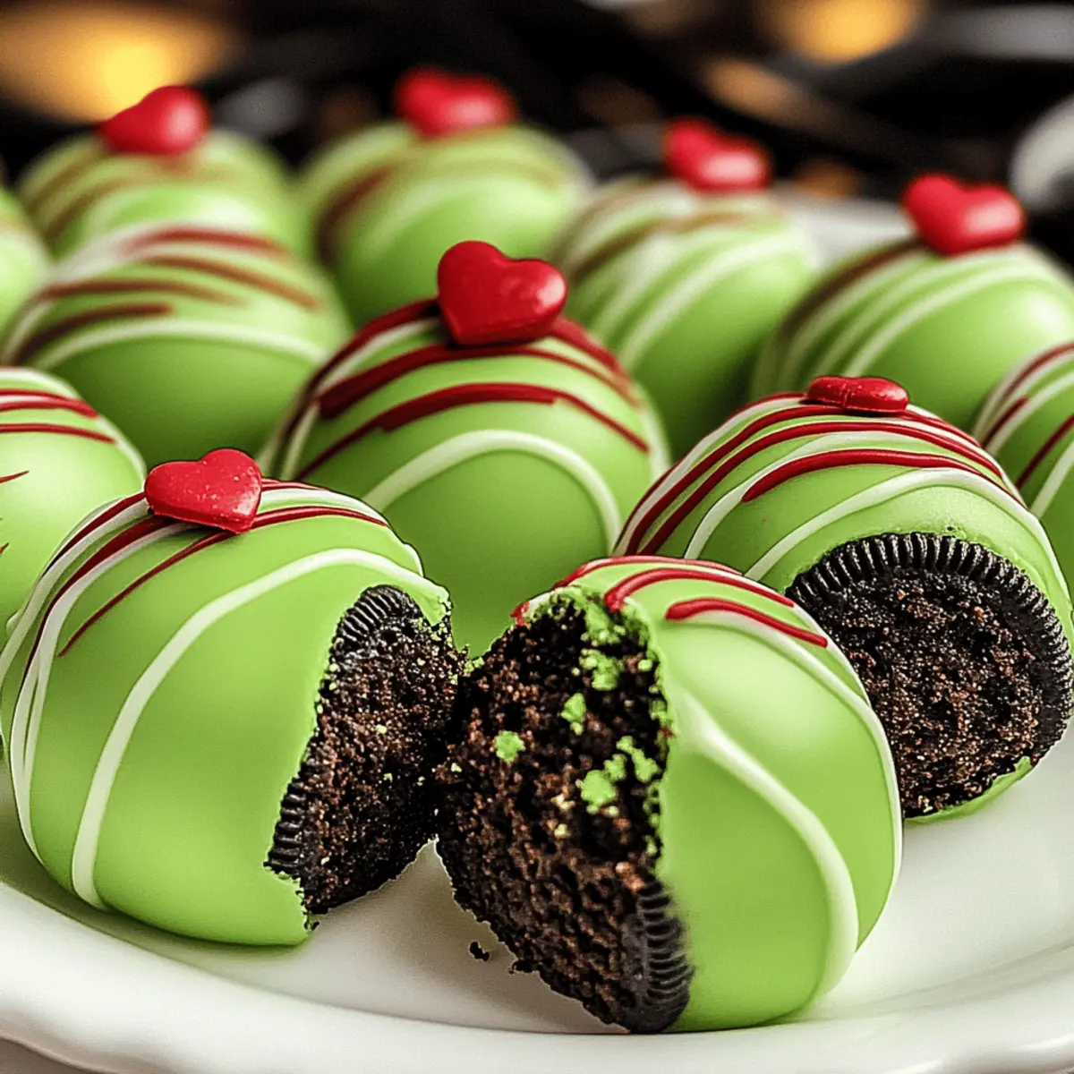 While gathering with friends and family, wouldn’t it be delightful to have a treat that captures the spirit of the season and sparks joy? Enter Grinch Oreo Balls, the festive no-bake dessert that’ll steal the show at any holiday gathering. These charming treats are not only quick to whip up, but they also present a bit of creative flair on your dessert table that everyone will appreciate. With a luscious red velvet Oreo base joined by a creamy filling and cloaked in a vibrant green candy coating, they’re as fun to make as they are to eat. Plus, with the option to switch up the Oreo flavors, you can tailor these delectable bites to suit your palate. Are you ready to bring a little holiday magic into your kitchen? Why are Grinch Oreo Balls a must-try? Festive Fun: These Grinch Oreo Balls capture the holiday spirit with their vibrant green coating and playful design, making them a delightful addition to any festive gathering. No-Bake Convenience: Perfect for those busy holiday moments, these treats require no baking, allowing you to spend more time with loved ones and less time in the kitchen. Creative Freedom: You can easily customize the flavor by using different Oreo varieties, from Peppermint to Golden Oreos, making each batch uniquely delicious. Crowd-Pleasing Appeal: With their charming looks and rich flavor, these treats are guaranteed to impress guests of all ages at your holiday parties. Quick Prep Time: Whip these up in a flash—ideal for last-minute additions to your dessert spread, while still being a showstopper like Chicken Piccata Meatballs! Sweet Memories: Making these treats can easily become a fun family tradition, allowing everyone to join in on the festive spirit while creating cherished memories during the holiday season. Grinch Oreo Balls Ingredients For the Balls Red Velvet Oreos – 24.4 ounces (approximately 44 cookies); these provide a unique flavor twist and form the base of the dessert. Substitution Note: Regular Oreos can be used for a different flavor. Cream Cheese – 8 ounces, softened; acts as a binder to create a smooth, creamy filling that holds the balls together. Substitution Note: Mascarpone cheese can be used for a creamier texture. For the Coating Light Green Candy Melts – 15 ounces; forms the vibrant green coating that gives the Grinch Oreo Balls their festive look. Substitution Note: White chocolate with green food coloring can be used if candy melts are unavailable—ensure to use oil-based color to avoid seizing. For the Decoration Red Candy Hearts – These fun decorations symbolize the Grinch’s growing heart, adding a thematic touch. Substitution Note: Specialty chocolate decorations can be used instead. Step‑by‑Step Instructions for Grinch Oreo Balls Step 1: Prepare the Baking Sheet Start by lining a large baking sheet with parchment paper. This will prevent the Grinch Oreo Balls from sticking as they cool and set. Having the baking sheet ready will streamline the process, allowing you to easily transfer the rolled balls once they are shaped. Step 2: Crush the Oreos In a food processor, pulse the Red Velvet Oreos into fine crumbs, which should take about 30 seconds. If you don’t have a food processor, you can place the cookies in a zip-lock bag and crush them with a rolling pin until finely ground. The crumbs will serve as the base for the creamy filling in your Grinch Oreo Balls. Step 3: Mix Ingredients In a large mixing bowl, place the softened cream cheese and blend it with an electric mixer until you achieve a smooth consistency, about 2 minutes. Gradually add the crushed Oreo crumbs, mixing until well combined and the mixture is uniform and easy to handle. This creamy filling will bring richness to your Grinch Oreo Balls. Step 4: Shape the Balls Using a 1.5-inch cookie scoop, portion out the Oreo and cream cheese mixture, rolling each scoop into a smooth ball with your hands. Place the shaped balls on the prepared baking sheet, ensuring they’re spaced about an inch apart. This step is key in forming the characteristic look of your Grinch Oreo Balls. Step 5: Chill Transfer the baking sheet with the Oreo balls to the refrigerator and chill them for at least 2 hours. This chilling time allows the balls to firm up, making them easier to coat later. You’ll know they’re ready when they feel solid to the touch. Step 6: Melt the Candy Coating While waiting for the Oreo balls to chill, prepare the candy coating. In a double boiler, melt the light green candy melts or microwave them in 30-second intervals, stirring in between, until smooth and fully melted. The consistency should be fluid for an even coating on the Grinch Oreo Balls. Step 7: Dip the Balls Remove the chilled balls from the refrigerator. Dip each ball into the melted green candy, using a fork to ensure a complete coating while letting the excess drip off. Return the coated balls to the baking sheet to set, giving them a vibrant green finish that embodies the holiday spirit. Step 8: Decorate As the candy coating starts to set but is still pliable, drizzle some extra melted candy over the dipped balls for a decorative touch. Immediately place a red candy heart on top of each ball to symbolize the Grinch’s growing heart. This final touch makes your Grinch Oreo Balls fun and festive! Step 9: Set and Store Place the tray back in the refrigerator to let the candy coating set completely, which should take about 30 minutes. Once set, store the Grinch Oreo Balls in an airtight container in the refrigerator, where they’ll stay fresh and delicious for up to one week. Make Ahead Options These Grinch Oreo Balls are perfect for busy home cooks who want to save time while still impressing guests! You can prepare the Oreo and cream cheese mixture up to 24 hours in advance, rolling them into balls and storing them in the refrigerator until you’re ready to coat. This allows the flavors to meld beautifully while ensuring they hold their shape. When it’s time to finish, sim