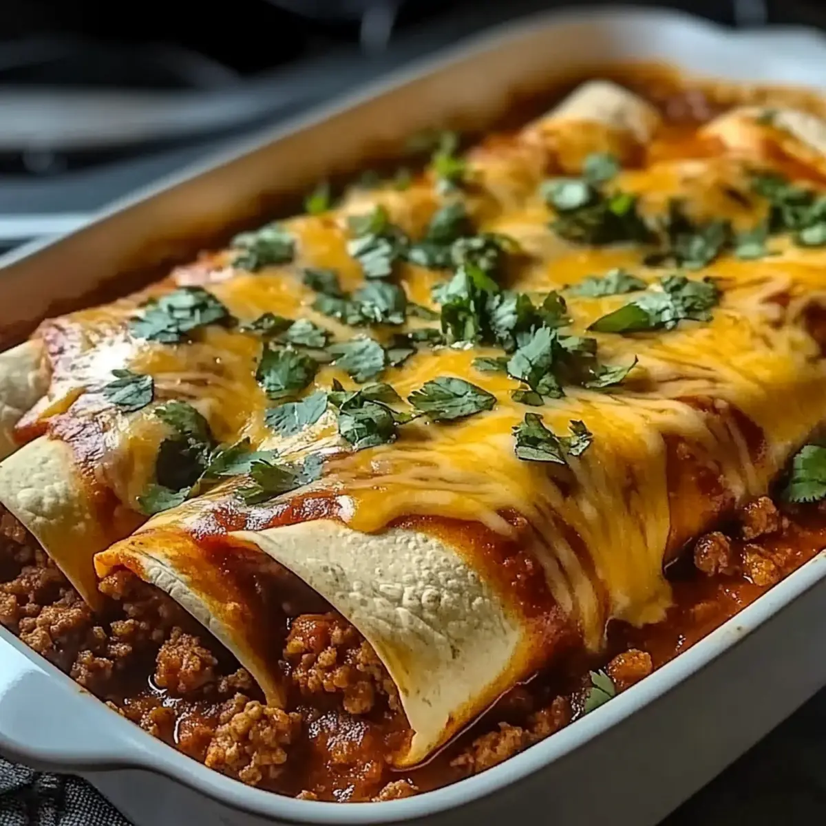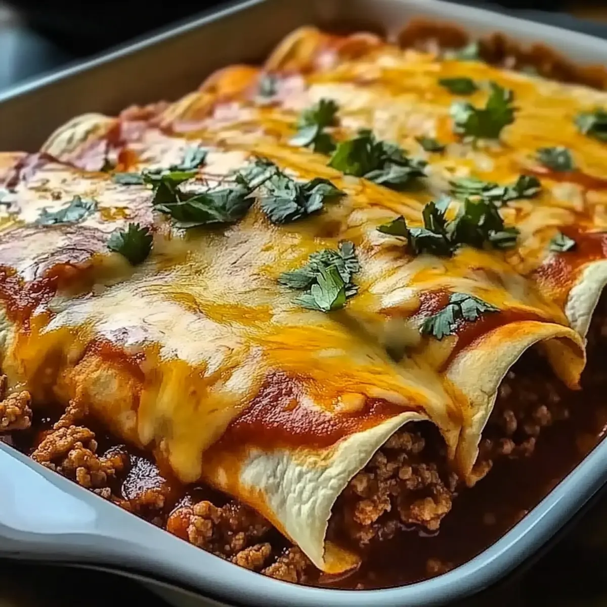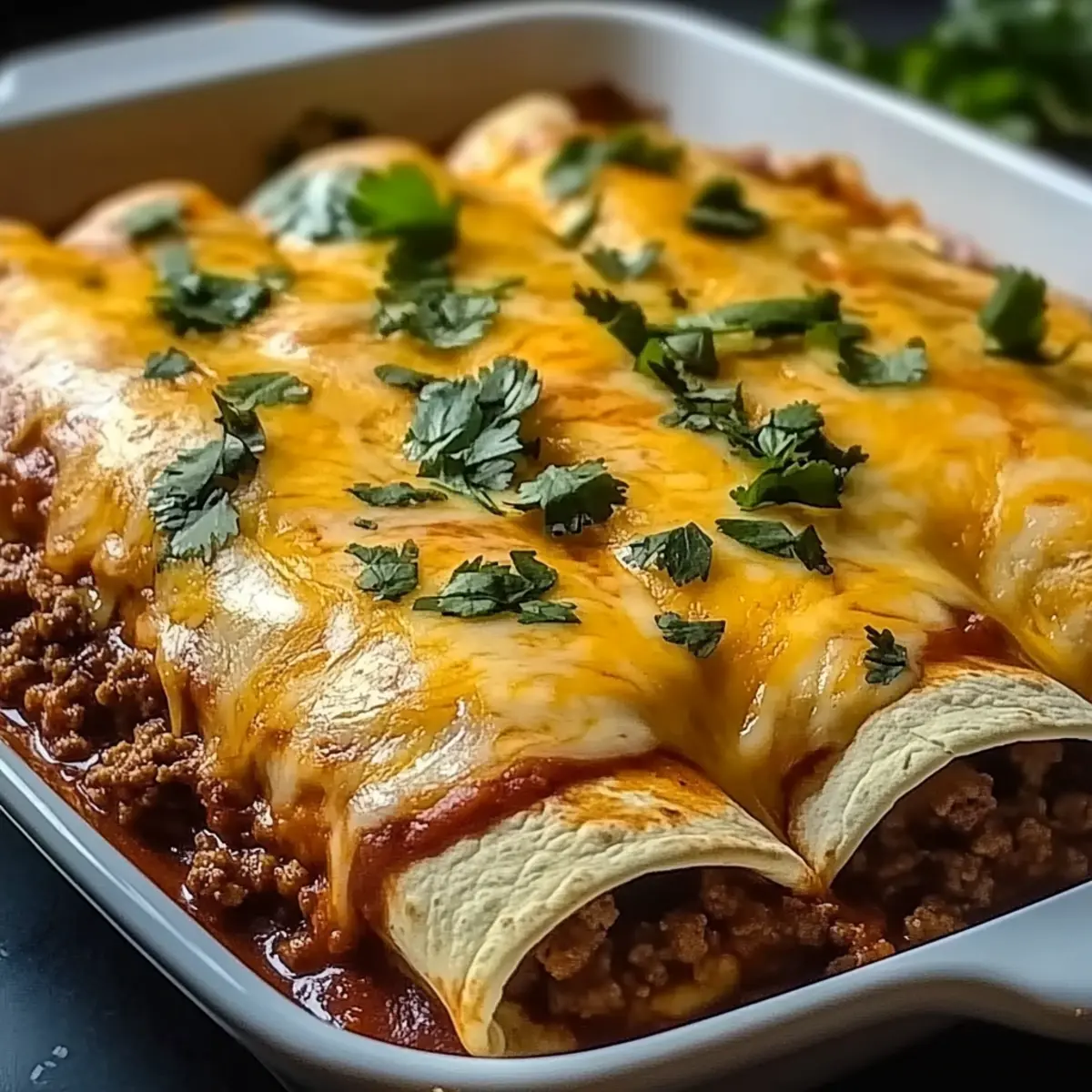 As I stood in front of my kitchen counter, the scent of sautéed onion and garlic simmered, transporting me straight to a vibrant Mexican market. That’s when I knew it was time for a family favorite: Ground Beef Enchiladas. This dish perfectly combines comfort food and quick dinner preparation, making it an ideal choice for both busy weeknights and festive gatherings. Soft tortillas cradle a savory blend of seasoned ground beef, melting cheese, and zesty enchilada sauce, all ready to bring smiles to the dinner table. Whether you’re a seasoned chef or just beginning your culinary journey, these enchiladas are sure to capture your heart (and taste buds). Ready to dive into this delicious adventure? Let’s get cooking! Why are Ground Beef Enchiladas a must-try? Comforting, these enchiladas bring joy to any table, wrapping you in a warm embrace of flavors. Quick preparation means you can whip them up on busy weeknights without sacrificing deliciousness. Versatile options abound, allowing easy swaps for proteins or veggies to suit your taste. Plus, who can resist that melty cheese on top? Serve with a side of Mexican rice or refried beans for a complete meal, or explore other hearty dishes like Slow Cooker Beef for your next family dinner! Enjoy the authentic taste of Mexico that’s sure to become a staple in your home. Ground Beef Enchiladas Ingredients • Ready to create your own scrumptious Ground Beef Enchiladas? Here’s everything you’ll need! For the Filling Ground Beef – Provides the main flavor and protein; lean ground turkey makes a lighter option. Onion – Enhances the depth of flavor; shallots offer a milder taste if preferred. Garlic – Adds aromatic flavor; fresh garlic is best, but garlic powder is a quick substitute. Chili Powder – A key seasoning that elevates the dish’s flavor profile; adjust based on your spice tolerance. Cumin – Adds warmth to the filling; another spice to tweak for personal preference. For the Tortillas Tortillas – Soft flour tortillas are traditional; corn tortillas bring an authentic taste (warm them up to prevent cracking). For the Sauce and Topping Enchilada Sauce – Essential for flavor; consider making a homemade version from tomato sauce mixed with spices. Cheese – A combination of cheddar and Monterey Jack creates a rich, creamy topping; low-fat cheese can make it healthier. Optional Add-ins Vegetables – Add bell peppers or spinach to the beef mixture for added nutrition and flavor. Protein Substitutes – Swap ground beef for shredded chicken or beans for a delicious vegetarian option. Step‑by‑Step Instructions for Ground Beef Enchiladas Step 1: Prep the Filling In a large skillet over medium heat, brown 1 pound of ground beef for about 5–7 minutes until fully cooked and no longer pink. Drain excess fat, then add 1 chopped onion and 2 cloves of minced garlic, sautéing for another 3–4 minutes until the onion becomes translucent. Stir in 2 tablespoons of chili powder and 1 teaspoon of cumin until fragrant, about 1 minute, enhancing the rich flavor for your Ground Beef Enchiladas. Step 2: Warm the Tortillas To ensure the tortillas are pliable, heat them individually in a dry skillet over medium-low heat for about 15-20 seconds on each side until soft. Alternatively, wrap them in a damp paper towel and microwave for 30 seconds. This prevents cracking when rolling, setting the stage for perfect Ground Beef Enchiladas that are both sturdy and delicious. Step 3: Assemble Enchiladas Take one warmed tortilla and place a generous spoonful of the beef mixture along the center. Roll the tortilla tightly around the filling, then place it seam-side down in a greased 9×13 inch baking dish. Repeat the process with the remaining tortillas and filling, creating a beautiful layer of enchiladas, ready to be covered in sauce. Step 4: Add Sauce and Cheese Pour a cup of enchilada sauce evenly over the assembled tortillas, ensuring each inch is coated for moisture and flavor. Sprinkle a generous cup of shredded cheese, such as a blend of cheddar and Monterey Jack, over the top, creating a gooey cheese layer. This step takes your Ground Beef Enchiladas to the next level, promising a bubbly and delightful finish. Step 5: Bake Preheat your oven to 350°F (175°C). Bake the enchiladas in the preheated oven for 20–25 minutes or until the cheese is melted, bubbly, and slightly golden. You’ll know they’re ready when the aroma fills your kitchen, inviting everyone to the table. This baking time ensures a delightful, comforting dish that captures the essence of Mexican flavors. Step 6: Serve and Enjoy After baking, allow the Ground Beef Enchiladas to cool slightly for about 5 minutes. This resting period helps set the cheese and makes serving easier. Garnish with fresh cilantro or a dollop of sour cream if desired, adding a burst of freshness to your comforting dish. Dive in and relish the warm, savory goodness that this family-favorite enchilada recipe offers! Make Ahead Options These Ground Beef Enchiladas are perfect for meal prep enthusiasts looking to save time on busy weeknights! You can prepare the filling (ground beef, onions, garlic, and spices) up to 24 hours in advance; simply refrigerate it in an airtight container. The assembled enchiladas can be prepped and placed in the baking dish, then covered tightly and stored in the fridge for up to 3 days. To maintain their quality, avoid adding cheese to the top until just before baking to keep it fresh and melt-in-your-mouth delicious. When ready to serve, sprinkle cheese over the enchiladas, bake them at 350°F (175°C) for 20–25 minutes, and enjoy restaurant-quality results with minimal effort! Expert Tips for Ground Beef Enchiladas Preheat the Dish: Ensure your baking dish is preheated before assembling to help achieve a bubbly, golden top. Avoid Soggy Tortillas: Don’t overfill your tortillas with the ground beef mixture, as this can lead to sogginess. Use Fresh Ingredients: