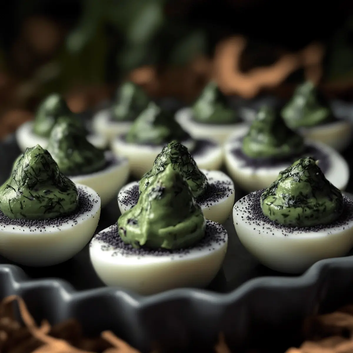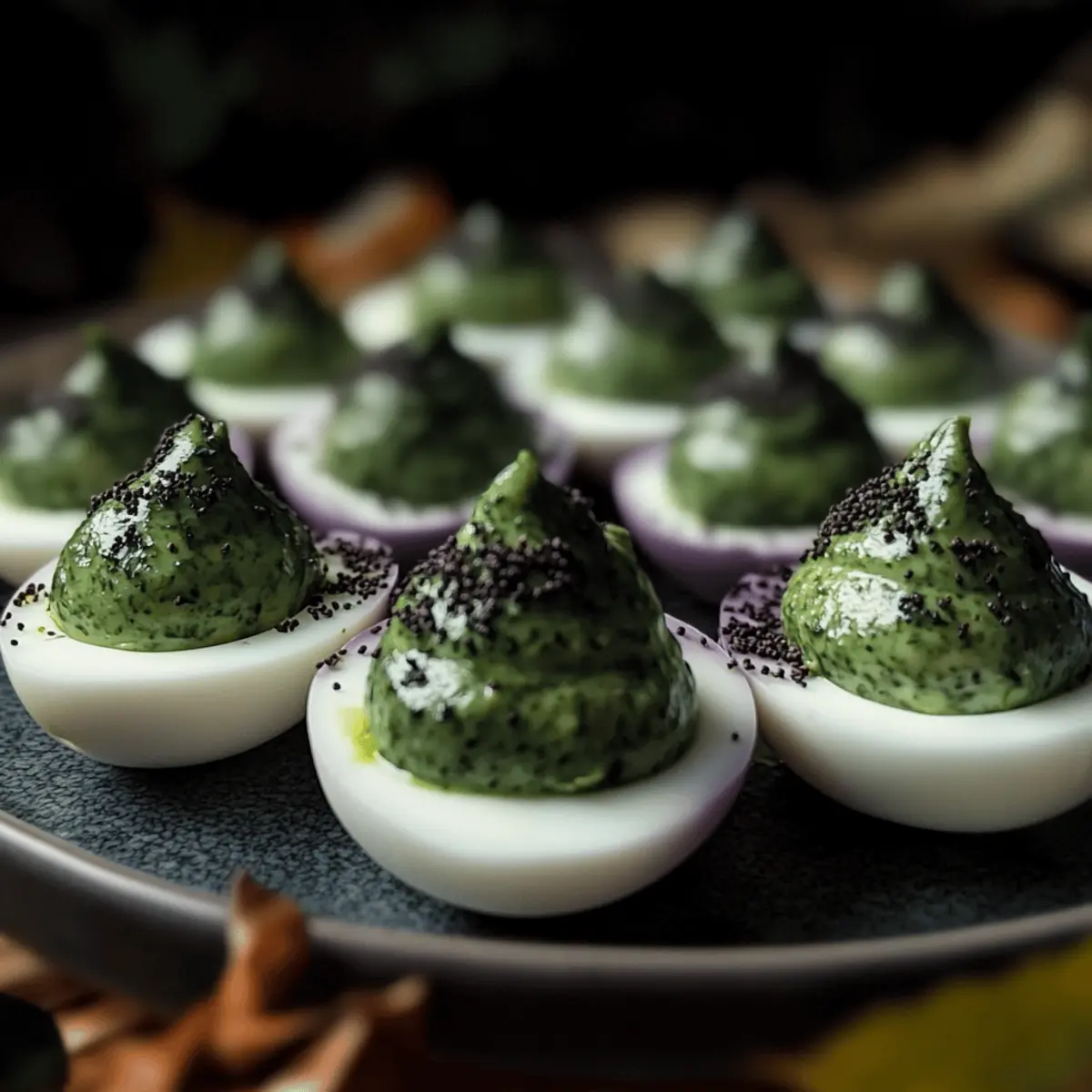 As the crisp autumn air sets in and Halloween creeps closer, I can’t help but think of playful culinary scares to delight my friends at our spooky gatherings. Enter these Naturally Dyed Halloween Deviled Eggs, affectionately dubbed Swamp Eggs—an eerie yet delicious twist on a classic favorite. The vibrant crackled appearance is sure to spark curiosity while the creamy garlic and dill filling is a guaranteed crowd-pleaser, making them both visually striking and incredibly tasty. Plus, they’re vegetarian-friendly and a fun way to explore natural dyes, swapping out artificial colors for fresh ingredients like blueberries and chlorophyll. Ready to impress your guests with these frightful delights that don’t skimp on flavor? Let’s dive into the recipe and bring some Halloween magic to your kitchen! Why Are These Halloween Deviled Eggs Unique? Eerie yet delicious: These Swamp Eggs elevate the classic deviled egg to new spooky heights, combining frightening aesthetics with a mouthwatering garlic and dill filling. Naturally dyed using fresh ingredients enhances their appeal while eliminating artificial colors. Easy to make: This recipe is straightforward, perfect for both beginner cooks and seasoned chefs looking to impress. Vegan-friendly options make it versatile for all guests, accommodating various dietary needs. Visually stunning, they’re a conversation starter at any Halloween gathering, ensuring your appetizer stands out without losing flavor. Pair them with creepy garnishes to enhance the festive atmosphere! Halloween Deviled Eggs Ingredients • Dive into spooky flavors! For the Egg Base Large Eggs – Essential for a protein-packed base, making up the heart of your deviled eggs. For the Natural Dye Frozen Blueberries – These provide a vibrant purple hue; swap with blackberries for a different shade. Hot Water – Activates the dyeing process, ensuring rich colors. Distilled White Vinegar – Boosts dye intensity and preserves your eggs; apple cider vinegar can substitute if needed. For the Filling Egg Yolks – The creamy center of your filling, providing richness. Mayo – Adds lusciousness; try vegan mayo for a plant-based alternative. Liquid Chlorophyll – A unique natural dye for green; use spinach puree as a substitute for a vibrant effect. Salt – Enhances flavors; adjust to your personal taste. Black Pepper – Adds mild heat; freshly cracked is best for flavor. Minced Fresh Dill – Imparts a fresh herbaceous note; substitute with chives or parsley if desired. Minced Fresh Chives – Provides a mild onion flavor; more dill or green onions can also work. Garlic – Delivers depth and flavor; opt for garlic powder if you’re in a hurry. For the Garnish Poppy Seeds – A decorative finish; feel free to omit if unavailable. These Halloween Deviled Eggs not only excite the palate but also create a visually enchanting experience suitable for any festive gathering! Step‑by‑Step Instructions for Naturally Dyed Halloween Deviled Eggs Step 1: Hard‑Boil the Eggs Begin by placing the large eggs in a saucepan and covering them with cold water until fully submerged. Bring the water to a rolling boil over medium-high heat, then cover the pan and turn off the heat. Let the eggs sit in the hot water for 12–14 minutes. Once done, transfer the eggs to an ice bath to cool completely, making peeling easier and preventing the eggs from cracking. Step 2: Prepare the Dye While the eggs are cooling, create your natural dye for the Halloween Deviled Eggs. In a blender, combine the frozen blueberries with 1 cup of hot water and 1 tablespoon of distilled white vinegar. Blend until smooth, then strain the mixture through a fine sieve to eliminate any solids. You should have a vibrant purple dye ready for soaking the eggs; set it aside. Step 3: Soak the Peeled Eggs Once the eggs have cooled and are properly peeled, it’s time to soak them in the dye. Place the peeled eggs into a bowl and pour the blueberry dye over them until they’re fully submerged. Allow the eggs to soak for 10–30 minutes, checking periodically for your desired color intensity. The longer the soak, the richer the purple hue that coats your Swamp Eggs. Step 4: Create the Crackled Effect After the eggs have achieved the desired hue, remove them from the dye and gently tap each egg against a hard surface to create small cracks on the shell. Return the cracked eggs to the dye for an additional 5 minutes to allow the color to seep into the cracks. This will give them an eerie, veiny effect that’s perfect for your Halloween gathering. Step 5: Make the Filling In a mixing bowl, carefully remove the egg yolks from the soaked egg whites and mash them using a fork. Stir in 3 tablespoons of mayo, 1 teaspoon of liquid chlorophyll, and season with salt, black pepper, minced dill, chives, and crushed garlic to taste. Mix until smooth and creamy—this filling will provide a delicious contrast to the spooky appearance of your Halloween Deviled Eggs. Step 6: Fill the Egg Whites Fill the crackled egg whites with your creamy yolk mixture. You can do this simply with a spoon for a rustic look or use a piping bag for the perfect presentation. Fill each egg generously, allowing the filling to pile slightly above the edges for an enticing and inviting appearance that will make everyone eager to grab a Swamp Egg. Step 7: Garnish and Serve For the final touch, sprinkle poppy seeds over the filled eggs for a bit of crunch and a festive flair. Arrange your Naturally Dyed Halloween Deviled Eggs on a serving platter, and consider pairing them with fun garnishes like creepy olives or spooky-shaped crackers. Chill them until ready to serve, ensuring they maintain their eerie appearance and creamy flavor. Halloween Deviled Eggs Variations & Substitutions Feel free to get creative with these Halloween deviled eggs and make them your own with exciting twists and substitutes! Vegan Version: Swap the mayo with silken tofu blended until cream