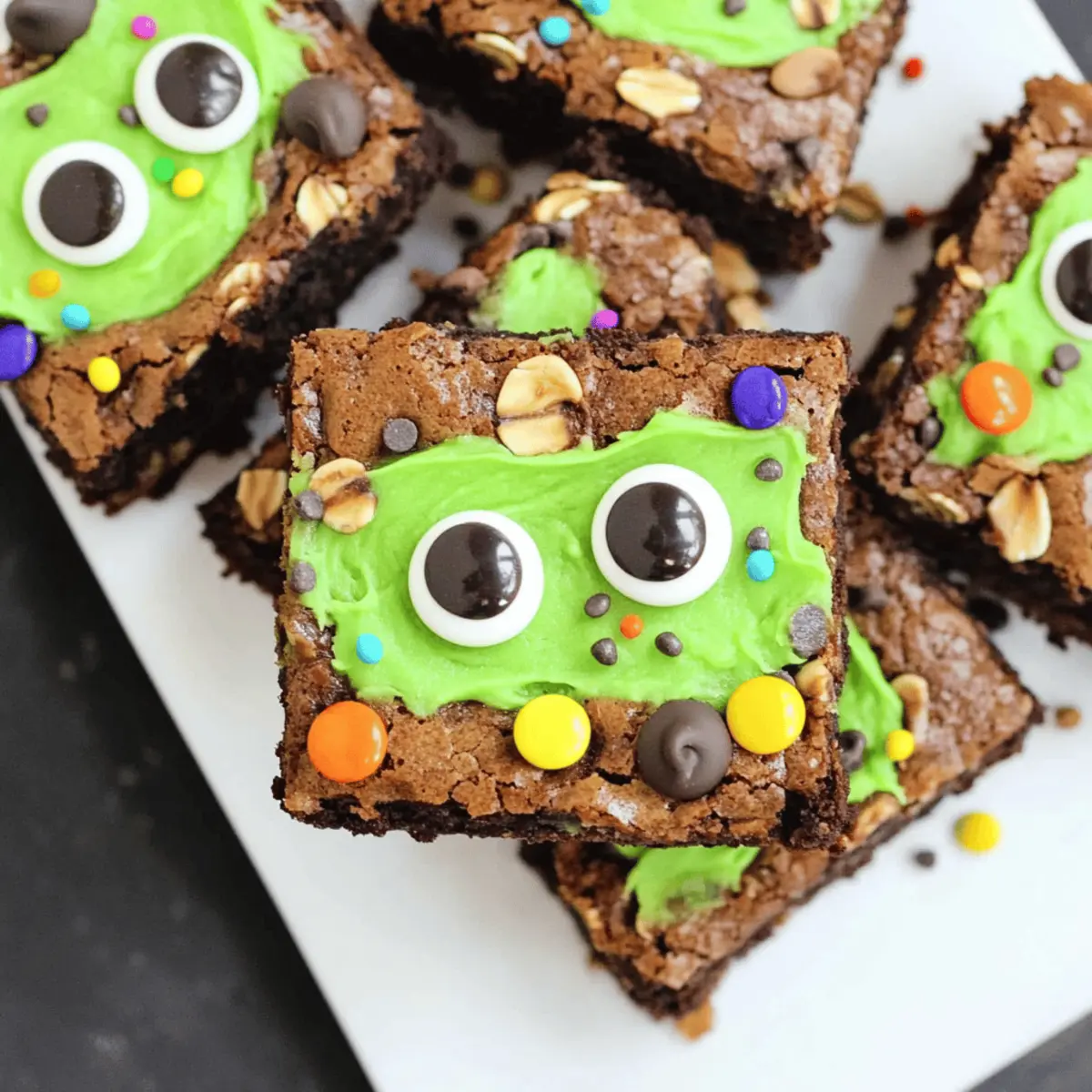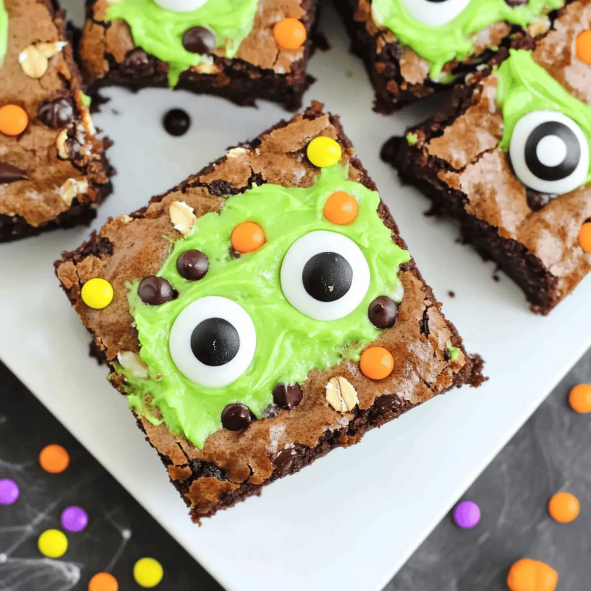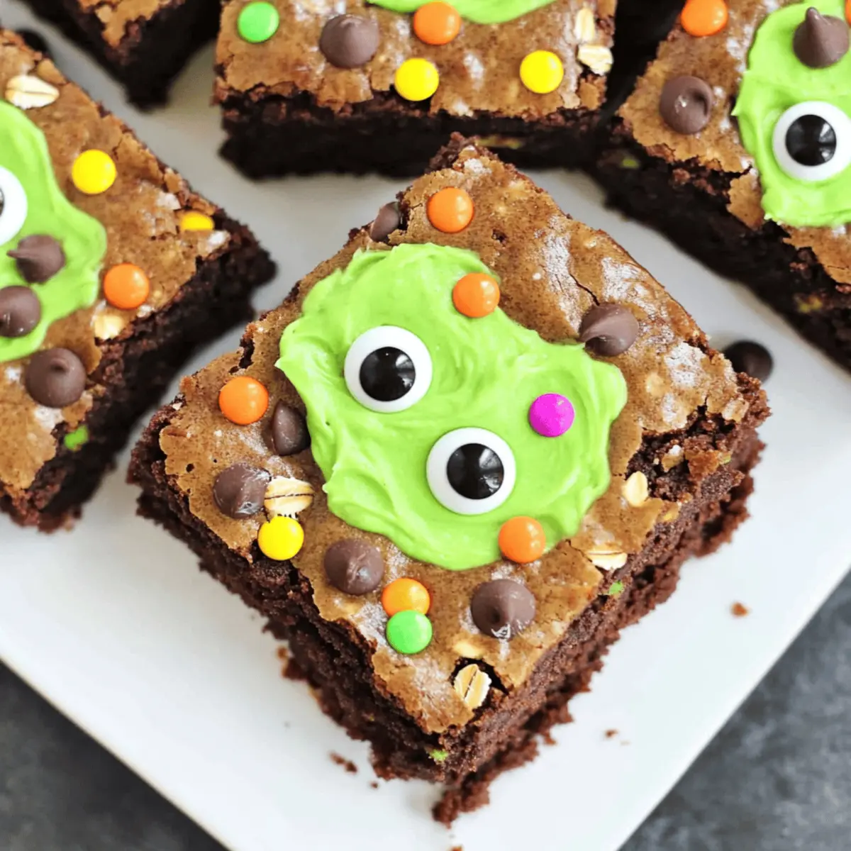 The air is crisp, and the hint of autumn fills your kitchen as you dive into a baking adventure. There’s something enchanting about creating treats that aren’t just delicious but also delightfully festive, and these Halloween Monster Brownies are the perfect way to celebrate! These fudgy brownies, packed with rich chocolate flavor, transform into playful monsters topped with creamy, vibrant frosting and whimsical candy eyes. What’s more, they come together in no time, making them an ideal choice for busy gatherings or fun-filled Halloween parties. Trust me, these brownies will be the talk of the celebration, ensuring smiles from all ages. So, ready to whip up a batch that’s not only a feast for the eyes but a treat for the taste buds? Let’s get baking! Why Are These Brownies So Special? Fudgy Delight: These Halloween Monster Brownies are irresistibly moist and rich, delivering a chocolate experience that melts in your mouth. Easy to Make: With simple ingredients and straightforward steps, you’ll have these delectable treats ready for your spooky celebrations in no time. Endless Creativity: Transform them with your favorite toppings! Whether you stick with the playful frosting and candy eyes or opt for a drizzle of chocolate, the choice is yours. Crowd Pleaser: Perfect for parties, these brownies not only taste fantastic but also become the centerpiece of your Halloween spread. They’re sure to spark joy and laughter among kids and adults alike! No Waste: Any leftovers can easily be stored for later, so you can enjoy that fudgy goodness beyond Halloween. If you’re curious about more festive ideas, be sure to check out our easy Halloween treats! Halloween Monster Brownies Ingredients For the Brownie Base • Brownie Mix – Key base for rich flavor; consider using two boxes for a larger batch. • Creamy Peanut Butter – Adds richness and depth; can substitute with any nut butter. • Unsalted Butter – Provides moisture and a tender crumb; ensure it’s at room temperature for easy mixing. • Light Brown Sugar – Contributes sweetness and moisture; can substitute with dark brown sugar for a deeper flavor. • Granulated Sugar – Balances the richness; use cane or caster sugar. • Eggs – Binds ingredients together; for vegan option, try flax eggs. • Pure Vanilla Extract – Enhances flavors; vanilla paste is a suitable substitute. • All-Purpose Flour – Gives structure; for gluten-free, substitute with a 1:1 flour blend. • Baking Soda – Helps the brownies rise slightly; baking powder can be an alternative but in smaller quantity. • Kosher Salt – Balances sweetness; sea salt can be used. • Quick Cooking Oats – Adds texture and chewiness; rolled oats are an acceptable substitute. • Miniature Chocolate Chips – Increases chocolaty goodness; substitute with white chocolate chips for a twist. For the Decoration • Halloween Sprinkles – Fun decoration for theme; can use any seasonal sprinkles or edible glitter. • Candy Eye Decorations – Makes the brownies festive; use chocolate chips or mini marshmallows if unavailable. For the Frosting • Confectioners Sugar – Base for frosting; critical for achieving a creamy texture. • Heavy Whipping Cream – Gives a silky consistency to the frosting; can replace with half and half for lighter frosting. • Neon Green Gel Food Coloring – Used to create a spooky look; omit for a classic white frosting. These Halloween Monster Brownies are a true delight, mixing chocolatey goodness with festive fun—perfect for your next spooky celebration! Step‑by‑Step Instructions for Halloween Monster Brownies Step 1: Prepare the Oven and Pan Preheat your oven to 350°F (177°C) to ensure it’s ready for baking the Halloween Monster Brownies. Meanwhile, take a 9″ x 13″ baking pan and prepare it by spraying it with nonstick spray. For added safety, line the bottom with parchment paper, leaving some overhang on the sides to make it easier to lift the brownies out later. Step 2: Mix the Brownie Base Open the brownie mix boxes and follow the package instructions to create a rich batter. Pour it evenly into the prepared baking pan, using a spatula to spread it out smoothly. You’ll want the mixture to reach the corners of the pan, creating an even layer that will rise beautifully in the oven. Step 3: Create the Peanut Butter Mixture In a stand mixer, combine the creamy peanut butter and unsalted butter, beating them on medium speed until fluffy—about 2 minutes. Once combined, gradually add in the light brown and granulated sugars, mixing well before incorporating the eggs and pure vanilla extract. Continue to blend until the mixture appears creamy and well combined. Step 4: Combine Dry Ingredients In a separate bowl, whisk together the all-purpose flour, baking soda, kosher salt, quick cooking oats, and miniature chocolate chips. This dry blend will add texture and depth to your brownies. Once mixed, gently fold it into the peanut butter mixture until just combined; be careful not to overmix, as the Halloween Monster Brownies need to stay fudgy. Step 5: Layer the Peanut Butter Mixture Drop spoonfuls of the peanut butter mixture over the brownie batter in the baking pan. Use a butter knife or spatula to gently swirl the two mixtures together, creating a marbled effect. Sprinkle Halloween sprinkles and candy eye decorations on top to bring some fun and festivity before baking. Step 6: Bake the Brownies Place the pan in the preheated oven and bake for 25-30 minutes. The brownies are ready when a toothpick inserted into the center comes out with a few moist crumbs. Keep an eye on them; overbaking can lead to a less fudgy texture, which you definitely don’t want for your Halloween Monster Brownies! Step 7: Cool the Brownies Once baked, remove the pan from the oven and let the brownies cool in the pan for at least 30 minutes. This step is crucial, as cooling helps the brownies set properly. After cooling, use the 