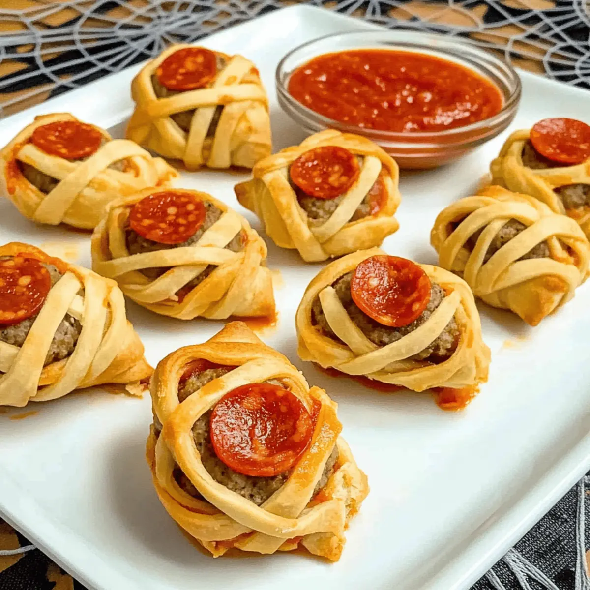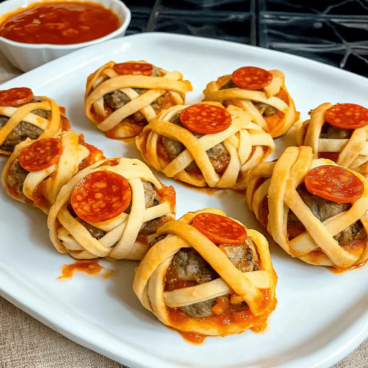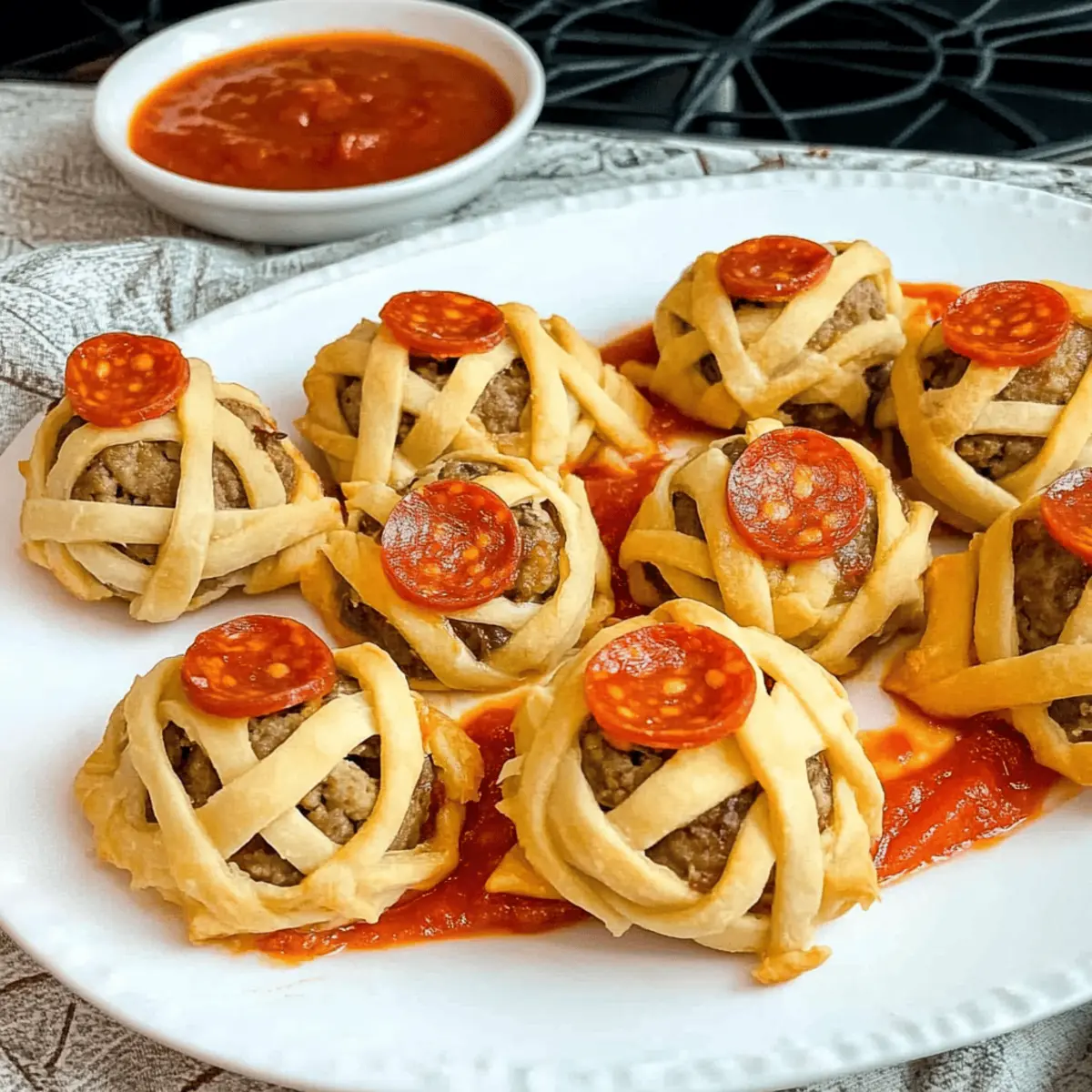 These Halloween Mummy Meatballs are a spooky delight that everyone will enjoy, featuring pre-cooked meatballs wrapped in flaky dough.