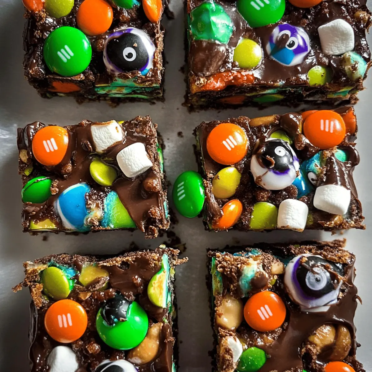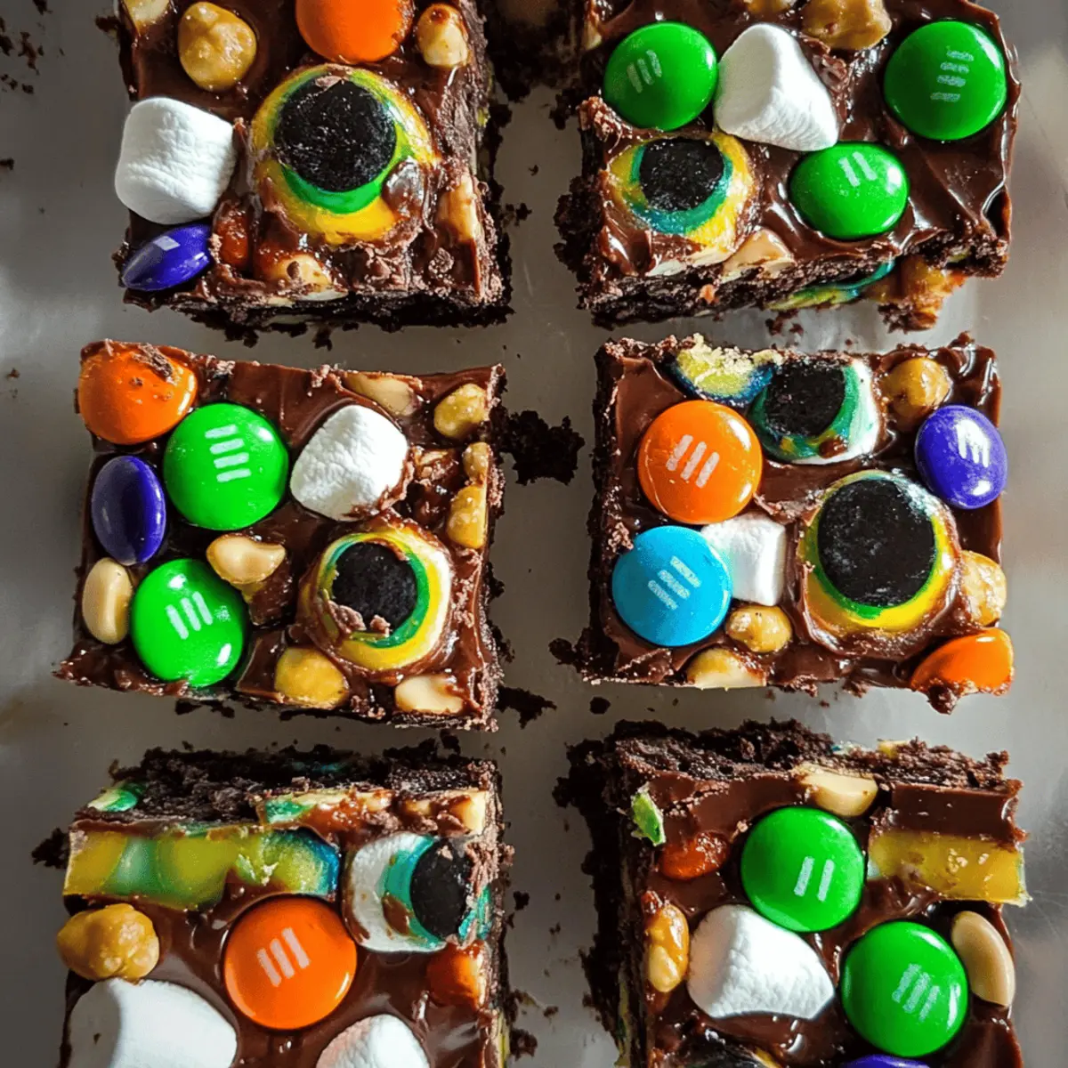 A delicious debate filled the room when my friends and I were brainstorming Halloween treats—what would be more irresistible than a sweet, no-bake dessert that’s as fun to make as it is to eat? Enter the Easy No-Bake Halloween Rocky Road Slices! These delightful bars are a heavenly mix of textures and flavors, combining crunchy peanuts, soft marshmallows, and vibrant candies into one perfect slice. Not only are they a crowd-pleaser, but they also come together in no time, making them an ideal choice for busy days or last-minute celebrations. Plus, the best part? They’re incredibly adaptable—go wild with leftover Halloween candies or favorite nuts! What unique twist will you add to your Halloween Rocky Road Slices? Why Are These Rocky Road Slices So Special? Simplicity: No baking required, making these treats a breeze for any skill level. Texture Galore: Enjoy the delightful crunch of roasted peanuts paired with soft marshmallows and gooey chocolate. Customizable: Feel free to experiment with different candies or nuts; your imagination is the only limit! Kid-Friendly Fun: Perfect for engaging the little ones in the kitchen, creating memories while crafting spooky snacks. Crowd-Pleaser: These slices will be the star of your Halloween gatherings, enticing everyone with their playful appearance and delicious flavor. When you’re ready to impress, consider serving them alongside other festive treats like my Halloween Sugar Cookies for a complete spread! Halloween Rocky Road Slices Ingredients • Get ready for a spooky delight! For the Chocolate Layer Semi-sweet Chocolate Chips – This forms the decadent base, but feel free to swap in dark chocolate for a richer flavor. Butter – Provides richness and smoothness; margarine works well for a dairy-free option. For the Mix-ins Roasted Peanuts – Adds a satisfying crunch; substitute with your favorite nuts or omit for a nut-free version. Mini Marshmallows – These offer a lovely chewy texture; vanilla marshmallows can be used, or you can leave them out entirely. Mini Kit Kat Bars – Introduces a delightful crunch and chocolate flavor; mix in any chocolate candy you adore! Gummy Worms – Fun and creative; substitute with any candy you choose. M&M Candy (Ghoul mix) – Bright and colorful; optional, depending on your taste preferences. For Decoration Candy Melts – Use these for fun decorative swirls; any color fits the festive theme. Candy Eyes – Perfect for adding a creepy touch! Omit them if you’re not feeling spooky. Halloween Sprinkles – For that extra festive flair; totally optional based on your whims. Get ready to whip up your very own Halloween Rocky Road Slices! Step‑by‑Step Instructions for Halloween Rocky Road Slices Step 1: Prepare the Pan Begin by lining an 8 or 9-inch square pan with parchment paper, allowing the paper to overhang slightly for easy removal later. This step ensures your Halloween Rocky Road Slices easily lift out after chilling. Make sure the parchment fits snugly into the corners to create a smooth base for your delicious creation. Step 2: Melt the Chocolate In a microwave-safe bowl, combine butter and semi-sweet chocolate chips with a pinch of salt. Heat in the microwave at 30-second intervals, stirring between each interval, until the mixture is fully melted and smooth, about 1 to 2 minutes total. Once melted, remove from the microwave and let it cool slightly before adding your mix-ins. Step 3: Melt Candy Melts For an extra festive touch, melt candy melts in separate microwave-safe bowls. Heat them in 20-30 second intervals, stirring regularly until completely melted. This will give you beautiful swirls to incorporate into your Halloween Rocky Road Slices. Choose any color that matches the spooky theme for an enchanting visual appeal. Step 4: Prepare the Kit Kats While the chocolate mixture cools, cut the Mini Kit Kat bars into smaller pieces, about 1-inch segments. Set aside these delightful chocolate morsels; they will add a wonderful crunch and flavor to your slices. This step hints at the delicious layers awaiting in your Halloween Rocky Road Slices. Step 5: Combine the Mix-ins Once the chocolate base has cooled slightly, fold in the roasted peanuts and Kit Kat pieces. Stir gently to combine, ensuring everything is evenly distributed throughout the mixture. Next, add the mini marshmallows, mixing delicately to prevent them from melting. This combination creates a lovely texture in your Halloween Rocky Road Slices. Step 6: Pour into the Pan Carefully pour the rocky road mixture into your prepared pan, spreading it evenly to fill the corners. To create a visual treat, add dollops of the melted candy melts on top and swirl them in for a marbled effect. Smooth the surface with a spatula, making it ready for the final decorative touches. Step 7: Add the Decorations Before the mixture sets, decorate the top with gummy worms, M&Ms, and candy eyes. Feel free to let your creativity shine here, arranging them in a fun Halloween design. Place the decorations strategically, ensuring they won’t interfere with cutting the slices later, making your Halloween Rocky Road Slices as whimsical as they are tasty. Step 8: Chill and Slice Refrigerate the pan uncovered for at least 4 hours, or ideally overnight, until fully set. Once firm, remove the Rocky Road Slices from the pan using the parchment overhang. Cut into squares using a warm knife for cleaner edges, serving up these delightful treats at your Halloween festivities. Expert Tips for Halloween Rocky Road Slices Warm Knife Trick: Use a knife warmed in hot water for cleaner cuts. This prevents the chocolate from cracking and ensures perfect squares of your Halloween Rocky Road Slices. Chill Time: Allow the slices to chill overnight for the best texture. Rushing this step can lead to gooey, messy results. Decoration Placement: Strategically place decorations away from cut lines for intact slices. This keeps the fun visual appeal without compromisin