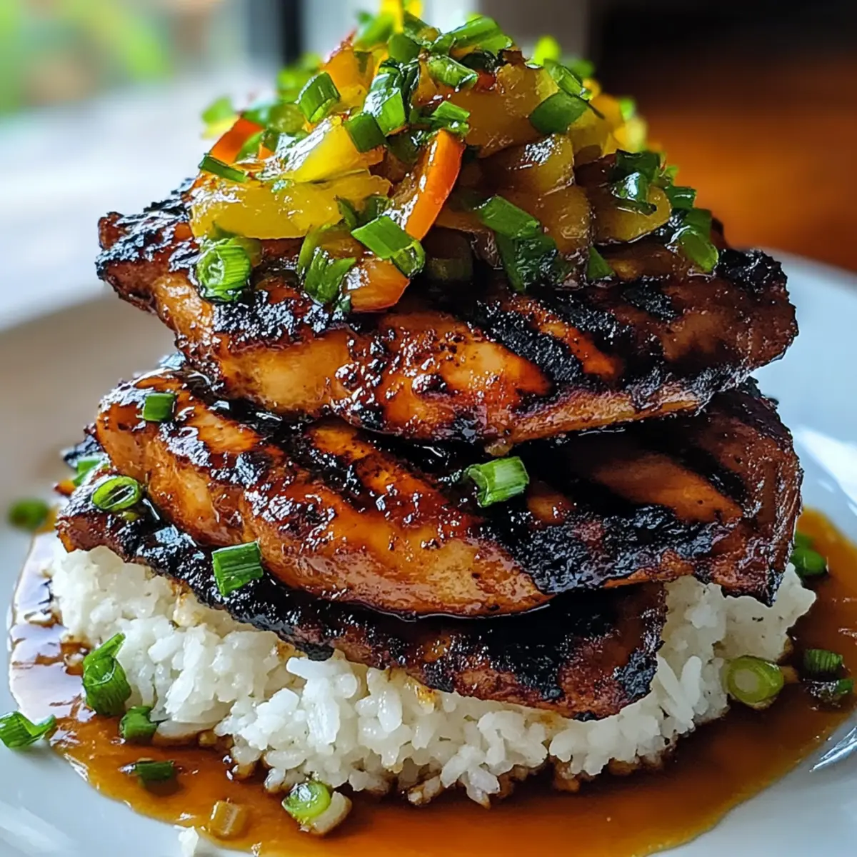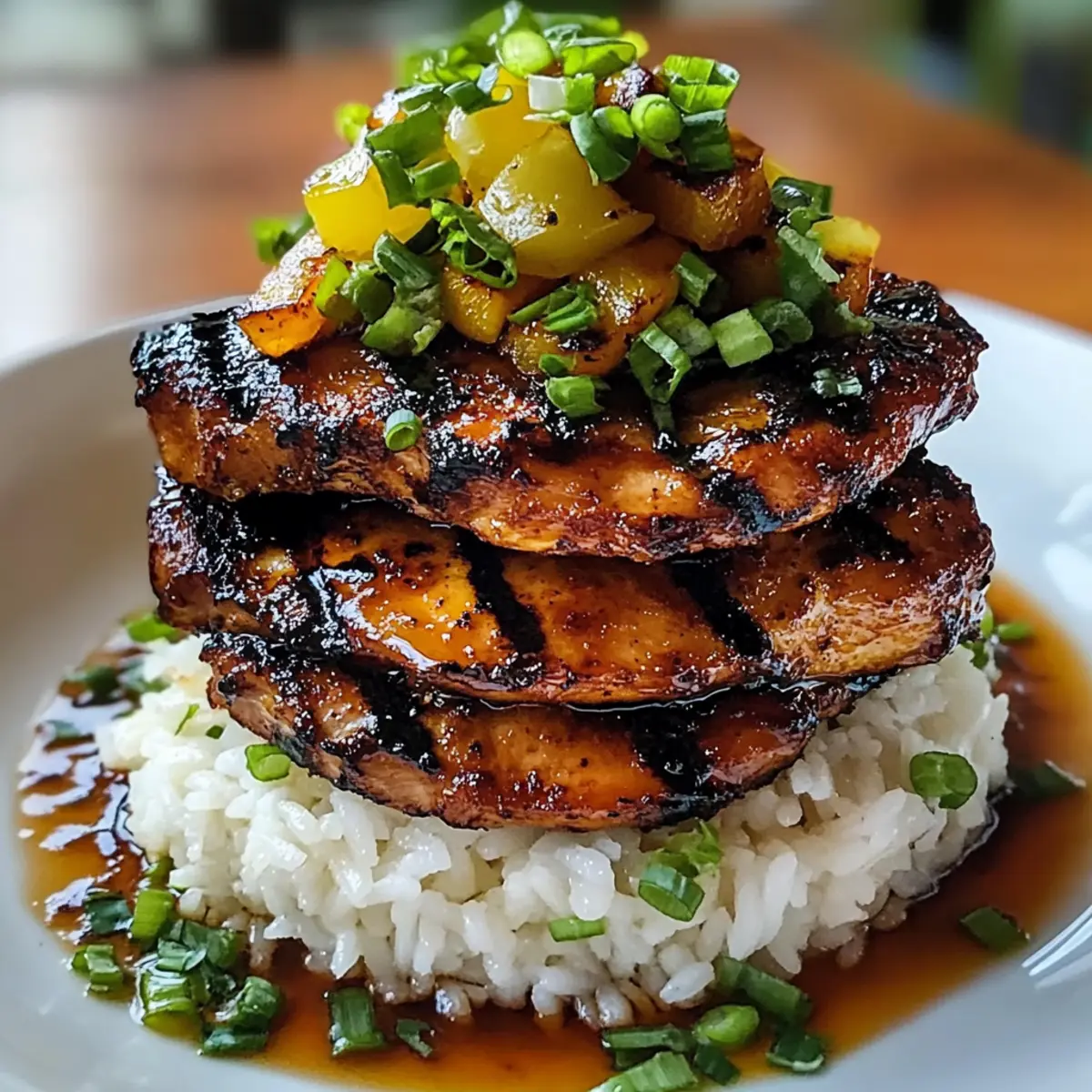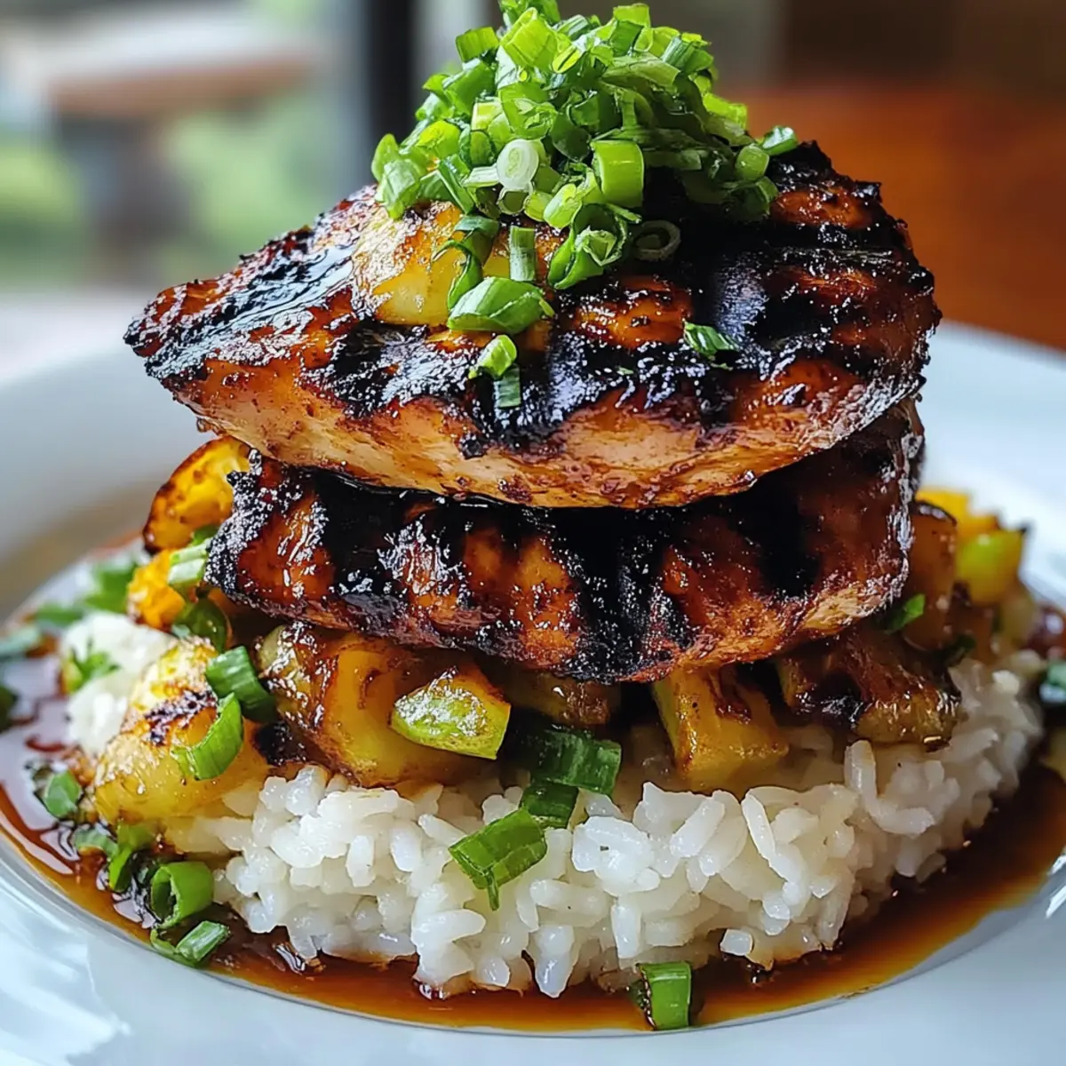 The enticing aroma of grilled chicken sizzling on the barbecue instantly transports me to a beautiful Hawaiian sunset, where every bite tells a story of island life. This Hawaiian Huli Huli Chicken Stack is a delightful way to bring a taste of the tropics right into your kitchen. With its marinated grilled chicken, vibrant vegetables, and a tangy sauce, this dish is not only quick to prepare—taking just 45 minutes—but it’s also gluten-free, making it a perfect choice for everyone at the table. Whether you’re looking to impress dinner guests or simply want a comforting meal after a busy day, this recipe offers the best of both worlds. Who can resist a colorful plate that captures the essence of Hawaiian cuisine? Let’s dive in and create a memorable dinner experience together! Why is Huli Huli Chicken So Popular? Tropical Flavors: The Hawaiian Huli Huli Chicken Stack bursts with flavors that transport you straight to the islands, combining sweet and savory in every bite. Quick to Prepare: With just 45 minutes to cook, it’s a lifesaver for busy evenings when you need a satisfying meal without the wait. Customizable Ingredients: Feel free to swap in your favorite seasonal vegetables or even adjust the protein—chicken breasts work beautifully too! Crowd-Pleasing Dish: Whether dinner for family or a gathering with friends, this dish’s vibrant presentation is sure to impress and satisfy everyone’s palate. Gluten-Free Goodness: Designed for all diets, enjoy with peace of mind knowing this meal is naturally gluten-free. If you love quick meals, check out our Garlic Butter Chicken and Potatoes Skillet for another delightful twist on dinner! Hawaiian Huli Huli Chicken Stack Ingredients For the Marinade • Soy Sauce – Provides umami flavor; use gluten-free soy sauce or tamari for a gluten-free option. • Brown Sugar – Adds sweetness and helps caramelize the chicken beautifully. • Ketchup – Contributes tanginess and moisture for a flavorful marinade. • Pineapple Juice – Introduces refreshing sweetness that balances flavors perfectly. • Minced Garlic – Enhances savory notes; fresh garlic is recommended for the best taste. • Grated Ginger – Adds warmth and a hint of spice; fresh ginger is preferable for flavor. • Sesame Oil – Infuses a nutty aroma and rich texture into the dish. • Black Pepper – Provides mild heat; adjust according to your spice preference. For the Chicken • Boneless, Skinless Chicken Thighs – The base protein chosen for its juiciness; chicken breasts can be used if monitored closely while cooking. For the Sides • Mixed Vegetables – Adds color and nutrition; customize with your family’s favorites. • Cooked Rice – Serves as the fluffy base for the dish, making it hearty and filling. Create this delightful Hawaiian Huli Huli Chicken Stack and bring a taste of the islands to your dinner table with ease! Step‑by‑Step Instructions for Hawaiian Huli Huli Chicken Stack Step 1: Prepare the Marinade In a mixing bowl, combine ½ cup soy sauce, ¼ cup brown sugar, ¼ cup ketchup, ½ cup pineapple juice, 2 minced garlic cloves, 1 tablespoon grated ginger, 2 tablespoons sesame oil, and a pinch of black pepper. Whisk together until the sugar fully dissolves, creating a fragrant marinade that will infuse your Hawaiian Huli Huli Chicken Stack with sweet and savory flavors. Step 2: Marinate the Chicken Add 1.5 pounds of boneless, skinless chicken thighs to the marinade, ensuring each piece is well-coated. Cover the bowl with plastic wrap and refrigerate for at least 30 minutes to deepen the flavors. If you have extra time, marinating for up to 2 hours will enhance the dish even further, allowing the chicken to soak up the delicious marinade. Step 3: Preheat the Grill While the chicken marinates, preheat your grill to medium-high heat, around 375°F to 400°F. If using a grill pan on the stovetop, heat it over medium-high heat. You want the grill hot enough to create those lovely grill marks on your chicken and achieve a perfect char for your Hawaiian Huli Huli Chicken Stack. Step 4: Grill the Chicken Remove the chicken from the marinade (discard the leftover marinade) and place it on the hot grill. Grill for about 6-7 minutes per side, checking for a deep golden-brown color. Use a meat thermometer to ensure each piece reaches an internal temperature of 165°F, indicating perfectly cooked, juicy chicken ready to be sliced. Step 5: Sauté the Vegetables In a large skillet, heat a splash of oil over medium heat. Add your choice of mixed vegetables such as bell peppers, zucchini, and snap peas. Sauté for about 5-7 minutes, stirring frequently, until the vegetables are tender yet retain a slight crunch. This vibrant addition will brighten your Hawaiian Huli Huli Chicken Stack and add nutritional value. Step 6: Assemble the Stack Once the chicken has rested for a few minutes, slice it into strips. Serve it over a bed of fluffy cooked rice, layering the sautéed vegetables on top. This colorful presentation captures the essence of Hawaiian cuisine and enhances the flavors, creating a stunning Hawaiian Huli Huli Chicken Stack that promises to delight everyone at the table. Hawaiian Huli Huli Chicken Stack Variations Feel free to get creative with your Hawaiian Huli Huli Chicken Stack—there’s always room for delicious customization! Chicken Breasts: Substitute chicken thighs for breasts for a leaner option. Just keep a close eye on grilling time for that perfect juicy bite. Seasonal Vegetables: Swap out mixed vegetables for your favorites—think bell peppers, snap peas, or asparagus for a personal touch! Embrace the produce of the season for added freshness. Overnight Marinate: For an even bolder flavor, marinate the chicken overnight. This allows the marinade to deeply infuse every juicy morsel, making it irresistibly delectable. Spicy Twist: Add a teaspoon of chili flakes to your marinade to give the dish a delightful kick. For heat lover