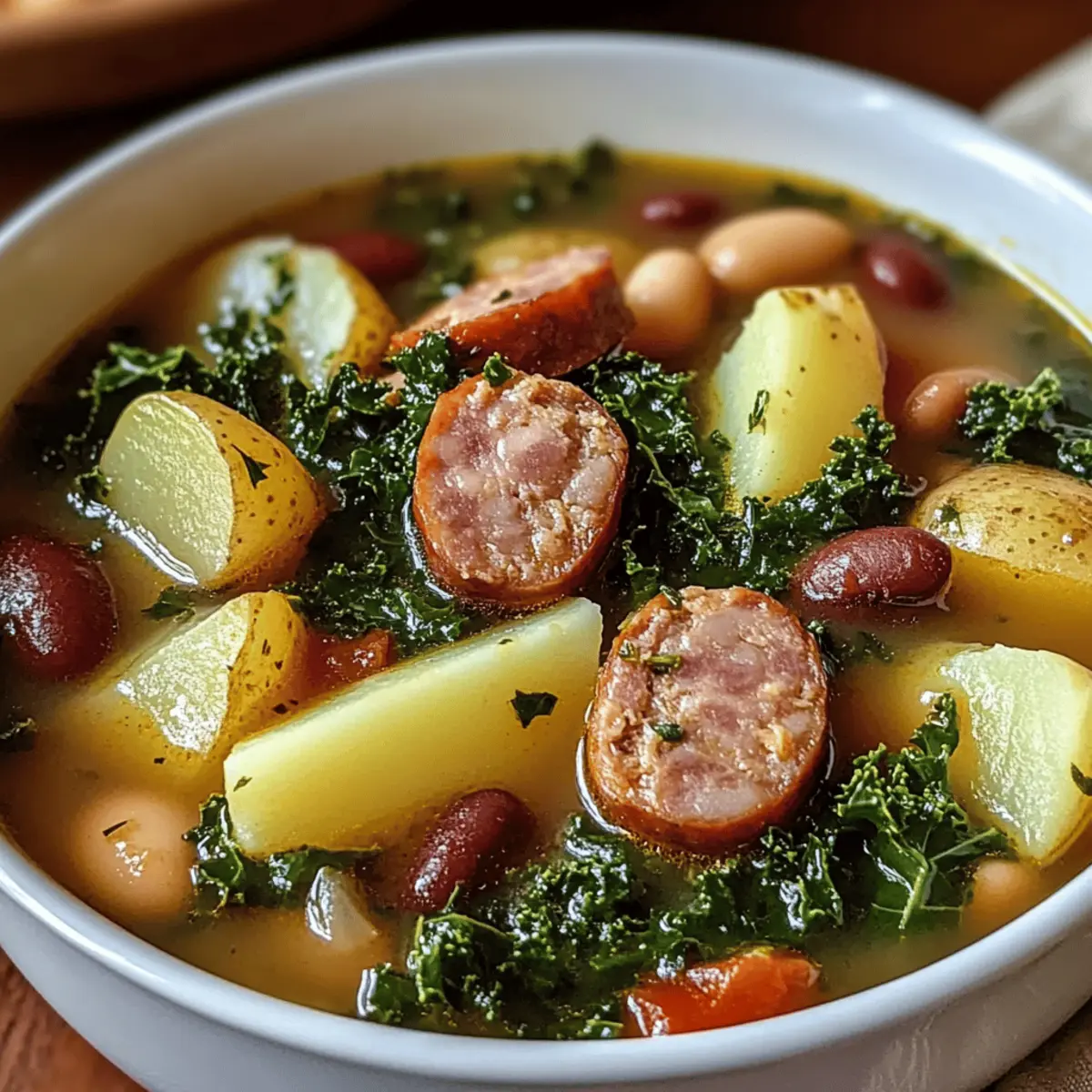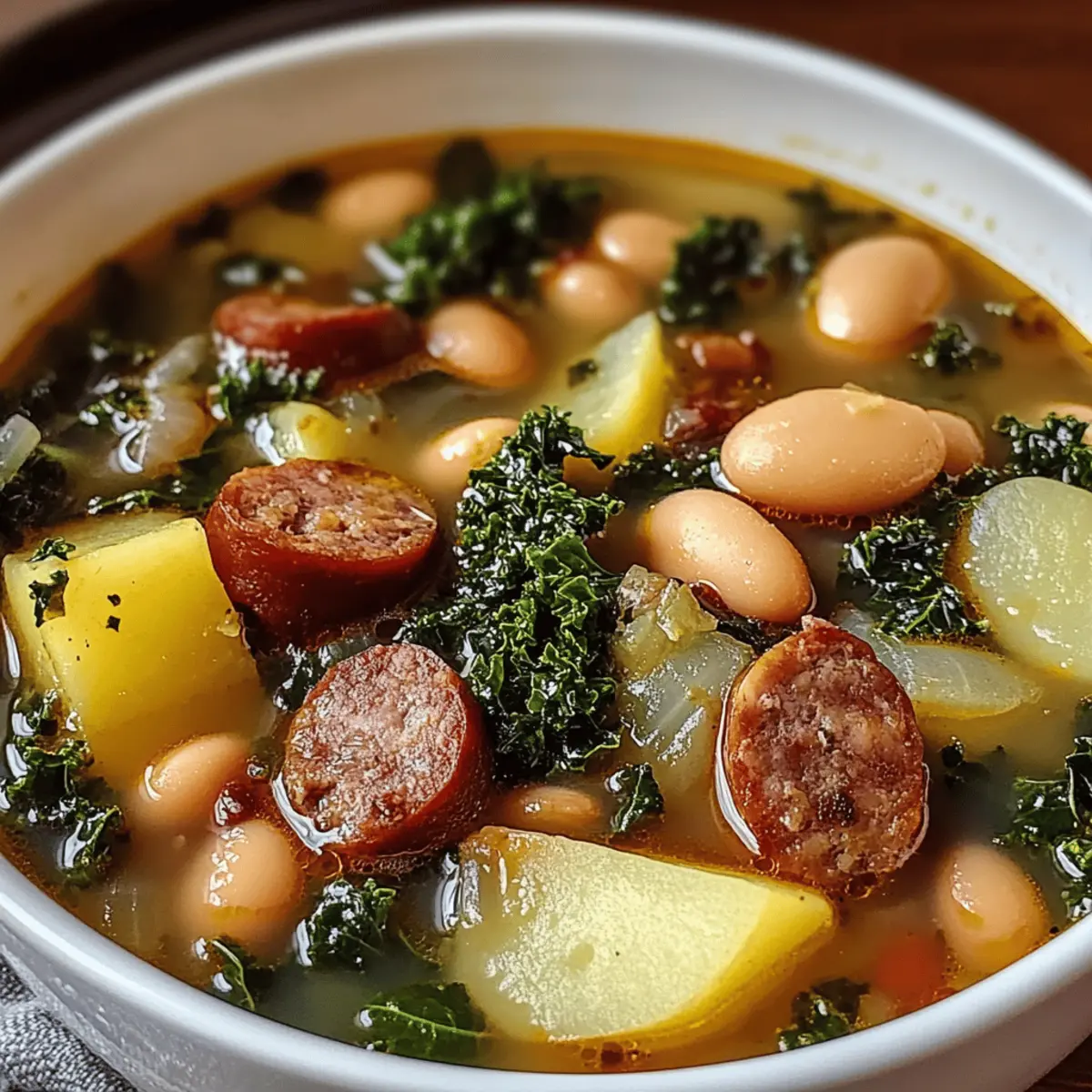 The crisp air tingles against my cheeks as I pull my soup pot from the cupboard, ready to embrace the warmth of home-cooked comfort. One recipe always calls me back: my Hearty Sausage Soup with Potatoes, Beans, and Kale. This dish wraps you in cozy goodness, marrying savory beef smoked sausage with tender potatoes and creamy navy beans, making it perfect for chilly evenings. Best of all, it’s a quick meal that brings everyone to the table, creating a symphony of flavors and laughter that lingers long after the last spoonful. Whether you’re looking for a complete dinner or a simple way to revitalize leftovers, this soup is your go-to solution. What’s your favorite way to create warmth in your kitchen? Why Is This Soup a Must-Try? Comforting Warmth: This Hearty Sausage Soup offers a hug in a bowl, perfect for chilly nights. Quick and Easy: With minimal prep and cooking time, it’s an ideal recipe for busy weeknights. Versatile Ingredients: Swap in different proteins or veggies to match your taste, like grilled zucchini with feta or a hearty vegetable medley—there are endless options! Flavor Explosion: The combination of smoked sausage, tender potatoes, and creamy beans creates a robust and satisfying dish. Crowd-Pleasing Appeal: Perfect for family dinners or friendly gatherings, this soup is bound to bring everyone together, just like a comforting bowl of bread with chocolate chips for dessert. Hearty Sausage Soup Ingredients For the Soup • Beef Smoked Sausage – Provides savory flavor and protein; consider chicken or turkey sausage for a lighter option. • Onion – Adds an aromatic base and sweetness; shallots or leeks could be used for milder flavor. • Italian Seasoning – Infuses the soup with classic herbal notes; feel free to use fresh herbs for a fresher taste. • Black Pepper – Offers heat and depth; adjust the quantity based on your spice preference. • Ground White Pepper – Adds subtle warmth; this can be omitted if you prefer not to see specks in your soup. • Garlic – Enhances the overall flavor profile; fresh garlic is best, but garlic powder works in a pinch. • Russet Potatoes – Contributes creaminess as they break down during cooking; substitute with red or yellow potatoes for a different texture. • Chicken Stock – Forms the soup base and adds flavor; beef or vegetable stock can be great alternatives. • Navy Beans – Provide creaminess and protein; cannellini or great northern beans work well for similar textures. • Kale – Adds color and nutrition; spinach or Swiss chard is a nice alternative if desired. • Fresh Parsley – Enhances freshness for garnish; cilantro or basil can be used based on your taste. • Lemon Juice – Brightens the flavors; fresh juice is ideal, but bottled can save time if rushing. This tempting Hearty Sausage Soup with Potatoes, Beans, and Kale is not just easy to make—it’s a delightful way to warm your home and heart! Step‑by‑Step Instructions for Hearty Sausage Soup with Potatoes, Beans, and Kale Step 1: Prep Ingredients Begin by gathering all your ingredients for the Hearty Sausage Soup. Dice the russet potatoes into even cubes for uniform cooking, chop the kale into bite-sized pieces, and finely chop the fresh parsley. Don’t forget to slice the smoked sausage into rounds. This prep work sets a strong foundation for a smooth cooking process. Step 2: Sear Sausage Heat a large soup pot over medium-high heat and add the sliced smoked sausage. Allow the sausage to sear for about 5-7 minutes, stirring occasionally until it is beautifully browned. The sizzling sound and rich aroma will fill your kitchen, promising a delightful dish ahead. Once done, transfer the sausage to a plate and set aside. Step 3: Sauté Aromatics In the same pot, without cleaning it, add a drizzle of olive oil if needed. Toss in the chopped onions along with Italian seasoning, black pepper, and ground white pepper. Sauté for about 4-5 minutes until the onions are softened and translucent, then add minced garlic. Stir and cook for another minute, allowing the garlic’s fragrance to permeate the mixture. Step 4: Add Potatoes & Broth Now, stir in the diced russet potatoes, ensuring they are coated with the aromatic mixture. Pour in the chicken stock, bringing the ingredients to a gentle simmer. Partially cover the pot and let it cook for about 12 minutes, or until the potatoes become tender and a creamy base starts to form, enhancing the soup’s texture. Step 5: Add Beans Incorporate the creamy navy beans into the pot, stirring gently to mix them with the potatoes and broth. Allow the soup to simmer for an additional 10 minutes so the flavors meld beautifully. Check the potatoes during this time; they should be fork-tender and the broth luscious, creating an inviting and hearty soup. Step 6: Finish with Greens & Herbs Remove the pot from the heat and stir in the chopped kale and fresh parsley, letting the residual heat wilt the greens slightly. Drizzle in some fresh lemon juice to brighten the flavors of your Hearty Sausage Soup. This step enhances not only the taste but also the vibrant color of the dish, making it even more enticing. Step 7: Serve Ladle the soup into warm bowls, savoring the comforting aroma as you do. Serve it hot, preferably accompanied by a loaf of crusty bread for dipping. The delightful combination of flavors and textures in your Hearty Sausage Soup with Potatoes, Beans, and Kale invites everyone to enjoy and share in the warmth of this cozy meal. How to Store and Freeze Hearty Sausage Soup Fridge: Store leftovers in an airtight container for up to 4 days. Make sure the soup is fully cooled before sealing to maintain freshness. Freezer: For longer preservation, freeze the soup in portions in airtight freezer bags or containers for up to 3 months. Lay bags flat for easier storage. Reheating: When ready to enjoy, thaw in the refrigerator overnight. Reheat on the stovetop over medium heat, stirring occasion