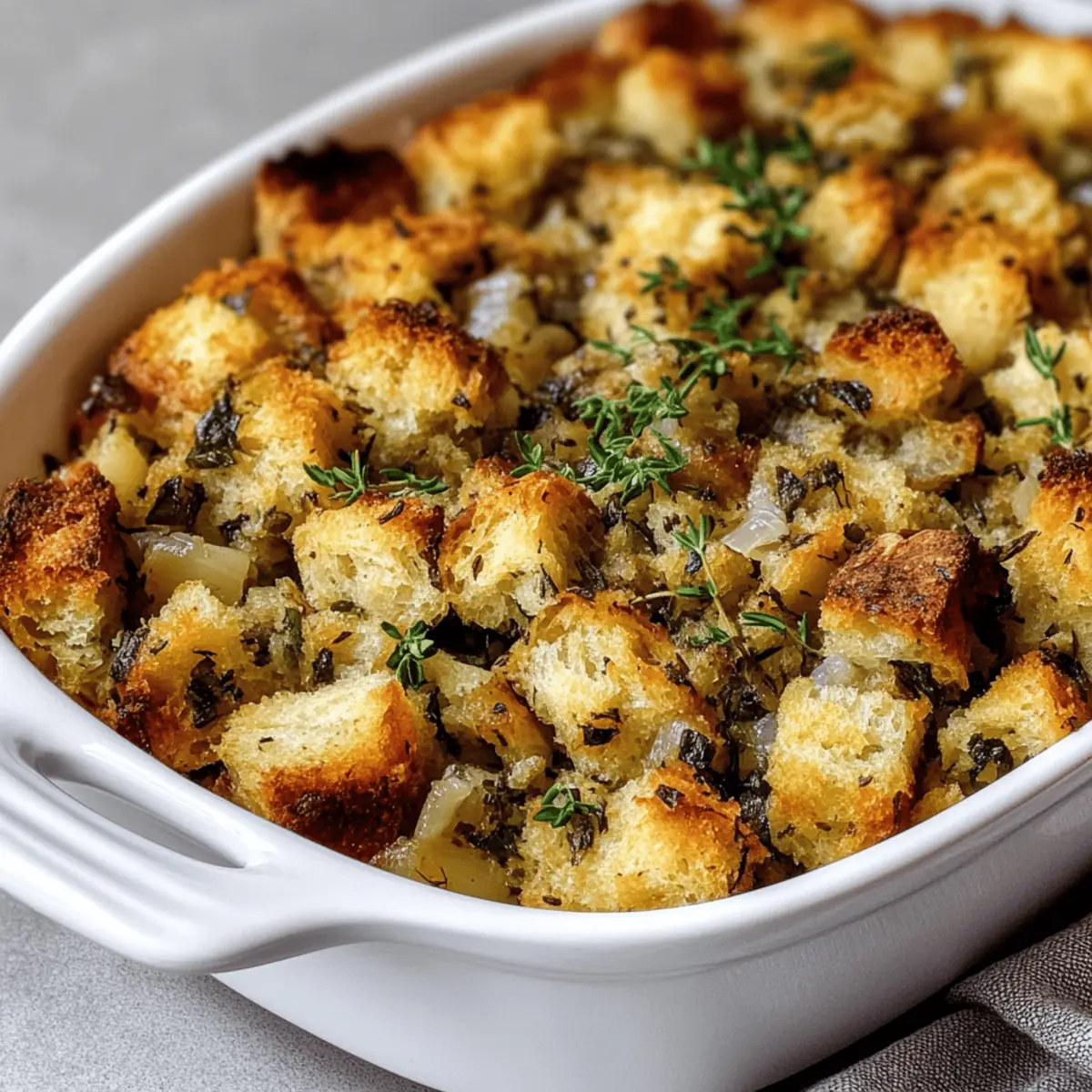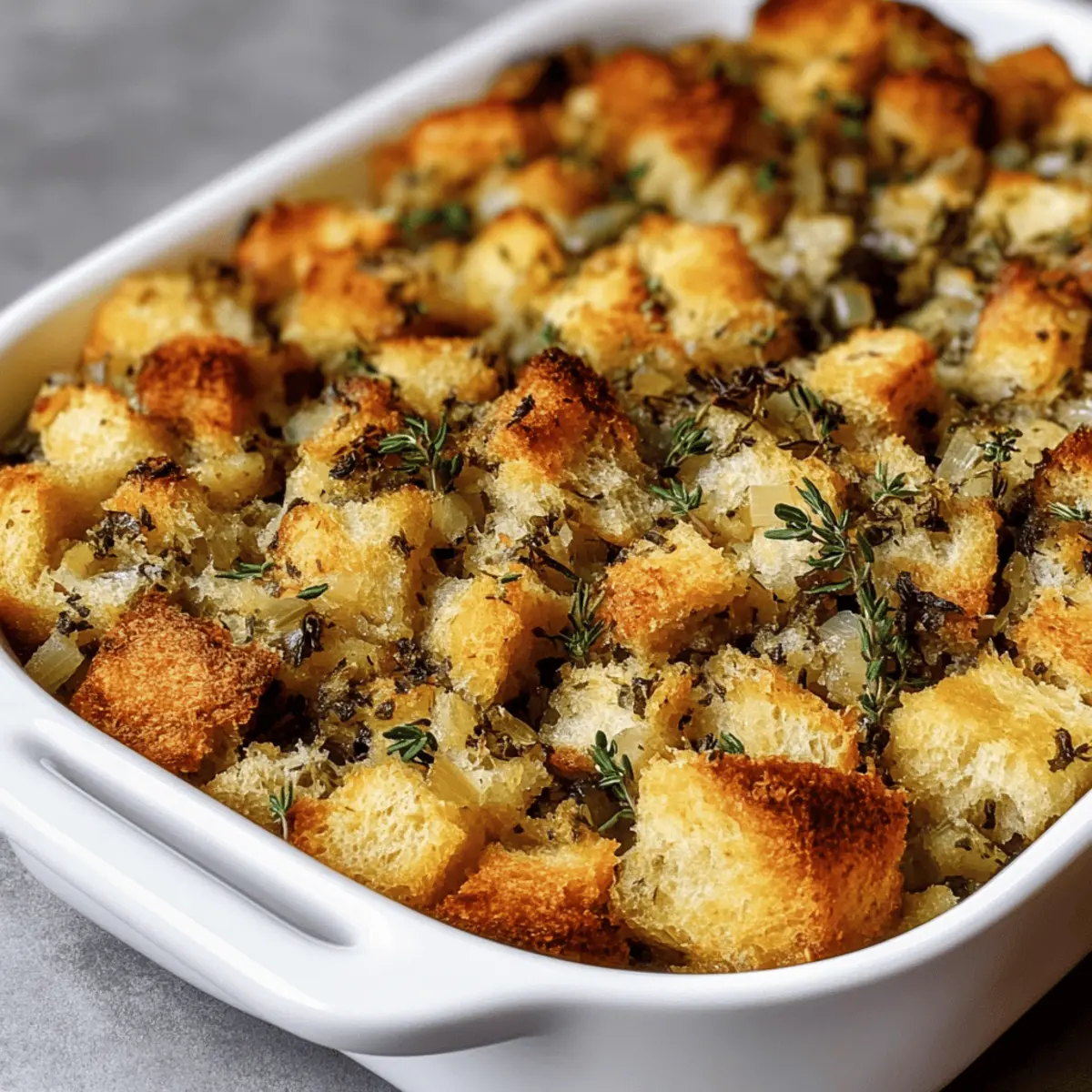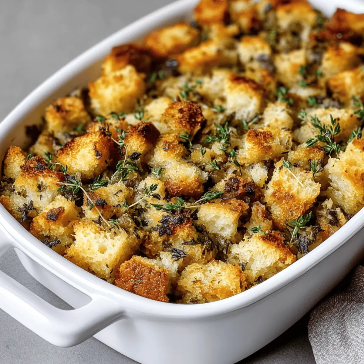 As the first hints of autumn whisper their way in, I find myself daydreaming about the aroma of sizzling butter mingling with savory herbs. My heart leaps at the thought of gathering around the table with family, where a dish of Classic Homemade Stuffing steals the spotlight every time. This delightful Homemade Stuffing Recipe transforms simple ingredients into a heartwarming dish that’s moist inside, with a satisfyingly crunchy golden top. Not only is it a comforting side dish that stands proud next to your holiday turkey, but it’s also incredibly versatile, making it perfect for gluten-free adaptations. As you dive into preparing this cherished recipe, you’ll feel the warmth of festive gatherings reflecting in each bite. Curious about how to bring this classic flavor to your own table? Let’s get started! Why Make This Homemade Stuffing Recipe? Irresistible, classic flavor: This Homemade Stuffing Recipe is a timeless crowd-pleaser, bringing warmth to every holiday gathering. Versatile base: Tailor it to your taste; substitute different bread or add dried cranberries for a unique twist! Easy preparation: Minimal effort needed—just combine simple ingredients and let the oven work its magic. Perfect for gluten-free diets: Easily adapt this recipe with gluten-free bread, ensuring everyone can enjoy. Ideal make-ahead dish: Prepare it in advance, simplifying your holiday meal prep so you can focus on what truly matters—spending time with loved ones! Pair it with Baked Ziti or Homemade Fried Rice for a festive feast that’ll impress your guests! Homemade Stuffing Ingredients • These essential ingredients will make your homemade stuffing a classic favorite! For the Base Bread – Choose a hearty bakery-style loaf or even gluten-free bread to suit dietary needs. Eggs – Acts as a binder, ensuring your stuffing holds together beautifully. For the Aromatics Butter (¾ cup) – Adds rich moisture and flavor; opt for unsalted to control seasoning perfectly. Onions – Contributes sweetness; cook until they are soft and translucent for the best flavor. Celery – Provides a crunchy texture and aromatic depth to your stuffing. For Seasoning Salt & Pepper – Essential for seasoning; adjust to your personal taste preference. Poultry Seasoning – Infuses classic flavors into the dish, making it unmistakably stuffing! Marjoram, Sage, Parsley – A delightful mix of herbs that enriches the aroma and taste of the stuffing. For Moisture Chicken Broth – Enhances the flavor and moisture of the stuffing; you can substitute with vegetable broth for a vegetarian option. These ingredients come together in harmony to create a Homemade Stuffing recipe that captures the essence of your cherished holiday feasts! Step‑by‑Step Instructions for Homemade Stuffing Recipe Step 1: Preheat and Prepare Begin by preheating your oven to 350°F (175°C) and butter a 9×9-inch (or 9×13-inch for doubling) baking dish to ensure your homemade stuffing comes out beautifully golden and non-stick. Set aside the dish while the oven warms, allowing any lingering butter to soften for easy spreading. Step 2: Sauté the Aromatics In a large skillet, melt ¾ cup of unsalted butter over medium heat. Add chopped onions and celery, cooking for 20 to 30 minutes until soft and translucent, stirring occasionally to prevent burning. You’ll know they’re ready when the onions turn golden and are fragrant, forming a delicious base for your stuffing. Step 3: Season the Mixture Once the aromatics are tender, sprinkle in salt, pepper, poultry seasoning, marjoram, sage, and parsley. Stir well to coat the vegetables with the seasonings, allowing about 2-3 minutes for the flavors to meld. This is the heart of your homemade stuffing recipe, so be generous with the herbs for a robust flavor. Step 4: Whisk the Egg and Broth In a separate bowl, crack open your eggs and whisk them together with the chicken broth until fully combined. This mixture acts as a binder, ensuring your stuffing holds together perfectly. The egg should be well incorporated, creating a smooth blend ready to add to the stuffing ingredients. Step 5: Combine Ingredients In a large mixing bowl, add your stale bread cubes to the sautéed vegetable mixture. Gently pour the egg and broth mixture over the top, tossing everything together with your hands or a large spoon until every bread cube is evenly coated. This is where your homemade stuffing recipe starts to take form—make sure it’s well mixed but not overly squished. Step 6: Transfer and Dot with Butter Carefully transfer your combined stuffing mixture into the prepared buttered baking dish, spreading it evenly with a spatula. For that extra touch of richness, dot the top of the stuffing with tiny cubes of butter. This will help create a delightful golden crust as it bakes. Step 7: Bake Covered, Then Uncover Cover the baking dish with aluminum foil to trap moisture and bake in the preheated oven for 30 minutes. After that, remove the foil to allow the top to crisp up and turn golden brown. Bake uncovered for an additional 15 minutes; you’ll want the edges to be bubbling and the top a perfect crispy hue. Step 8: Create Extra Crispiness For that final touch of crunch, you can broil your homemade stuffing for an additional 1-2 minutes. Keep a close eye on it, as this will quickly turn from golden to burnt if left unattended. Once done, the top should be irresistibly crunchy, creating a gorgeous contrast to the soft stuffing beneath. Step 9: Let it Rest Before Serving After baking, remove the stuffing from the oven and let it cool for about 10 minutes before serving. This resting period allows the flavors to deepen and ensures the stuffing is easier to cut and serve. The results will be a beautifully golden, savory homemade stuffing that every guest will adore! Homemade Stuffing Recipe Variations Feel free to unleash your culinary creativity and customize this recipe for a delightful twist! Gluten-Free: Substit