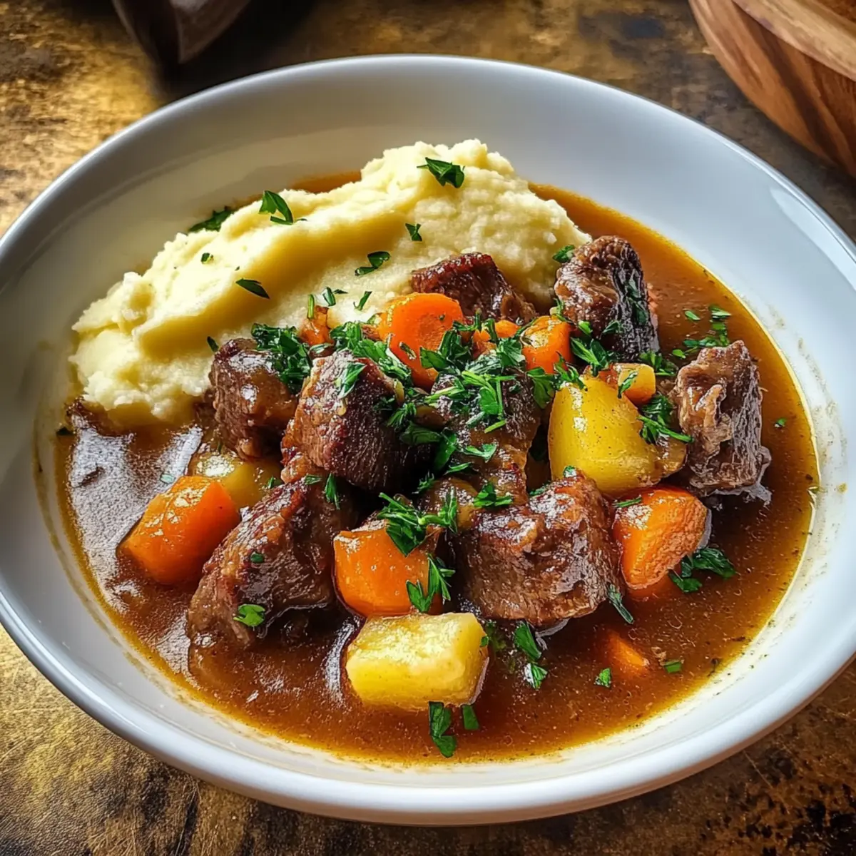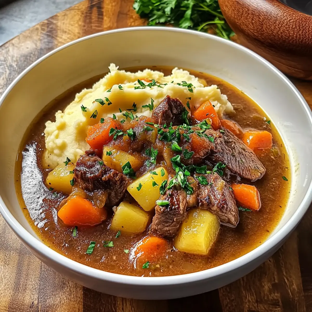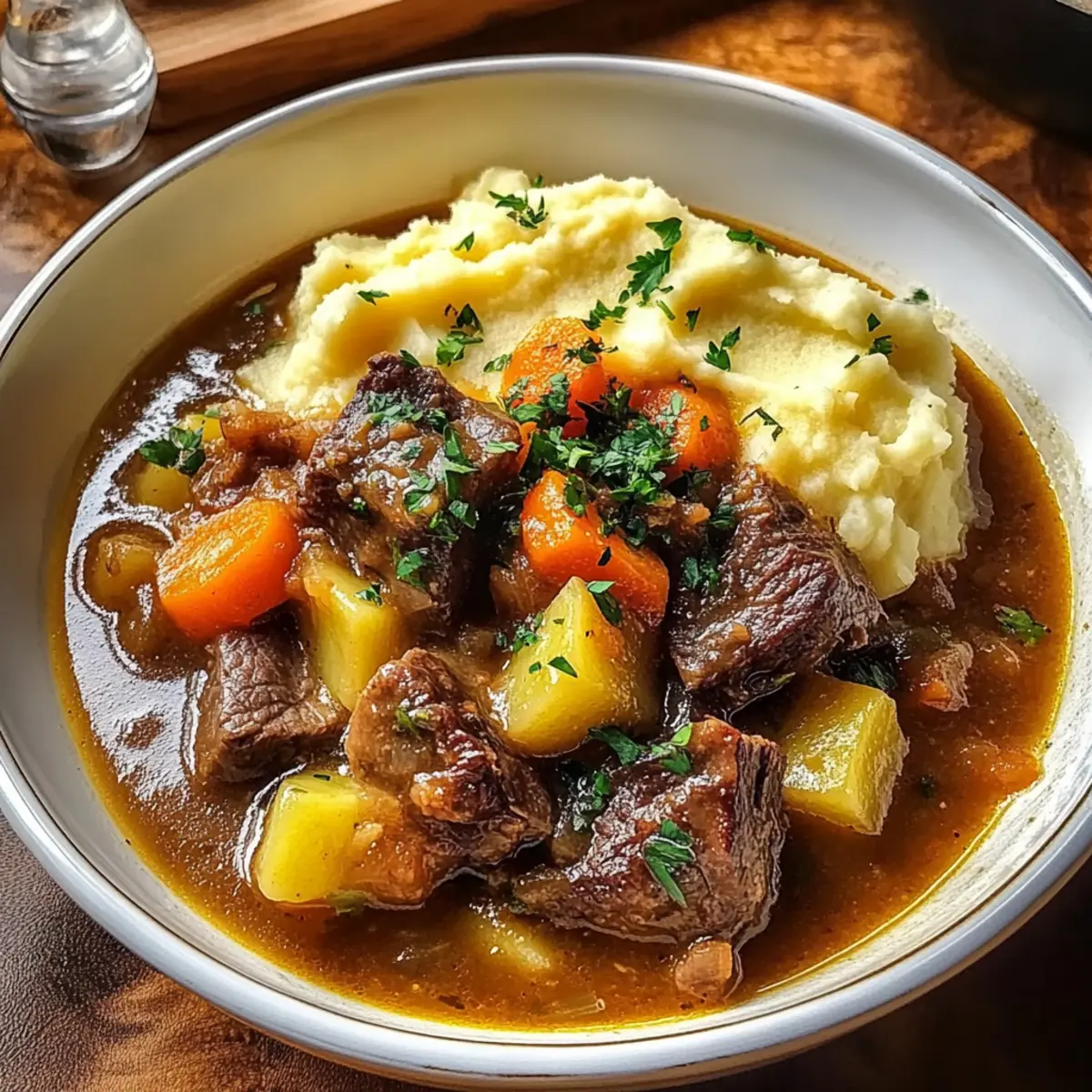 As the savory aroma of simmering lamb wafts through the kitchen, I can’t help but feel a wave of nostalgia wash over me. This Classic Irish Stew with Creamy Mashed Potatoes is not just a meal; it’s a cozy embrace on a chilly evening. Packed with tender lamb and vibrant vegetables, this dish is a wonderful blend of flavors that honors traditional Irish comfort food. With its effortless prep time and hearty nature, it’s perfect for a family gathering or a peaceful dinner at home. Plus, it’s versatile enough to adapt for a gluten-free version if needed. So grab your pot and let’s create something that will warm your heart and feed your soul—are you ready to dive into comfort food heaven? Why is Irish Stew So Special? Heartwarming Tradition: This dish isn’t just a meal; it embodies the spirit of Irish culture, bringing families together around the table. Bold, Cozy Flavors: The combination of tender lamb, fresh vegetables, and optional Guinness stout creates a unique taste that’s both rich and comforting. Creamy Complements: Topping the hearty stew with velvety mashed potatoes adds a delightful twist, making each bite melt in your mouth. Versatile & Adaptable: Whether you’re using lamb, beef, or even a vegetarian option, this recipe allows for creativity without sacrificing flavor. Effortless Preparation: With a simple cooking process and a comforting outcome, this stew is perfect for anyone wanting to indulge in homemade goodness. For more comforting options, check out our Mashed Potato Fries or the delightful Garlic Butter Chicken and Potatoes Skillet. Irish Stew With Mashed Potatoes Ingredients For the Stew Lamb shoulder – This is the main protein source, providing richness and flavor; feel free to substitute with beef if desired. Vegetable oil – Used for browning the lamb; any neutral oil will work well. Salt and pepper – Essential for enhancing flavor; using freshly ground pepper yields the best results. Onion – Adds natural sweetness and depth; shallots can be used for a milder taste. Garlic – Introduces an aromatic flavor; fresh is preferable, but powdered garlic can be a quick alternative. Carrots – Contributes sweetness and color; parsnips make for a tasty substitution. Potatoes – Essential for texture in the stew; waxy potatoes, like Yukon Gold, hold their shape well during cooking. Beef or lamb broth – Provides the stew’s base; opt for homemade or low-sodium store-bought broth for the best flavor. Guinness stout (optional) – Adds a special depth; you can replace this with non-alcoholic beer or more broth if you prefer. Tomato paste – Thickens and enriches the broth; canned for convenience works wonderfully. Fresh thyme and parsley – Bring herbaceous notes to the dish; while dried herbs are okay, fresh is always preferred. Bay leaves – Infuse lovely flavor; don’t forget to remove them before serving! For the Mashed Potatoes Potatoes for mashing – Yukon Gold is ideal for creamy, fluffy results. Milk – Adds creaminess to the mash; substitute with cream or a non-dairy alternative if desired. Butter – Provides richness in the mash; feel free to omit this if you’re aiming for a dairy-free option. Step‑by‑Step Instructions for Irish Stew With Mashed Potatoes Step 1: Season and Brown the Lamb Begin by generously seasoning the lamb shoulder with salt and pepper to enhance its flavor. In a large, heavy-bottomed pot, heat 2 tablespoons of vegetable oil over medium-high heat. Once the oil shimmers, add the lamb, browning it on all sides for about 6–8 minutes until it’s beautifully caramelized. Once browned, remove the lamb and set it aside on a plate. Step 2: Sauté Onions and Garlic In the same pot, add another splash of oil if needed, and reduce the heat to medium. Sauté 1 diced onion and 2 minced garlic cloves for about 4–5 minutes, stirring occasionally, until they become translucent and fragrant. This will infuse the pot with savory aromas, setting the stage for the delicious Irish Stew. Step 3: Combine Ingredients for Stew Return the browned lamb to the pot, followed by chopped carrots and diced Yukon Gold potatoes. Pour in about 4 cups of beef or lamb broth, and if you’re using it, add the optional 1 cup of Guinness stout for enhanced flavor. Stir in 2 tablespoons of tomato paste, a teaspoon each of fresh thyme and parsley, and add 2 bay leaves. Mix all ingredients thoroughly. Step 4: Simmer the Stew Bring the mixture to a robust boil over high heat, then reduce the temperature to low. Cover the pot and let the stew simmer gently for 1½ to 2 hours. You’ll know it’s ready when the lamb is fork-tender and the flavors meld beautifully. Stir occasionally to keep things moving and prevent anything from sticking. Step 5: Prepare the Mashed Potatoes While the stew is simmering, peel and chop 3-4 Yukon Gold potatoes, and place them in a pot of salted water. Bring the water to a boil. Cook the potatoes for about 15–20 minutes until they’re fork-tender. Drain the potatoes and return them to the pot to ensure they remain dry while you prepare the mash. Step 6: Mash to Creamy Perfection Add ¼ cup of milk and 2 tablespoons of butter to your drained potatoes. Use a potato masher or hand mixer to blend them until smooth and creamy. This process should take around 3–5 minutes. Taste and season with salt and pepper to your preference, ensuring the mashed potatoes are fluffy and rich. Step 7: Final Touches on the Stew After the stew has simmered and the lamb is tender, carefully remove the bay leaves. Taste and adjust seasoning if needed, adding more salt, pepper, or herbs for optimal flavor. Ladle the hearty Irish stew into bowls, perfect for serving alongside or topped with a generous scoop of the creamy mashed potatoes. What to Serve with Classic Irish Stew with Creamy Mashed Potatoes A comforting bowl of stew deserves delightful companions to create the perfect meal experience. Rustic Bread: The crusty texture of a warm l