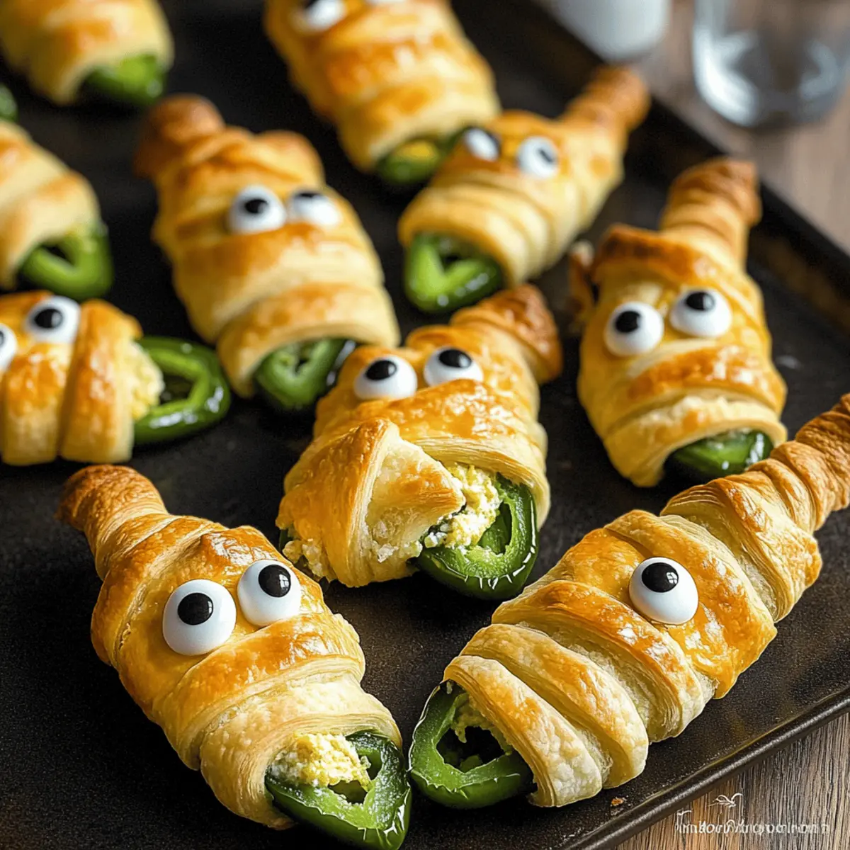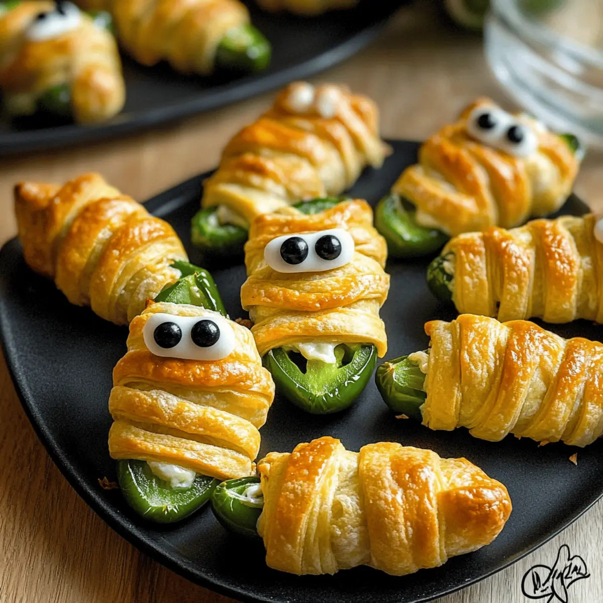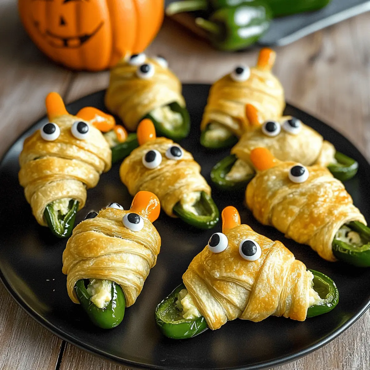 As I hurriedly flipped through my cookbooks, a thought struck me: why not liven up our Halloween gatherings with something both delicious and delightfully spooky? Enter my Spooky Jalapeno Popper Mummies! These charming little bites are a perfect mix of creamy cheese and spicy jalapenos, all wrapped in flaky crescent dough. They’re not just an easy Halloween appetizer, but a customizable treat that caters to all heat lovers—whether you like it spicy or prefer a milder twist. These adorable poppers are guaranteed to impress your guests and spark laughter around the table, making them an ideal addition to any potluck or festivity. Want to make your Halloween gathering unforgettable? Let’s dive into the recipe! Why Are Jalapeno Popper Mummies a Must-Try? Irresistible Fun: These spooky bites are not just delicious; they bring a playful twist to your Halloween spread that everyone will adore. Versatile Options: Feel free to customize the heat level by adjusting the jalapenos or swapping cheese for different flavors. Simple Prep: With just a few ingredients and minimal prep time, you’ll be ready to impress your guests without the stress! Perfect Party Companion: Serve them warm at any gathering for a delightful treat that will have everyone raving. Crispy & Creamy: Enjoy the perfect contrast of flaky dough and rich cheese filling, creating a mouthwatering experience with every bite! Elevate your holiday festivities with our jalapeno popper mummies that promise to be the talk of the table! Jalapeno Popper Mummies Ingredients • Get ready to create a spicy delight! For the Filling Cream Cheese – Adds creaminess and texture; substitute with Neufchâtel for a lower-fat option. Monterey Jack Cheese – Provides mild flavor and meltability; sharp cheddar or Colby Jack can be delicious alternatives. Garlic Powder – Adds aromatic flavor; fresh minced garlic can deepen the taste if preferred. Onion Powder – Enhances savory notes; swap with finely chopped fresh onion for a fresh twist. Salt – Elevates overall flavors; kosher or sea salt works best for even seasoning. Black Pepper – Adds mild heat; adjust or omit based on personal preference. For the Main Ingredient Jalapenos – The star of the show, offering spiciness; deseed for a milder flavor or keep the pith for a kick. For the Wrapper Pillsbury Crescent Rolls – Forms the mummy wrap and provides flakiness; feel free to use puff pastry for a different texture. Egg (for wash) – Gives a golden sheen; can be excluded for a vegan version using plant-based milk. For the Decoration Candy Eyeballs or Sliced Olives – These spooky touches complete the mummy look; sliced black olives are a savory alternative. Your journey to creating the most adorable jalapeno popper mummies awaits! Step‑by‑Step Instructions for Jalapeno Popper Mummies Step 1: Preheat the Oven Start by preheating your oven to 400°F (200°C). While the oven warms up, prepare a baking tray by lining it with aluminum foil for easy cleanup. This step is crucial as it ensures your jalapeno popper mummies will cook evenly and reach the perfect golden-brown color. Step 2: Prepare the Jalapenos Slice the jalapenos in half lengthwise and carefully scoop out the seeds and pith using a spoon. This process reduces the heat level, making them more palatable for everyone. If spice lovers are in the house, feel free to leave some seeds. Place the prepared jalapenos on a clean work surface, ready for the filling. Step 3: Make the Creamy Filling In a mixing bowl, combine the softened cream cheese, shredded Monterey Jack cheese, garlic powder, onion powder, salt, and black pepper. Use a fork or spatula to blend the ingredients until creamy and smooth. This flavorful filling will make your jalapeno popper mummies rich and delicious, perfect for Halloween gatherings. Step 4: Fill the Jalapenos Using a spoon, generously fill each hollowed jalapeno half with the creamy cheese mixture. Don’t be shy—heap it up a little for that delicious cheesy goodness! As you work, set filled jalapenos on your baking tray, arranging them with a little space in between for the dough wrapping. Step 5: Wrap with Crescent Rolls Open the package of Pillsbury crescent rolls and unroll the dough on a clean surface. Cut the dough into long, thin strips. Starting at one end of each filled jalapeno, carefully wrap the strips around to create a mummy-like appearance, leaving gaps for eyes. This wrapping technique adds a fun element while ensuring the filling stays inside. Step 6: Brush with Egg Wash Before baking, brush the wrapped jalapenos with a beaten egg. This will give them a beautiful golden-brown shine as they bake. Use a pastry brush or the back of a spoon to apply the egg wash gently, ensuring all surfaces are coated but delicate enough to keep the wrapping intact. Step 7: Bake to Perfection Place your tray of jalapeno popper mummies in the preheated oven and bake for approximately 12 minutes. Keep an eye on them—the dough should puff up and turn a lovely golden color. This visual cue indicates that your mummies are ready to be pulled out of the oven. Step 8: Add the Finishing Touches Once baked, carefully remove the jalapeno popper mummies from the oven. While they are still warm, press two candy eyeballs or sliced olives onto each mummy for that spooky, whimsical look. This quick step adds a fun and creative flair before serving them warm to your excited guests. How to Store and Freeze Jalapeno Popper Mummies Fridge: Store leftover jalapeno popper mummies in an airtight container for up to 3 days. To keep them fresh, ensure they are completely cooled before sealing. Freezer: For longer storage, freeze unbaked wrapped jalapenos in an airtight container for up to 1 month. When ready to bake, cook directly from frozen, adding a few extra minutes to the baking time. Reheating: When reheating leftover mummies, place them in the oven at 350°F for about 10-15 minutes until heated through. This will he