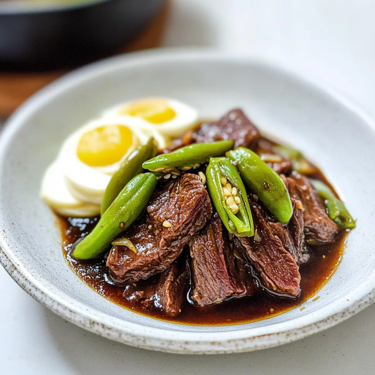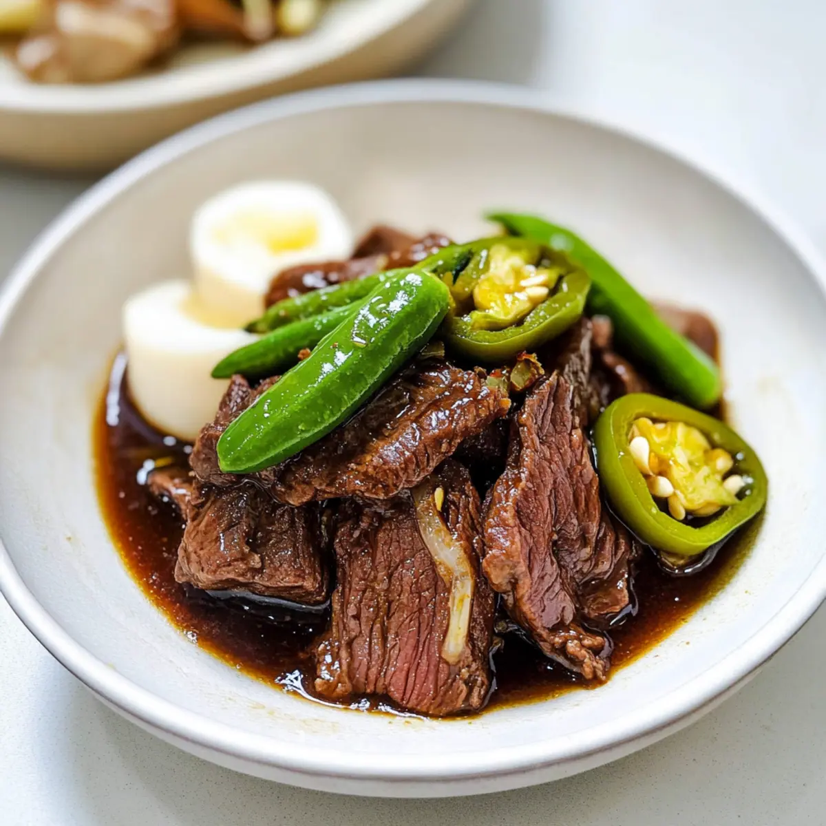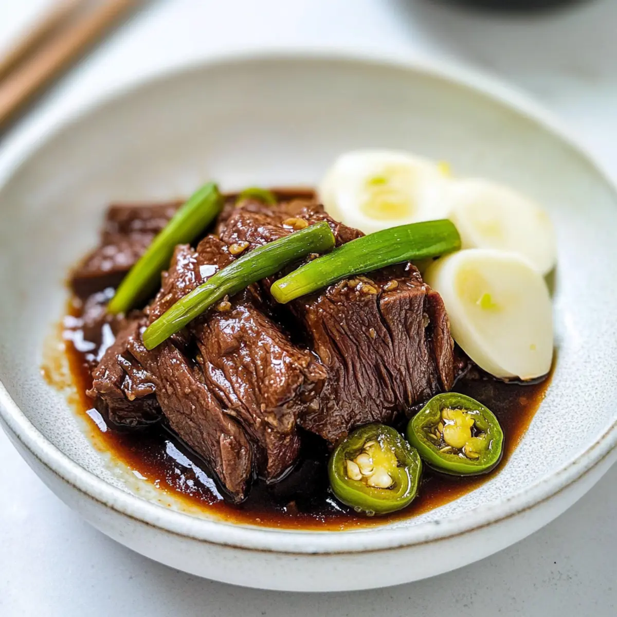 The rich aroma of simmering beef fills my kitchen, instantly transporting me to the vibrant streets of Korea. This is the essence of Jangjorim (Soy Braised Beef), a beloved side dish that marries sweet and savory flavors in perfect harmony. Not only is it a fantastic addition to any meal, but its economical nature makes it a win for budget-conscious cooks. Impressive in both taste and appearance, this dish is versatile enough to charm any dinner table or lunch box. Plus, the tender beef and hearty broth serve up warmth and comfort, turning even a simple weeknight meal into a special occasion. Ready to dive into the world of Korean cuisine with this crowd-pleaser? Let’s get cooking! Why is Jangjorim a Must-Try? Irresistible Flavor: The rich blend of sweet and savory notes in Jangjorim creates an unforgettable taste experience that’s sure to delight your palate. Effortless Preparation: With simple steps, you don’t need to be a culinary expert to whip up this dish. Perfect for home cooks of all levels! Versatile Side Dish: Pair it with rice or enjoy it as part of a bountiful banchan spread to elevate any meal. Budget-Friendly: Using economical cuts of beef, Jangjorim is a cost-effective choice that doesn’t sacrifice flavor. Meal Prep Champion: This dish stores beautifully, making it a terrific option for meal prepping and lunch boxes—check out my tips for prepping Korean lunches to make your week a breeze! Bring the vibrant essence of Korean cooking into your kitchen today; you’ll quickly find why Jangjorim is a beloved classic! Jangjorim Ingredients For the Beef • Beef (brisket, flank steak, or shank meat) – Choose brisket for a richer flavor or flank for tender pieces. For the Broth • Onion – Adds a hint of sweetness and depth; substitute with shallots if desired. • Scallions (white part) – Enhances aroma; green onions can be a suitable replacement. • Korean radish (mu) – Provides great texture and a unique flavor; standard radish works in a pinch. • Garlic cloves – Imparts a robust flavor; feel free to use roasted garlic for a mellower taste. • Ginger slices – Infuses warmth and spice; fresh is preferred but powdered can substitute. • Whole black peppercorns – Adds subtle heat and complexity; ground black pepper works too. For Seasoning • Soy sauce – The main seasoning for braising; tamari can make it gluten-free. • Soup soy sauce (guk ganjang) – Enhances depth; regular soy sauce can be used generously. • Sugar – Balances the saltiness with a touch of sweetness; honey or maple syrup can also work. • Rice wine or mirin – Brings sweetness and acidity; feel free to use white wine as a stand-in. • Dried kelp (or bay leaf) – Boosts umami flavor; it can be omitted if not available. For Additional Flavor • Shishito peppers (or other fresh green peppers) – Adds flavor and visual appeal; adjust according to spice preference. • Boiled eggs – Provides extra protein and texture; can be left out or swapped with tofu for a vegetarian option. Get these ingredients ready and enjoy creating a heartwarming Jangjorim (Soy Braised Beef) that will sure become a staple in your home! Step‑by‑Step Instructions for Jangjorim (Soy Braised Beef) Step 1: Cut the Beef Begin by cutting the beef into 2-3 inch rectangles, ensuring even sizes for uniform cooking. This will help the beef retain its texture and flavor during the braising process. Set the pieces aside, ready to absorb the rich seasonings that will soon come into play. Step 2: Prepare the Broth In a covered medium pot, combine 8 cups of water, the onion, scallions, Korean radish, garlic cloves, ginger slices, and whole black peppercorns. Bring this mixture to a rolling boil over medium-high heat, allowing all the ingredients to infuse together—this should take about 10 minutes and will fill your kitchen with delightful aromas. Step 3: Simmer the Beef Once boiling, add the prepared beef pieces to the pot. Lower the heat and let the beef simmer gently for 30 minutes, skimming off any foam that rises to the surface. This process will tenderize the meat and create a flavorful broth, allowing the essence of Jangjorim to develop beautifully. Step 4: Strain and Measure the Broth After simmering, carefully remove the beef from the pot with a slotted spoon, and strain the liquid through a fine-mesh sieve to discard solid bits. Measure out 2.5 cups of the broth and return it to the pot—this flavorful base is crucial for the next steps in the Jangjorim (Soy Braised Beef) preparation. Step 5: Add Seasonings In the pot with the reserved broth, add the soy sauce, guk ganjang, sugar, and rice wine or mirin. Stir well to combine all the ingredients. This aromatic mixture will create that signature savory-sweet flavor, bringing the essence of Korean cuisine right to your home. Step 6: Cook the Beef Again Return the beef pieces to the pot and bring the mixture to a boil once more. Then, reduce the heat to low and let it simmer for about 20 minutes, or until the beef is fork-tender. The liquid should reduce slightly, coating the beef with a rich glaze that enhances the overall flavor of your Jangjorim. Step 7: Add Optional Ingredients If desired, toss in the dried kelp, shishito peppers, and boiled eggs. Continue to cook for an additional 10 minutes, allowing the flavors to meld together. Keep an eye on the beef for tenderness, and adjust the heat if necessary to prevent it from overcooking. Step 8: Cool and Store Once cooked, discard the kelp if used, and let the mixture cool down to room temperature. Transfer your flavorful Jangjorim into an airtight container for storage. This dish is perfect for serving warm, and you can shred the meat and drizzle the savory sauce over rice or alongside other dishes to complete your meal. How to Store and Freeze Jangjorim Fridge: Store your Jangjorim in an airtight container for up to 7 days. This allows the flavors to meld beautifully while keeping the beef tende