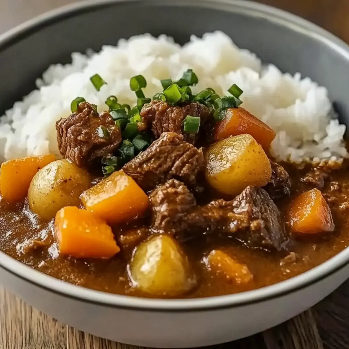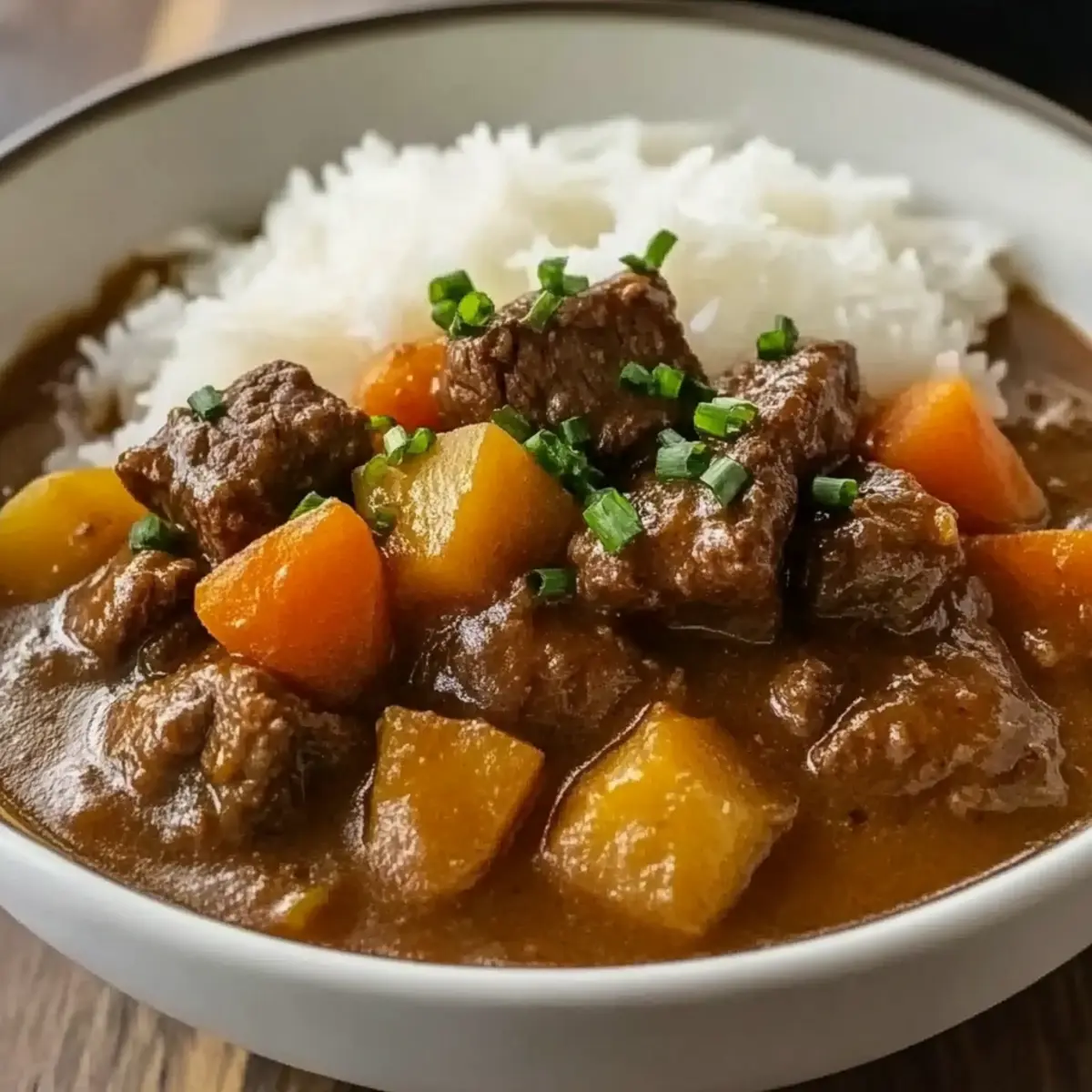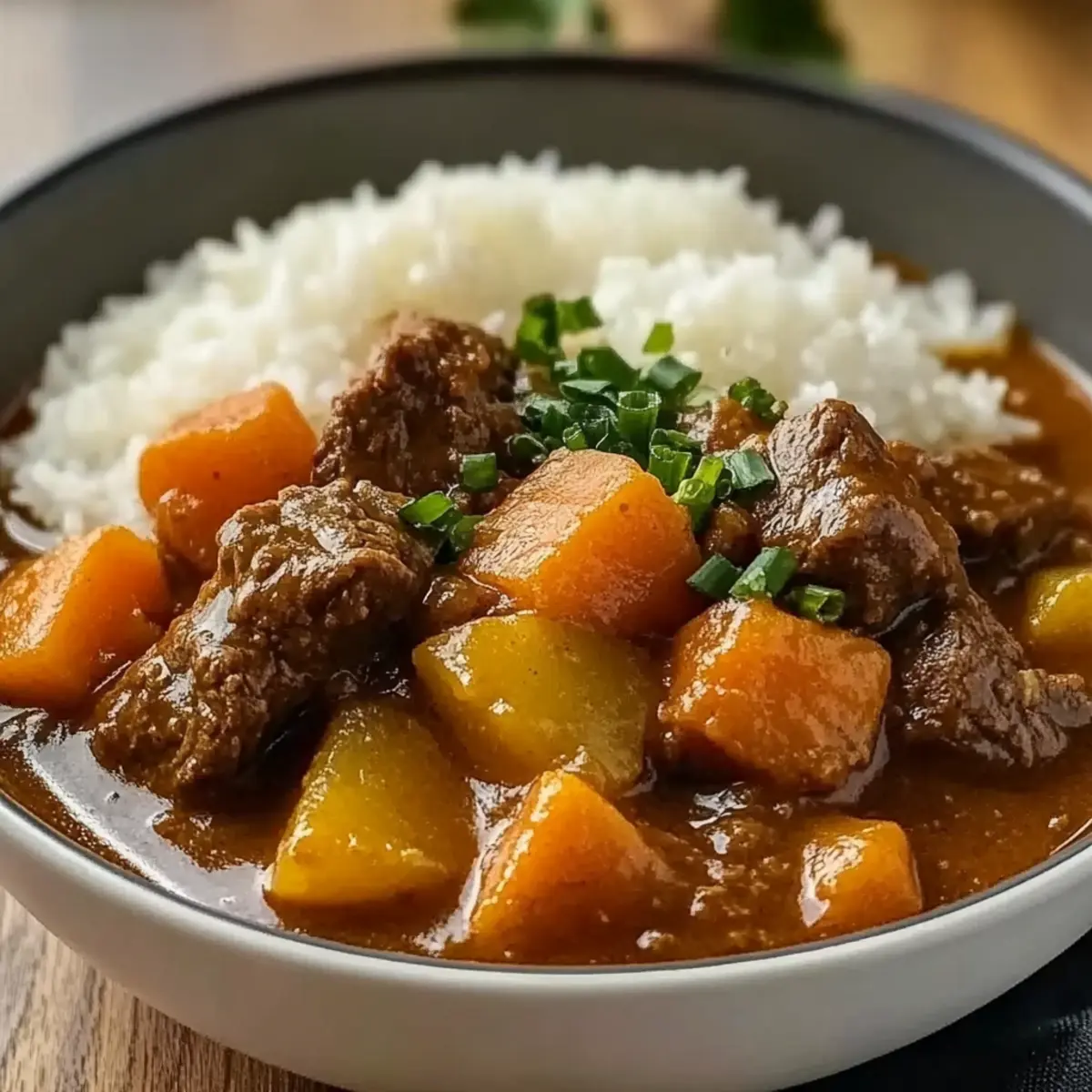 As I stood in my kitchen, the enticing aroma of spices began to wrap around me like a cozy blanket, transporting me to the heart of Japan with every simmering moment. Japanese Beef Curry, with its tender beef mingled with sweet carrots and hearty potatoes, has become my go-to comfort dish. Not only does this recipe promise a delightful explosion of flavors, but it’s also a versatile meal that’s quick to prepare, making it perfect for weeknight dinners or when you want to impress friends. Plus, with easy alterations for dietary needs—think gluten-free options and endless vegetable variations—this dish caters to everyone at the table. Curious about how to create this warm hug in a bowl? Let’s dive into the steps for crafting this unforgettable curry! Why Is Japanese Beef Curry So Beloved? Simplicity at its best: With just a few fresh ingredients and basic techniques, you can create a flavor-packed dish that impresses. Comforting flavors meld together beautifully, from tender beef to sweet vegetables, all enveloped in a savory sauce. Versatile dish: Customize with various cuts of meat or seasonal veggies like peas or bell peppers. Easy meal prep: Make ahead and store for busy days ahead; it reheats beautifully! Crowd pleaser: Perfect for family dinners or gatherings, it’s sure to satisfy even the pickiest eaters. If you enjoy meals that evoke warmth and comfort, you might also like Slow Cooker Beef or Beef Broccoli Savory for more delightful recipes! Japanese Beef Curry Ingredients • To create a deliciously comforting dish, gather these key ingredients. For the Beef Beef Chuck – A rich and tender cut, perfect for simmering until melt-in-your-mouth delicious; brisket or round are great alternatives. For the Flavor Base Curry Powder – This is what gives the dish its signature depth; feel free to adjust the amount or use gluten-free curry powder for dietary needs. Soy Sauce – Adds an umami punch; can be swapped with tamari for a gluten-free option. Garlic & Ginger – Fresh is best for enhancing flavor complexity, but powdered forms work in a pinch. For the Vegetables Onions – The backbone of the flavor profile; shallots can provide a milder taste if preferred. Carrots – Adds sweetness and a beautiful orange hue; you can use fresh or frozen, just cut them uniformly. Potatoes – Brings heartiness; choose waxy types for less mush or starchy varieties for a creamier sauce. For the Sauce Water or Stock – This helps create the curry’s liquid gold; beef stock adds richness, while vegetable stock lightens it up. Dive into making this Japanese Beef Curry, and let each ingredient work its magic! Step‑by‑Step Instructions for Japanese Beef Curry Step 1: Sear the Beef Begin by cutting the beef chuck into uniform chunks. In a large pot, heat a tablespoon of oil over medium-high heat. Once glistening, add the beef in batches, searing for about 5–7 minutes until it’s beautifully browned on all sides. This step enhances the flavor of your Japanese Beef Curry, so don’t rush—brown those pieces! Step 2: Sauté Vegetables Remove the seared beef from the pot and set aside. In the same pot, lower the heat to medium and add sliced onions, minced garlic, and grated ginger. Sauté for about 4–5 minutes, stirring frequently, until the onions are translucent and fragrant. This aromatic base is essential for your curry’s depth of flavor. Step 3: Combine and Cook Once the vegetables are ready, return the seared beef to the pot. Next, stir in chopped carrots and potatoes, then sprinkle in the curry powder. Pour in water or beef stock, ensuring the ingredients are well combined. Bring the mixture to a boil, then reduce the heat to low, ready for the next simmering phase. Step 4: Simmer Cover the pot and let the curry simmer gently on low heat for about 1 hour. Stir occasionally and check for tenderness—the beef should be meltingly soft, and the vegetables cooked through. The sauce will thicken beautifully, enveloping your ingredients with mouthwatering aromas, perfect for your Japanese Beef Curry. Step 5: Adjust Sauce After simmering, check the consistency of the sauce. If it’s too thick, add a splash of water or stock to loosen it up. Give the curry a good stir to incorporate, and allow it to simmer for an additional 5 minutes, adjusting the flavors to your liking with more curry powder or soy sauce if needed. Step 6: Serve To finish, ladle your aromatic Japanese Beef Curry over a bed of fluffy rice or udon noodles. Optionally, garnish with sliced green onions for a fresh touch. Serve warm and enjoy a cozy meal that is sure to bring smiles and satisfaction at your table! Storage Tips for Japanese Beef Curry Fridge: Store your Japanese Beef Curry in an airtight container for up to 3 days. Let it cool completely before sealing to retain moisture and flavor. Freezer: Freeze the curry in a freezer-safe container for up to 3 months. Make sure to leave some space for expansion as it freezes. Reheating: When ready to enjoy, thaw overnight in the fridge if frozen. Reheat gently on the stovetop over medium-low heat, adding a splash of water or stock for creaminess. Make-Ahead: Consider preparing a double batch and refrigerating or freezing leftovers for those busy weeknights when homemade comfort is just a reheat away! Expert Tips for Japanese Beef Curry Perfect Browning: Make sure to sear the beef chunks until they are deeply browned, creating a rich base flavor for your curry. Spice Control: Adjust the amount of curry powder based on your spice preference. Start with a little and add more if desired. Slow Cooking: For ultimate tenderness, consider cooking the beef curry in a slow cooker on low for 6-8 hours after searing the meat. Gluten-Free Check: Always read the labels on curry powder and soy sauce to ensure they meet gluten-free requirements for dietary restrictions. Veggie Variations: Don’t hesitate to mix in your favorite vegetables; bell peppers and peas can add a pop of 