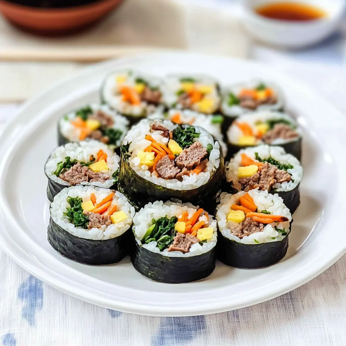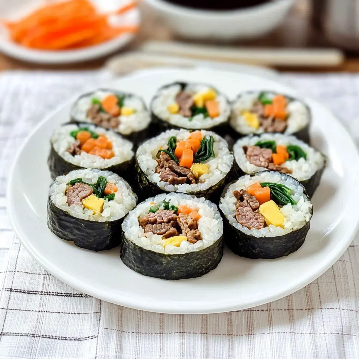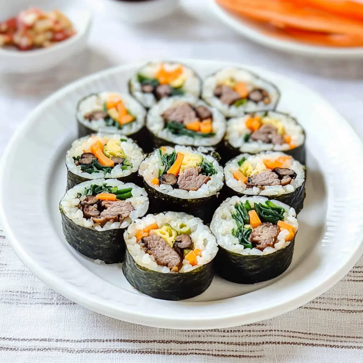 As I unwrapped my lunch at the park, the vibrant colors of my homemade Kimbap (Korean Seaweed Rice Rolls) drew curious glances from passersby. These iconic rolls, filled with perfectly seasoned rice and a mix of colorful veggies, are not just a feast for the eyes, but a wholesome meal that can be enjoyed anywhere. Crafting your own Kimbap is a delightful way to bring the flavors of Korea into your home kitchen, offering you both the fun of meal prep and a healthier alternative to takeout. Whether you’re packing it for a picnic or a quick lunch at your desk, this recipe boasts the benefits of being not only versatile—easily adjusted for gluten-free or vegan diets—but also incredibly satisfying. Ready to roll up your sleeves and create something delicious? Let’s dive into the world of Kimbap together! Why is Kimbap a must-try? Versatile for All Diets: Kimbap can easily adapt to various dietary needs—create a vegan version with fresh veggies or enjoy gluten-free options by adjusting a few ingredients. Quick and Fun to Make: Perfect for novice cooks, the simple assembly of colorful fillings provides an enjoyable cooking experience that everyone can join in on. Kid-Friendly Appeal: Filled with tasty ingredients, Kimbap is a hit with children, making it easy to sneak in nutrients while keeping mealtime exciting! Perfect for Meal Prep: These rolls store well and can be made in advance, allowing for quick grab-and-go lunches or snacks throughout the week. Visual Delight: With its vibrant colors and inviting presentation, Kimbap is not just delicious but also a showstopper that impresses at gatherings. Pair this delightful dish with a side of Homemade Fried Rice for a complete meal that showcases your culinary skills! Kimbap Ingredients For the Rice • Short Grain Rice – Essential for achieving the perfect sticky texture necessary for rolling. For the Wrap • Gim (Dried Seaweed) – The traditional wrap that holds all the delicious fillings, giving Kimbap its unique character. For the Fillings • Beef (Lean Tender Cuts) – Adds protein and depth of flavor; swap for tofu for a vegan option. • Spinach – A nutritious and colorful addition; can be replaced with crunchy cucumber for variety. • Carrots – Provides sweetness and crunch; julienned to enhance presentation. • Pickled Radish (Danmuji) – A tangy, essential ingredient for authentic taste. • Eggs – Great for adding more protein; prepare as a thin omelette and slice thinly. • Fish Cake (Eomuk) – Traditional for adding a savory note; optional based on preference. • Burdock Root – Unique flavor and texture that’s characteristic of Kimbap; can be omitted if unavailable. For Seasoning • Soy Sauce – Elevates the flavor of cooked beef and vegetables. • Sesame Oil – Crucial for a nutty aroma and authentic taste; don’t skip this! • Sugar – Balances the savory aspects of the dish to create harmony. • Rice Wine (or Mirin) – Optional for tenderizing, giving depth to the beef’s flavor. Embrace the art of rolling with these Kimbap ingredients, and get ready to make a delicious, wholesome meal that’s both fun to prepare and enjoyable to eat! Step‑by‑Step Instructions for Kimbap (Seaweed Rice Rolls) Step 1: Cook the Rice Begin by rinsing 2 cups of short grain rice under cold water until the water runs clear. Cook the rice in a rice cooker or on the stovetop with slightly less water than normal to achieve a firmer texture, about 1:1 ratio. Once cooked, let the rice cool slightly, then mix in a splash of sesame oil to add flavor and prevent it from sticking together. Step 2: Prepare the Beef In a bowl, marinate 200g of lean beef with 2 tablespoons of soy sauce, 1 teaspoon of sugar, a dash of rice wine, and 1 tablespoon of sesame oil. Heat a skillet over medium-high heat and cook the marinated beef for about 3-5 minutes until browned and cooked through. Remove from heat and let it rest, then slice into thin strips. Step 3: Blanch the Spinach Bring a pot of water to a rolling boil and add 1 cup of fresh spinach. Blanch the spinach for about 30 seconds until wilted, then immediately plunge it into an ice bath to stop the cooking process. Once cooled, drain the spinach and season it with a drizzle of sesame oil and a pinch of salt for flavor. Step 4: Cook the Carrots Julienne 1 medium carrot into thin strips and stir-fry in the same skillet over medium heat for about 3-4 minutes. Lightly season the carrots with a little soy sauce to enhance their sweetness. The carrots should be tender yet still have a slight crunch, adding great texture to your Kimbap. Step 5: Fry the Fish Cake If using fish cake, slice it into strips and add to the skillet over medium heat. Cook for about 3 minutes, adding a splash of soy sauce and a sprinkle of sugar to heat it through and add flavor. Once heated, remove the fish cake from the skillet and set it aside to cool slightly. Step 6: Assemble the Kimbap On a bamboo sushi mat, lay out a sheet of dried seaweed (gim) with the shiny side facing down. Spread a thin, even layer of warm seasoned rice over the seaweed, leaving a small space at the top. Layer a strip of beef, a few pieces of spinach, carrots, fish cake, pickled radish, and egg strips in the center for an eye-catching array of fillings. Step 7: Roll the Kimbap Using the bamboo mat, carefully lift the edge nearest you and begin rolling tightly away from you, pressing gently but firmly to ensure a compact roll. As you roll, keep the fillings secure and use the mat to help shape the roll uniformly. Seal the edge with a little water to ensure it sticks together. Step 8: Slice and Serve With a sharp, damp knife, slice the rolled Kimbap into bite-sized pieces, about 1-inch thick. Wipe the knife between cuts to maintain clean edges and prevent sticking. Arrange the Kimbap on a platter and serve immediately, or pack them for a delightful lunch on the go! Make Ahead Options Kimbap is a fantastic choice for meal prep lover