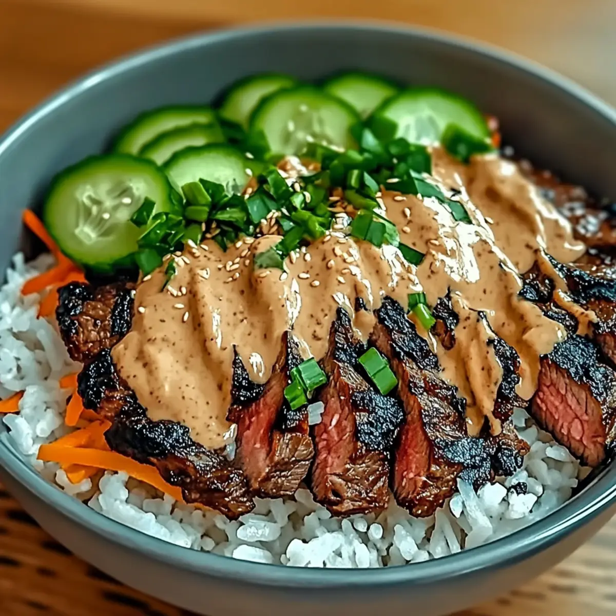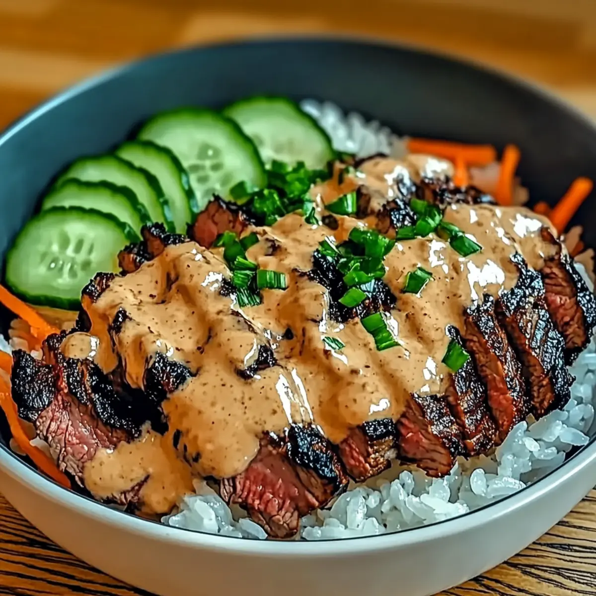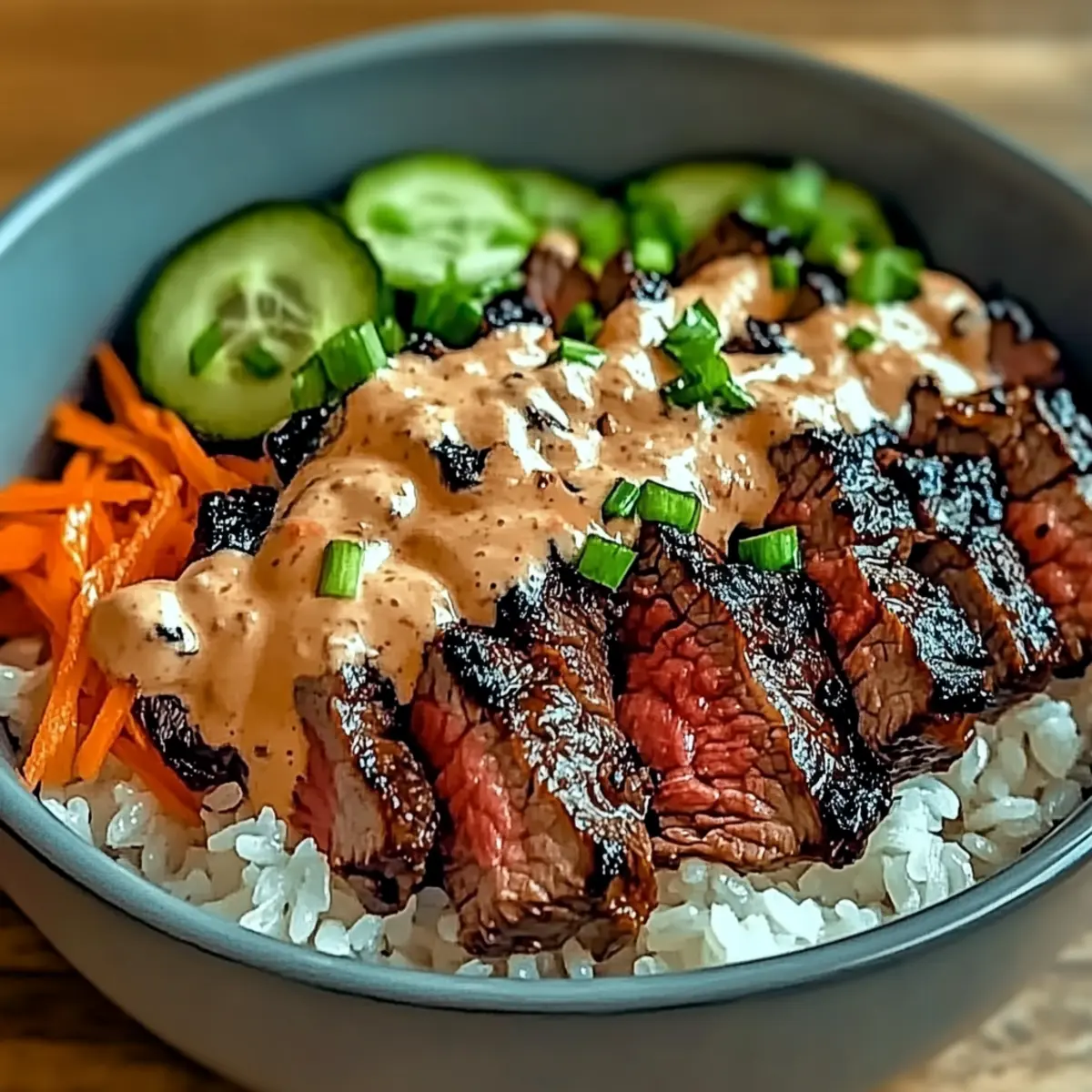 As I stood in my kitchen, the sizzle of marinated steak hitting a hot skillet filled the air, instantly transporting me to a bustling Korean BBQ joint. These Korean BBQ Steak Rice Bowls with Spicy Cream Sauce are a delightful fusion of flavors that I now savor from the comfort of home. Perfect for quick weeknight dinners, this recipe offers an effortless way to create a satisfying meal that doesn’t skimp on taste. The beauty of this dish lies in its customizable options—whether you choose to pile on fresh veggies or stir in a touch of kimchi, each bowl is a reflection of your personal culinary style. With minimal prep time and comfort food appeal, you’ll find that this dish is not only a crowd-pleaser but also a fantastic way to shake off the fast food habit. Curious how to bring this mouthwatering experience to your table? Let’s dive in! Why Try Korean BBQ Steak Rice Bowls? Bold, Flavorful: Each bite bursts with the essence of Korean BBQ, bringing excitement to your dinner table like few other meals can. Quick Preparation: Whip these up in under 30 minutes—even on your busiest nights! Customizable Delight: Tailor your bowls with a mix of veggies, kimchi, or tofu to please everyone at the table. Comforting and Satisfying: The combination of juicy steak and creamy sauce offers incredible comfort, making it a go-to for cozy evenings. Nutrient-Rich: Packed with protein and the versatility to lighten up based on your dietary needs, it’s a win-win for your health. Ditch the fast food and elevate your weeknight dinners with these Korean BBQ Steak Rice Bowls. For more great meal ideas, check out Homemade Fried Rice for a tasty side dish or Garlic Butter Steak for another flavor-packed option! Korean BBQ Steak Rice Bowls Ingredients For the Steak Flank or Sirloin Steak – Tender cuts promise rich flavor; substitute chicken or tofu for a lighter protein option. Soy Sauce – Key for flavoring the steak; use low-sodium for a healthier option. Brown Sugar – Balances saltiness and adds sweetness; honey is a good substitute. Sesame Oil – Contributes aromatic flavor; can substitute with vegetable oil in a pinch. Garlic (minced) – Essential for flavor depth; in powdered form, use 1/4 tsp per clove. Ginger (grated) – Adds warmth and zest; ground ginger can be a substitute, but fresh is preferable. Rice Vinegar – Provides acidity for balance; apple cider vinegar can be an alternative. Gochujang (optional) – Offers heat; adjust based on preference; use chili flakes for a milder heat. For the Rice Bowl Cooked Rice (White or Brown) – Serves as a classic base; brown rice adds nuttiness, cauliflower rice is a low-carb alternative. Shredded Carrots – Adds sweetness and crunch; substitute with bell peppers for a different texture. Cucumber – Provides refreshing crispness; snap peas can be used for similar crunch. Kimchi (optional) – Adds an authentic Korean zing; omit if preferred. Green Onions – Offers mild onion flavor and garnish; can be replaced with chives. Sesame Seeds (optional) – Enhances visual appeal and adds nuttiness; toast for extra flavor. For the Spicy Cream Sauce Mayonnaise – Gives creaminess to the sauce; Greek yogurt can be a healthier option. Sriracha – Adds extra heat to the sauce; use less if you’re sensitive to spice. Lime Juice – Brightens flavors; lemon juice can be substituted. With these ingredients ready to go, you’ll be well on your way to crafting delicious Korean BBQ Steak Rice Bowls that will delight both your taste buds and your dining companions! Step‑by‑Step Instructions for Korean BBQ Steak Rice Bowls Step 1: Marinate the Steak In a medium bowl, whisk together soy sauce, brown sugar, sesame oil, minced garlic, grated ginger, rice vinegar, and optionally, gochujang for heat. Add thinly sliced flank or sirloin steak, ensuring each piece is well-coated in the flavorful marinade. Cover and refrigerate for at least 30 minutes, or up to 8 hours for deeper flavor absorption. Step 2: Prepare the Spicy Cream Sauce In a separate bowl, combine mayonnaise, sriracha, lime juice, and honey. Whisk thoroughly until you achieve a smooth and creamy texture. Set this zesty spicy cream sauce aside while you cook the steak; it will complement the Korean BBQ Steak Rice Bowls perfectly once assembled. Step 3: Cook the Steak Heat a grill pan or skillet over medium-high heat, allowing it to reach a sizzling temperature. Add the marinated steak in a single layer, cooking for 2-3 minutes per side, or until it develops a rich caramelization and reaches your desired level of doneness. This step infuses the bowls with mouthwatering flavors. Step 4: Assemble Bowls Once your steak is cooked to perfection, it’s time to build your Korean BBQ Steak Rice Bowls. Layer fluffy cooked rice at the bottom of each bowl, then arrange the cooked steak, along with shredded carrots, sliced cucumbers, and optional kimchi, creating a visually appealing and colorful display. Step 5: Finish with Sauce Drizzle the prepared spicy cream sauce over each assembled bowl, allowing its creamy, zesty profile to meld with the other ingredients. This finishing touch elevates the Korean BBQ Steak Rice Bowls, enhancing their flavor and adding a delightful creaminess. Step 6: Garnish and Serve For an inviting final touch, sprinkle sliced green onions and toasted sesame seeds over each bowl. Serve your Korean BBQ Steak Rice Bowls immediately, presenting a vibrant, delicious dish that promises to be a hit at the dinner table. Expert Tips for Korean BBQ Steak Rice Bowls Slice Against the Grain: Always slice your steak against the grain to ensure maximum tenderness in each bite, making your Korean BBQ Steak Rice Bowls more enjoyable. Quality Soy Sauce Matters: Use high-quality soy sauce for the best flavor. A great soy sauce elevates the savory profile of your marinade significantly. Don’t Rush Marinading: Allowing the steak to marinate for at least 30 minutes (or up to 8 hours) enhances it