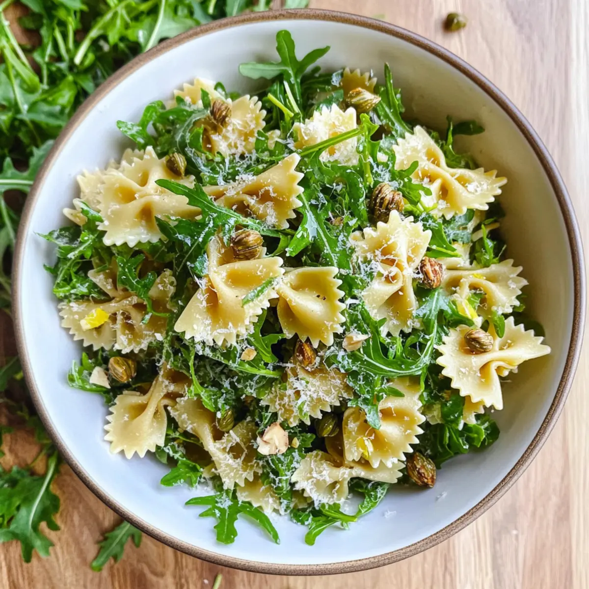 As I tossed the vibrant greens together, the zesty aroma of lemon danced through my kitchen, instantly lifting my spirits. This Lemon Arugula Pasta Salad is the epitome of a simple recipe, blending the peppery delight of arugula with crunchy walnuts and the savory goodness of parmesan cheese. Whether you’re looking for a refreshing side dish for a summer barbecue or a comforting addition to a cozy winter meal, this salad is a quick, 25-minute preparation that delivers on taste and nutrition. It’s vegetarian-friendly and proves that healthy eating can be both effortless and enjoyable. Are you ready to impress your taste buds with this delicious twist on pasta salad? Why is this pasta salad so irresistible? Fresh, zesty flavors: The bright lemon and peppery arugula come together to create a mouthwatering salad that sings of sunshine! Quick and easy: This delightful dish can be whipped up in just 25 minutes—perfect for busy days or last-minute gatherings. Nutty crunch: Toasted walnuts add rich texture and depth, elevating the dish from simple to spectacular. Versatile options: It pairs beautifully with grilled meats or can stand alone as a light lunch. You might also enjoy adding grilled chicken or chickpeas for a protein boost. Meal Prep Friendly: Leftovers store well in the fridge for up to 24 hours, making it a practical addition to your weekly meals. Try pairing it with our delicious Cucumber Caprese Salad for a fabulous summer spread! Lemon Arugula Pasta Salad Ingredients • To create the perfect Lemon Arugula Pasta Salad, gather these delightful components: For the Salad Arugula – Adds a peppery flavor and fresh crunch; you can substitute it with baby spinach for a milder taste. Pasta (8 oz, such as farfalle or orzo) – Provides the main structure of the salad; feel free to use gluten-free pasta for a gluten-free version. Walnuts (½ cup, finely chopped) – Contributes texture and nutty flavor; toasting enhances their depth, while pecans or almonds are good alternatives. Parmesan or Pecorino Cheese (⅓ cup, finely grated) – Offers umami and creaminess; replace it with nutritional yeast for a vegan option. Lemon (juice and zest from 1 lemon) – Brings acidity and brightness to the dish; lime can be used instead if needed. Olive Oil (8 Tb) – Acts as the dressing base, adding richness; avocado oil is a great alternative fat choice. Salt (1 tsp) and Black Pepper (½ tsp) – Elevates flavors; adjust these to your taste preferences. Capers (1 Tb plus 1 tsp brine) – Delivers a briny kick; chopped olives can be a different yet tasty substitute. White Balsamic Vinegar (1 Tb) – Adds a tangy note; regular balsamic vinegar is a perfect alternative if you lack white balsamic. Dijon Mustard (2 tsp) – Serves as an emulsifier and gives a slight kick; yellow mustard can step in if that’s what you have on hand. Basil Leaves (6, chiffonade-style) – optional – Infuses the salad with a fresh herbal note; you can omit this or swap it with parsley if basil isn’t available. This array of ingredients comes together to form an unforgettable Lemon Arugula Pasta Salad, bursting with flavor and ideal for any occasion! Step‑by‑Step Instructions for Lemon Arugula Pasta Salad Step 1: Cook the Pasta Begin by boiling a large pot of salted water over high heat. Once bubbling, add 8 ounces of your chosen pasta, such as farfalle or orzo, and cook according to package instructions until slightly softer than al dente, about 8-10 minutes. Drain the pasta, and immediately rinse it under cold water to halt the cooking process and remove excess starch, ensuring it remains firm and fresh for your Lemon Arugula Pasta Salad. Step 2: Prepare the Dressing In a large mixing bowl, combine the juice and zest of 1 lemon, 1 tablespoon of white balsamic vinegar, and 2 teaspoons of Dijon mustard. Whisk in 8 tablespoons of olive oil until the mixture is well emulsified. Then, add ½ cup of finely chopped walnuts, 1 tablespoon of capers plus 1 teaspoon of their brine, 1 teaspoon of salt, and ½ teaspoon of black pepper, mixing thoroughly to create a vibrant dressing that will elevate your salad. Step 3: Incorporate Pasta and Cheese Add the cooled, rinsed pasta to the bowl containing the dressing, gently tossing to ensure each strand is perfectly coated. Now, fold in ⅓ cup of finely grated parmesan cheese, allowing it to melt slightly into the warm pasta and integrate into the dressing. Take a moment to appreciate the zesty aroma wafting up from your Lemon Arugula Pasta Salad as everything comes together beautifully. Step 4: Add Fresh Greens Next, add a generous handful of fresh arugula to the pasta mixture, gently folding it in until it is evenly distributed throughout. If you’re using basil, chiffonade 6 leaves and add them at this point for an extra layer of flavor. Continue to mix carefully to avoid bruising the arugula, which will add that delightful peppery crunch to your refreshing salad. Step 5: Adjust Seasoning and Serve Finally, taste your Lemon Arugula Pasta Salad and adjust the seasoning as needed, adding more salt or pepper to suit your palate. Once satisfied with the flavors, transfer the salad to a serving dish. For the best experience, serve it immediately so the vibrant greens remain fresh and crispy, creating a delightful dish ready to impress your family and friends! What to Serve with Zesty Lemon Arugula Pasta Salad This delightful pasta salad creates a vibrant backdrop for a well-rounded meal that will tantalize your taste buds. Grilled Chicken: Juicy, marinated chicken searing on the grill brings a smoky depth that perfectly contrasts the bright lemony flavors. Roasted Vegetables: Caramelized seasonal vegetables provide a sweet and savory balance, enhancing the freshness of the arugula. Crusty Bread: Freshly baked artisan bread is perfect for soaking up the zesty dressing, adding a comforting element to your meal. Chilled White Wine: A refreshing glass of Sauvignon Blanc complemen