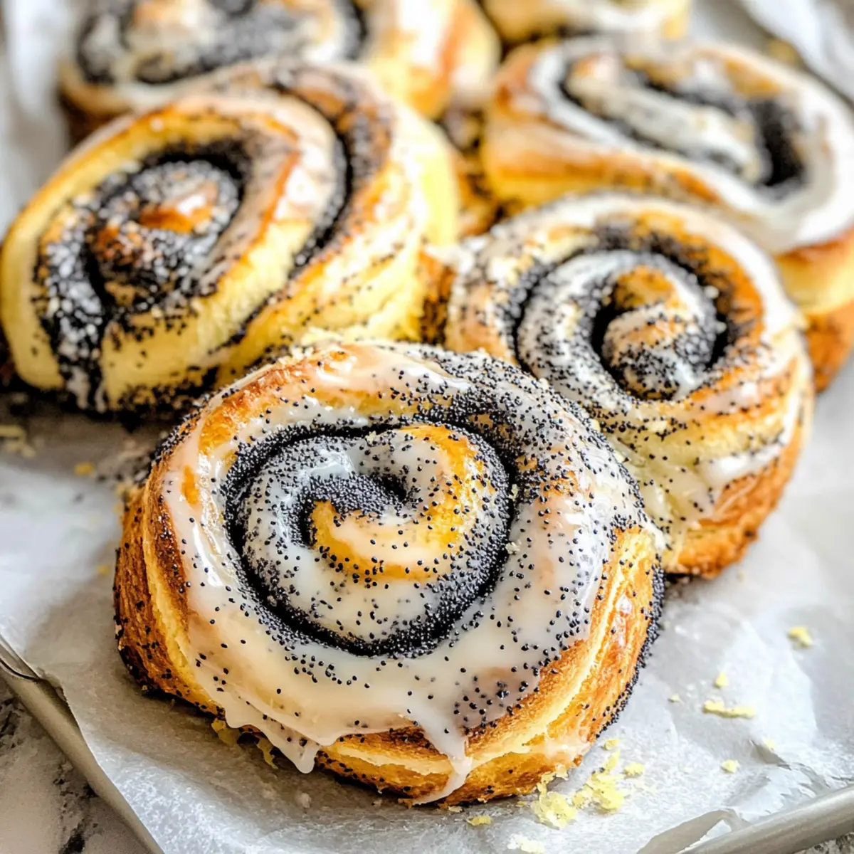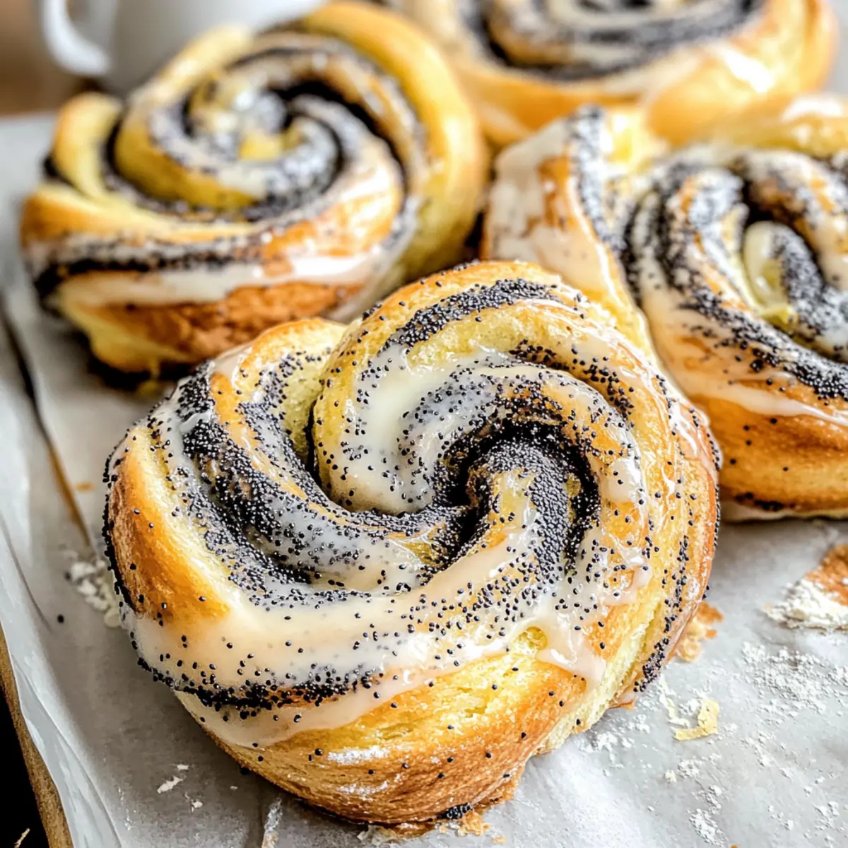 The aroma of freshly baked pastries is a universal comfort, but there’s something uniquely enchanting about the combination of zesty lemons and nutty poppy seeds. That’s where my Lemon Poppyseed Franzbrötchen comes into play, a delightful yeasted breakfast treat that promises to elevate your morning routine. With their airy texture and a sweet, tangy glaze, these buns are not only a charming addition to your brunch table, but they also bring a delightful twist to the classic cinnamon roll. They’re quick to prepare and perfect for sharing, making them an excellent pick for cozy gatherings or simple afternoon delight. Ready to indulge in a slice of homemade bliss? Let’s dive into this delightful recipe together! Why You’ll Crave These Buns? Freshness in Every Bite: These Lemon Mohn Franzbrötchen combine zesty lemons with nutty poppy seeds for a flavor that’s both refreshing and satisfying. Easy to Make: With just a few straightforward steps, you can whip up these delightful buns, making them perfect for bakers of all levels. Perfect for Sharing: Ideal for brunch or afternoon coffee, these buns will impress your friends and family with their unique twist on traditional pastries. Versatile Options: Want to mix things up? Try swapping poppy seeds for ground nuts or experiment with different glazes to suit your taste! Stays Fresh Longer: Store them in an airtight container for several days, ensuring you can enjoy your homemade treats whenever the craving strikes. So, grab your apron and let’s make these scrumptious buns today—pair them beautifully with a cup of coffee or tea, and you’ll have a delightful treat that rivals any bakery! Lemon Mohn Franzbrötchen Ingredients • Here’s everything you need to create these delightful buns: For the Dough All-Purpose Flour – Provides structure; substitute with a gluten-free blend for a gluten-free version. Granulated Sugar – Adds sweetness; can reduce sugar for a less sweet option. Instant Yeast – Helps dough rise; active dry yeast may be used but requires proofing. Lukewarm Milk – Hydrates the dough; any non-dairy milk can be substituted. Softened Butter – Adds richness and flavor; replace with vegetable oil for a dairy-free alternative. Egg – Binds ingredients together; can use a flax egg for vegan alternatives. Lemon Zest – Imparts a refreshing citrus flavor; fresh zest is recommended for the best taste. Salt – Enhances flavor; necessary for balance, so do not omit. For the Poppy Seed Filling Poppy Seeds – Provides a nutty flavor and texture; can substitute with chia seeds, though the texture will differ. Milk – Helps combine the filling ingredients; use any type of milk as desired. Granulated Sugar – Adds sweetness to the filling; adjust to your taste preference. For the Glaze Powdered Sugar – Used for the glaze; can be swapped with coconut sugar for a less processed option. Lemon Juice – Adds acidity and sweetness to the glaze; fresh juice is best for bright flavor. Now that you have your ingredients ready, it’s time to dive into the fun of creating your Lemon Mohn Franzbrötchen! Step‑by‑Step Instructions for Lemon Mohn Franzbrötchen Step 1: Make the Dough In a large mixing bowl, combine 4 cups of all-purpose flour, 1/4 cup of granulated sugar, and 2 teaspoons of instant yeast. Gradually add 1 cup of lukewarm milk, 1/4 cup of softened butter, 1 egg, 1/2 teaspoon of salt, and 2 teaspoons of lemon zest. Mix until a dough forms, then knead for about 15 minutes until smooth and elastic. Cover with a damp cloth and let rise in a warm place for about 1 hour, or until doubled in size. Step 2: Prepare Poppy Seed Filling While the dough rises, prepare your poppy seed filling. In a saucepan over medium heat, combine 1/2 cup of milk, 1/3 cup of poppy seeds, and 1/4 cup of sugar. Bring to a gentle boil, then reduce heat and simmer for about 5 minutes, stirring until the milk is absorbed. Once thickened, remove from heat, stir in the remaining 2 teaspoons of lemon zest, and allow the mixture to cool to room temperature. Step 3: Shape the Buns Once the dough has risen, punch it down and roll it out on a lightly floured surface into a rectangle about 1/4 inch thick. Spread 2 tablespoons of softened butter over the dough, followed by half of the cooled poppy seed filling. Fold the dough like a letter, then roll it out again to the same thickness. Spread the remaining filling, roll it tightly, and slice into pieces every 4 cm to form your buns. Step 4: Proof the Slices Line two baking sheets with parchment paper and arrange the sliced buns upright, ensuring they have some space to expand. Cover the trays loosely with a clean kitchen towel and allow the buns to rise in a warm area for about 30 minutes, or until puffy and slightly swollen. Step 5: Bake Preheat your oven to 350°F (or 325°F for convection ovens). Once heated, place the baking sheets in the oven and bake for around 20 minutes, or until the tops are golden and the buns sound hollow when tapped lightly. Keep an eye on them to avoid overbaking. Step 6: Glaze the Buns As the buns bake, prepare the glaze by mixing 1 cup of powdered sugar with the juice of one lemon until smooth. After removing the buns from the oven, let them cool for about 5-10 minutes before brushing or drizzling the glaze generously over the warm Lemon Mohn Franzbrötchen to allow it to set beautifully. Lemon Mohn Franzbrötchen Variations & Substitutions Feel free to explore your culinary creativity and make these delightful buns your own! Gluten-Free: Swap all-purpose flour with a gluten-free blend to cater to dietary needs without sacrificing flavor. Dairy-Free: Use coconut or almond milk and replace butter with vegetable oil, ensuring everyone can enjoy this treat. Lower Sugar: Reduce granulated sugar in both the dough and filling for a less sweet version, making it healthier without losing taste. Nutty Twist: Substitute poppy seeds with ground hazelnuts or almonds for an exc