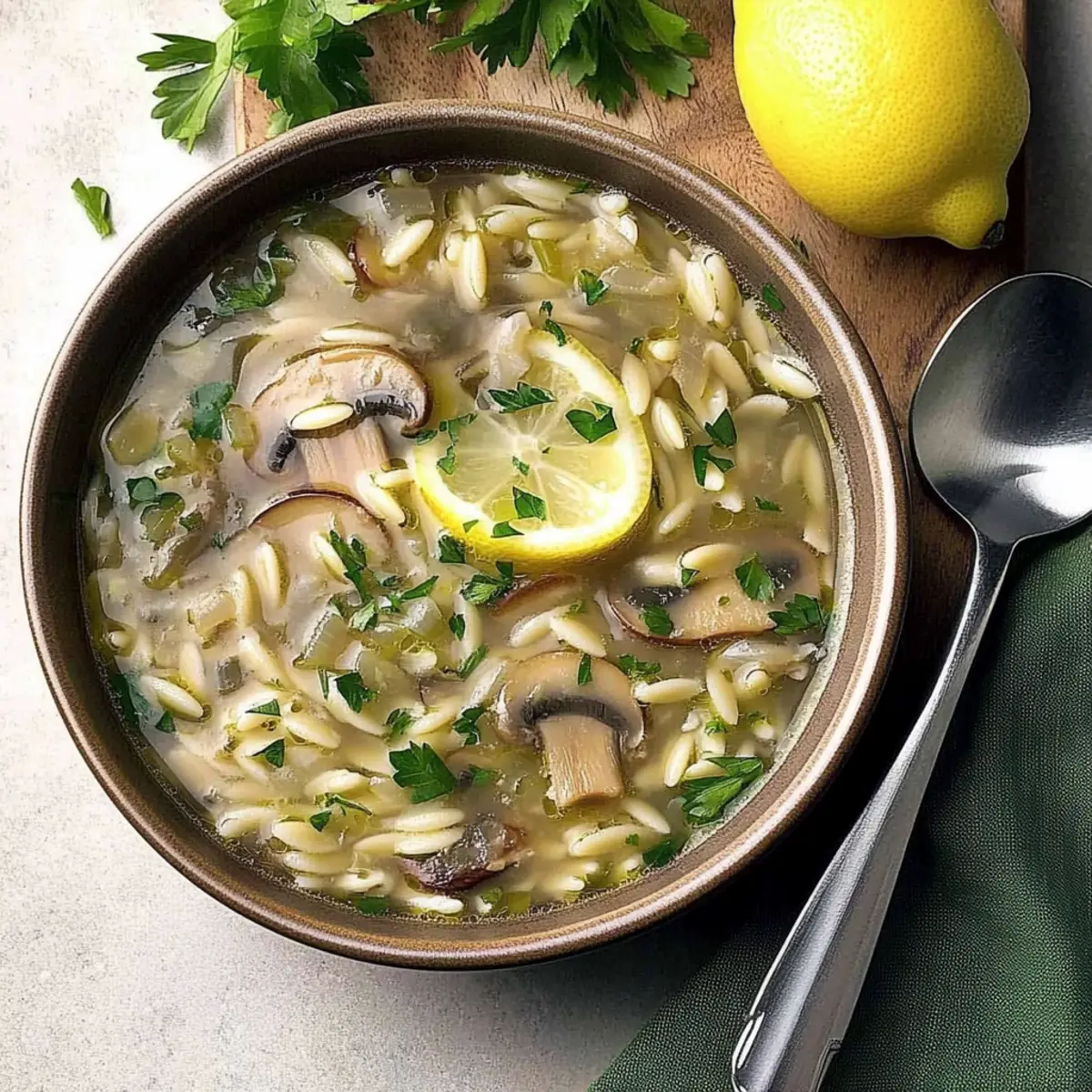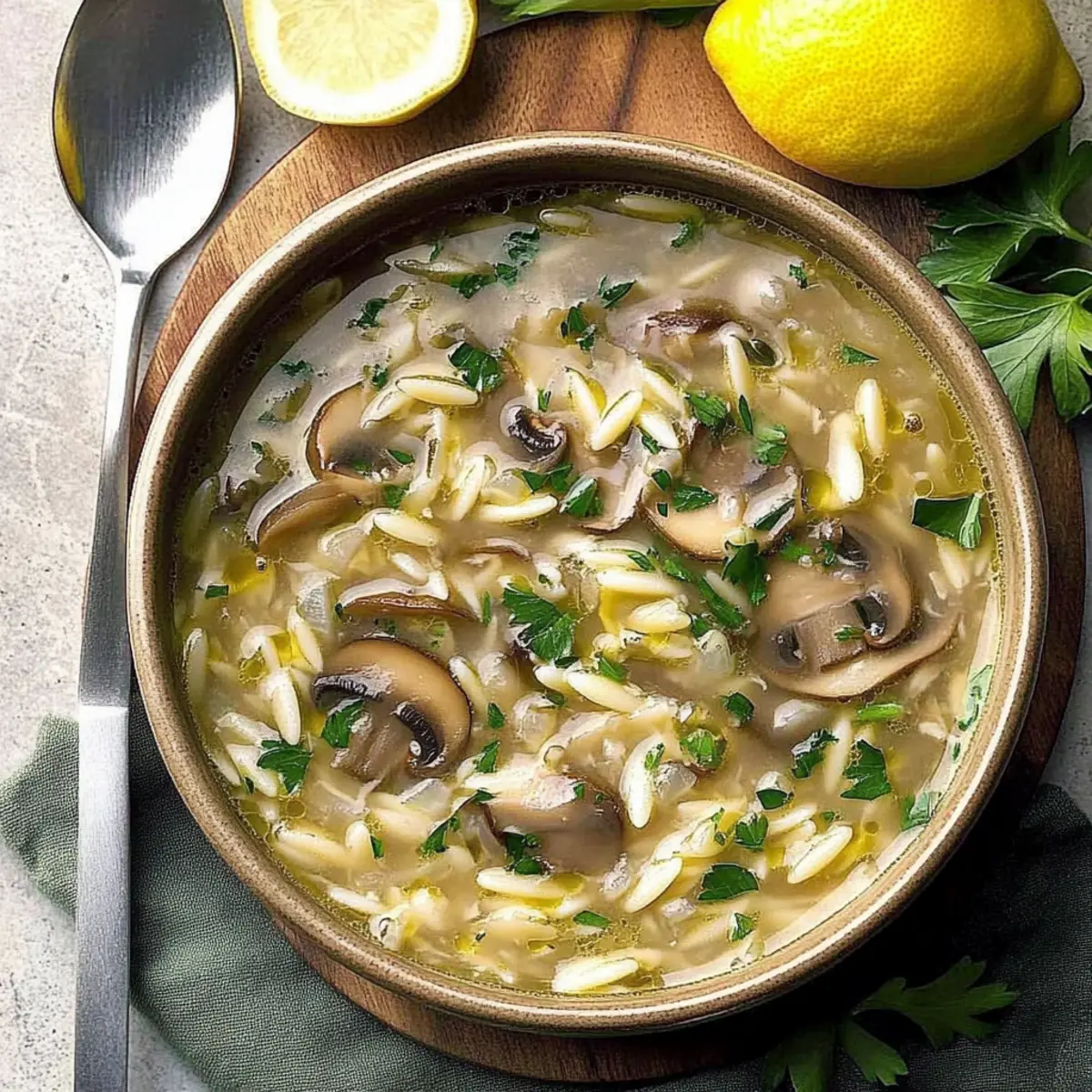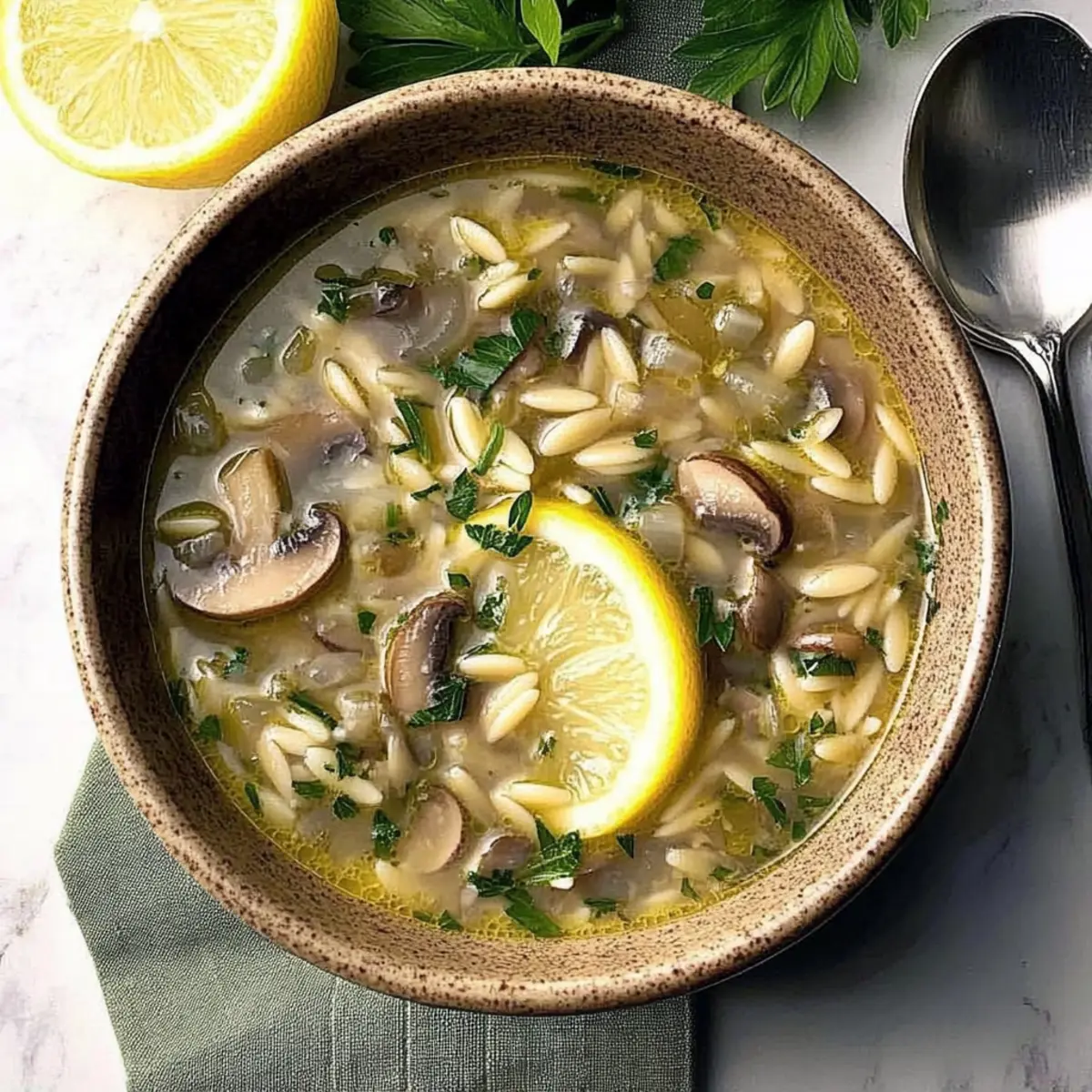 In the midst of a bustling kitchen, I often find solace in the natural rhythm of cooking. That’s precisely how I stumbled upon this gem: Lemony Mushroom-Orzo Soup. Imagine how the earthy aroma of sautéed mushrooms dances with the zing of fresh lemon, creating a comfort food masterpiece that’s not just vegetarian-friendly but also delightfully quick to whip up. With the tender orzo soaking up that rich broth, it’s a hug in a bowl, perfect for any cozy night in. Plus, you can easily customize it to suit your cravings—maybe a touch of cream or an extra handful of veggies? I’m excited to share this soulful recipe with you. Are you ready to turn your kitchen into a haven of flavor? Why is Lemony Mushroom-Orzo Soup so special? Comforting Warmth: This Lemony Mushroom-Orzo Soup offers a nurturing embrace in each spoonful, bringing warmth on a chilly evening. Quick & Easy: With minimal prep and cook time, you’ll have this comforting dish ready in just 30 minutes, making it perfect for busy weeknights. Flavor Explosion: The harmony of earthy mushrooms and zesty lemon creates a symphony of flavors, elevating your typical soup experience to something extraordinary. Customizable Creations: Whether you’re adding extra vegetables or a splash of heavy cream, this recipe invites creativity, allowing you to cater to your personal taste. You might also enjoy pairing it with a delicious Red Pepper Soup for a delightful meal duo. Crowd-Pleasing Delight: Family and friends will love this vegetarian-friendly dish that satisfies even the pickiest eaters, ensuring everyone leaves the table happy! Lemony Mushroom-Orzo Soup Ingredients Get ready to gather everything you need to create this delightful soup! For the Soup Base • Fresh Mushrooms (2-1/2 cups) – Provides a rich, savory flavor; feel free to substitute with baby portabellas or other mushrooms based on preference. • Green Onions (2, chopped) – Adds a mild onion flavor; you can use regular onions, but they should be sautéed longer. • Olive Oil (1 tablespoon) – Used for sautéing vegetables; alternatively, use butter for a richer taste. • Garlic (1 clove, minced) – Enhances aroma and flavor; no substitutions recommended. • Reduced-Sodium Chicken Broth (1-1/2 cups) – Acts as the soup’s base, adding depth; substitute with vegetable broth for a vegetarian Lemony Mushroom-Orzo Soup. • Fresh Parsley (1-1/2 teaspoons, minced) – Adds freshness to the dish; can be omitted if not preferred. • Dried Thyme (1/4 teaspoon) – Provides herbal notes; substitute with one fresh thyme sprig. • Pepper (1/8 teaspoon) – Offers mild seasoning; adjust to taste. For the Pasta & Lemon Flavor • Orzo Pasta (1/4 cup, uncooked) – Adds texture and body to the soup; substituting with other small pasta types may vary cooking times. • Lemon Juice (1-1/2 teaspoons) – Brightens the soup’s flavor profile; use fresh lime juice as a substitute or omit if desired. • Lemon Zest (1/8 teaspoon) – Intensifies the lemon flavor, an important element; can be omitted but not recommended. This comforting dish is easy to prepare, making it a perfect fit for your next cozy dinner. Enjoy every warm spoonful! Step‑by‑Step Instructions for Lemony Mushroom-Orzo Soup Step 1: Sauté the Vegetables In a medium saucepan over medium heat, warm the olive oil until shimmering. Add the chopped fresh mushrooms and green onions, sautéing them for about 5 minutes until the mushrooms are tender and have released their moisture, becoming slightly golden. The aroma will fill your kitchen as the vegetables soften and meld their flavors together. Step 2: Add Garlic Stir in the minced garlic and cook for an additional minute, allowing it to become fragrant and golden, gently stirring to prevent burning. This step enhances the depth of flavor in your Lemony Mushroom-Orzo Soup, setting a savory foundation for the broth to follow. Step 3: Incorporate the Broth Pour in the reduced-sodium chicken broth and bring everything to a gentle simmer over medium-high heat. Stir in the minced fresh parsley, dried thyme, and a pinch of pepper, creating a fragrant mixture. After about 2-3 minutes, you’ll see small bubbles forming as it comes to a boil. Step 4: Boil the Soup Once boiling, reduce the heat slightly and let the broth simmer for about 5 minutes. This allows the flavors from the garlic, thyme, and mushrooms to meld together beautifully. You will notice the broth taking on a lovely aroma that is both comforting and inviting as it simmers. Step 5: Add Orzo and Lemon Stir in the uncooked orzo pasta, lemon juice, and lemon zest into the bubbling broth. Cook for 5-6 minutes, or until the orzo is al dente and tender, stirring occasionally. The pasta will absorb some of the broth, thickening the soup while allowing the vibrant lemon flavor to shine through. Step 6: Final Adjustments Taste your Lemony Mushroom-Orzo Soup and adjust the seasoning if desired, perhaps adding a bit more salt or lemon juice for brightness. Allow it to sit for a minute off the heat, letting the flavors deepen before serving. This is also the perfect time to add any additional vegetables or cream if you’re looking to customize your soup further. Expert Tips for Lemony Mushroom-Orzo Soup • Avoid Overcooking Orzo: Don’t add the orzo too early; wait until the broth is boiling to prevent it from swelling excessively and becoming mushy. • Season to Taste: Always taste your Lemony Mushroom-Orzo Soup before serving. Adjust salt and lemon juice based on your personal flavor preferences. • Homemade Broth Bonus: If possible, use homemade broth for a richer, more vibrant flavor. Store-bought can work, but fresh is always best! • Embrace Variations: Feel free to add extra veggies like carrots, celery, or greens for added nutrition and flavor – the possibilities are endless! • Lemon Zest Matters: Don’t skip the lemon zest! It intensifies the fresh lemon flavor, elevating your soup’s overall