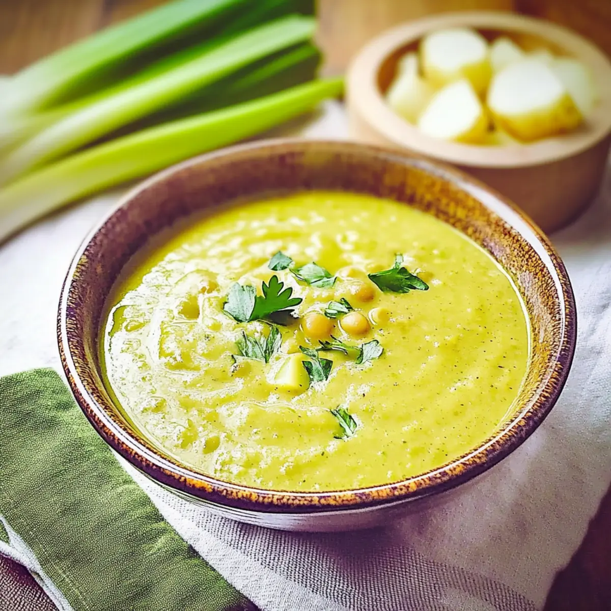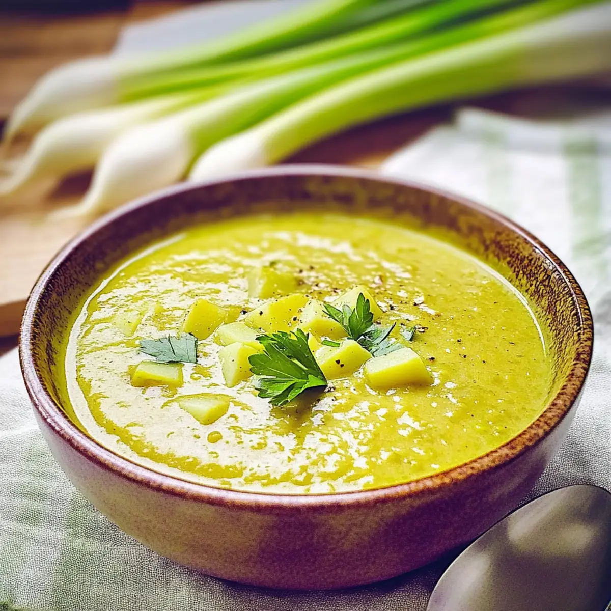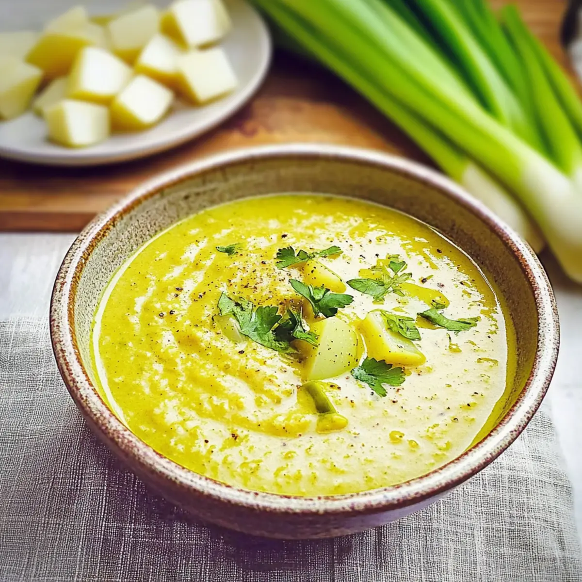 “Just when I thought comfort food couldn’t get any better, I discovered this creamy turmeric lentil leek and potato soup. Filled with vibrant flavors and warm spices, it’s not just a meal—it’s a cozy hug in a bowl, perfect for those chilly evenings. With the ease of a 30-minute cooking time, I knew this would quickly become my go-to recipe for busy weeknights. This plant-based delight is also vegan and gluten-free, making it suitable for almost any dietary need. Plus, packed with protein from lentils and a wealth of nutrients, this soup is both wholesome and satisfying. Curious about how this aromatic dish will transform your dinners? Let’s dive into the details!” Why is this soup a must-try? Creamy Comfort: The combination of tender potatoes and smooth coconut milk creates a rich texture that soothes the soul. Health Boosting: Packed with protein-rich lentils and anti-inflammatory turmeric, this soup not only tastes great but is also a nutritional powerhouse. Quick and Easy: In just 30 minutes, you’ll have a delightful meal on the table, perfect for those busy nights. Customizable: Swap ingredients easily—try adding carrots or sweet potatoes for added sweetness, or mix in fresh herbs for a burst of flavor. Crowd-Pleasing: This vegan and gluten-free soup will impress even the pickiest eaters, making it a fantastic family favorite. Pair it with a side of Garlic Butter Potatoes or a fresh salad for a complete meal! Lentil Leek and Potato Soup Ingredients For the Soup • Waxy Potatoes – Provide a creamy texture; great for mashing into the soup. • Leek – Use the white part for a sweet, subtle flavor; adds depth to the broth. • Mixed Red Lentils & Moong Dal – Protein-rich and full of fiber; you can use only red lentils for faster cooking. • Fresh Thyme – Infuses an earthy aroma; substitute with ½ teaspoon of dried thyme if needed. • Bay Leaf – Contributes a fragrant depth; be sure to discard before serving. • Ground Allspice – Adds a warm, exotic flavor; can swap with a mix of cumin and cinnamon for a different taste profile. • Turmeric Powder – Offers both vibrant color and health advantages; essential for the soup’s signature flavor. • Vegetable Stock Cube – Enhances the soup’s seasoning; homemade broth is a wonderful alternative. • Water – The base for the soup; add enough to cover all the ingredients adequately. • Coconut Milk – Provides a creamy finish with a hint of sweetness; any non-dairy milk works as a substitute. • Olive Oil – Used for sautéing; you can also opt for coconut or vegetable oil. • Salt – Adjust to taste, especially if using nutritional yeast. • Nutritional Yeast (optional) – Adds a cheesy flavor to the mix; consider reducing salt if you include it. For Garnish • Fresh Herbs (e.g., parsley or microgreens) – Adds freshness and visual appeal to your soup; perfect for a finishing touch! Step‑by‑Step Instructions for LENTIL LEEK AND POTATO SOUP Step 1: Sauté the Leeks Begin by setting your pressure cooker to the sauté or browning setting and add about a tablespoon of olive oil. Heat the oil for around 10 seconds until shimmering, then add the chopped leeks and sauté them for approximately 2 minutes until softened and fragrant, stirring occasionally to ensure even cooking. Step 2: Combine Ingredients Next, stir in the chopped waxy potatoes, mixed red lentils and moong dal, fresh thyme, bay leaf, ground allspice, and turmeric powder. Pour in enough water to cover all the ingredients, along with your vegetable stock cube and coconut milk for creaminess. Mix well until everything is evenly incorporated. Step 3: Cook the Soup After combining your ingredients, cancel the sauté function, and select the soup setting on your pressure cooker. Set the timer for 8 minutes on high pressure, ensuring the valve is closed. This will allow your LENTIL LEEK AND POTATO SOUP to cook thoroughly while developing those rich, comforting flavors. Step 4: Release Pressure Once the cooking time is complete, let the pressure release naturally for about 10 minutes—this helps to enhance the soup’s texture. After that, carefully use the manual release to let out any remaining pressure, ensuring you stand clear of the steam vent for safety. Step 5: Blend for Creaminess For those who prefer a creamier texture, use a potato masher to gently mash some of the potatoes in the soup, which will give it that luscious consistency. If you’re opting for nutritional yeast, stir it in now to add a cheesy flavor, adjusting the salt to taste as needed. Step 6: Garnish and Serve Ladle the hot LENTIL LEEK AND POTATO SOUP into bowls and garnish each serving with fresh herbs like parsley or microgreens for a burst of color and freshness. This delightful, wholesome soup is perfect for cozy nights and pairs wonderfully with crusty bread or a light salad. How to Store and Freeze Lentil Leek and Potato Soup Fridge: Store your lentil leek and potato soup in an airtight container for up to 4 days. Make sure to let it cool completely before sealing to maintain freshness. Freezer: Freeze portions of the soup in airtight containers or freezer bags for up to 3 months. To prevent freezer burn, ensure no air is trapped inside the packaging. Thawing: When ready to enjoy, thaw the soup in the refrigerator overnight or use the microwave on low power for quicker results. Reheating: Reheat the soup gently on the stovetop or in the microwave, stirring occasionally. Add a splash of water or coconut milk to restore its creamy texture if needed. LENTIL LEEK AND POTATO SOUP Swaps Feel free to get creative with this comforting soup—these variations will spark your culinary imagination and cater to your preferences! Sweet Potato Swap: Replace potatoes with sweet potatoes for a naturally sweeter, nutrient-rich flavor profile that adds a lovely color. Extra Veggies: Toss in carrots or spinach for a nutritional boost; their flavors blend seamlessly, enhanci
