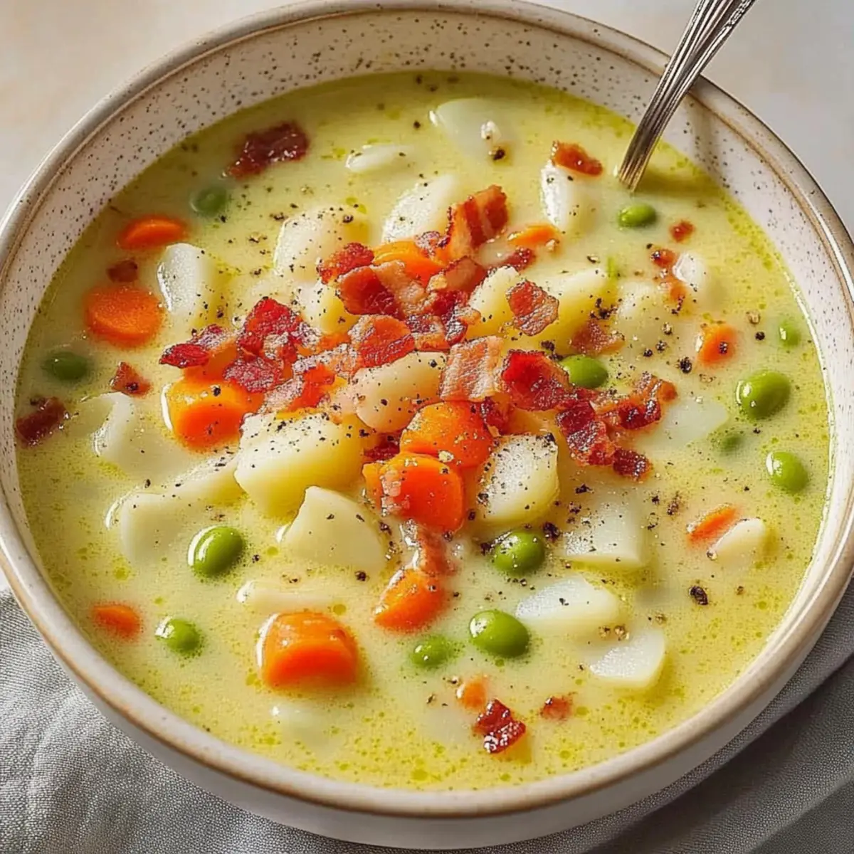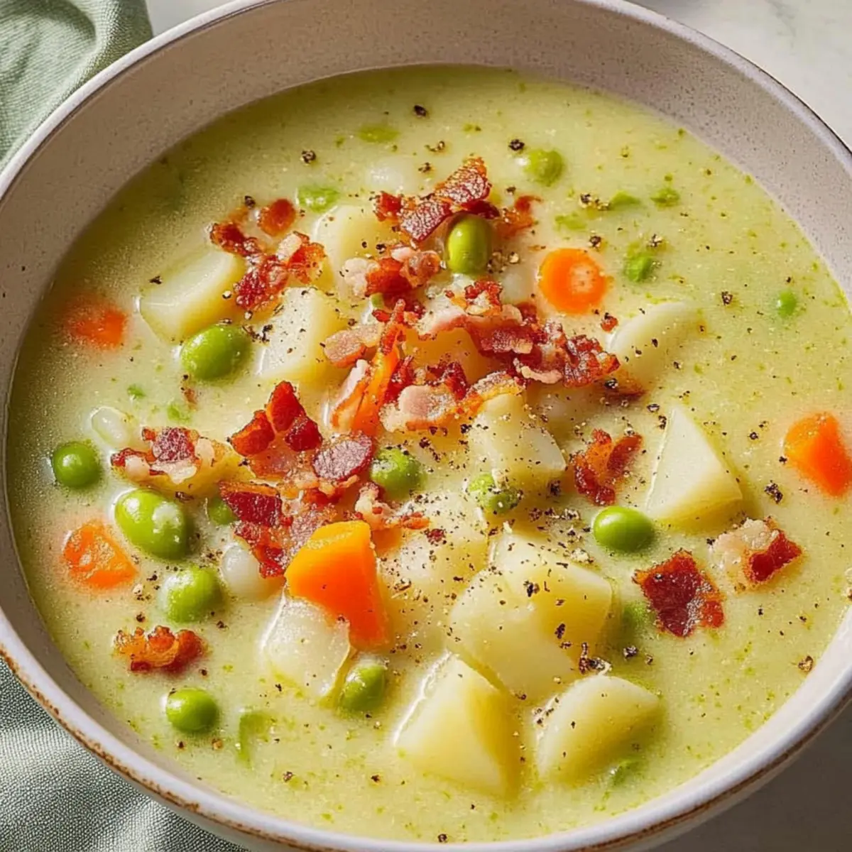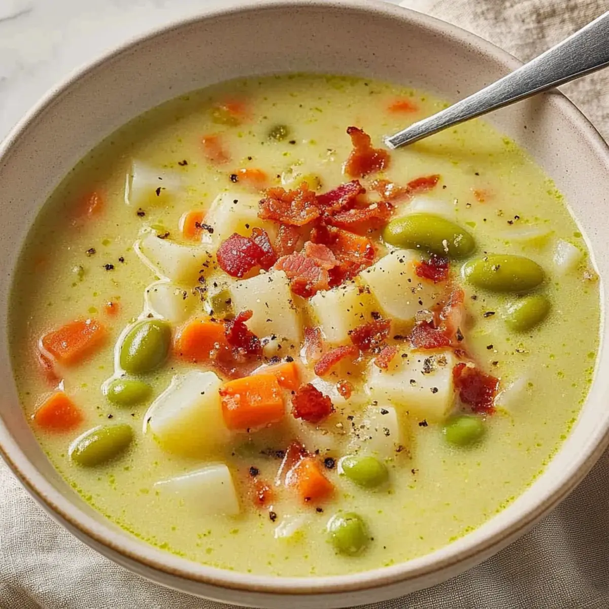 As the wind howls outside and the temperatures drop, there’s nothing quite like a steaming bowl of Comforting Lima Bean Soup to embrace the chilly vibes. It’s heartwarming to think about how this creamy delight brings together buttery lima beans and a medley of vibrant veggies like carrots and sweet red peppers, all topped with crispy bacon for a satisfying twist. What I adore about this recipe is its quick prep time—just 10 minutes—making it the perfect solution for busy weeknights when you crave something wholesome. Plus, it’s packed with high fiber and protein, so you can indulge in a bowl of goodness without guilt. Are you ready to learn how to create a bowl that warms not just your body, but your soul? Let’s dive into the comforting world of Lima Bean Soup! Why is This Lima Bean Soup a Must-Try? Comforting and Cozy: This soup envelops you in warmth, making it an ideal choice for chilly winter nights. Nutritious Highlights: Packed with high fiber and protein, it’s not just delicious but also a great way to nourish your body. Quick and Easy: With just 10 minutes of prep, you can have this comforting meal ready in no time—perfect for busy evenings! Versatile Base: Experiment with ingredients like shredded chicken or smoked sausage for varied flavors. Crowd-Pleasing Flavor: Topped with crispy bacon, it elevates the dish, making it a sure hit with family or guests. Pair it with some garlic knots for a hearty meal that everyone will love! Lima Bean Soup Ingredients For the Base • Chicken Broth – 3 cans (14.5 ounces each); provides a savory base—substitute vegetable broth for a vegetarian option. • Lima Beans – 2 cans (15.25 ounces each); the main ingredient contributing fiber and protein—use dried lima beans cooked separately for a homemade feel. • Carrots – 3 medium, thinly sliced; adds sweetness and nutrients—substitute with parsnips for a different flavor. • Potatoes – 2 medium, peeled and diced; adds heartiness and thickness—can swap for sweet potatoes for a slight sweetness. • Sweet Red Peppers – 2 small, chopped; enhances color and taste—green bell peppers can be used instead. • Onions – 2 small, chopped; forms the flavor base—yellow onions work well as a substitute. • Celery – 2 ribs, thinly sliced; enhances aroma and flavor—omit if unavailable or use vegetable stock to compensate. For the Cooking • Butter – 1/4 cup; adds richness and aids in sautéing—can use olive oil for a lighter option. • Dried Marjoram – 1.5 teaspoons; for aromatic flavor—thyme can be used as an alternative herb. • Salt – 1/2 teaspoon; enhances flavors—adjust according to taste preferences. • Pepper – 1/2 teaspoon; adds mild spice—increase black pepper for more warmth. • Dried Oregano – 1/2 teaspoon; for an additional herbal note—basil can be substituted for a different flavor. For Creaminess and Topping • Half-and-Half Cream – 1 cup; provides creaminess—can substitute with full cream or coconut cream for richness. • Bacon – 3 strips, cooked and crumbled; adds crunch and flavor—use turkey bacon or omit for a vegetarian option. This Lima Bean Soup is not just a recipe; it’s a cozy dish that brings comfort to the dinner table! Step‑by‑Step Instructions for Creamy Lima Bean Soup Step 1: Prepare the Base In a large Dutch oven, combine 3 cans of chicken broth, 2 cans of lima beans, 3 sliced carrots, 2 diced potatoes, 2 chopped sweet red peppers, 2 chopped onions, and 2 ribs of thinly sliced celery. Add 1/4 cup of butter, 1.5 teaspoons of dried marjoram, and seasoning with 1/2 teaspoon each of salt and pepper, along with 1/2 teaspoon of dried oregano. Stir well to mix all the ingredients. Step 2: Bring to a Boil Place the Dutch oven over medium heat and bring the mixture to a boil, watching closely as it bubbles vigorously. Once boiling, reduce the heat to low, allowing the soup to simmer gently. This process helps meld the flavors together while softening the vegetables, which should take about 25-35 minutes. Step 3: Ensure Tenderness Cover the pot and check the vegetables’ tenderness after 25 minutes by piercing them with a fork. They should be soft but not mushy, creating a perfect texture for the comforting Lima Bean Soup. Stir occasionally to prevent anything from sticking to the bottom of the pot and to ensure even cooking. Step 4: Stir in the Cream Once the vegetables are tender, carefully stir in 1 cup of half-and-half cream, which will add a rich, creamy consistency to the soup. Heat through over low heat, being careful not to let the soup boil, as this could diminish the creaminess and alter the texture. Stir gently until the soup is warm and inviting. Step 5: Top with Bacon As a delightful finishing touch, crumble 3 strips of crispy bacon over each bowl just before serving. This adds a wonderful crunch and savory flavor that enhances the creamy Lima Bean Soup. Serve hot, paired with crusty bread or garlic knots, for a complete, cozy meal perfect for chilly nights. Make Ahead Options These Creamy Lima Bean Soup prep options are perfect for busy home cooks looking to save time! You can chop and refrigerate the vegetables (carrots, potatoes, peppers, onions, and celery) up to 3 days in advance to ensure maximum freshness. For even more convenience, you can cook the soup base (without cream and bacon) and refrigerate it for up to 48 hours. When you’re ready to serve, simply reheat the soup over low heat, stir in 1 cup of half-and-half, and top with crispy bacon just before enjoying. This way, you’ll have a delicious, homemade meal ready to comfort you on those chilly nights with minimal effort! Expert Tips for the Best Lima Bean Soup • Seasoning Adjustment: After adding cream, taste and adjust the seasoning; cream can dilute flavors, so a little extra salt and spices may be necessary. • Bean Choice Matters: If using dried lima beans, soak them overnight and cook separately for the best texture 