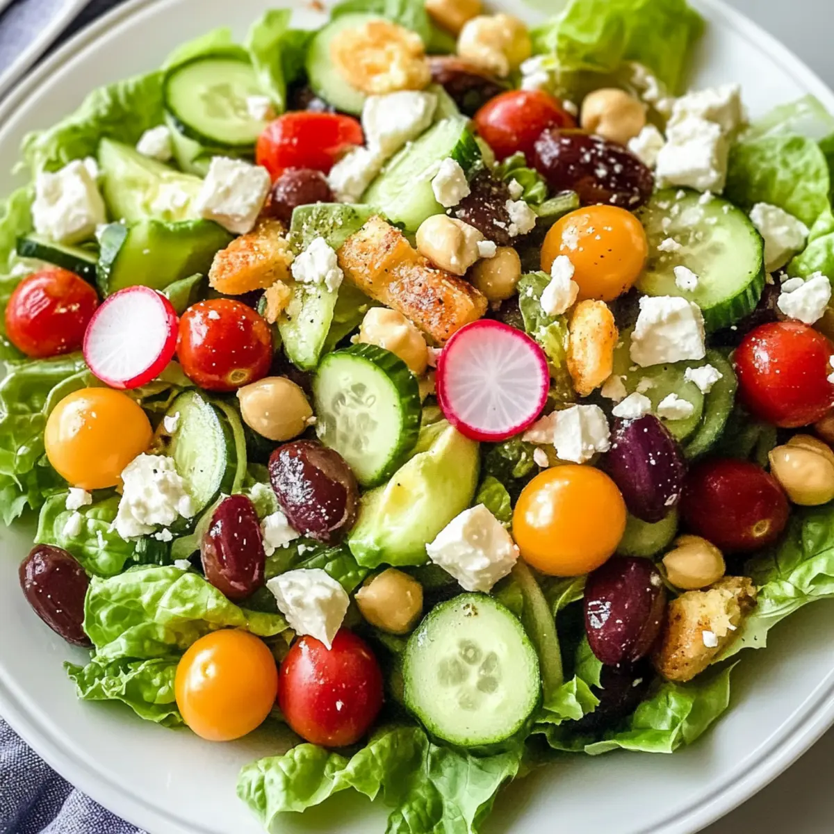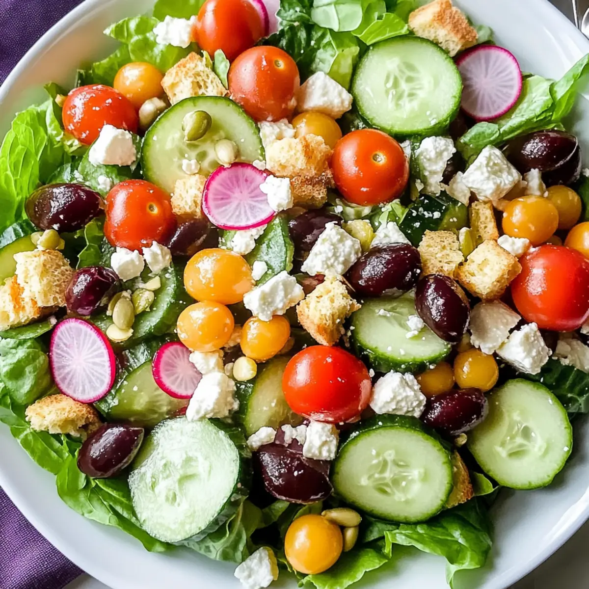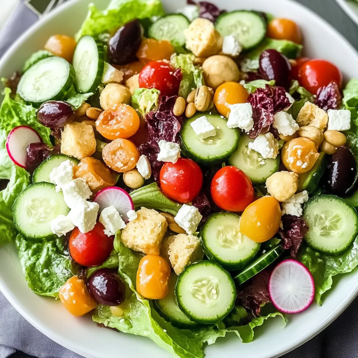 As I stood in my garden, surrounded by vibrant greens and fresh produce just waiting to be transformed, I realized the endless possibilities for meals that could uplift any ordinary day. That’s where this Loaded Garden Salad with Tangy Vinaigrette steps in—a bright dish that not only looks fabulous but also packs a nutritious punch. Perfectly customizable, this salad is an excellent way to use up that random assortment of veggies in your fridge while keeping things healthy and delicious. In no time at all, you can whip up something that’s both a feast for the senses and a guaranteed crowd-pleaser. Whether it becomes the star of your lunch or a side dish for your next dinner, you’ll love how easily it comes together. Ready to dive into a fresh, colorful culinary adventure? Let’s get started! Why is this salad a must-try? Vibrant Freshness: Each ingredient comes together to create a pop of color and flavor, making your plate visually appealing. Endless Customization: Adapt this dish based on what’s in your fridge, ensuring you never get bored. Quick to Prepare: Perfect for those busy days, you can easily whip this salad up in about 15 minutes! Healthy and Nutritious: Packed with vitamins and nutrients, it’s a guilt-free choice that keeps you energized. Perfect Side or Main: Whether served alongside grilled chicken or enjoyed as a standalone meal, it caters to all appetites. Elevate your salads with this Loaded Garden Salad, and don’t forget to try pairing it with a refreshing Feta Avocado Salad for a delightful culinary experience! Loaded Garden Salad Ingredients For the Vinaigrette • Olive Oil – Base for vinaigrette, adds richness; substitute with avocado oil for a different flavor. • Seasoned Rice Vinegar – Adds tanginess; white wine vinegar can be used as a substitute. • Red Wine Vinegar – Enhances acidity and flavor depth; substitute with white wine vinegar if needed. • Garlic – Provides aromatic flavor; use garlic powder for a milder taste. • Sugar – Balances acidity in the vinaigrette; honey or maple syrup can be used as a natural sweetener. • Sea Salt and Black Pepper – Essential seasonings for flavor; use kosher salt and freshly ground pepper for best results. For the Salad • Butter Leaf Lettuce – Forms the salad’s base, tender texture; substitute with romaine or mixed greens if desired. • Grape Tomatoes – Adds sweetness and color; cherry tomatoes or chopped bell peppers work too. • English Cucumber – Offers crunch and freshness; any cucumber can be used; peel for a softer texture. • Avocado – Provides creaminess; substitute with diced tofu for a non-fat option. • Garbanzo Beans – Adds protein and heartiness; substitute with other beans or chickpeas for variety. • Red Onion – Imparts sharpness; soak in water for a milder taste; green onions are a great substitute. • Radishes – Offer a peppery crunch; turnips can be substituted if unavailable. • Feta Cheese – Imparts saltiness; use goat cheese or omit for a vegan version. • Croutons – Adds crunch; use homemade or store-bought; omit for gluten-free. • Dried Cranberries – Introduce sweetness and chewiness; raisins or chopped dried apricots work well. • Sunflower Seeds – Add crunch and nutrition; pumpkin seeds can be a tasty alternative. Step‑by‑Step Instructions for Loaded Garden Salad Step 1: Prepare the Vinaigrette In a small glass jar, combine 1/4 cup of olive oil, 2 tablespoons of seasoned rice vinegar, and 1 tablespoon of red wine vinegar. Add 1 minced garlic clove, 1 teaspoon of sugar, 1/2 teaspoon of sea salt, and 1/4 teaspoon of black pepper. Secure the lid tightly and shake vigorously for about 30 seconds until the mixture is well emulsified and thickened, creating a tangy vinaigrette to toss into your Loaded Garden Salad. Step 2: Tear the Lettuce Take 4 cups of butter leaf lettuce and tear it into bite-sized pieces for a tender base. Place the torn lettuce into a large salad bowl, creating a colorful foundation. The vibrant green leaves will provide a fresh contrast to the other ingredients, giving your Loaded Garden Salad a visually pleasing beginning that invites compliments at the table. Step 3: Chop and Add Veggies Slice a handful of grape tomatoes in half and chop an English cucumber into small, bite-sized pieces. Add these fresh vegetables directly to the bowl with the lettuce, mixing them in gently to maintain their crispness. The addition of these juicy tomatoes and crunchy cucumber will enhance the flavor and create a satisfying texture in your vibrant Loaded Garden Salad. Step 4: Incorporate Heartiness Next, gently fold in 1 diced avocado and 1 cup of drained garbanzo beans into the salad mixture. The creamy avocado will infuse richness while the garbanzo beans provide protein, making your Loaded Garden Salad both nutritious and filling. Ensure that the ingredients are evenly distributed to enjoy a balanced bite every time you serve it. Step 5: Add Flavors and Textures To elevate your Loaded Garden Salad, include 1/4 cup of sliced red onion, 1/2 cup of sliced radishes, crumbled 1/2 cup of feta cheese, 1 cup of croutons, 1/4 cup of dried cranberries, and a sprinkle of sunflower seeds. Each addition brings a unique flavor and texture, enhancing the overall appeal and ensuring every mouthful is bursting with goodness. Step 6: Dress and Serve Drizzle the tangy vinaigrette over the salad, starting with about half of what you’ve made, to taste. Using salad tongs, toss everything together gently for an even coating, being careful not to smush the ingredients. Serve your Loaded Garden Salad immediately for the freshest taste, or keep the vinaigrette separate if you’re prepping in advance to maintain crispness. What to Serve with Loaded Garden Salad Imagine a sun-drenched table, the aroma of delicious dishes wafting through the air, all complementing your luscious Loaded Garden Salad. Grilled Chicken: The savory flavors of grilled 