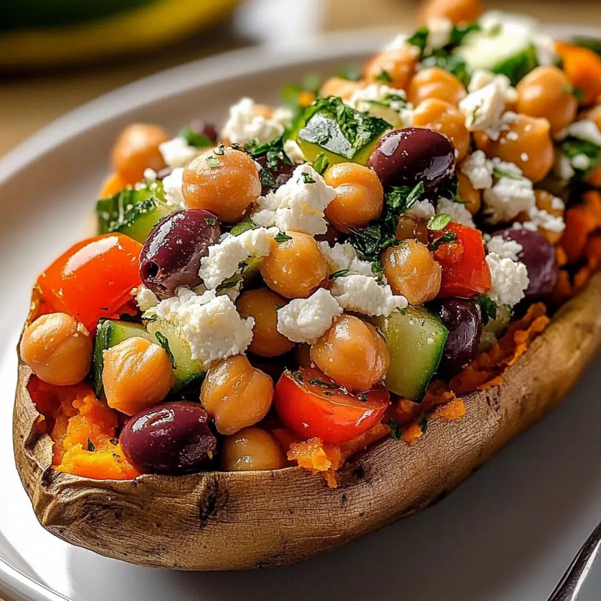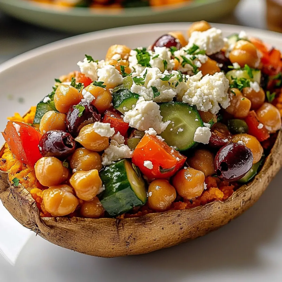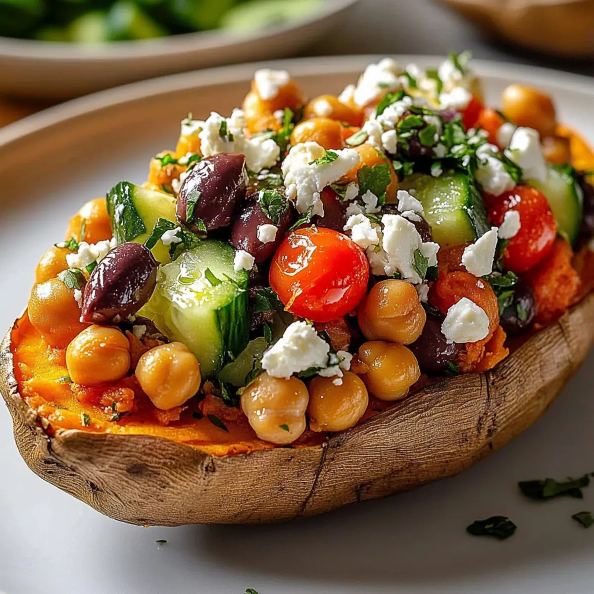 The aroma of roasted sweet potatoes filling the kitchen is simply irresistible. When comfort food meets healthy eating, you know you’ve got a winner. Enter Mediterranean Stuffed Sweet Potatoes—a vibrant dish packed with wholesome ingredients like chickpeas, fresh veggies, and creamy feta. Not only do these beauties offer quick prep for a busy weeknight, but they also rival any takeout with their colorful presentation and satisfying flavors, making them a perfect meal for both vegetarians and health-conscious foodies. Plus, with endless potential for customization, you can easily switch up the filling to suit the seasons or your personal taste. Ready to embrace the Mediterranean lifestyle? Let’s dive into these delightful stuffed sweet potatoes! Why Are These Stuffed Sweet Potatoes Special? Flavorful combinations make this dish an absolute delight, perfectly blending the sweet earthiness of the potatoes with savory Mediterranean ingredients. Customizable to fit any season, whether you’re adding asparagus in spring or grilled zucchini in summer, these stuffed beauties cater to your taste preferences. Nutritious and wholesome, packed with fiber and protein, they’re an ideal guilt-free meal option. Meal prep-friendly, you can roast the sweet potatoes ahead of time and assemble them in minutes, saving you time on busy nights. For a complete meal, pair them with a fresh arugula salad or some warm pita and hummus. Experience mouthwatering deliciousness while keeping your health in check! Mediterranean Stuffed Sweet Potatoes Ingredients For the Sweet Potatoes Sweet Potatoes – Serve as the comforting base, offering natural sweetness; you can substitute with regular potatoes or butternut squash for a different twist. For the Filling Canned Chickpeas – A fantastic source of protein and fiber; white beans or cooked quinoa can make good alternatives. Cherry Tomatoes – Adds vibrant color and juicy freshness; no substitutions are recommended as they enhance flavor beautifully. Cucumber – Contributes a refreshing crunch; bell peppers can be swapped in for a different texture. Red Onion – Provides a sharpness that balances the dish; consider green onion or shallots if you prefer a milder taste. Kalamata Olives – Offers a salty depth to the filling; feel free to use any pitted olives you have. Feta Cheese – Brings creaminess and tang; for a vegan option, use plant-based cheese or leave it out altogether, with goat cheese being another lovely alternative for those who enjoy dairy. Parsley and Mint – Infuse fresh herb notes that brighten up the dish; swap for basil or dill depending on what’s available. For the Dressing Extra Virgin Olive Oil – Elevates the flavor of the filling; opt for a high-quality oil—no need for substitutes here! Lemon Juice – Adds a zesty brightness essential for flavor balance; keep it in for that refreshing kick. Garlic – Imparts aromatic depth to the filling; freshly minced is best for that robust flavor. Dried Oregano – A critical seasoning component; ensure it’s included for that Mediterranean essence. Salt and Black Pepper – Essential for enhancing the overall taste; always adjust to suit your palate. Get ready to indulge in these Mediterranean Stuffed Sweet Potatoes! Bursting with flavors, they are sure to be a family favorite at your dinner table. Step‑by‑Step Instructions for Mediterranean Stuffed Sweet Potatoes Step 1: Preheat the Oven Begin by preheating your oven to 400°F (200°C). While the oven warms up, line a baking sheet with parchment paper—this makes cleanup easy and prevents sticking. The parchment will also help those delicious Mediterranean Stuffed Sweet Potatoes bake evenly, ensuring a perfectly tender texture. Step 2: Bake the Sweet Potatoes Take your sweet potatoes and prick them a few times with a fork to allow steam to escape as they bake. Place them on the prepared baking sheet and slide it into the preheated oven. Bake for 40-50 minutes, or until the sweet potatoes are fork-tender and can be easily pierced, signalling they are ready for stuffing. Step 3: Prepare the Filling While the sweet potatoes are baking, grab a large mixing bowl and combine the drained chickpeas, chopped cherry tomatoes, diced cucumber, sliced red onion, pitted Kalamata olives, and crumbled feta cheese. Stir in the freshly chopped parsley and mint for those aromatic herb notes that will enhance your Mediterranean Stuffed Sweet Potatoes. Step 4: Make the Dressing In a separate small bowl, whisk together extra virgin olive oil, freshly squeezed lemon juice, minced garlic, dried oregano, salt, and black pepper. This bright and tangy dressing is essential for bringing together the flavors of the filling. Once mixed, pour the dressing over the filling mixture and toss until everything is evenly coated and deliciously combined. Step 5: Fluff the Sweet Potatoes Once the sweet potatoes are done baking and have cooled for a few minutes, carefully slice them open lengthwise. Use a fork to gently fluff the inside, creating a lovely, fluffy base ready to hold the vibrant Mediterranean filling. This step also enhances the sweet potatoes’ texture, making them even more inviting. Step 6: Stuff the Sweet Potatoes Now it’s time for the fun part! Generously spoon the Mediterranean filling into each sweet potato, ensuring every bite is packed with flavor. Arrange the stuffed sweet potatoes on the baking sheet or a serving platter, making them look as beautiful as they taste. Step 7: Serve and Enjoy Your Mediterranean Stuffed Sweet Potatoes are now ready to serve! Enjoy them warm, perhaps with a crisp arugula salad or some warm pita and hummus as sides. The combination of flavors and textures will wow your family and friends, making this dish a new favorite at the dinner table. Expert Tips for Mediterranean Stuffed Sweet Potatoes Pre-roast Convenience: Roast your sweet potatoes ahead of time for easy meal prep. They can be stored in the fridge for up